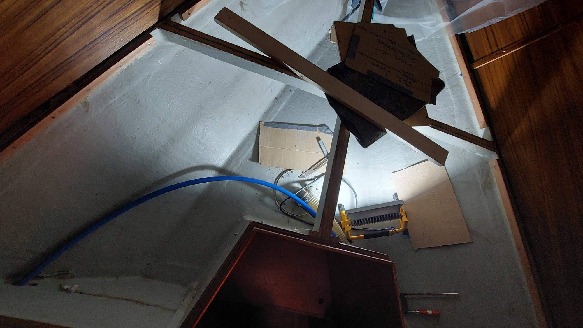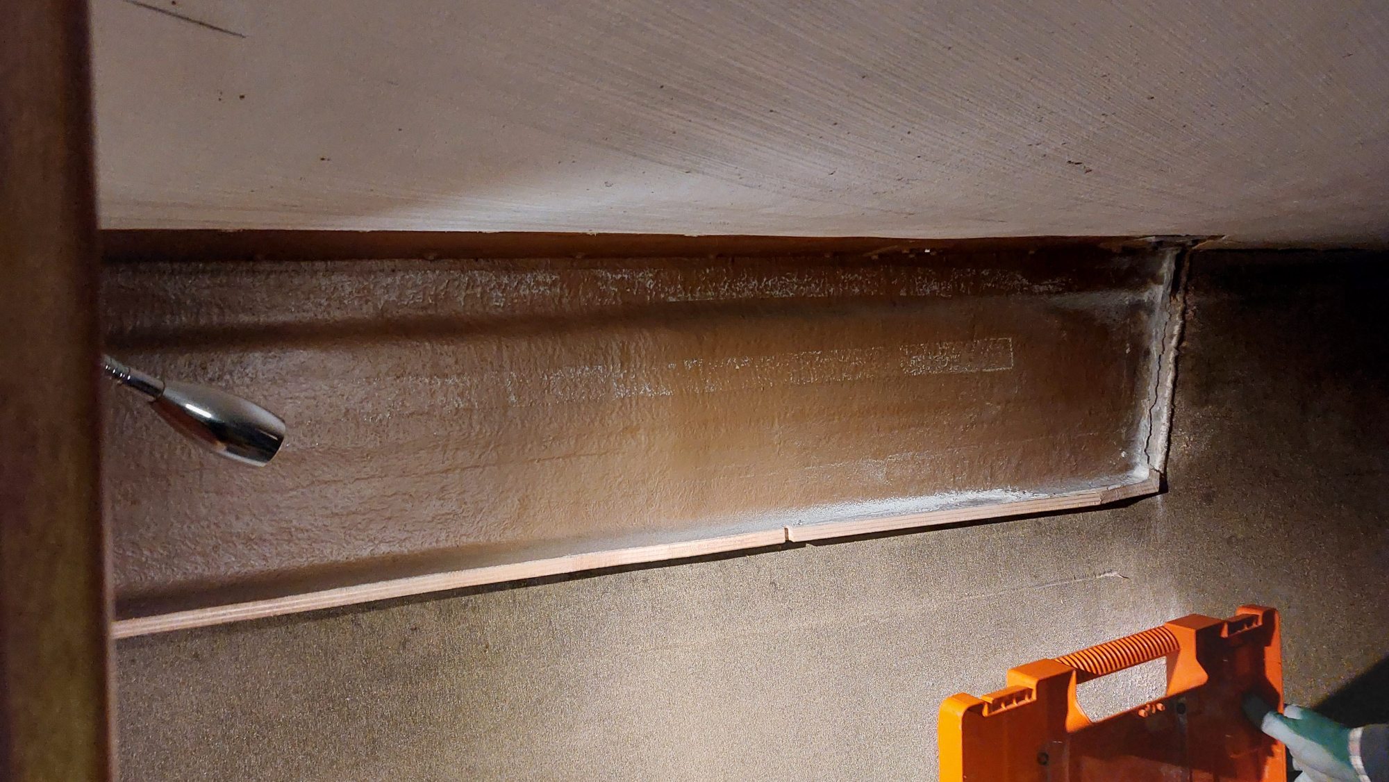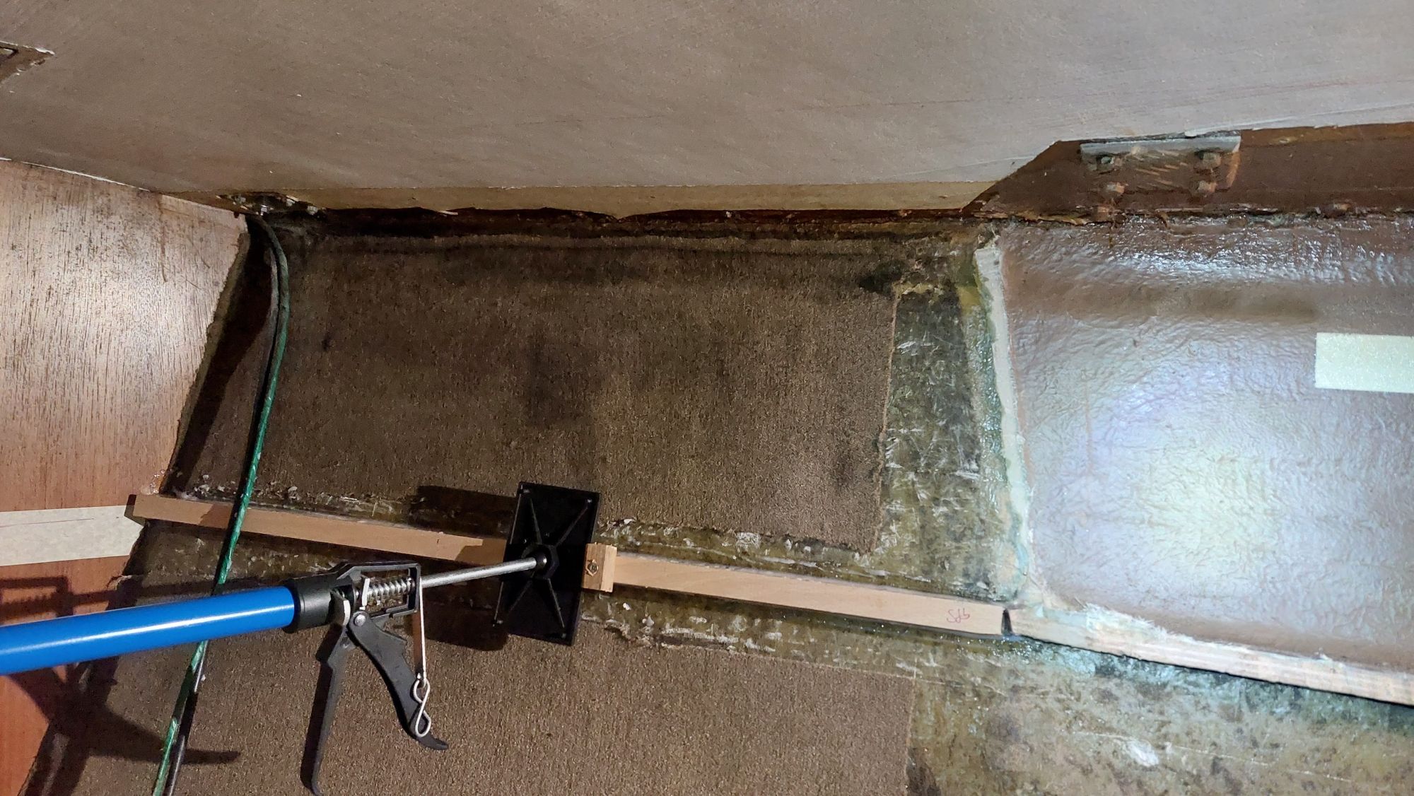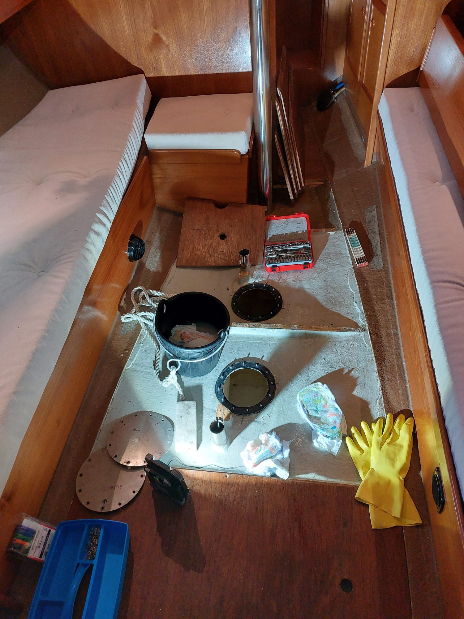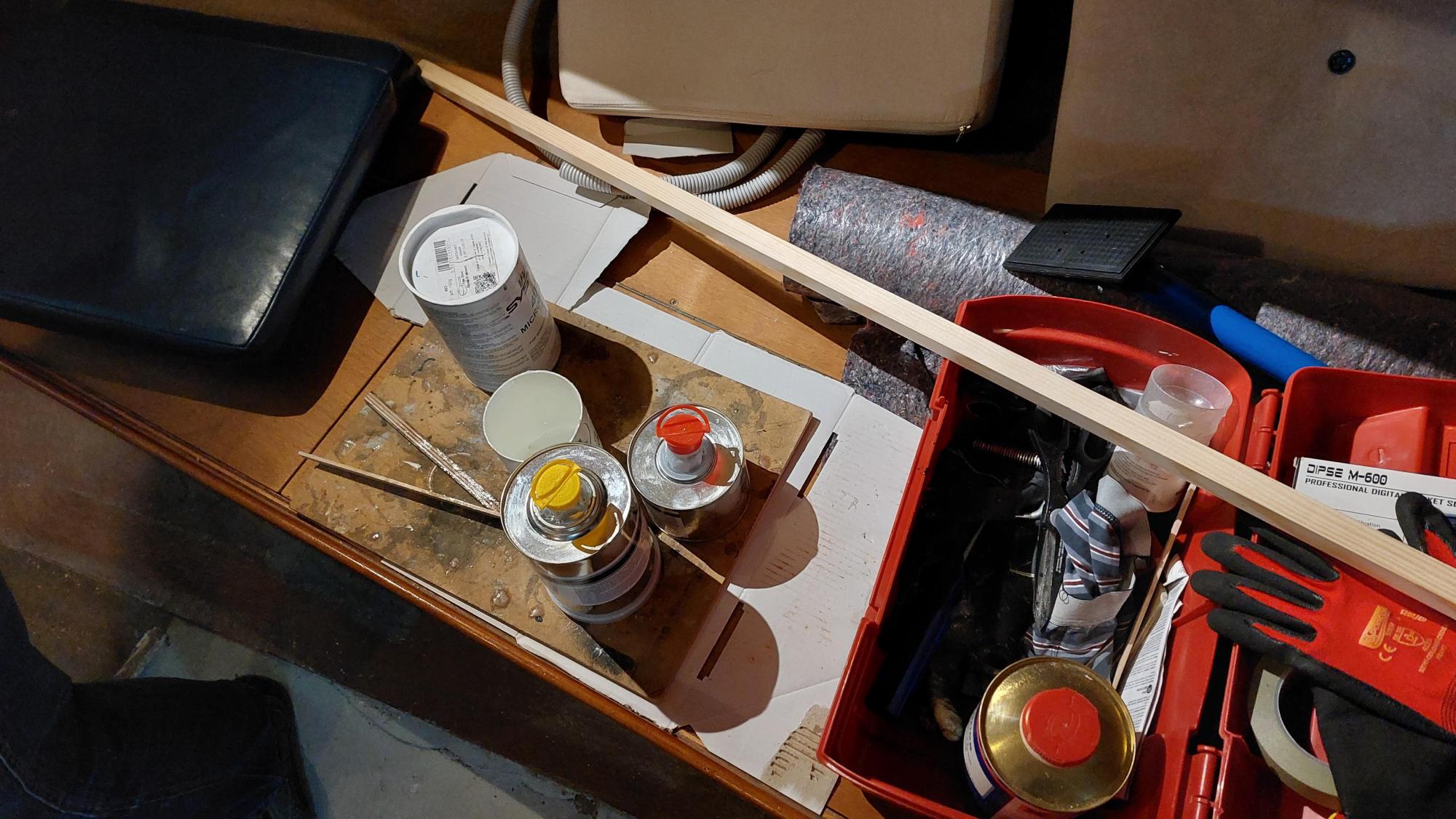 Der Tank in der Bilge sah ziemlich gammelig aus. Den Schlitz oben unterm Salonboden fülle ich mit Brunnenschaum und gehe anschließend mit Epoxyspachter darüber. Das soll das Reinigen vereinfachen. Ganz fertig wird das diesen Winter aber nicht mehr. Alles ist nur mit Verrenkungen zu erreichen und die Spachtelarbeiten sehen entsprechend stümperhaft aus.