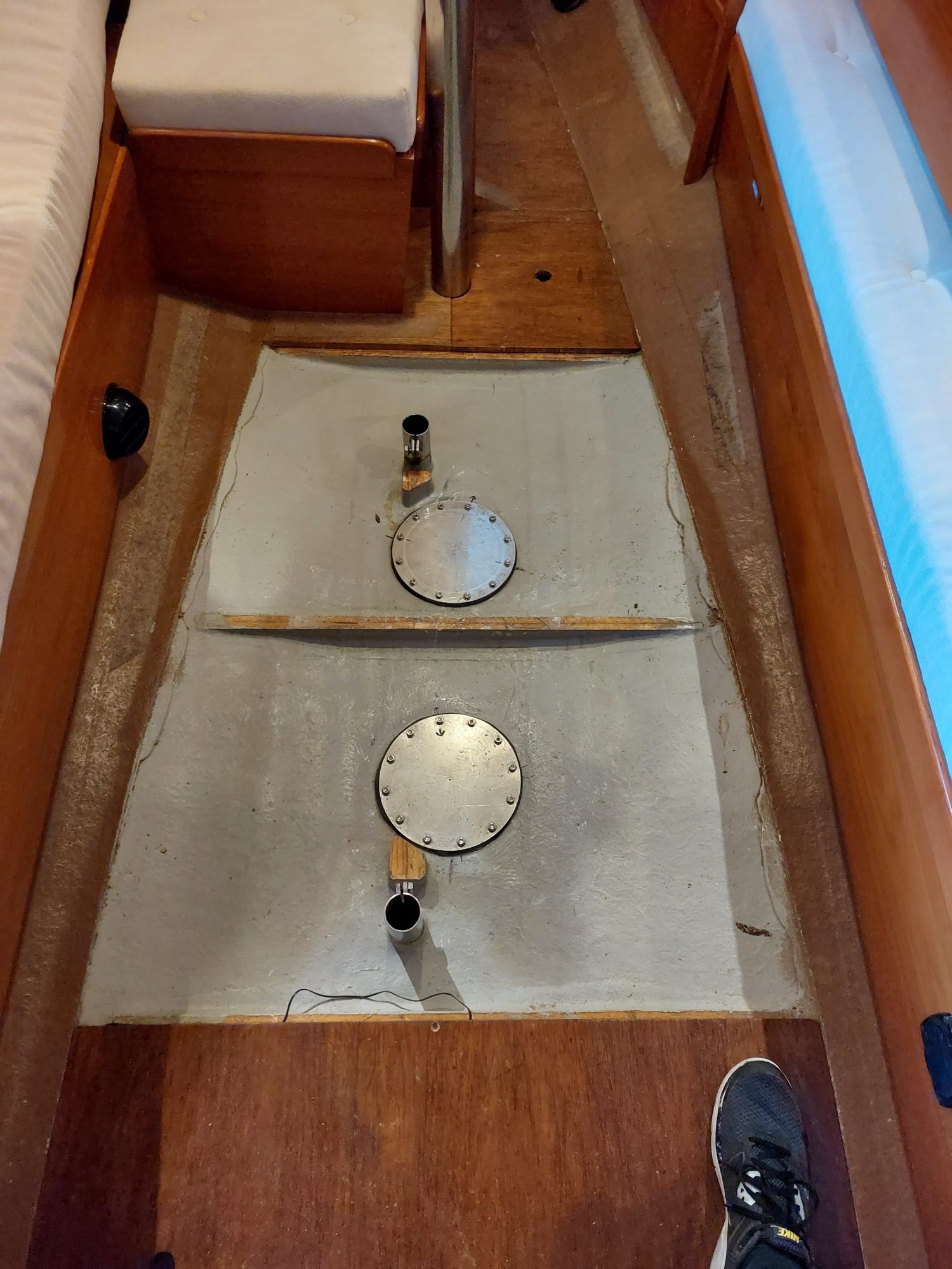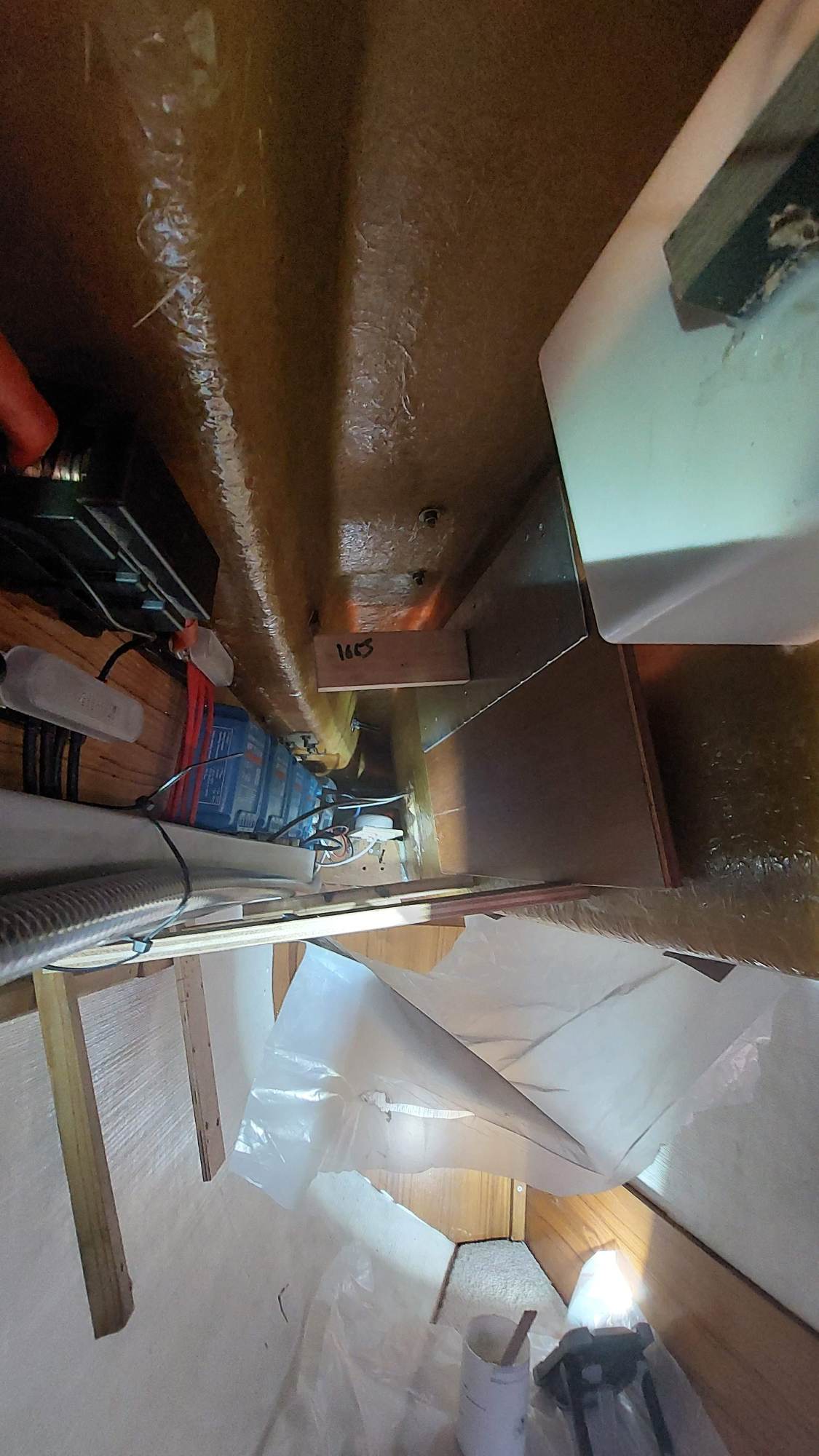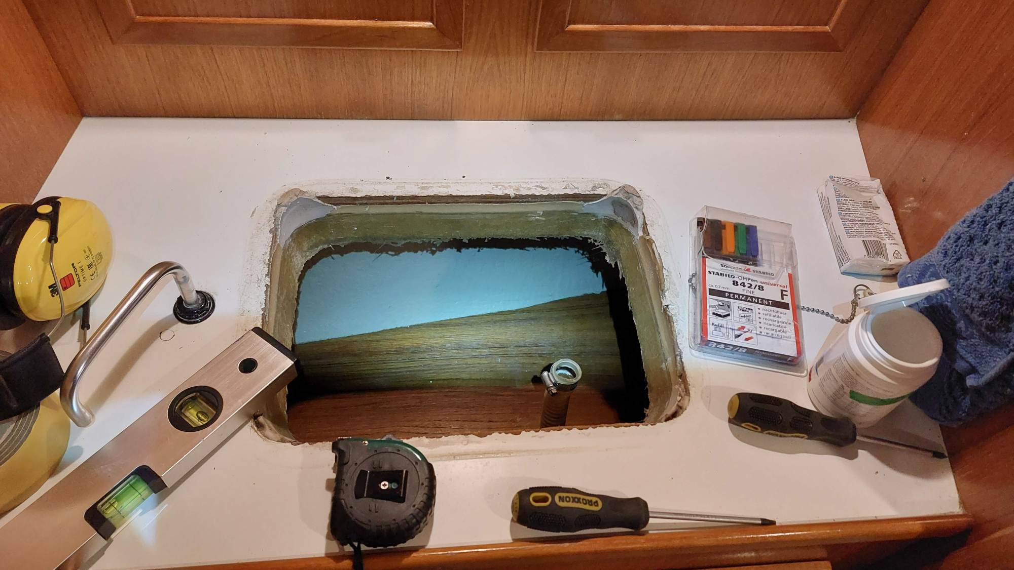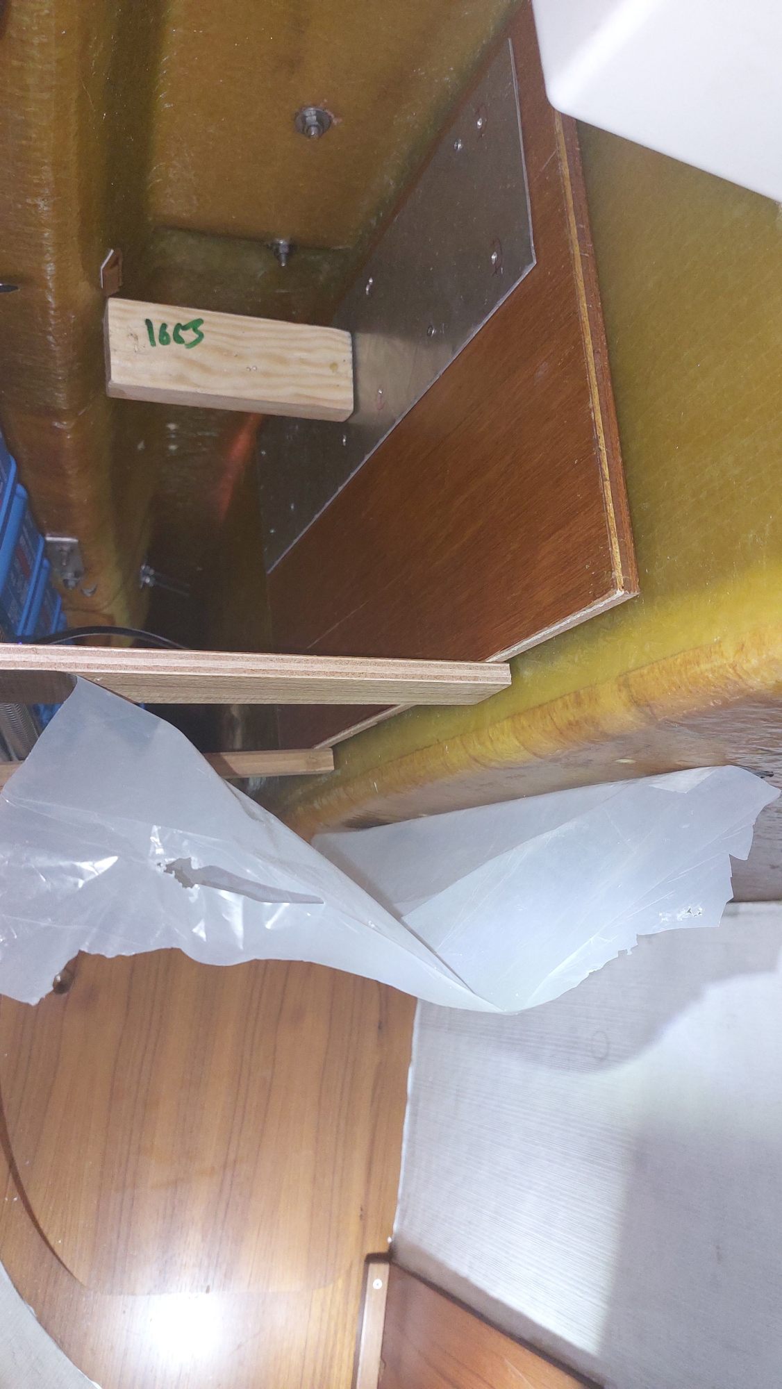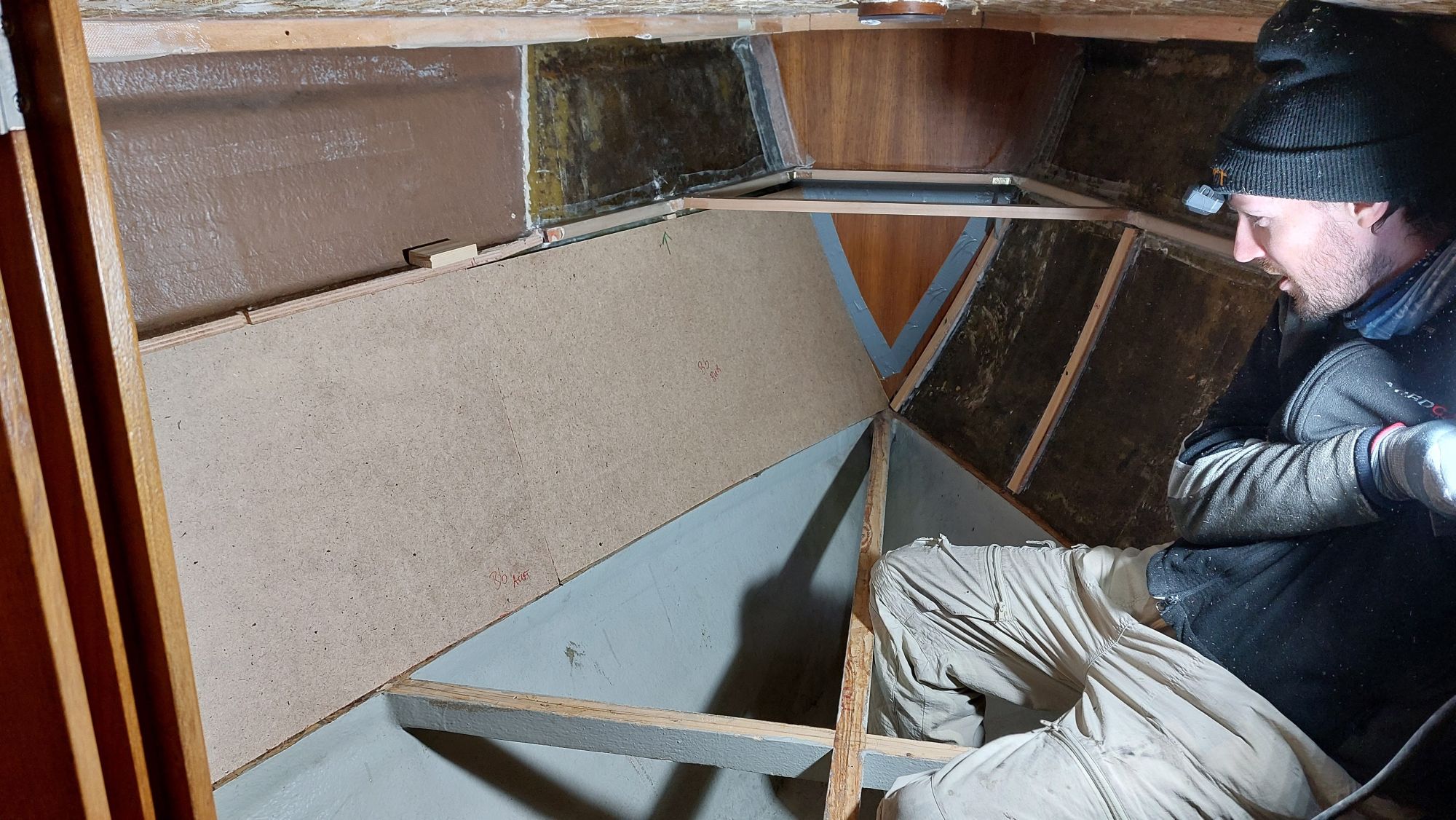 Der Tank in der Bilge sah ziemlich gammelig aus. Den Schlitz oben unterm Salonboden fülle ich mit Brunnenschaum und gehe anschließend mit Epoxyspachter darüber. Das soll das Reinigen vereinfachen. Ganz fertig wird das diesen Winter aber nicht mehr. Alles ist nur mit Verrenkungen zu erreichen und die Spachtelarbeiten sehen entsprechend stümperhaft aus.