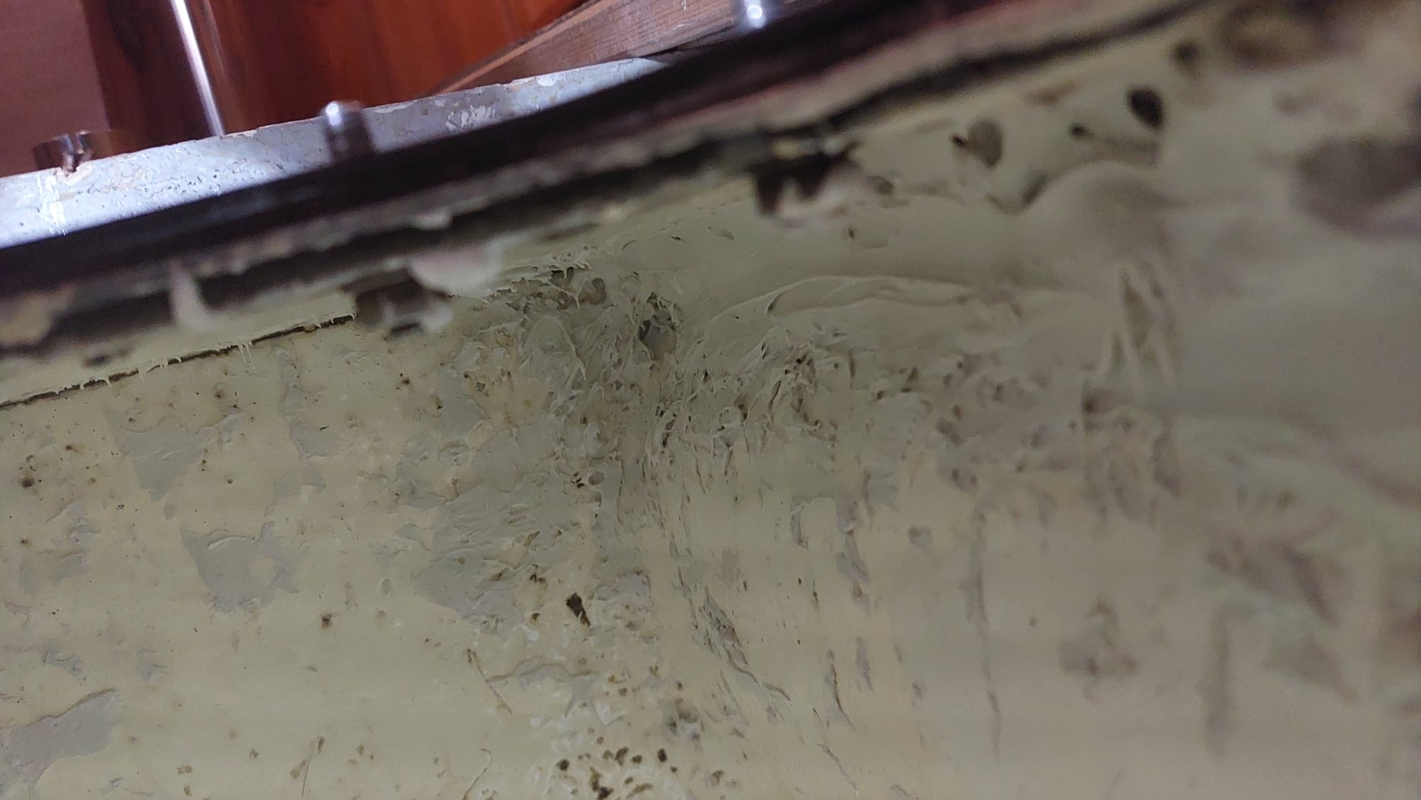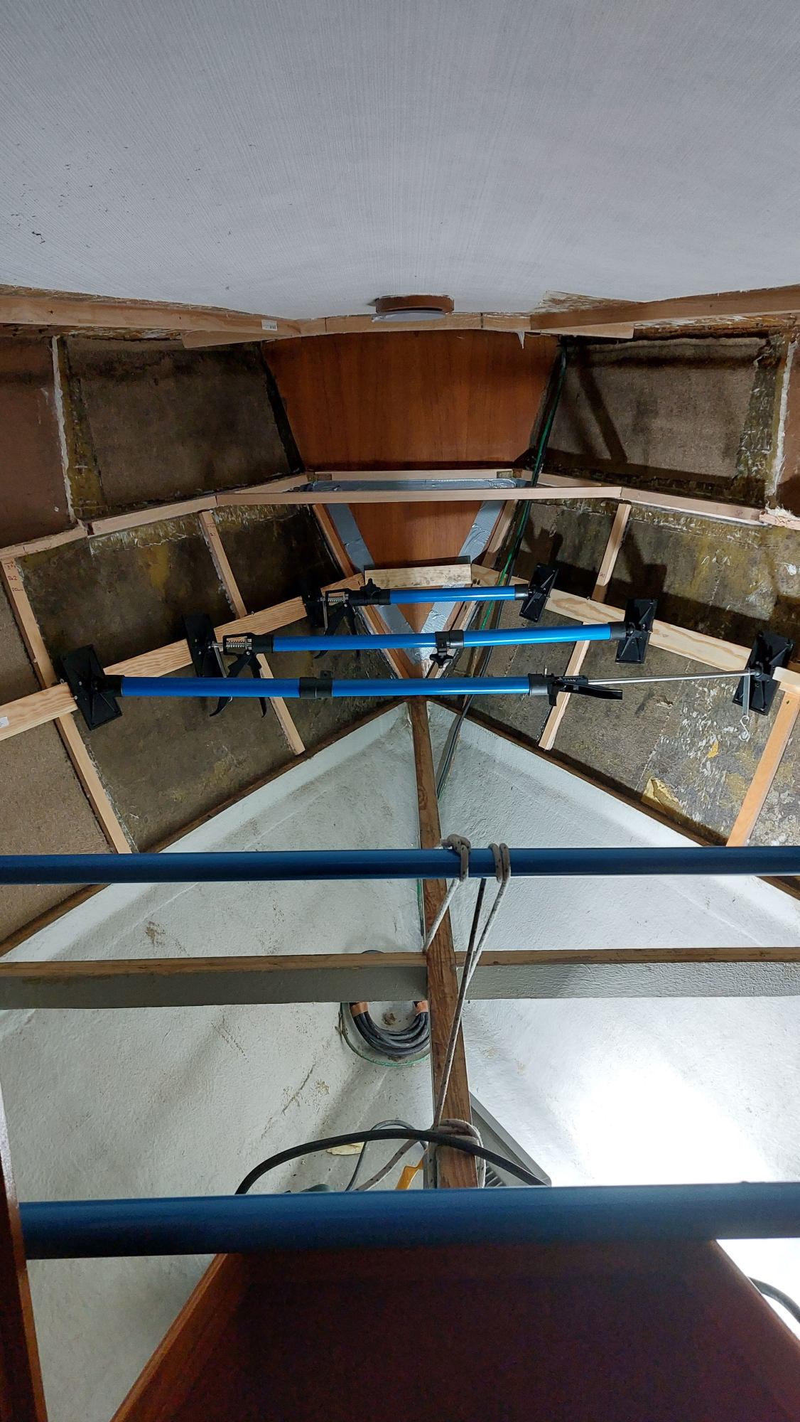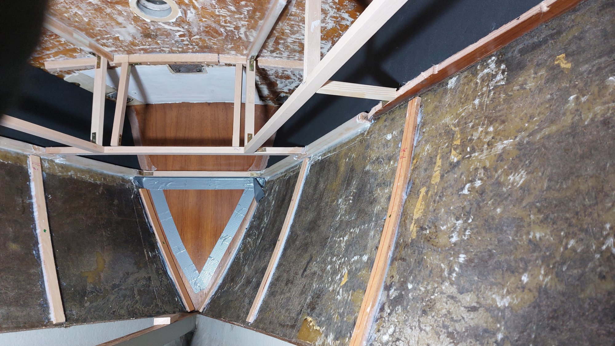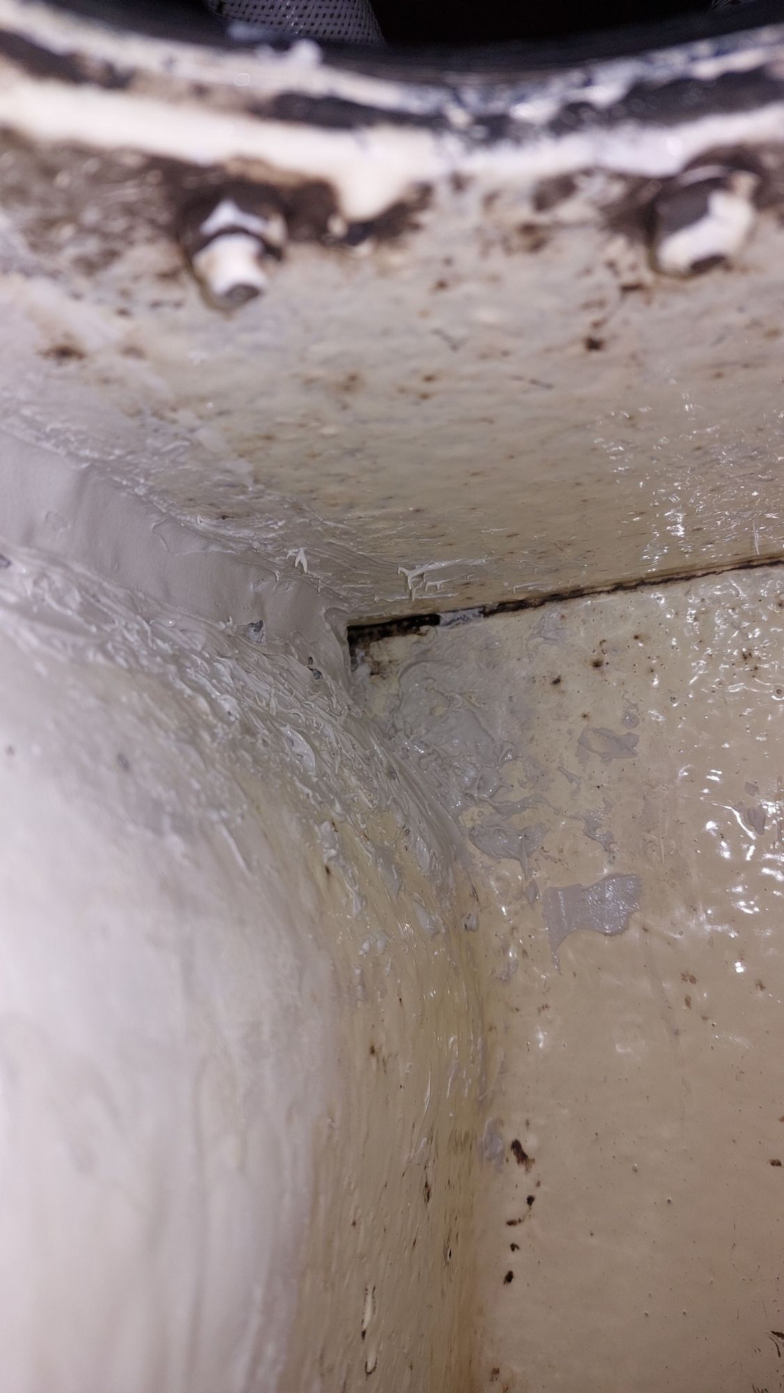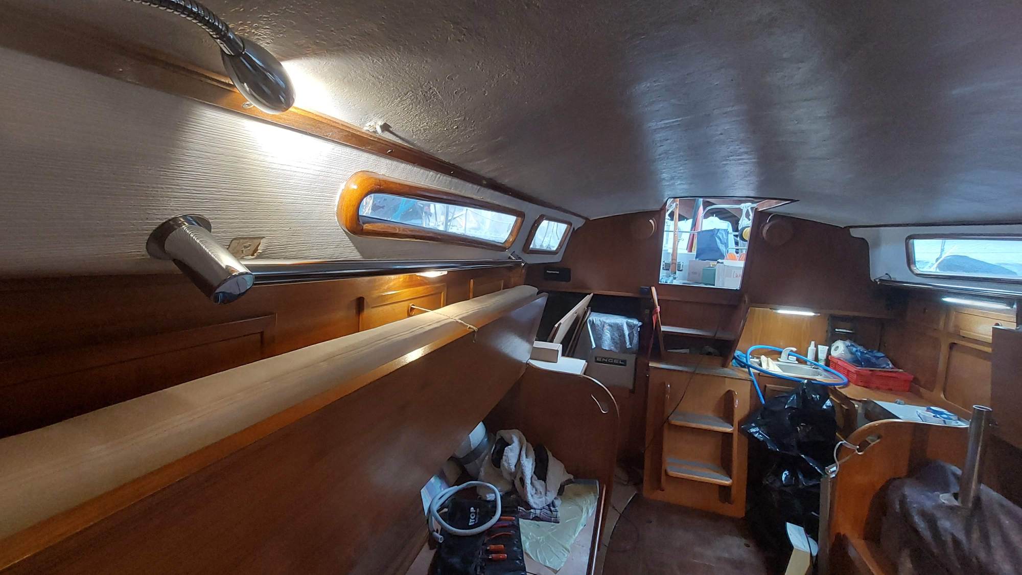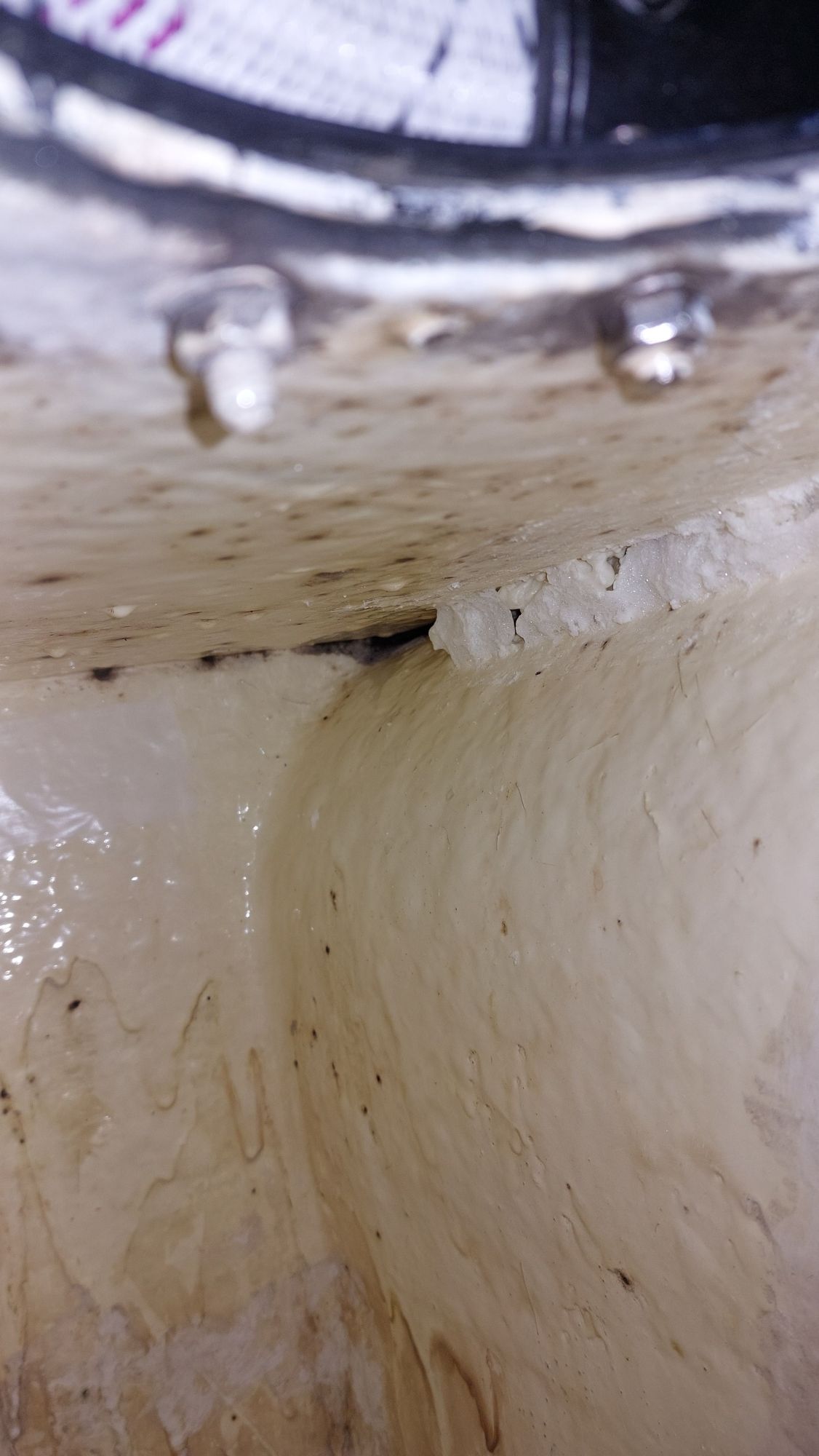 Der Tank in der Bilge sah ziemlich gammelig aus. Den Schlitz oben unterm Salonboden fülle ich mit Brunnenschaum und gehe anschließend mit Epoxyspachter darüber. Das soll das Reinigen vereinfachen. Ganz fertig wird das diesen Winter aber nicht mehr. Alles ist nur mit Verrenkungen zu erreichen und die Spachtelarbeiten sehen entsprechend stümperhaft aus.