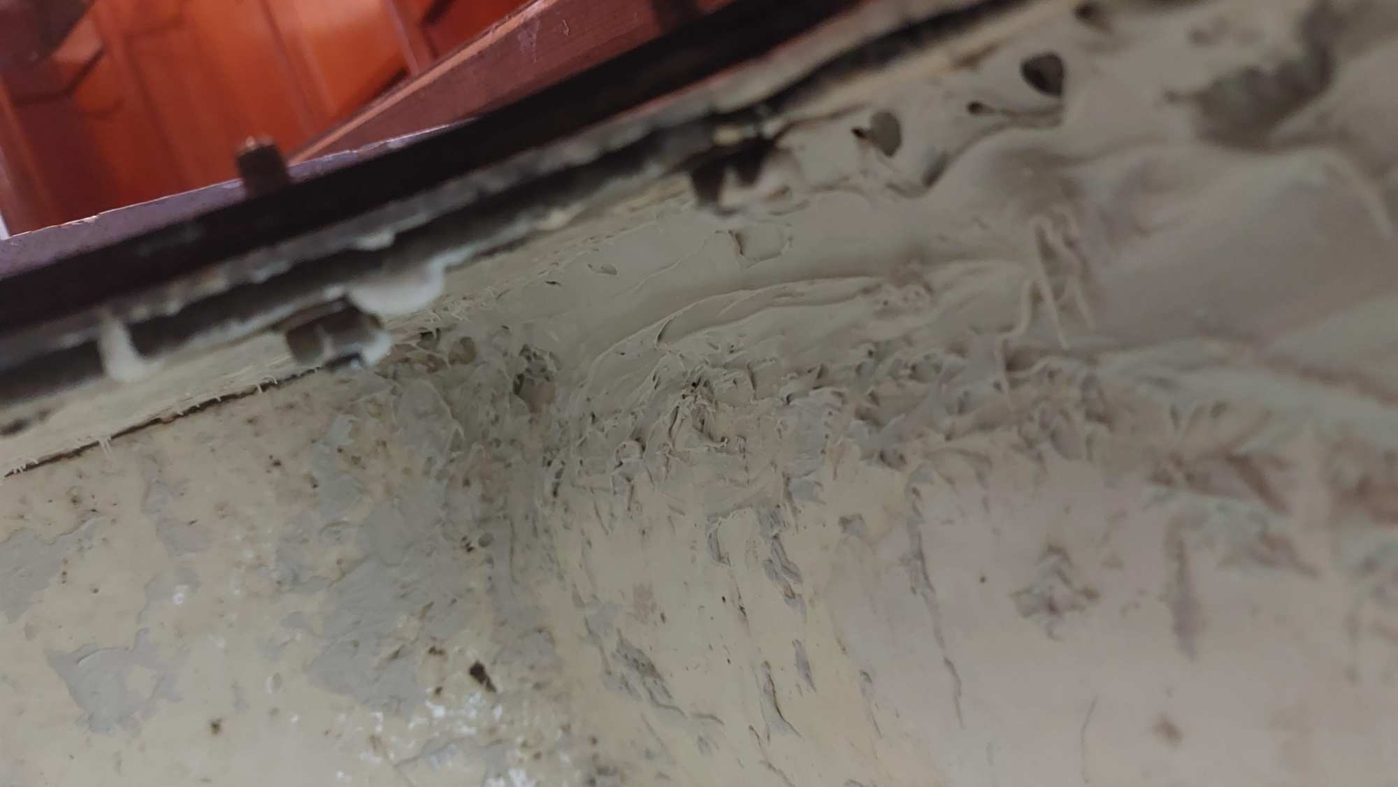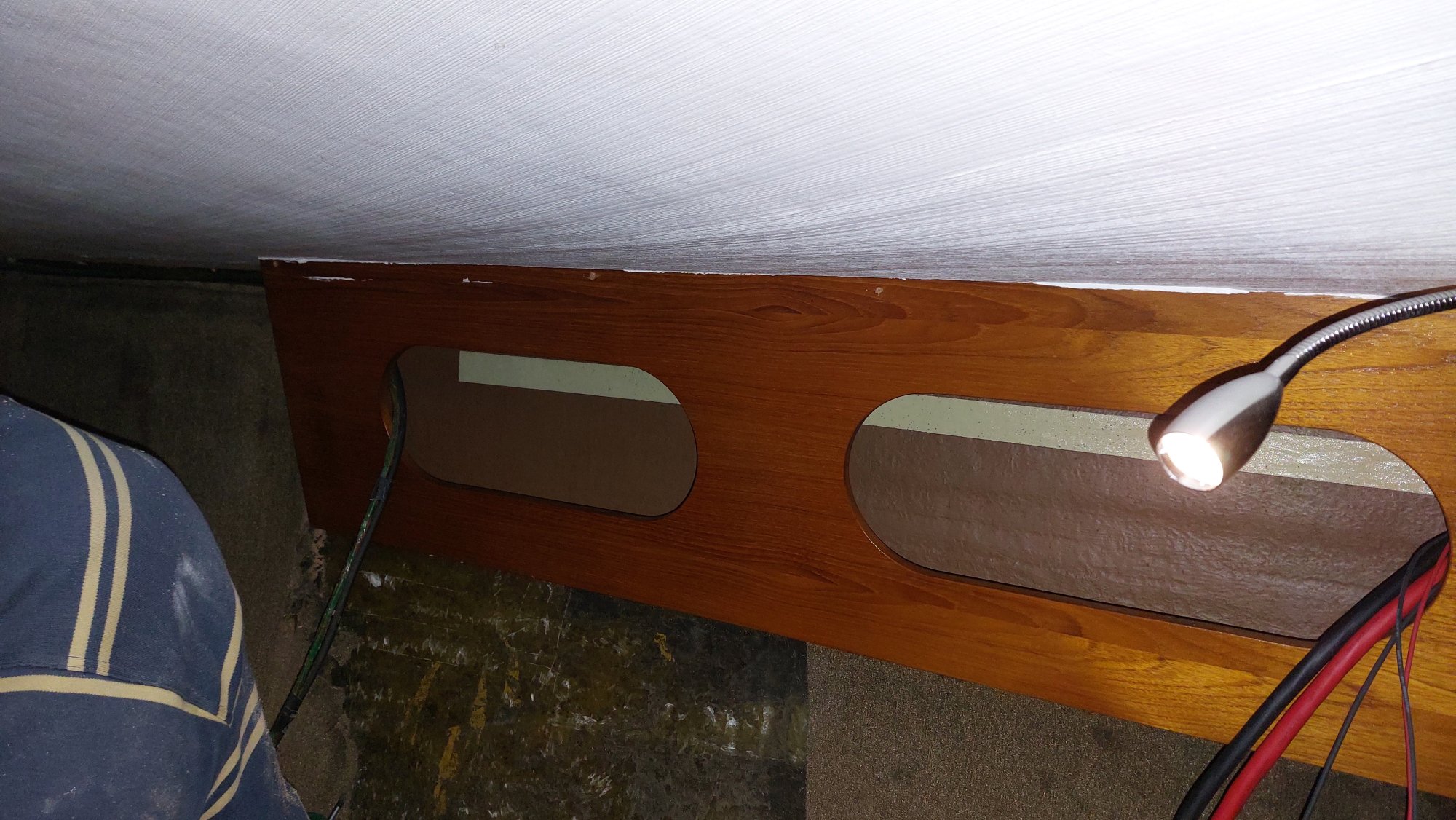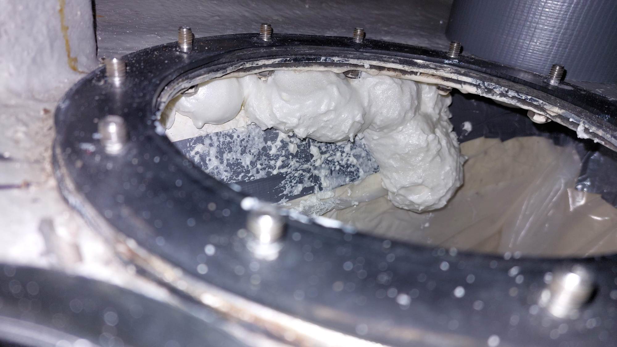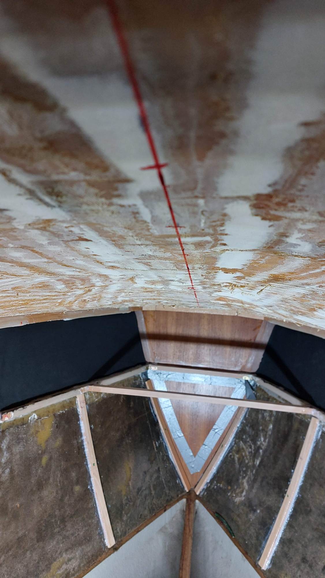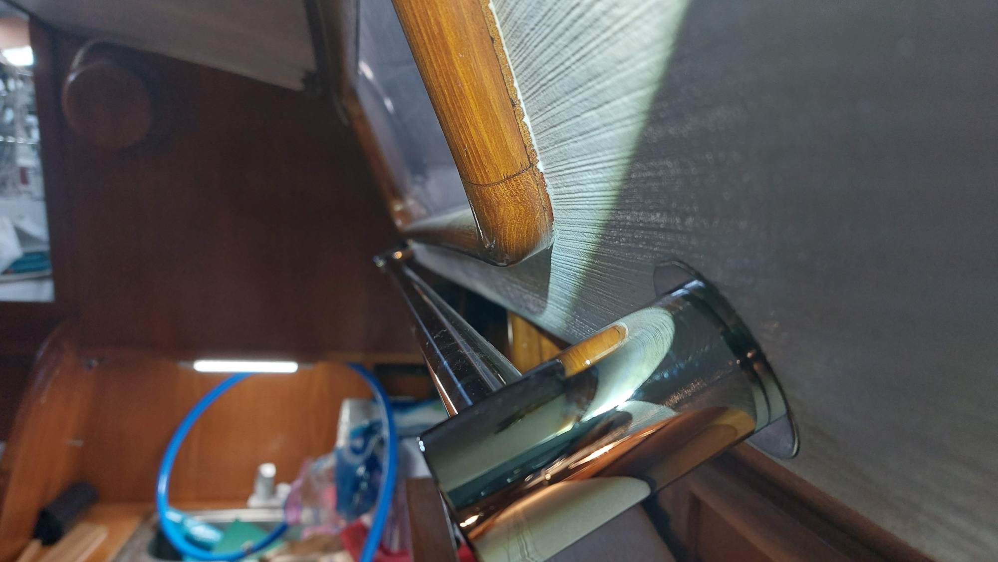 Der Tank in der Bilge sah ziemlich gammelig aus. Den Schlitz oben unterm Salonboden fülle ich mit Brunnenschaum und gehe anschließend mit Epoxyspachter darüber. Das soll das Reinigen vereinfachen. Ganz fertig wird das diesen Winter aber nicht mehr. Alles ist nur mit Verrenkungen zu erreichen und die Spachtelarbeiten sehen entsprechend stümperhaft aus.