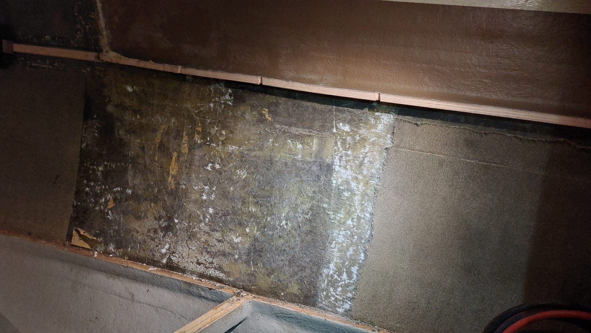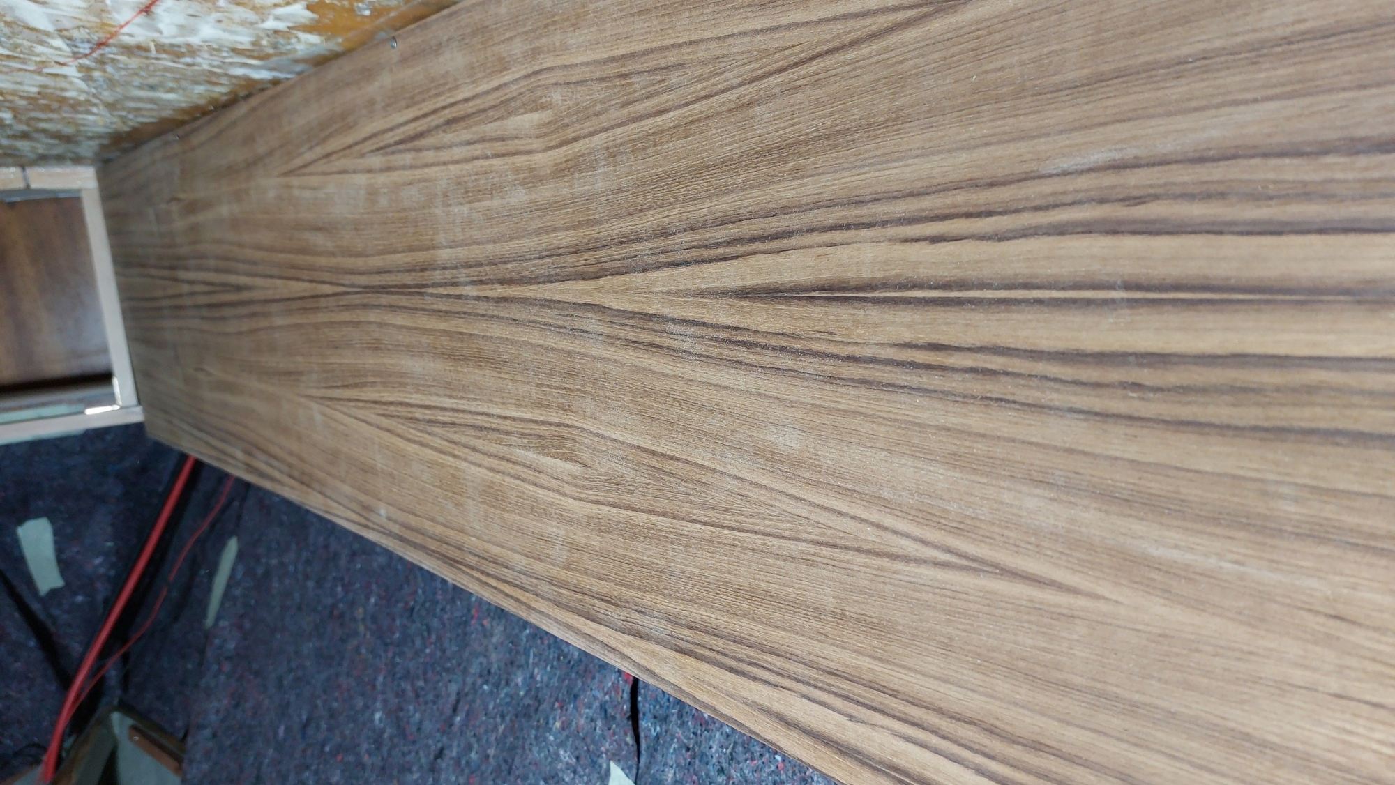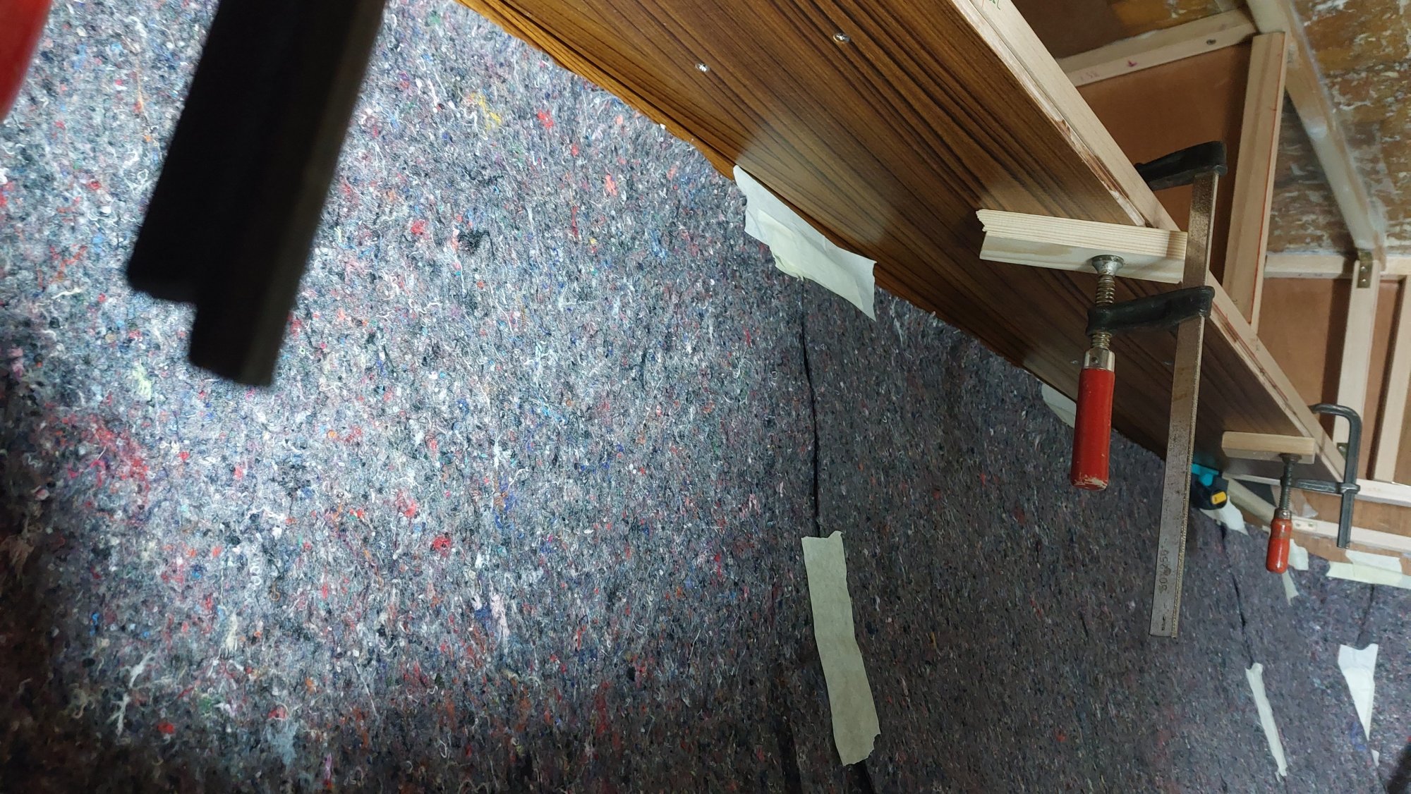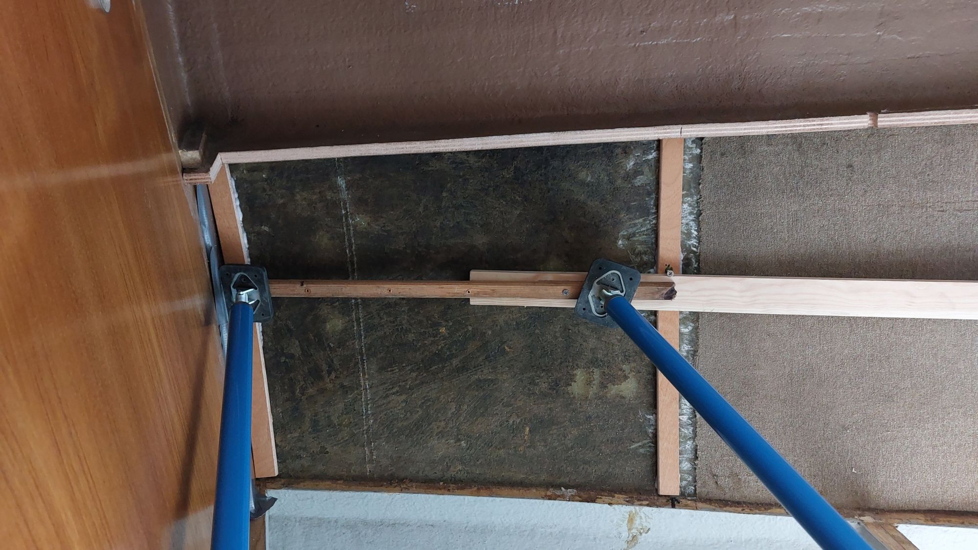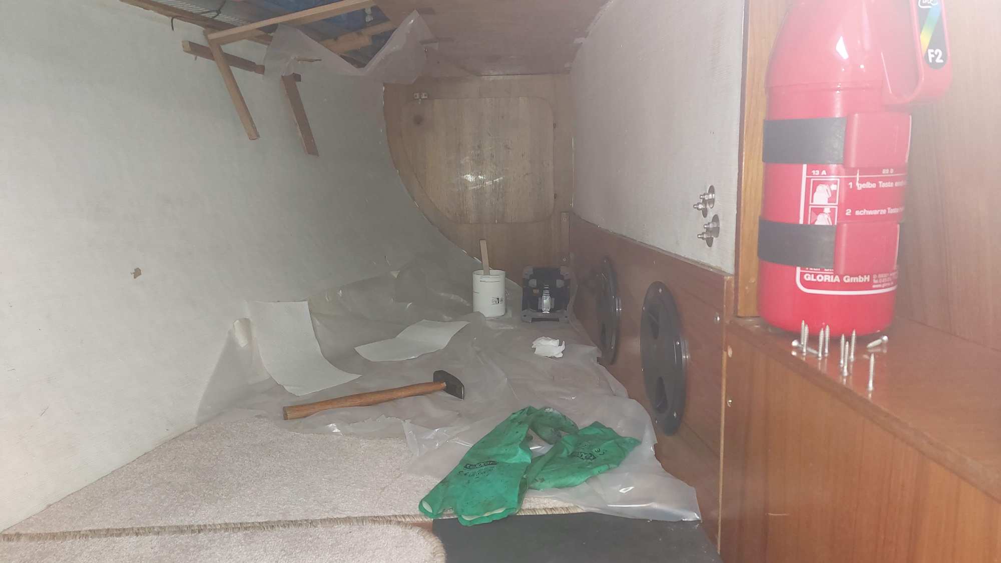Später kommt auch der Rest des Teppichs von der Wand. Direkt auf die Außenwand kommt oben und unten Armaflex zur Isolierung. Der Gerüstbau beginnt, sobald das Innere der Schränke isoliert ist.