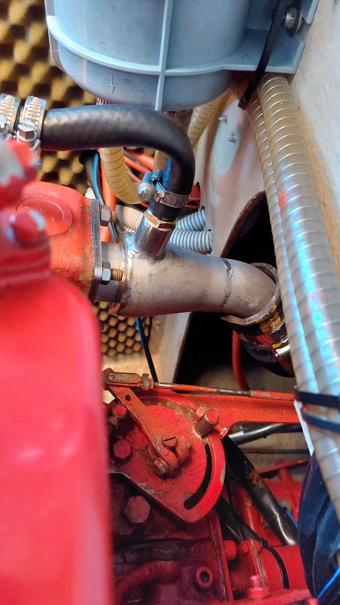 Der alte Krümmer aus Edelstahl hatte schon geleckt. Der Anschluss für den Kühlwasserschlauch liegt beim neuen etwas ungünstig. Funktioniert aber.
