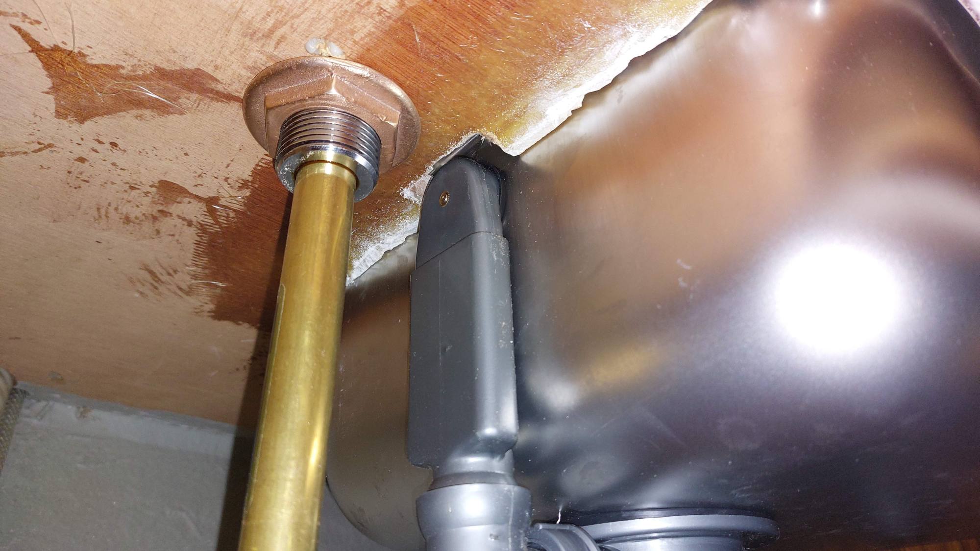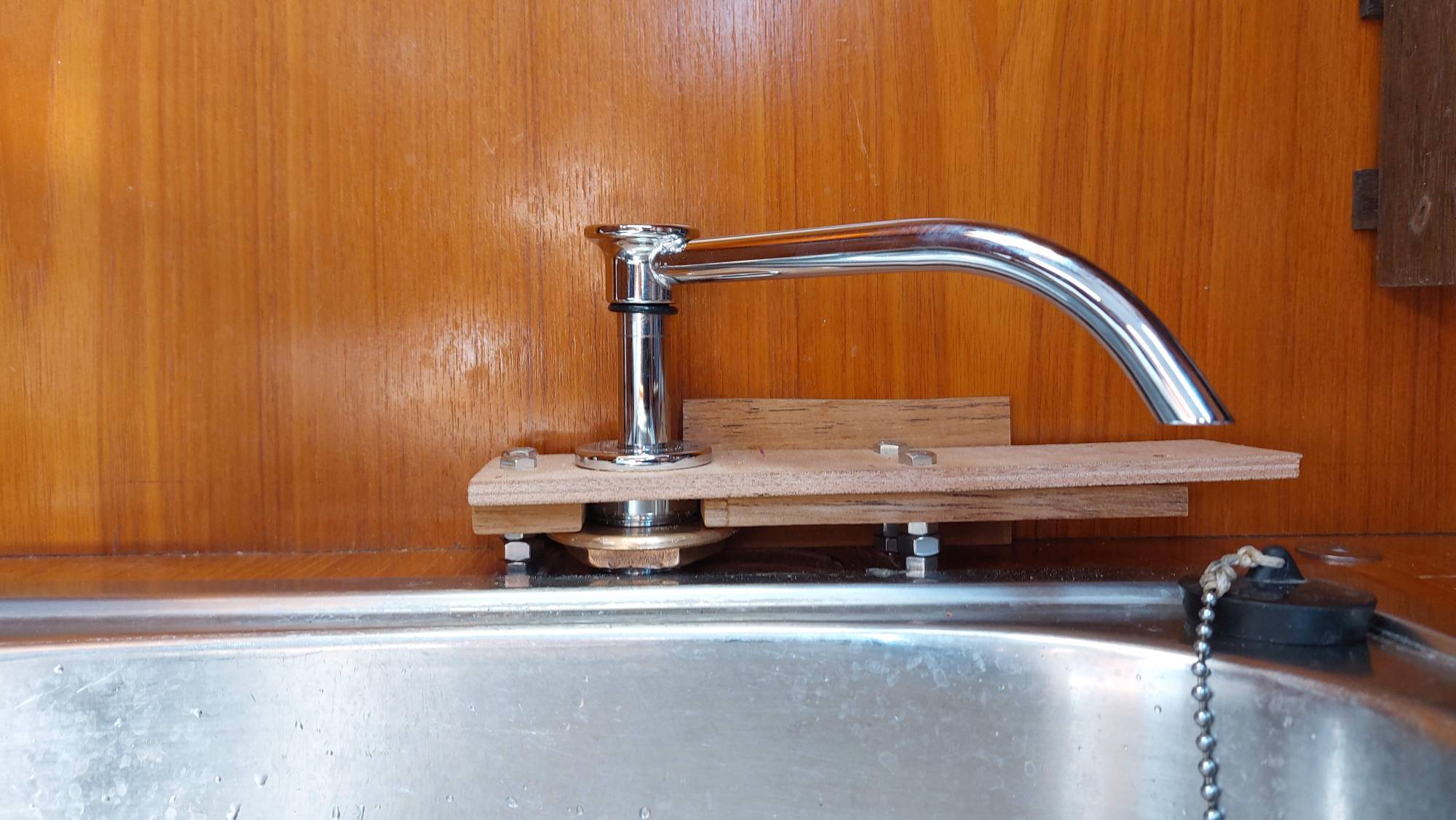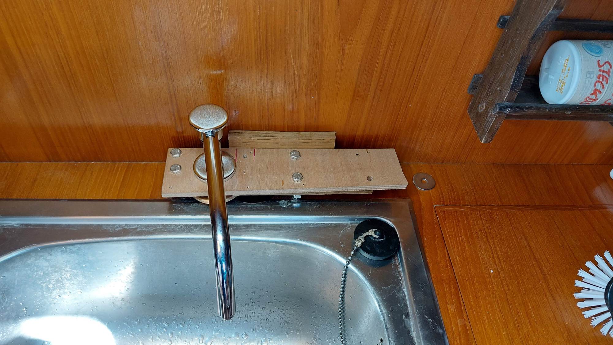 Die Wasserhahn-Variante mit dem gebogenen Schlauch hat leider nicht so gut funktioniert. Einen der neuen Wasserhähne bringe ich vorläufig an. Die Kontermutter ist etwas zu groß, da muss noch eine Lösung gefunden werden.