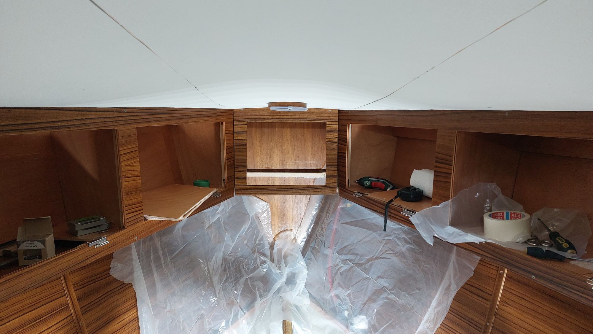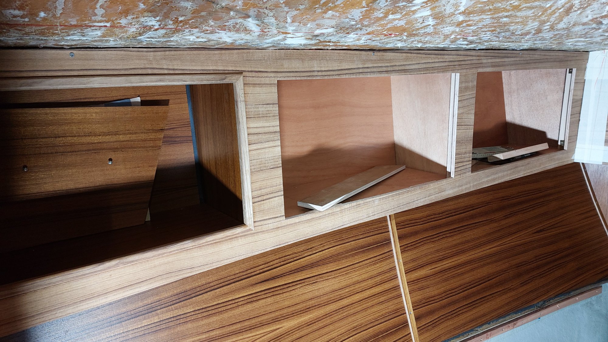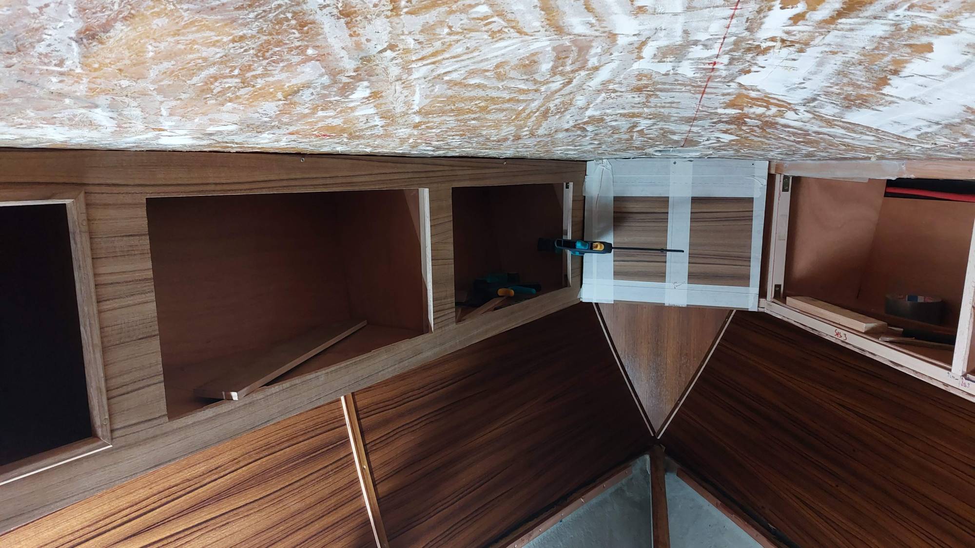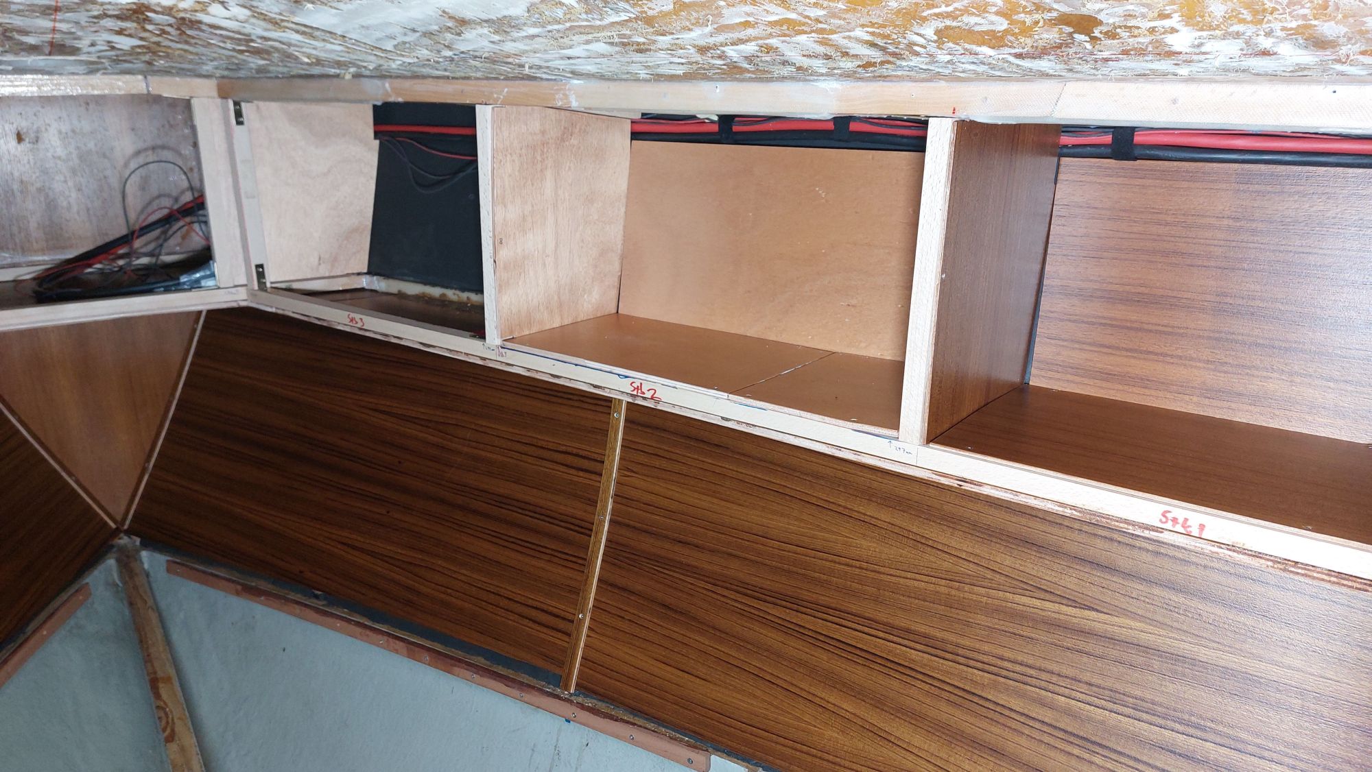 Die Schrankfächer bekommen ein Innenleben und die Deckenverkleidung wird geplant.
