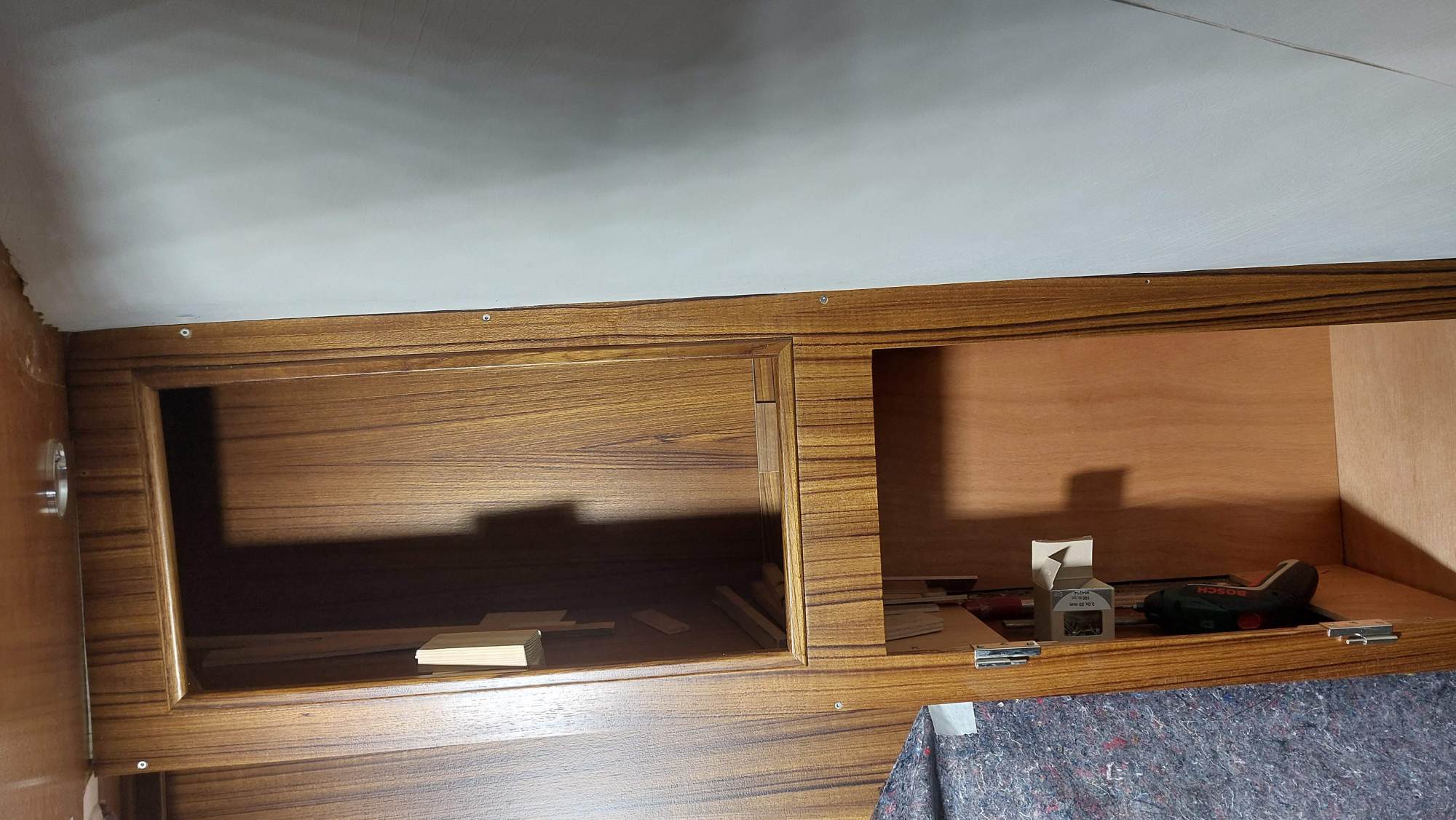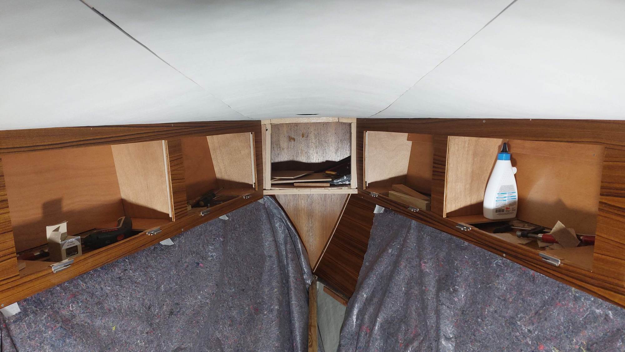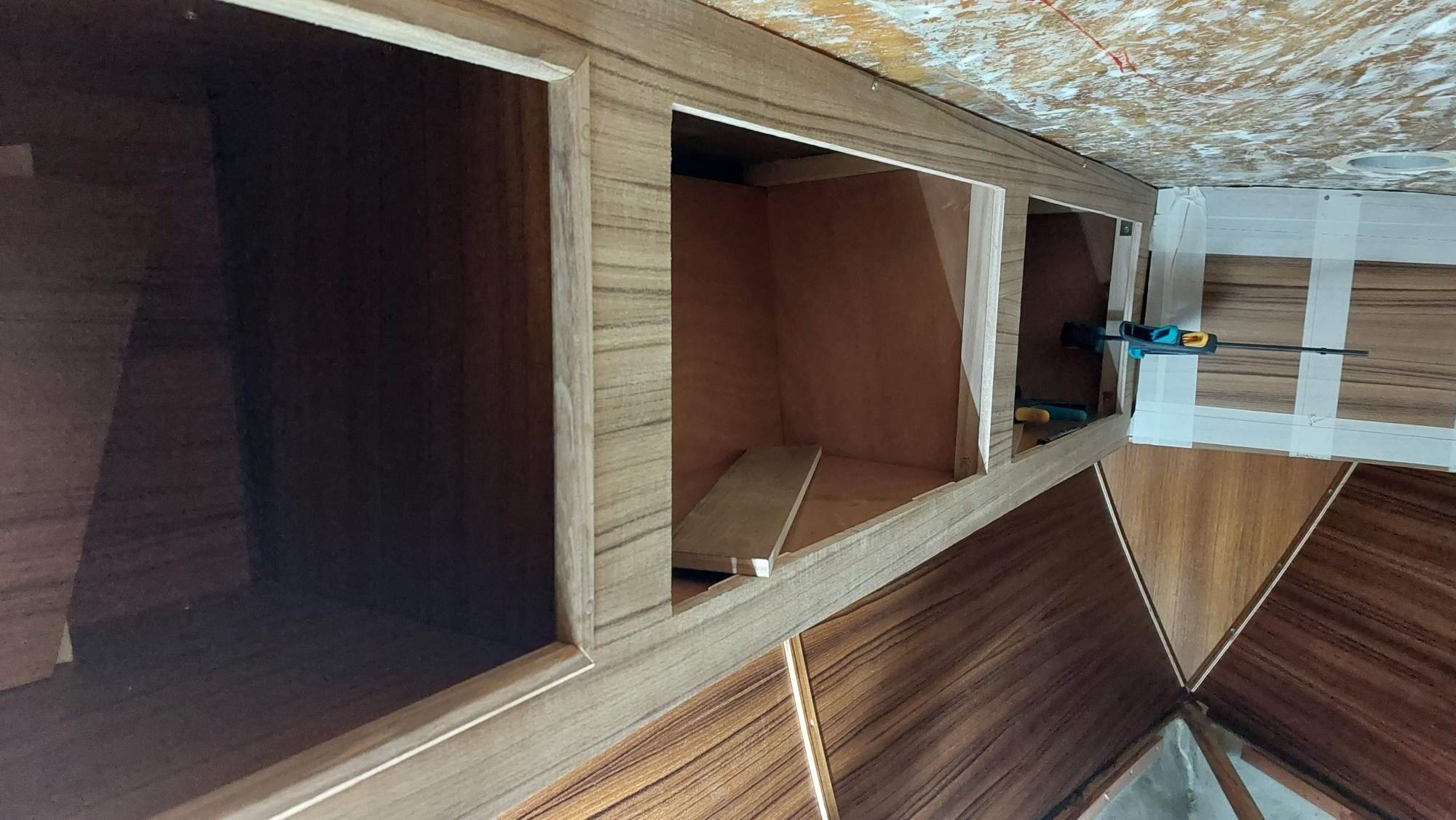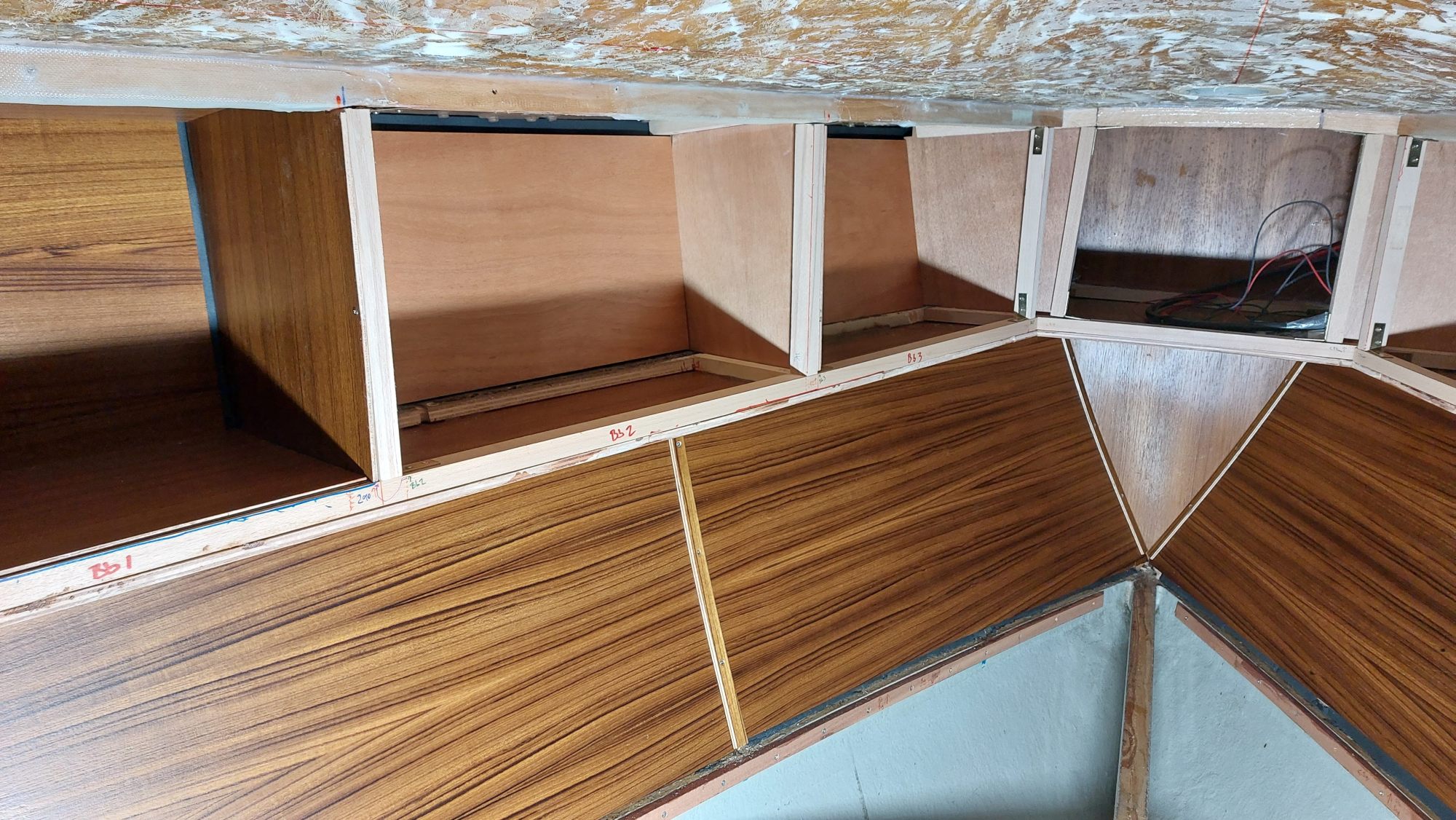 Die Schrankfächer bekommen ein Innenleben und die Deckenverkleidung wird geplant.
