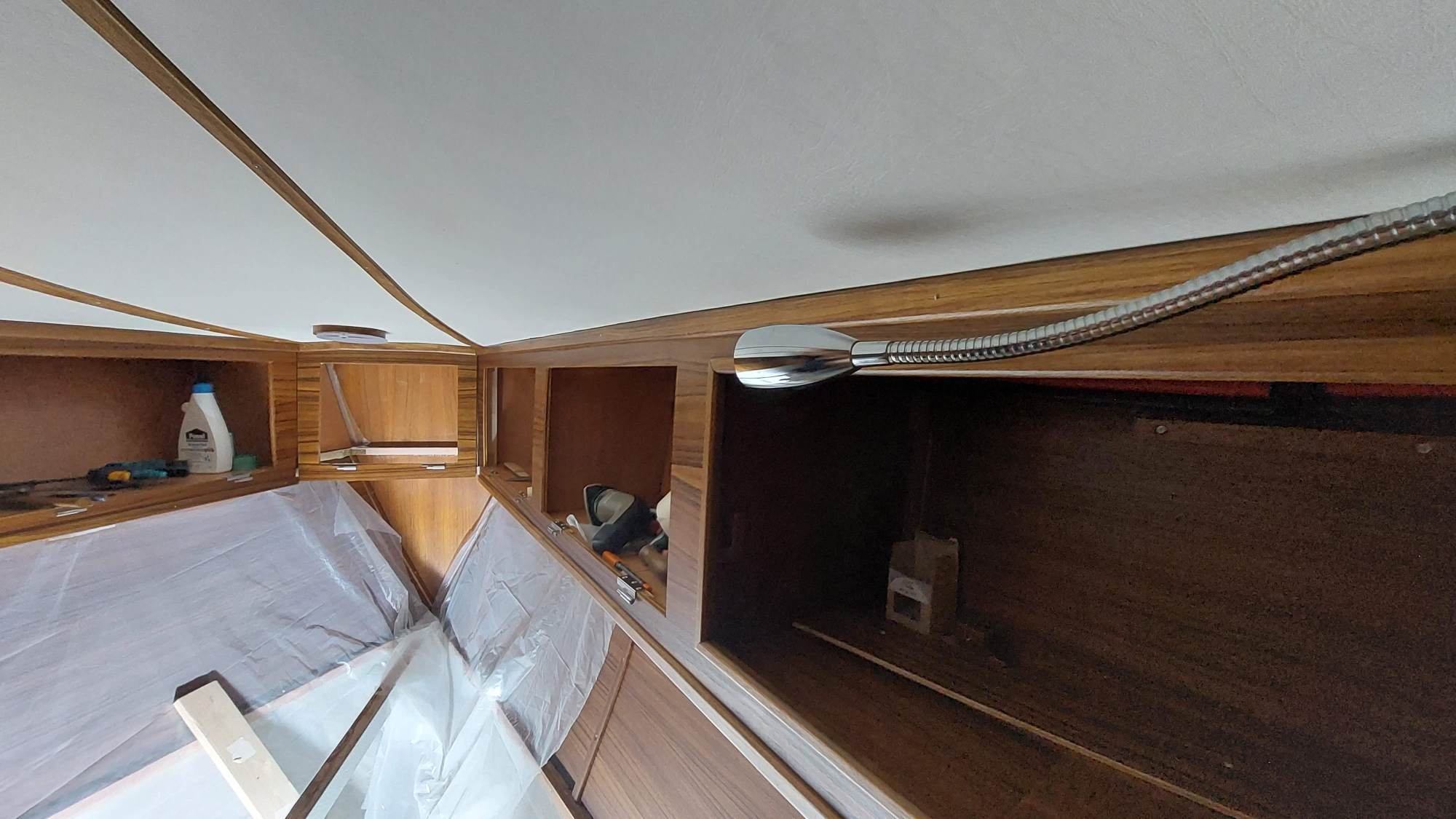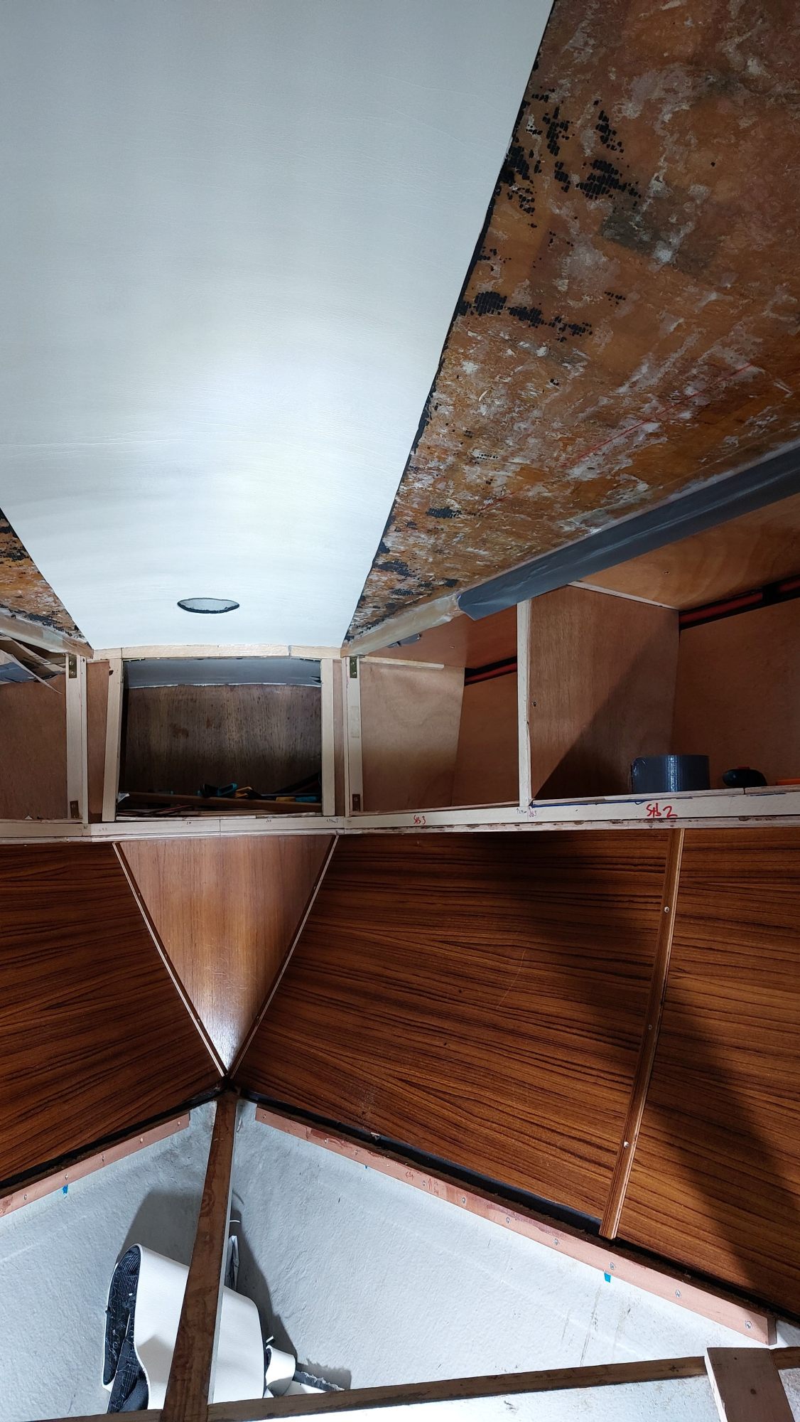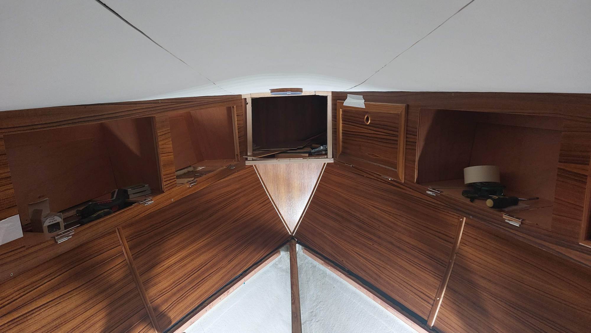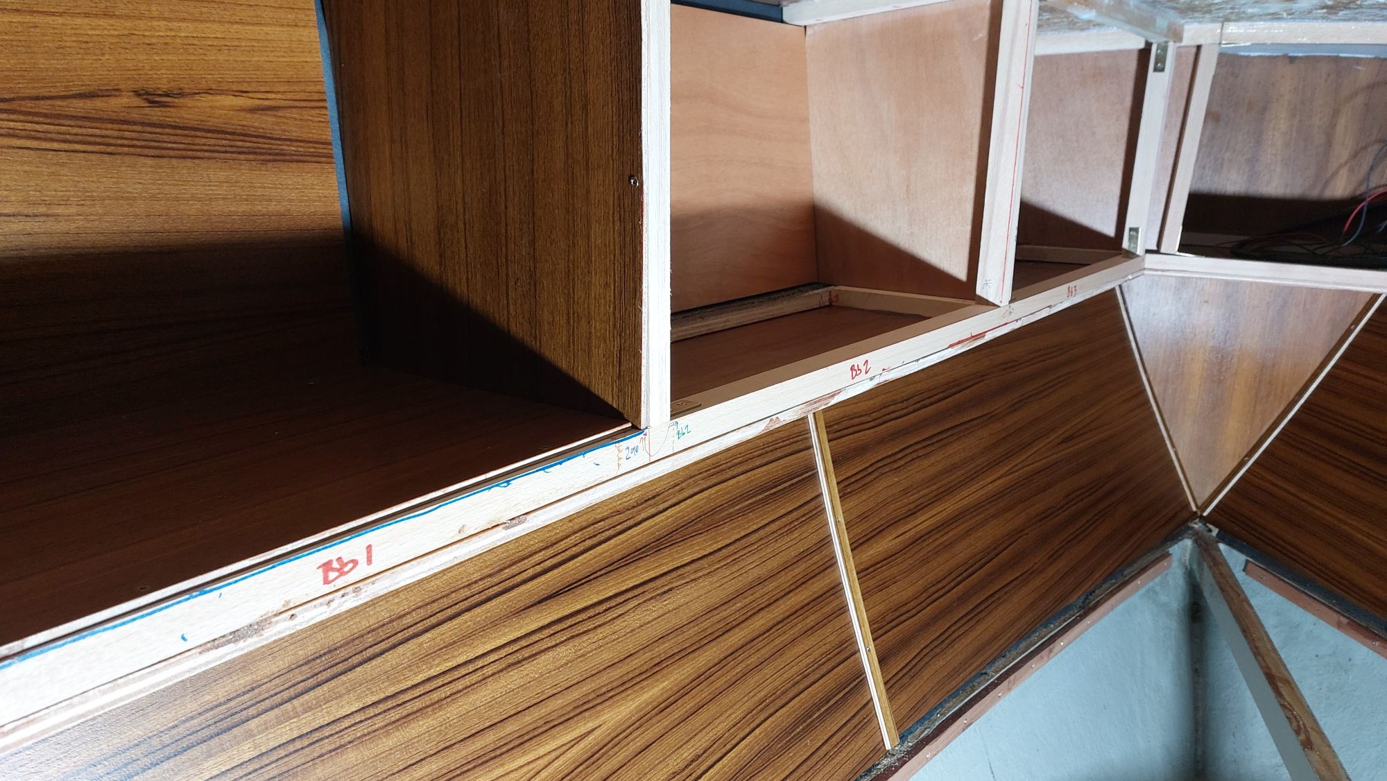 Die Schrankfächer bekommen ein Innenleben und die Deckenverkleidung wird geplant.