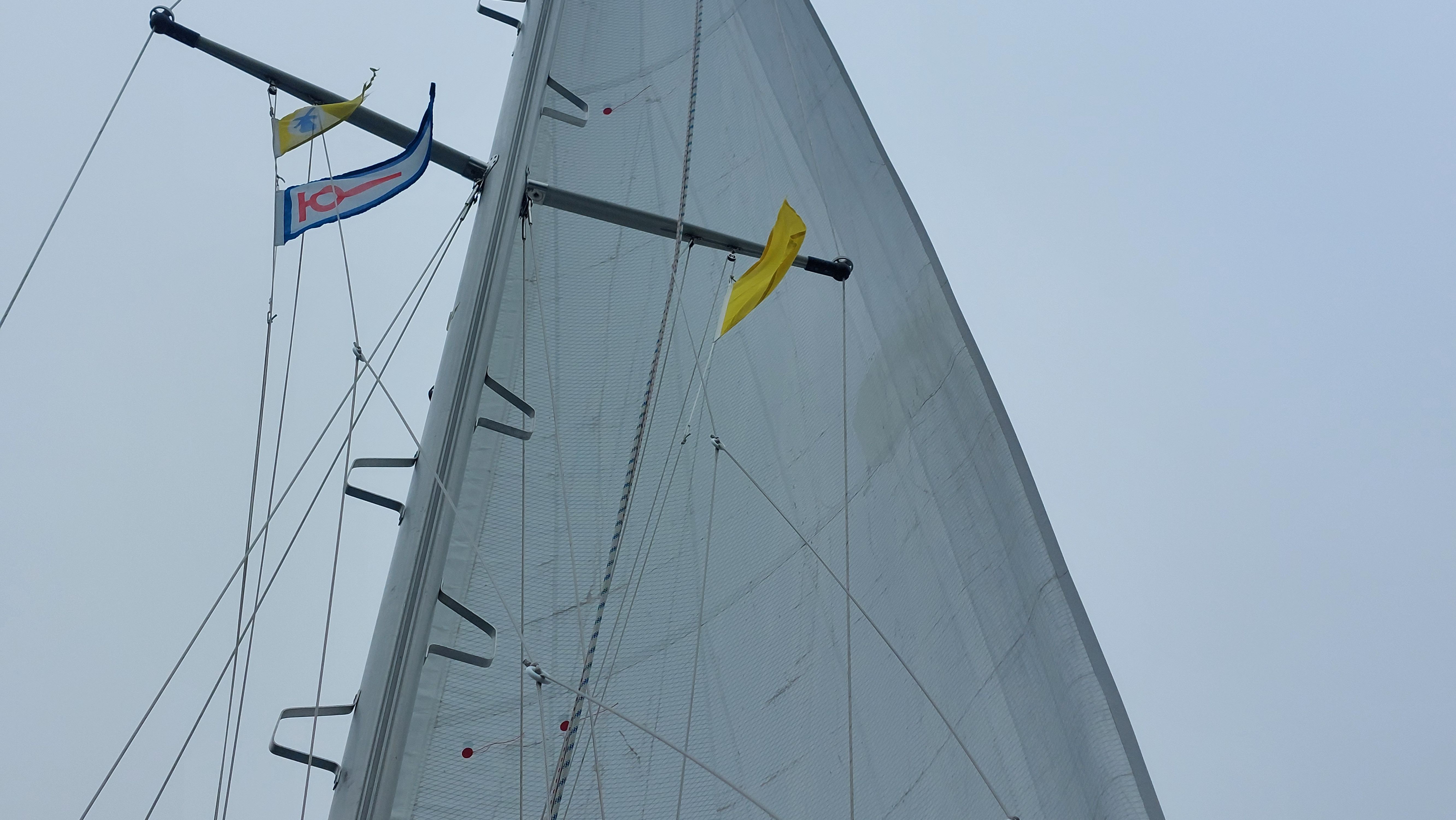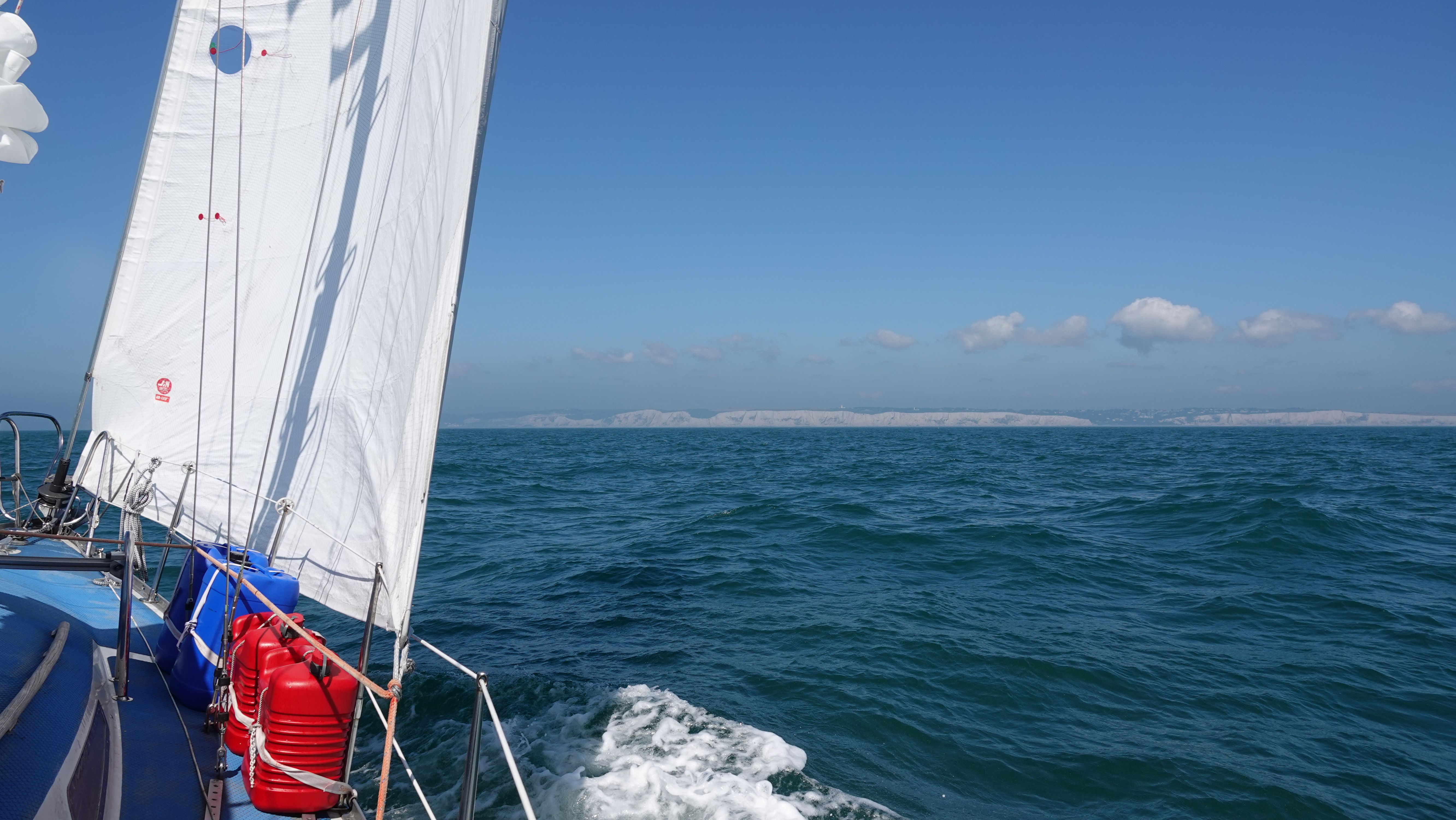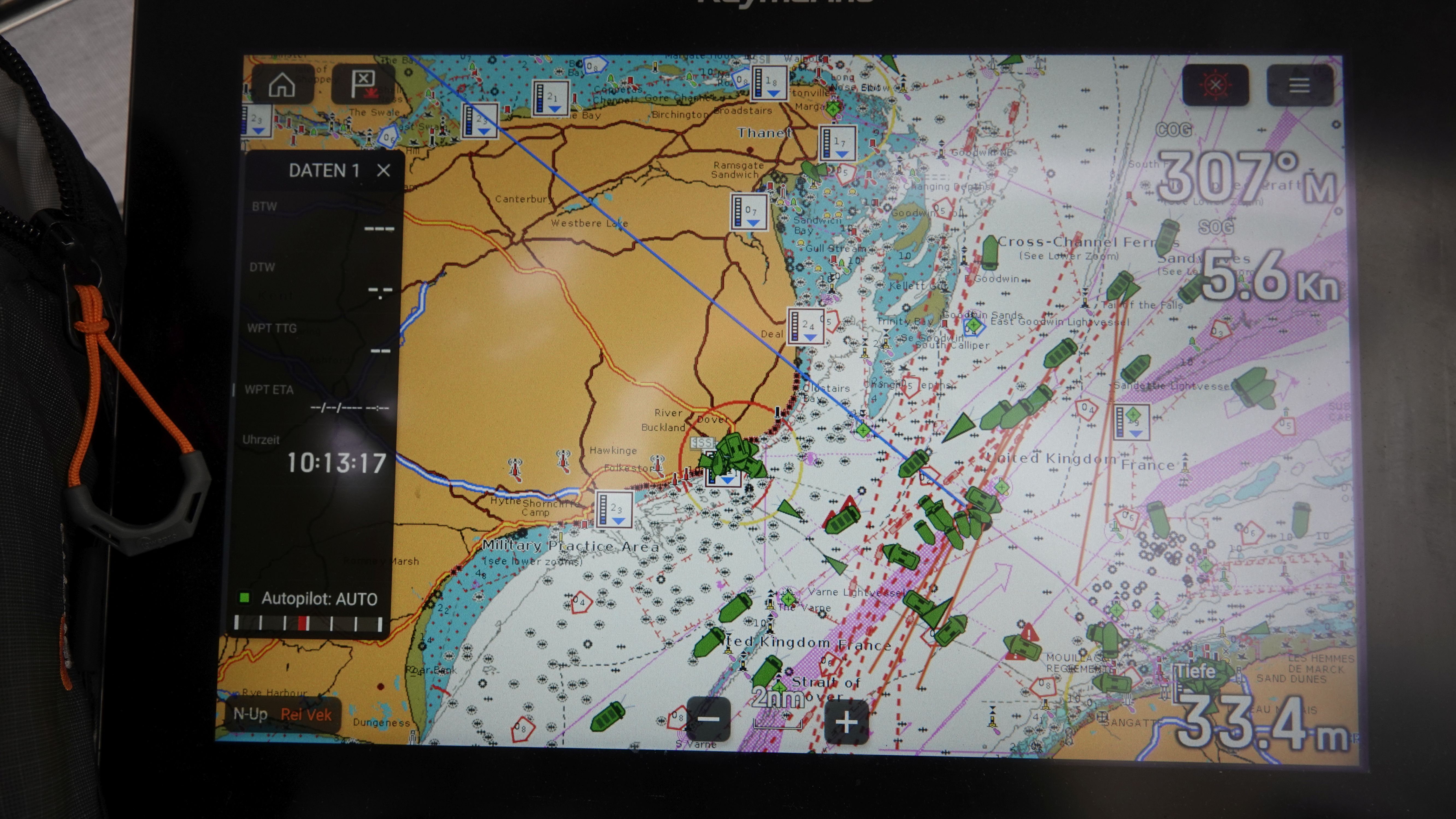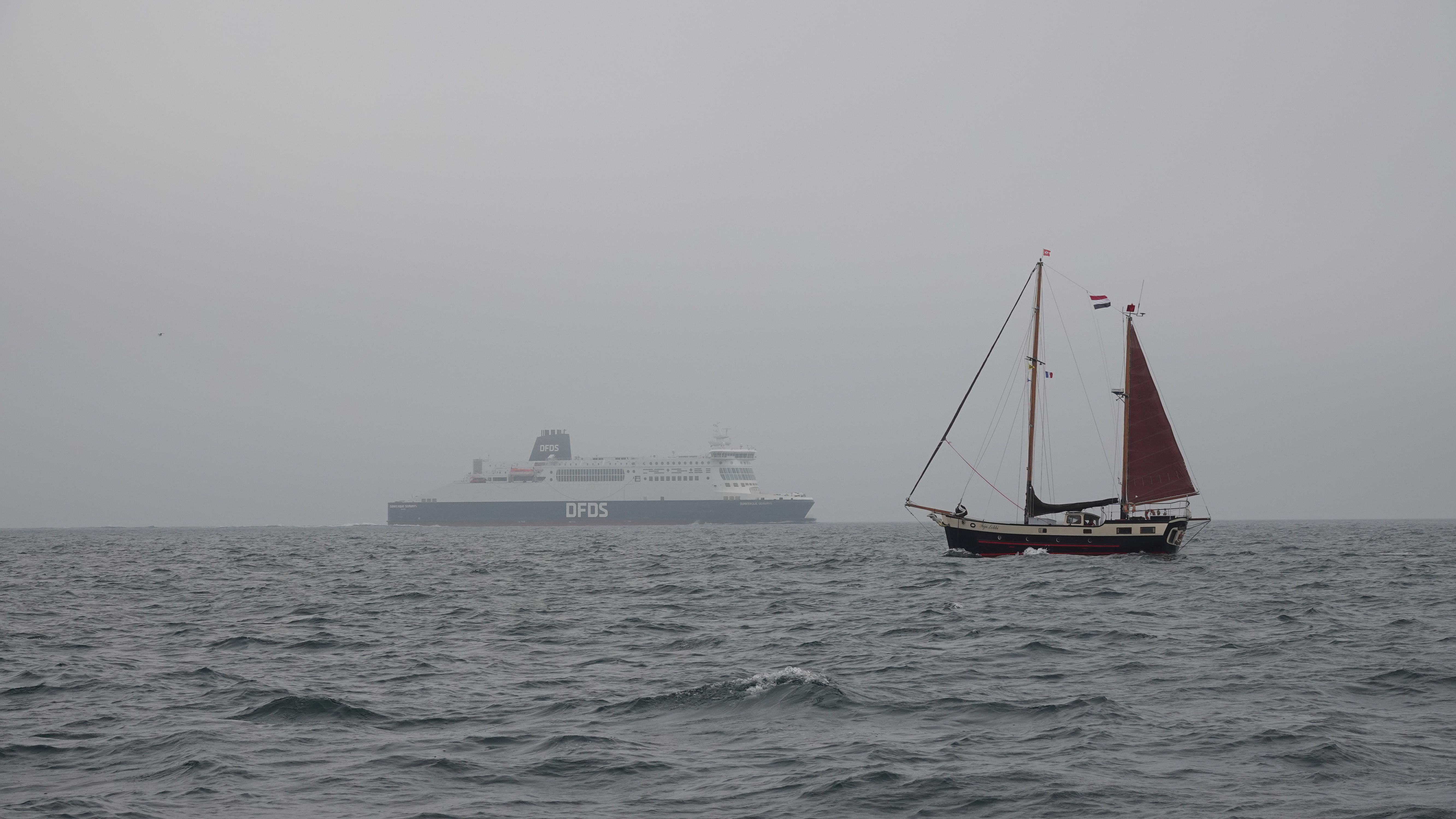 Ich setze nur die Genua. Während es im Schutz des Hafens noch schwachwindig war weht es draußen mit Windstärke vier aus West. Das passt gut für die kurze Fahrt über den Kanal. Es bleibt diesig und wird ab dem Grünstreifen des Verkehrstrennungsgebiets geradezu neblig. Die Nordost führende Spur war noch ziemlich leer. Doch jetzt kommt ordentlich Verkehr auf. Einige Frachter lassen irgendwo im Nebel ihre Nebelhörner erklingen, ein Trupp Schwimmer mit sieben Begleitbooten auf dem Weg von Dover nach Calais kommt mir entgegen, einer der großen Pötte droht schließlich arg dicht zu kommen. Ich fiere die Genuaschot um abzubremsen und hinter dem Frachter zu passieren. Kurz später, ich vermute noch bevor mein AIS die reduzierte Geschwindigkeit mitgeteilt hat, ruft der mich auch schon an, merkt aber dann auch schnell, dass wir uns doch nicht in die Quere kommen.