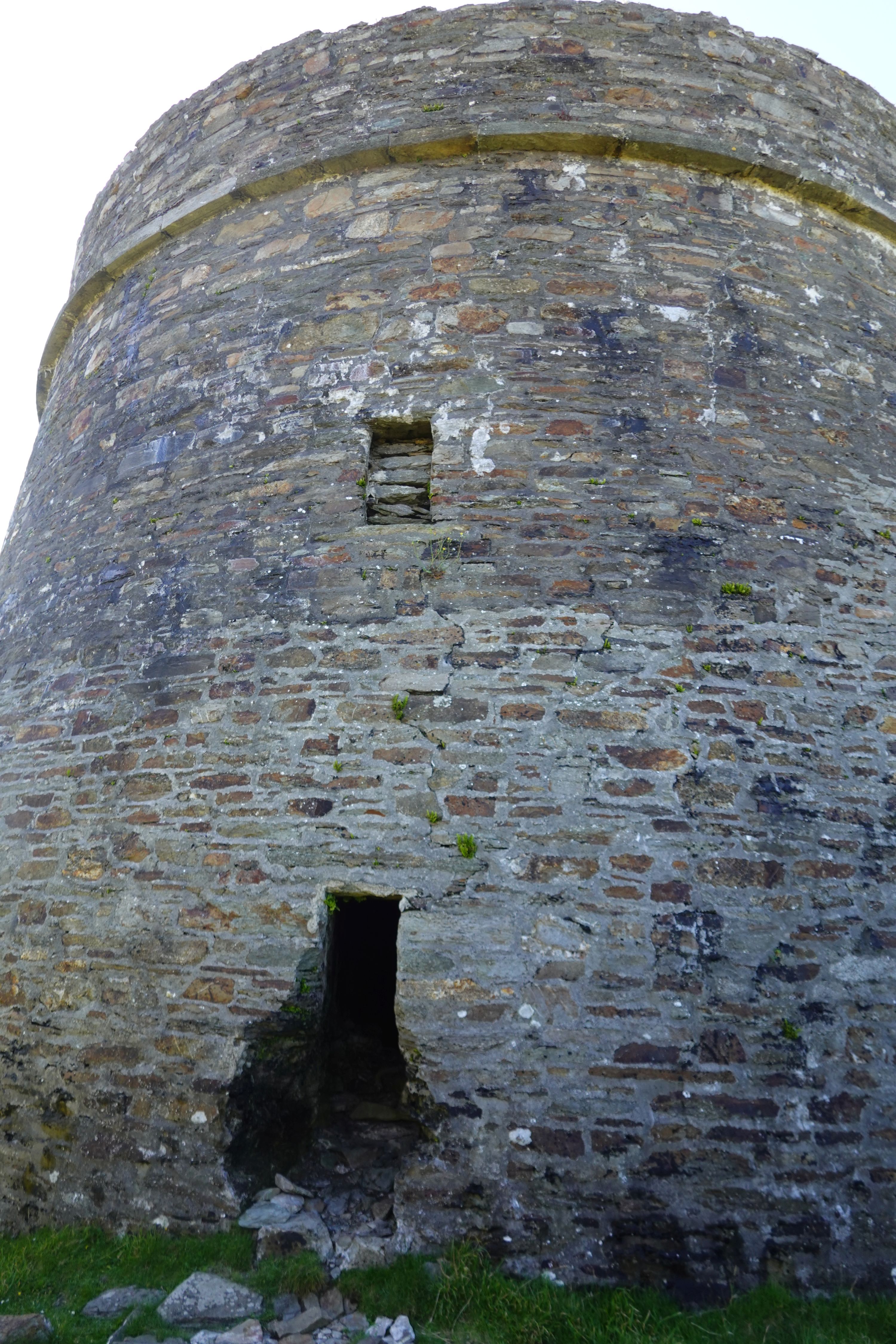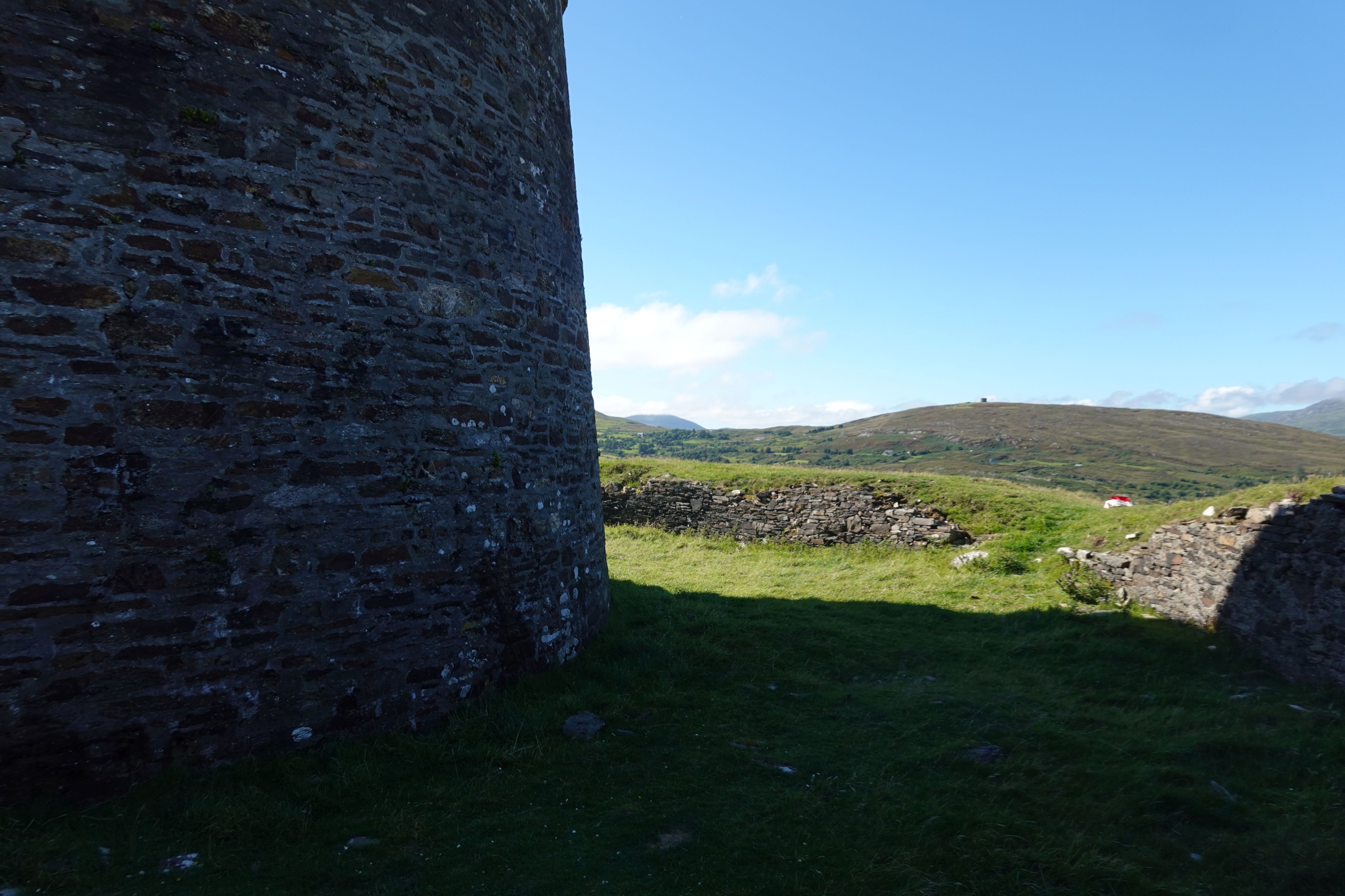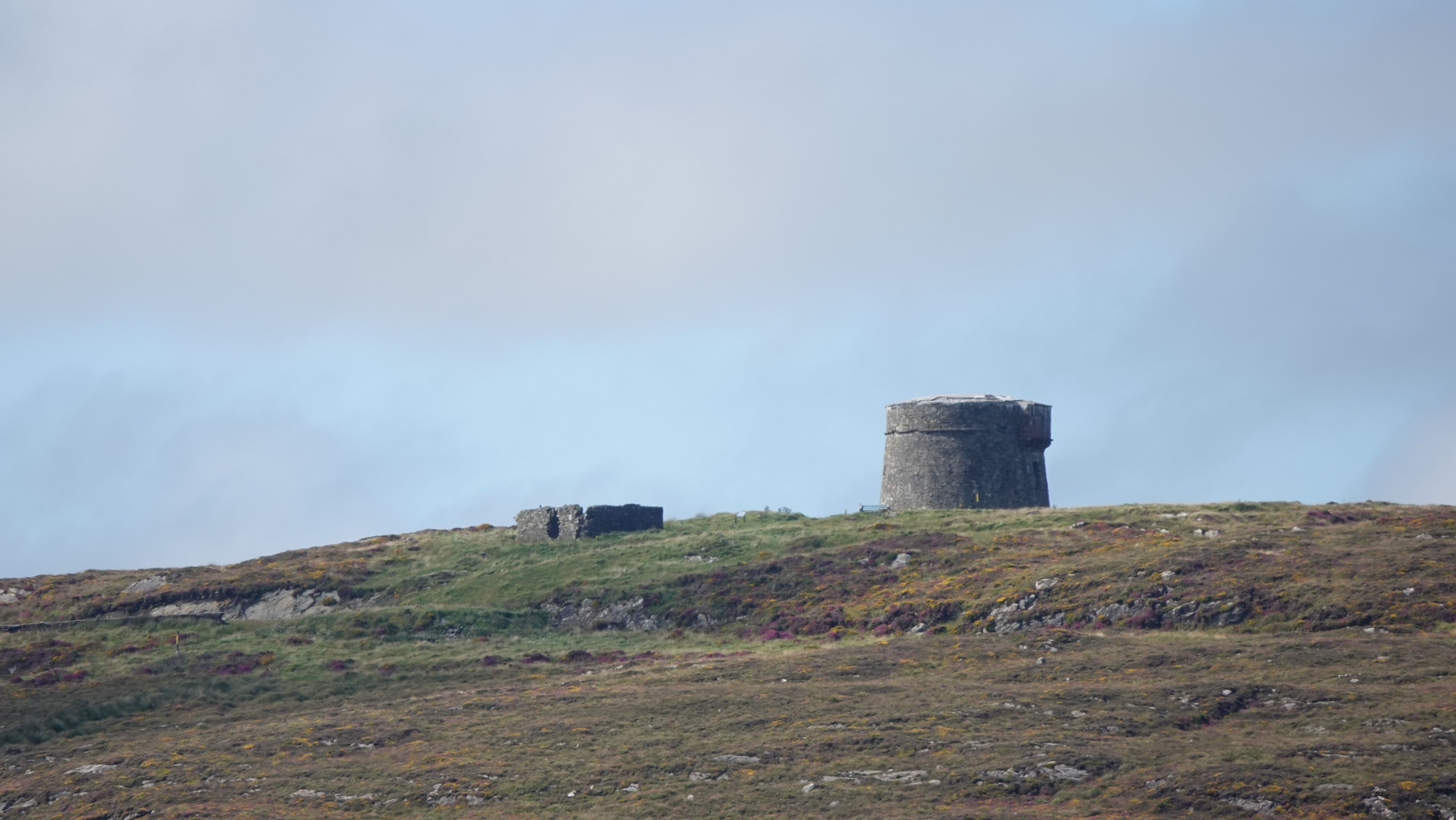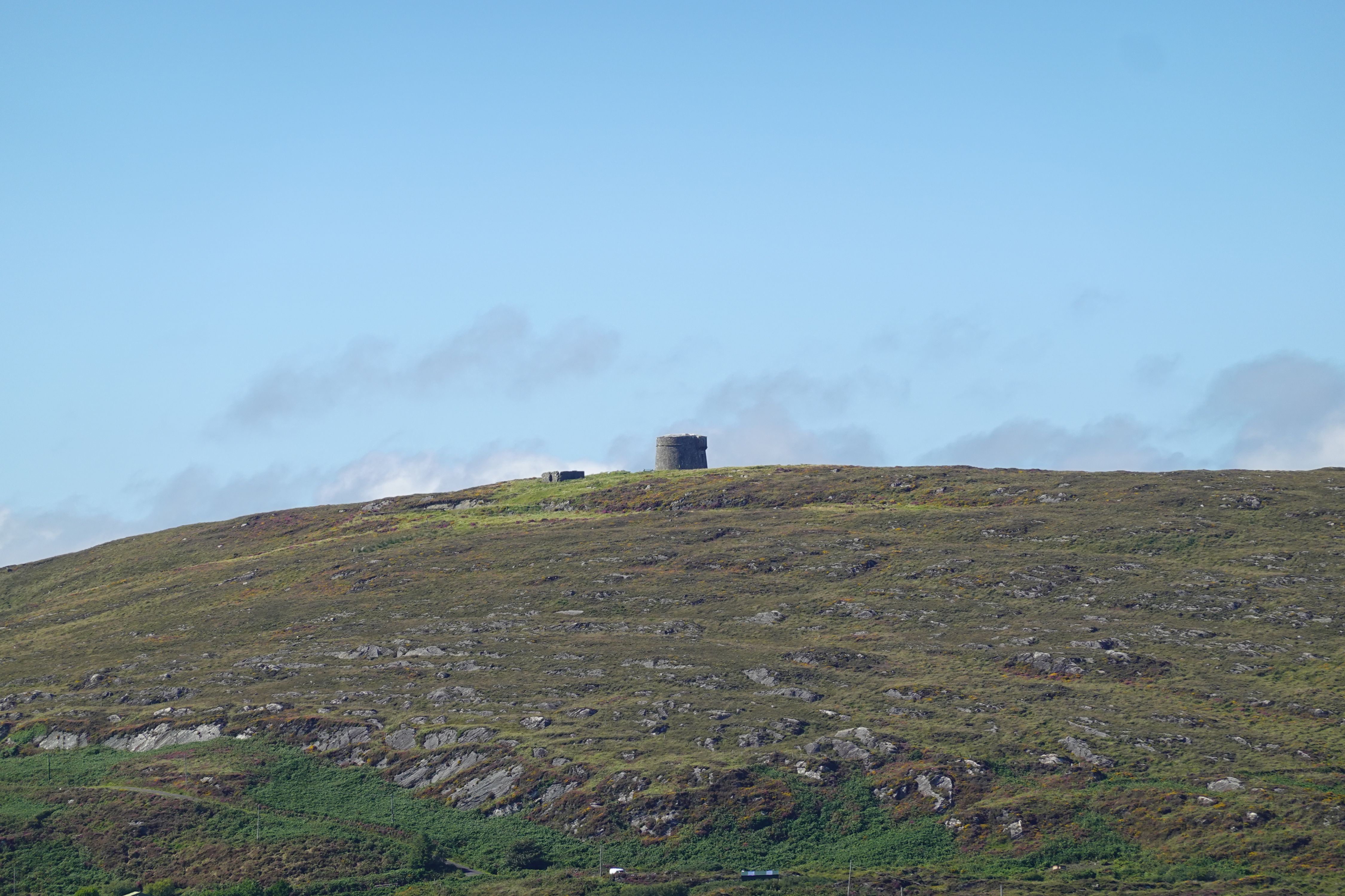 Mit den beiden Trocknern am Laufen begeben wir uns am Nachmittag auf eine kleine Wanderung zu einem der beiden Martello-Türme auf Bere Island. Martello-Türme sind wie kleine Festungen, die von den Briten als Verteidigung gegen Napoleon gebaut wurden. Mit eigener Regenwasserauffangeinrichtung konnten in einem solchen Turm die Verteidiger auch einer längeren Belagerung standhalten. Zwei der vier auf Bere Island gebauten Türme stehen noch und können besichtigt werden. Unser Turm liegt auf zweiundneunzig Metern höhe, etwa zwei Kilometer vom Hafen.