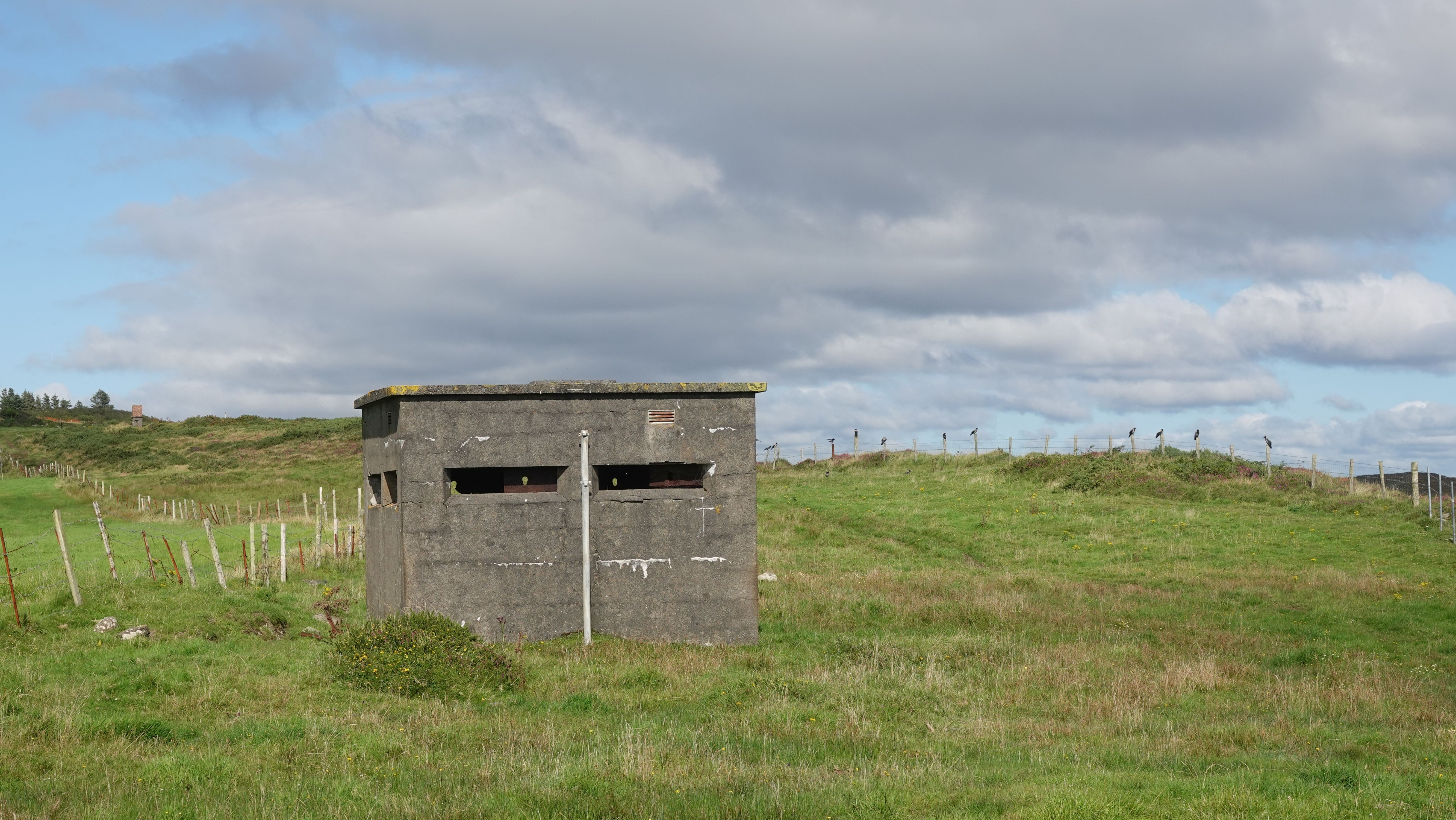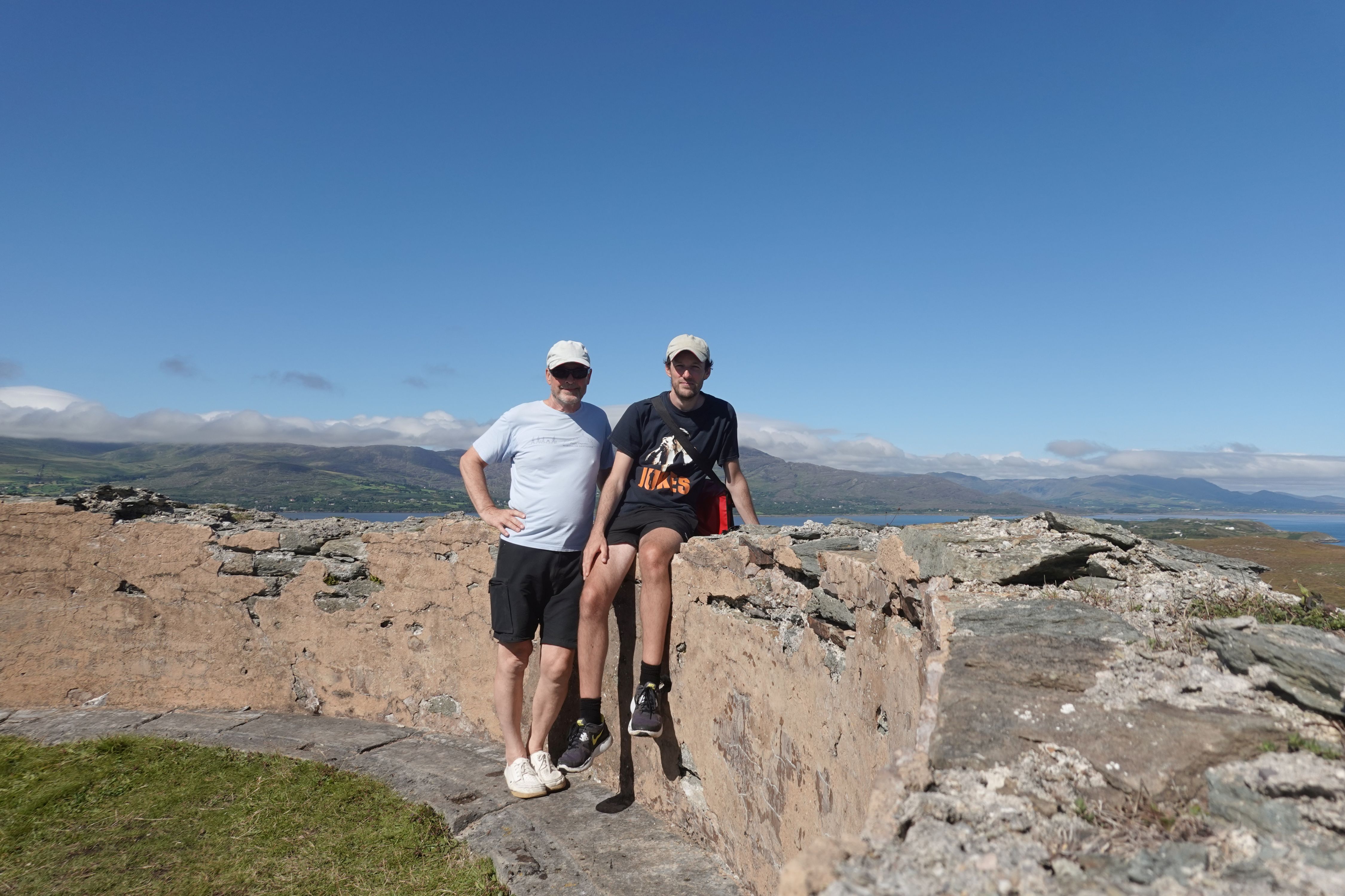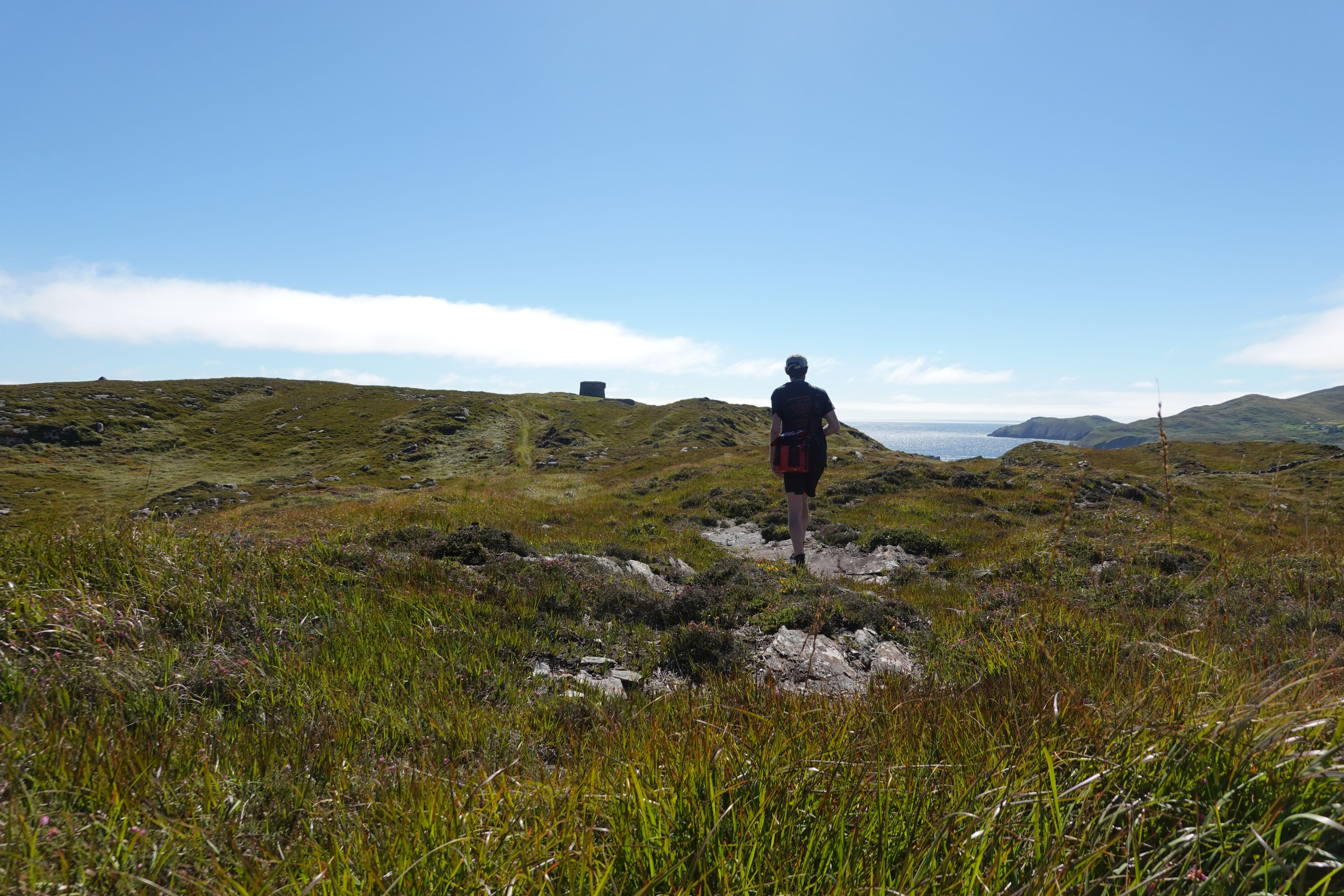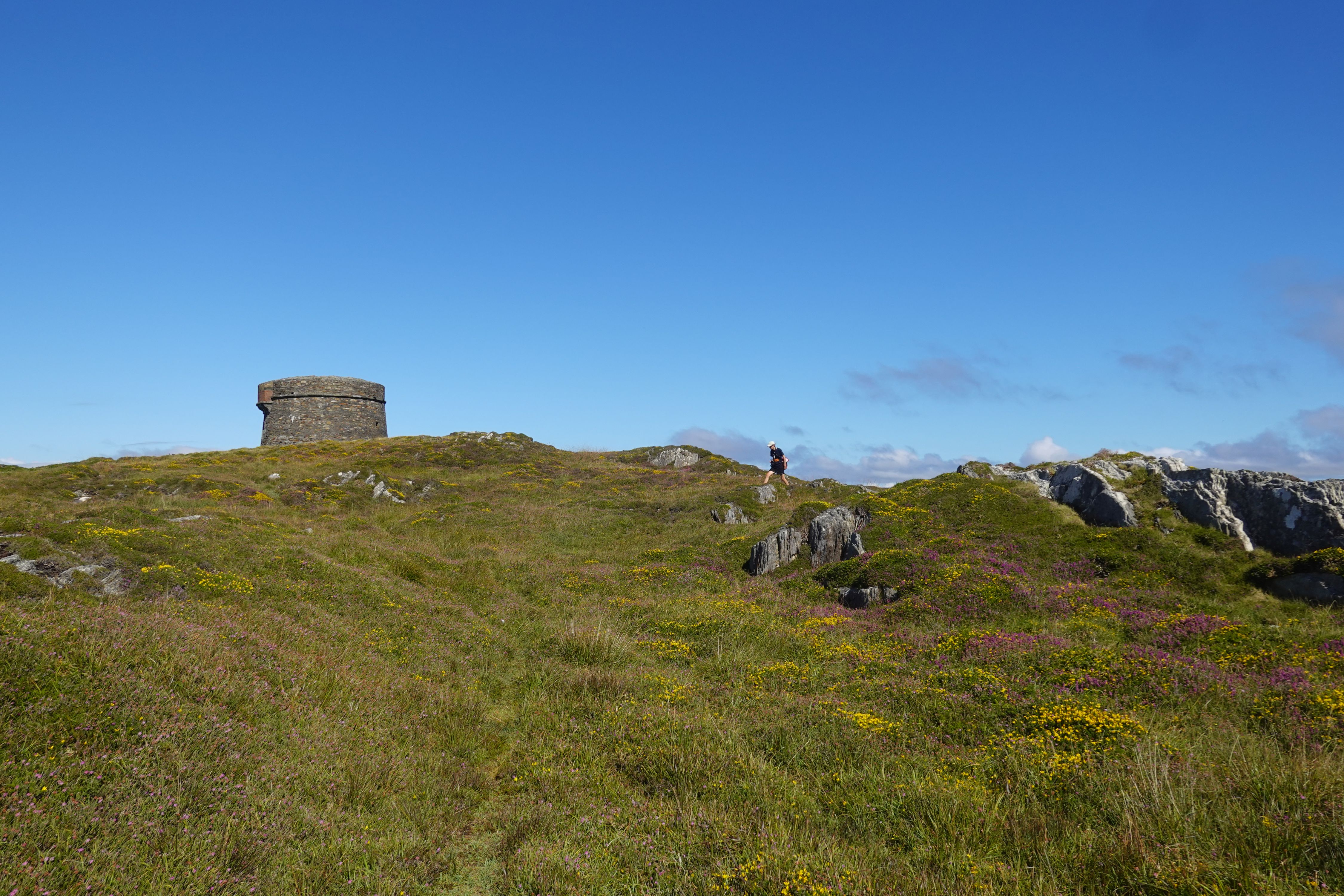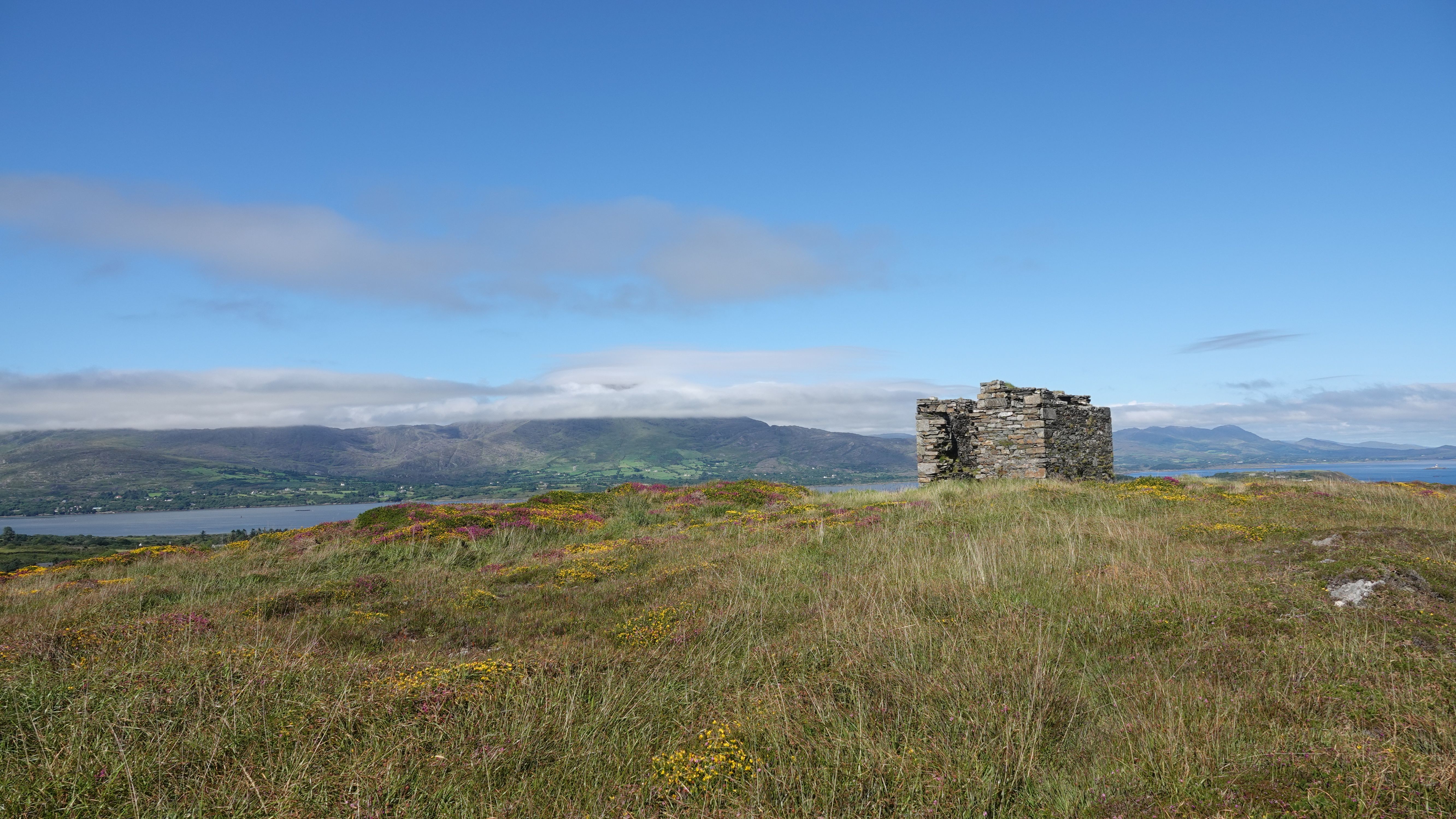 Mit den beiden Trocknern am Laufen begeben wir uns am Nachmittag auf eine kleine Wanderung zu einem der beiden Martello-Türme auf Bere Island. Martello-Türme sind wie kleine Festungen, die von den Briten als Verteidigung gegen Napoleon gebaut wurden. Mit eigener Regenwasserauffangeinrichtung konnten in einem solchen Turm die Verteidiger auch einer längeren Belagerung standhalten. Zwei der vier auf Bere Island gebauten Türme stehen noch und können besichtigt werden. Unser Turm liegt auf zweiundneunzig Metern höhe, etwa zwei Kilometer vom Hafen.