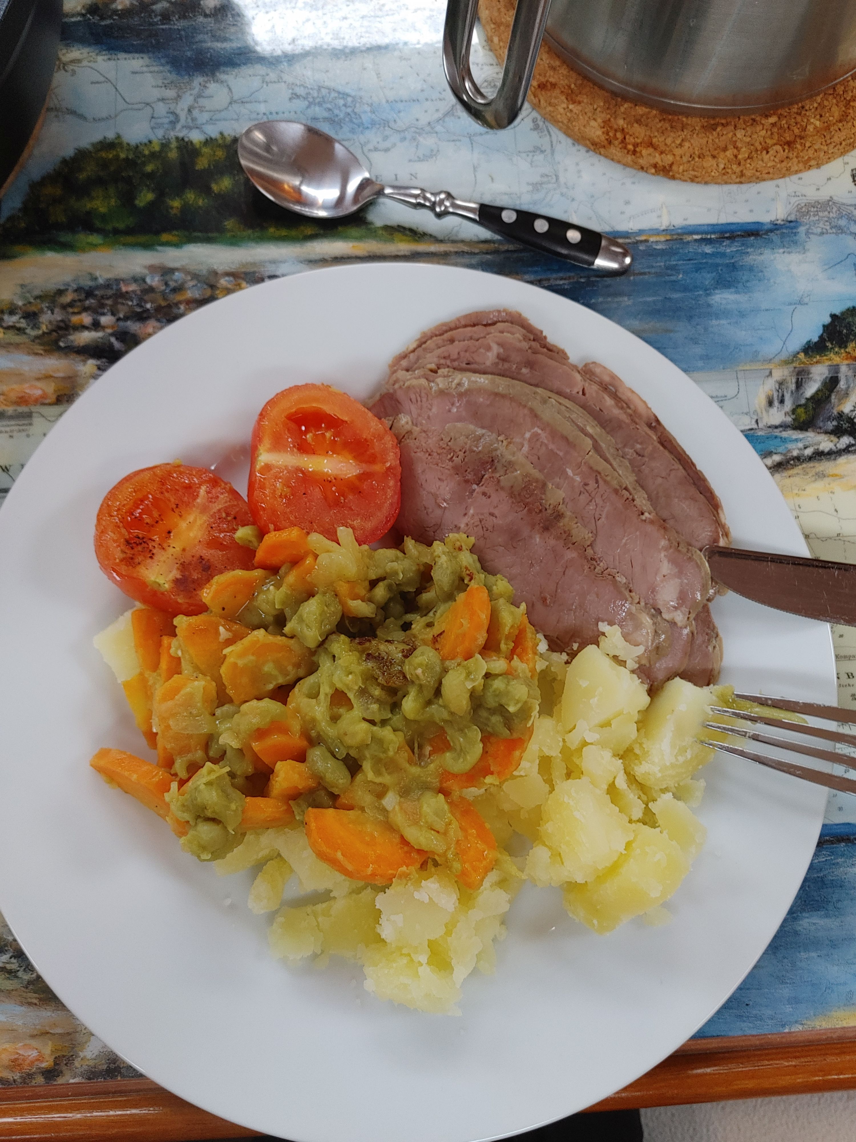 Zu Abend gibt es Roast Beef mit Kartoffeln, Wurzeln-Erbsen-Pfanne und gebratenen halben Tomaten. Als Nachtisch den Milchreis mit Brombeeren.
