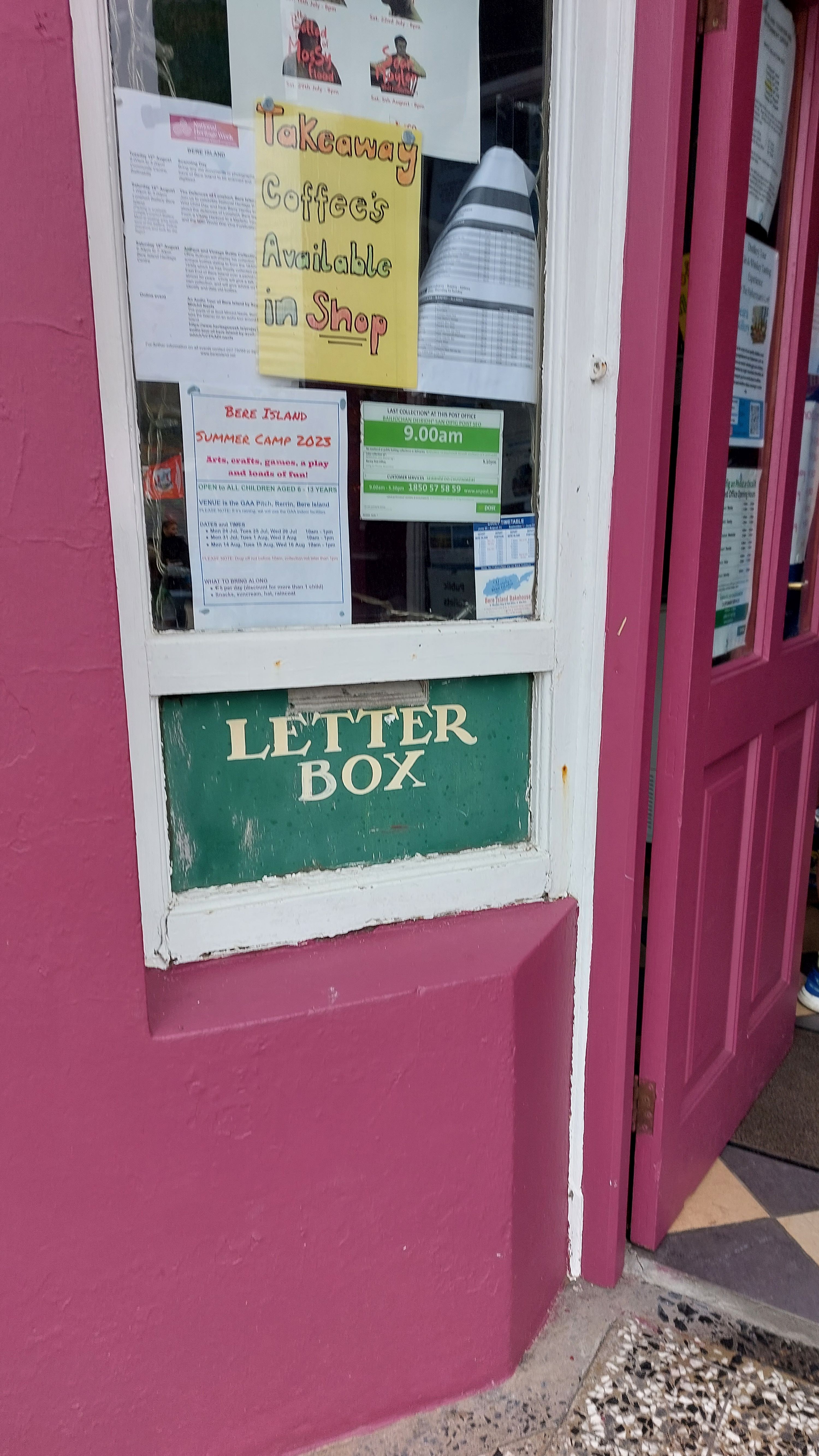 Bei Murphy's gibt es heute neben den Wurzeln auch Champignons und eine andere Sorte von Kartoffeln. Da der Shop auch Post Office ist kaufe ich hier Porto für die Postkarten, suche dann aber eine ganze Weile nach dem Briefkasten, der nur ein Schlitz im Eingang des Shops ist.