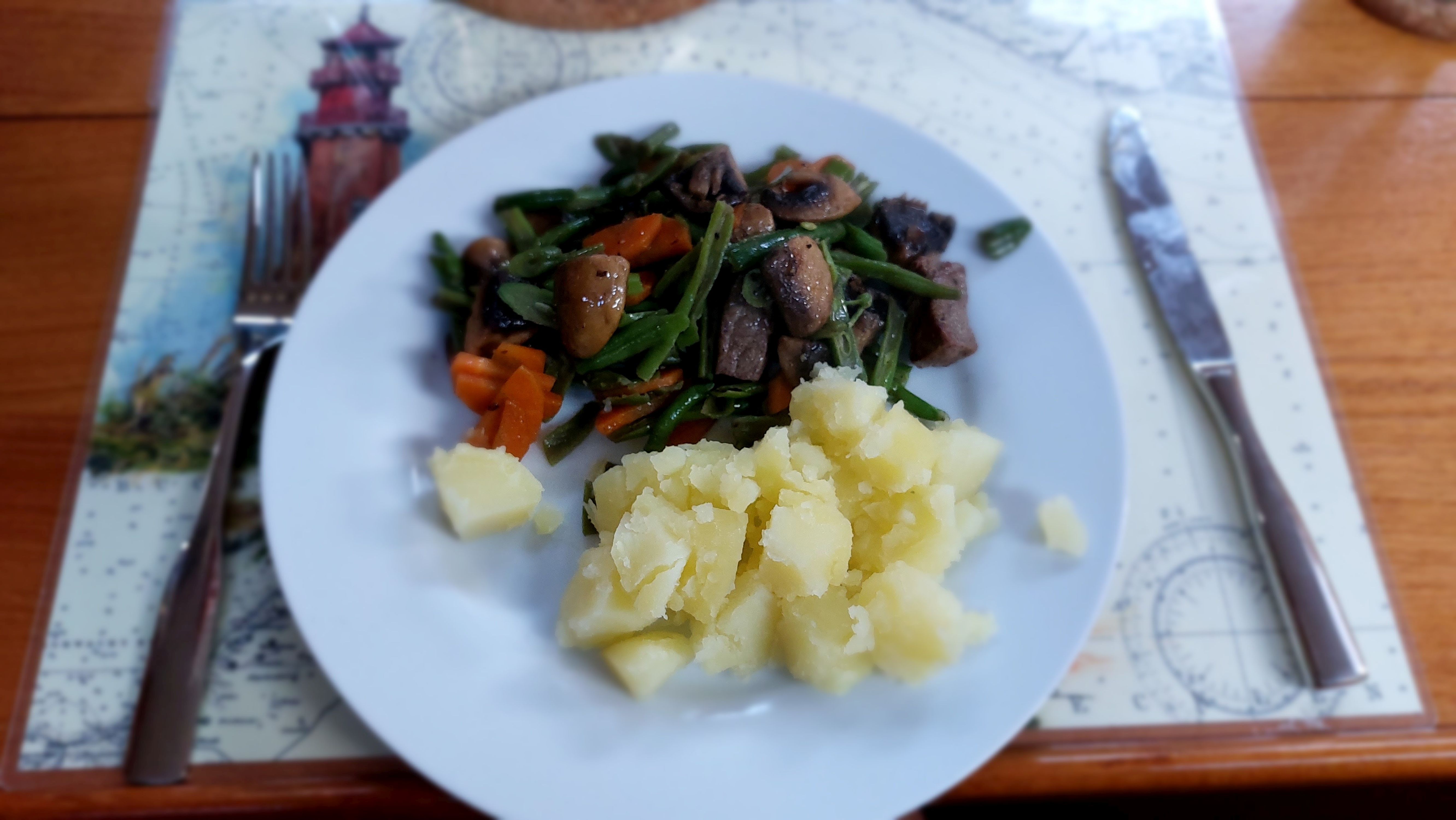 Zu Abend gibt es meist improvisiertes Essen aus dem wenigen was wir hier bekommen. Heute Kartoffeln, Dosenerbsen und Dosenmais. Dazu Spiegeleier. Die Erbsen werden in der Pfanne zu einem Brei, schmecken aber köstlich.