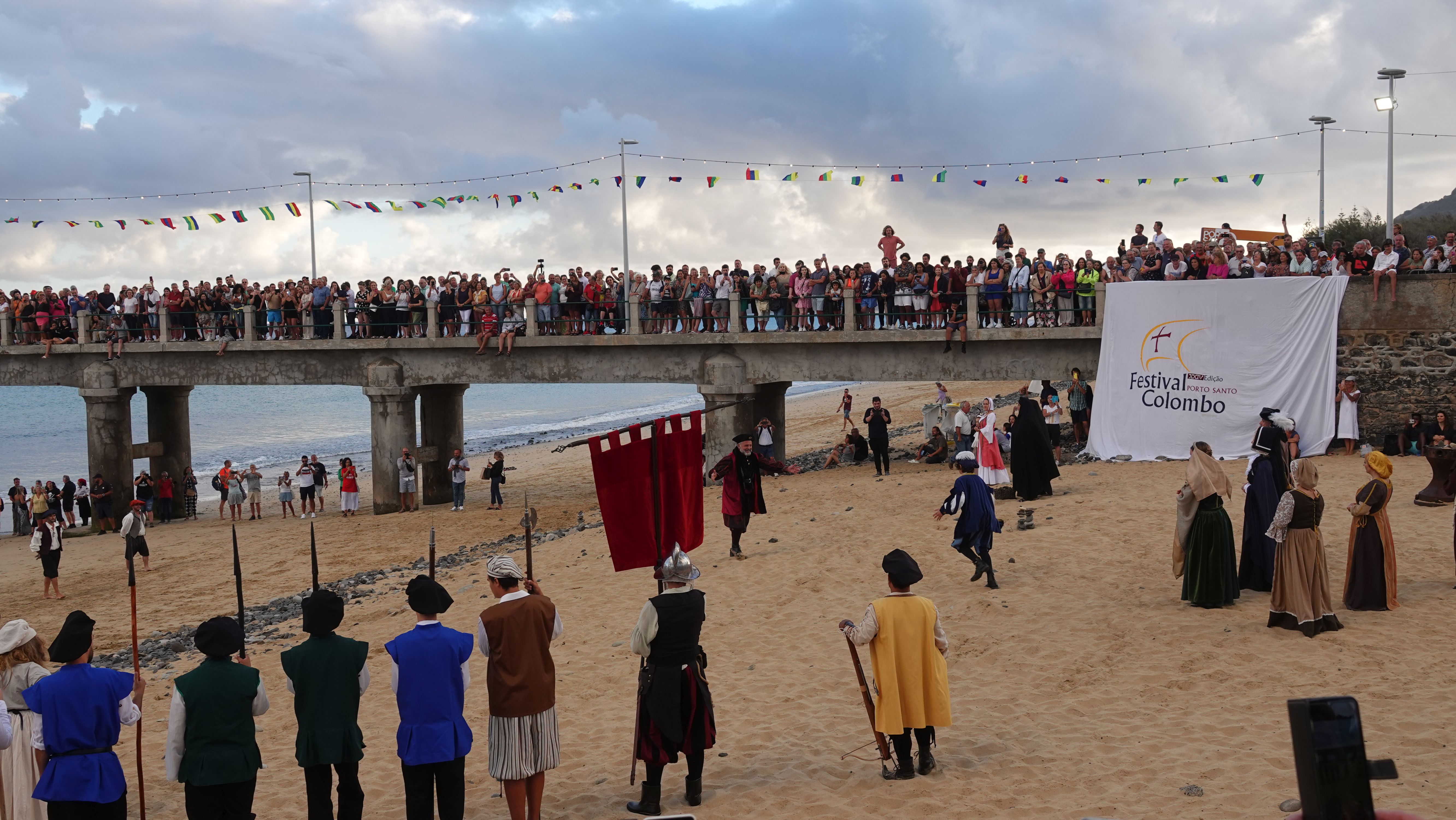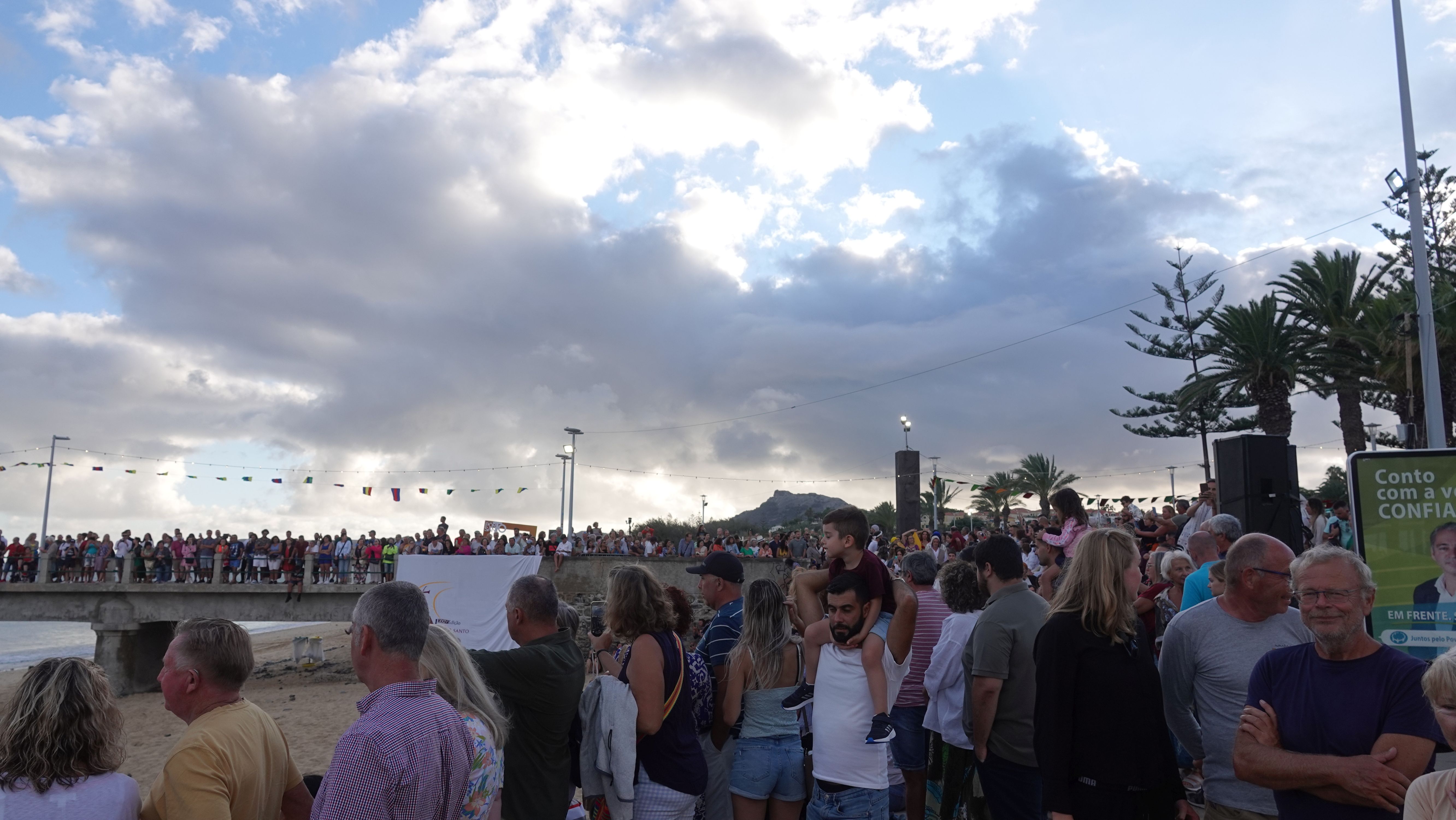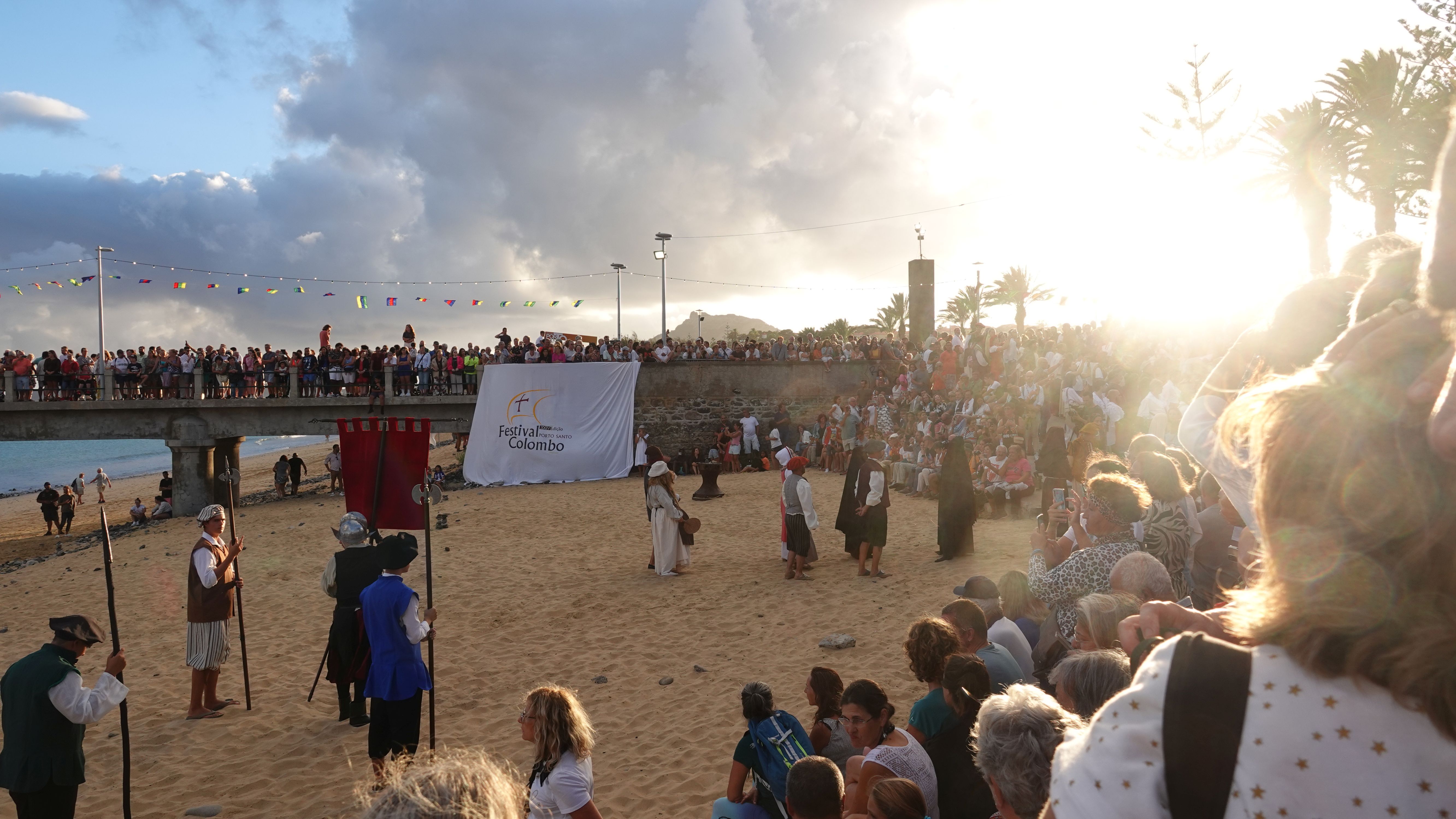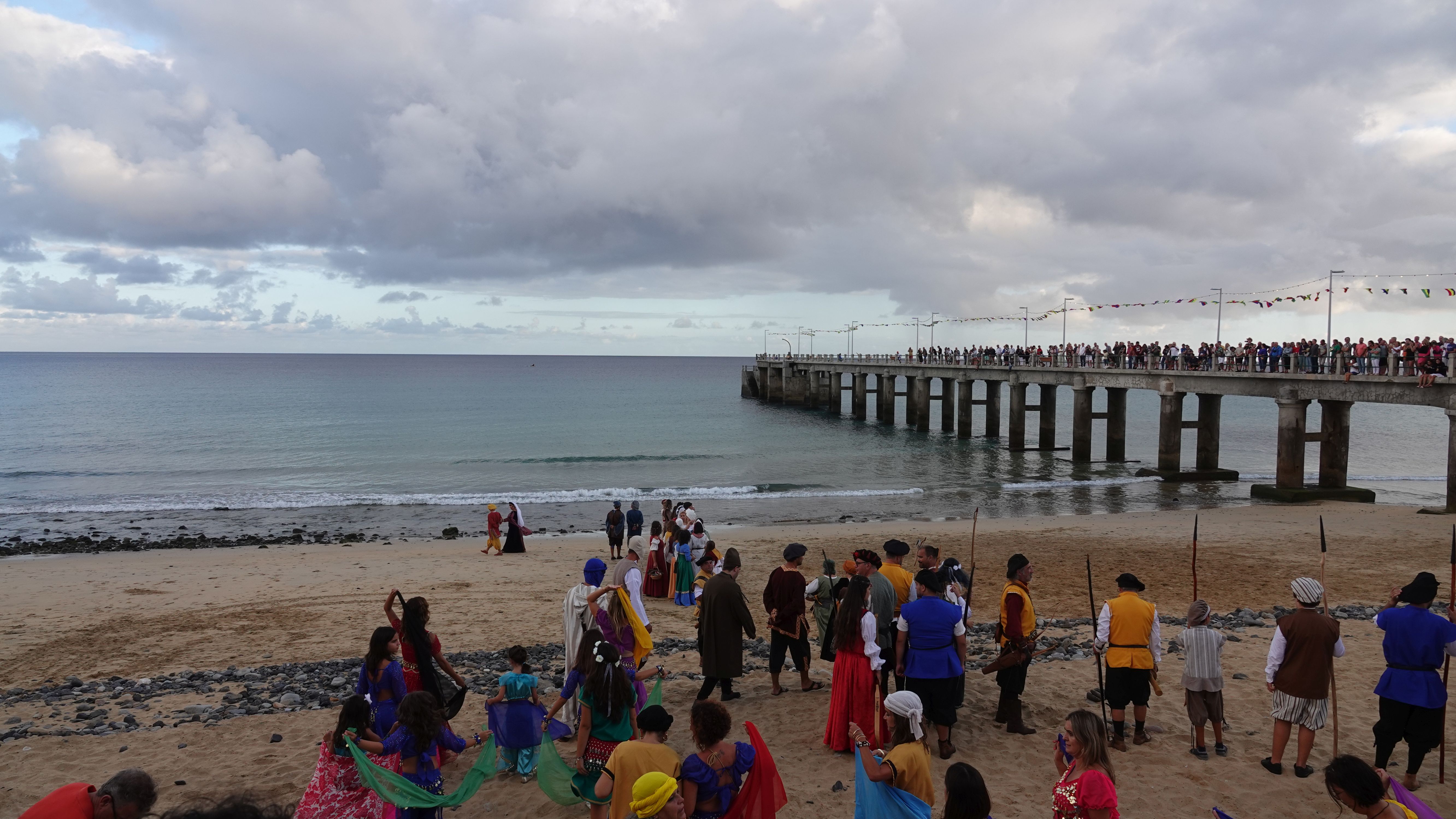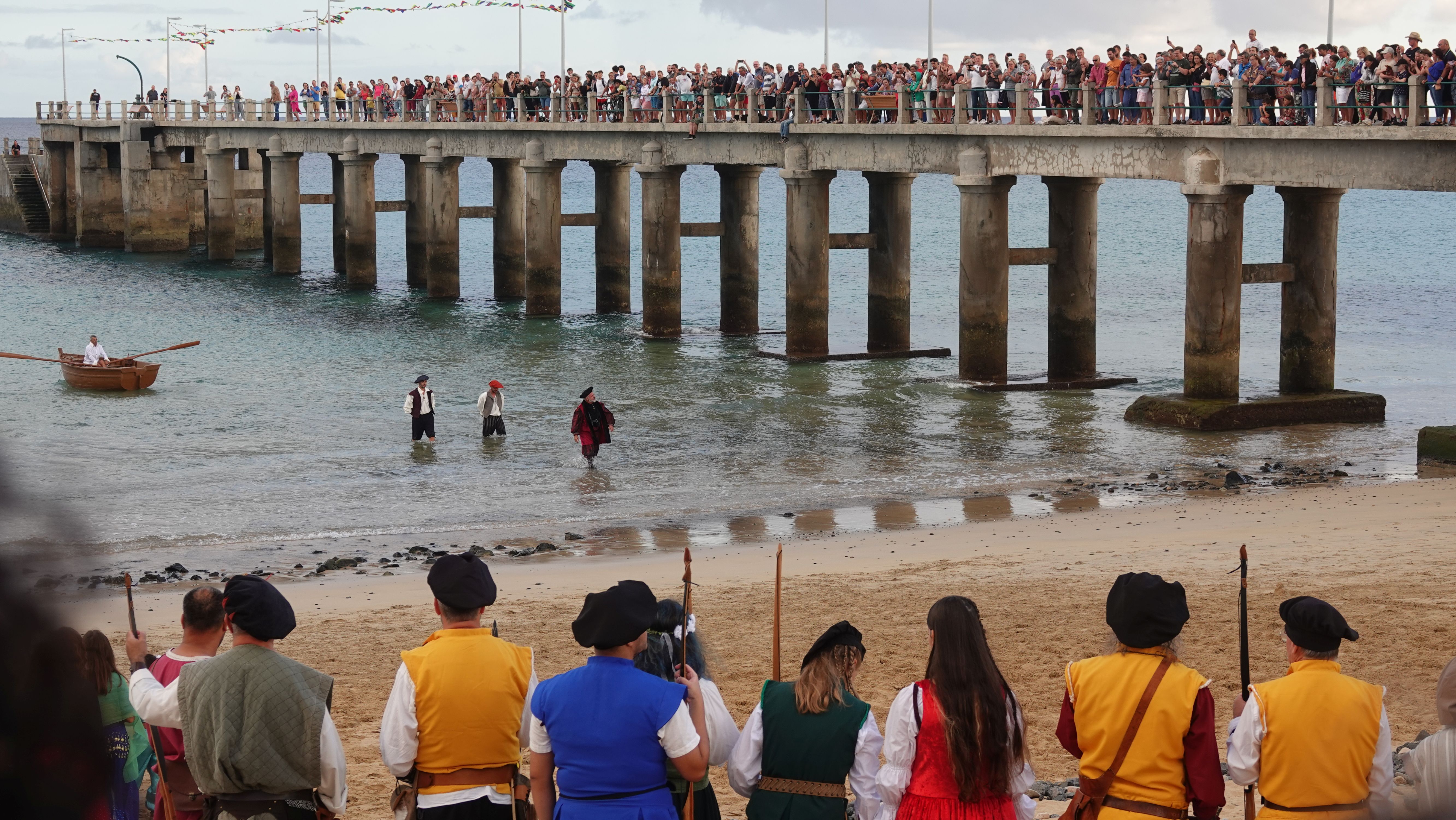 Am Abend findet sich eine recht große, internationale Gruppe am Café ein. Ein bunter Mix der Nationen, lediglich die Franzosen fehlen. Vielleicht wegen der Sprachbarriere. Englisch scheinen die wenigsten Franzosen zu sprechen und wenn, dann nur mit sehr geringen Kenntnissen. Nach einem Schauer machen wir uns im Nieselregen auf den Weg nach Vila Baleira um Kolumbus am Strand in Empfang zu nehmen. Bis wir ankommen ist es auch wieder trocken und freundlich. Die Seebrücke und die Promenade sind dicht gepackt mit Menschenmassen. Auf dem Strand wartet bereits eine große Gruppe traditionell gekleideter Dörfler, Soldaten und die Familie von Kolumbus.