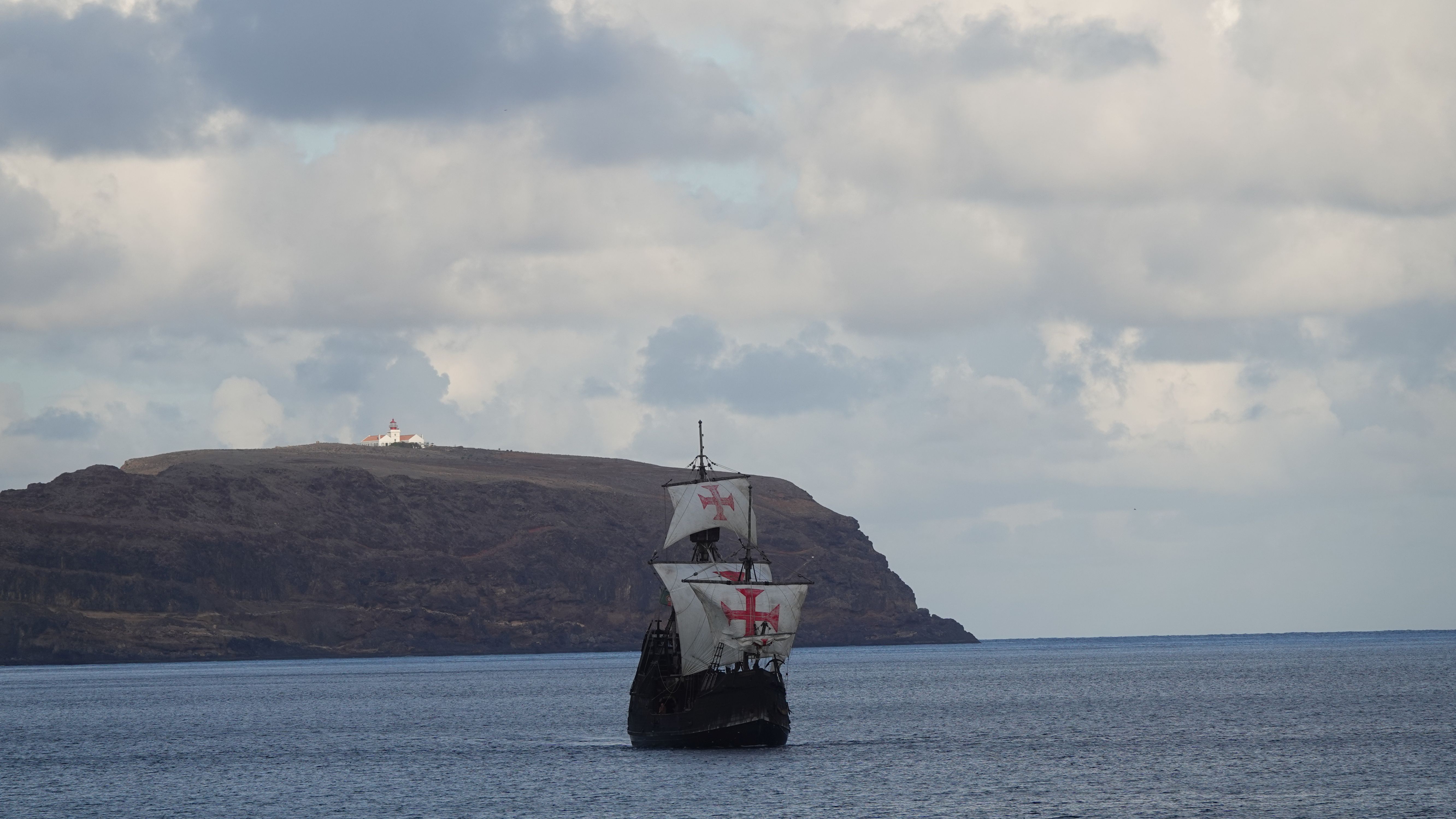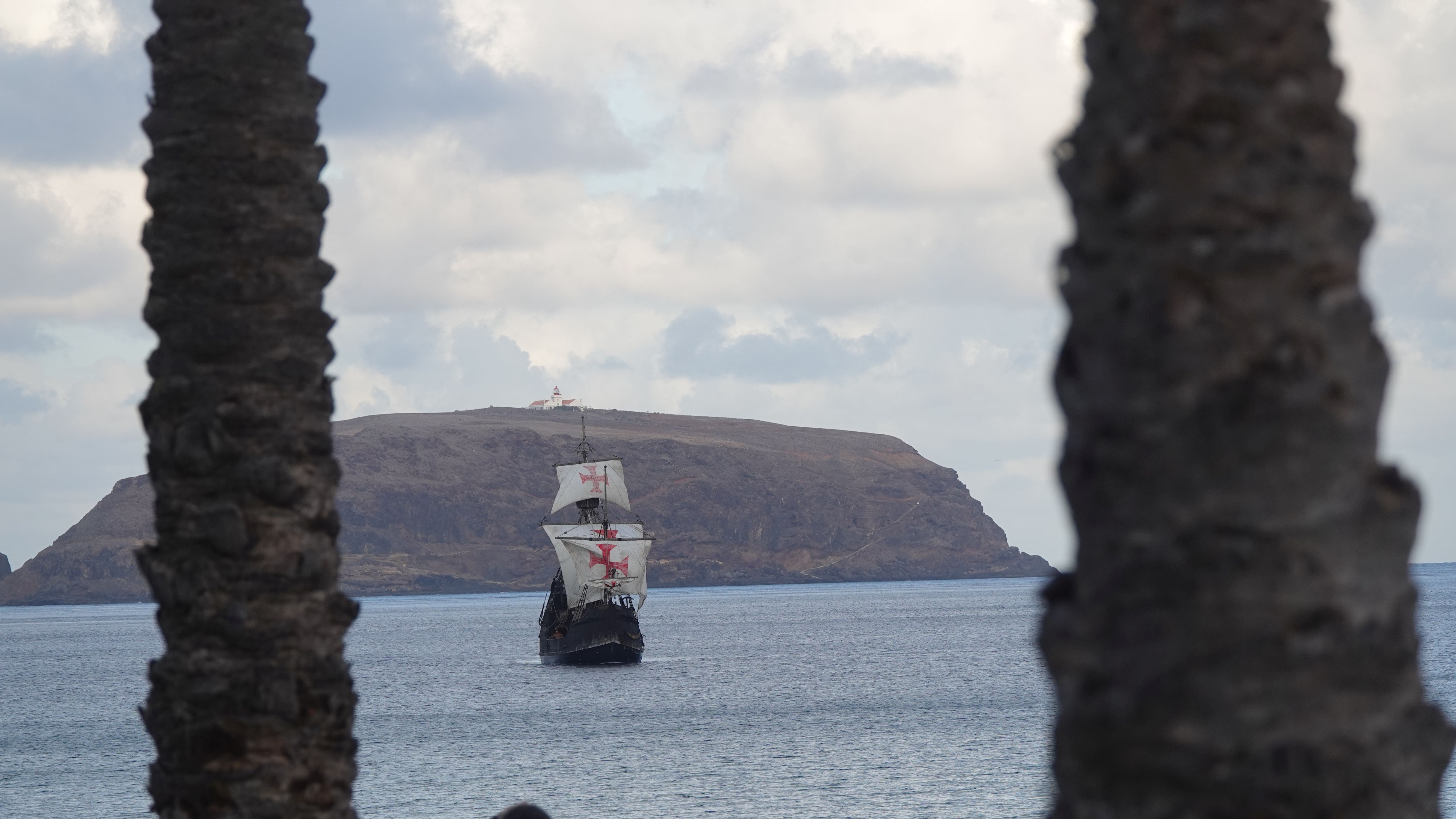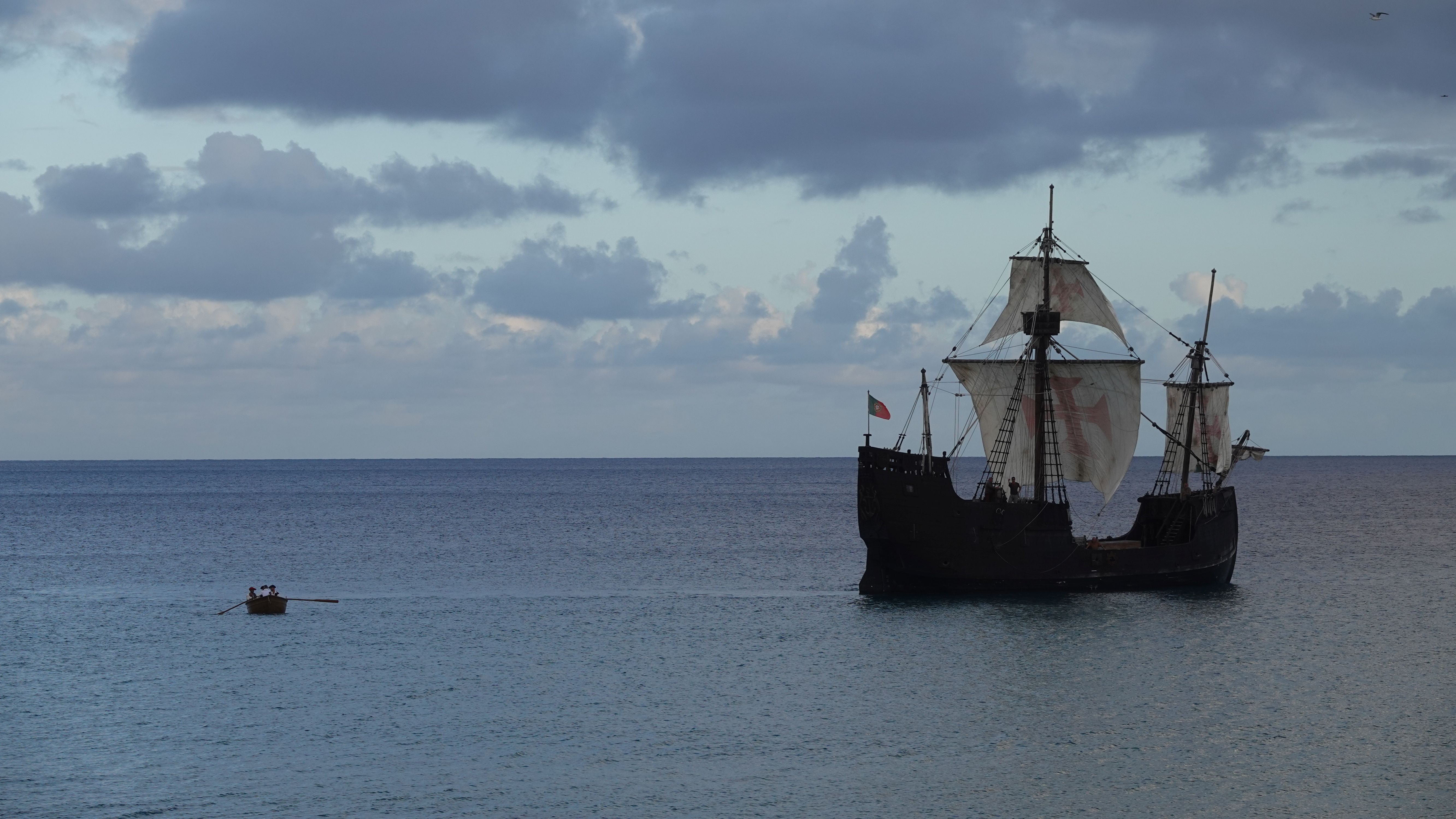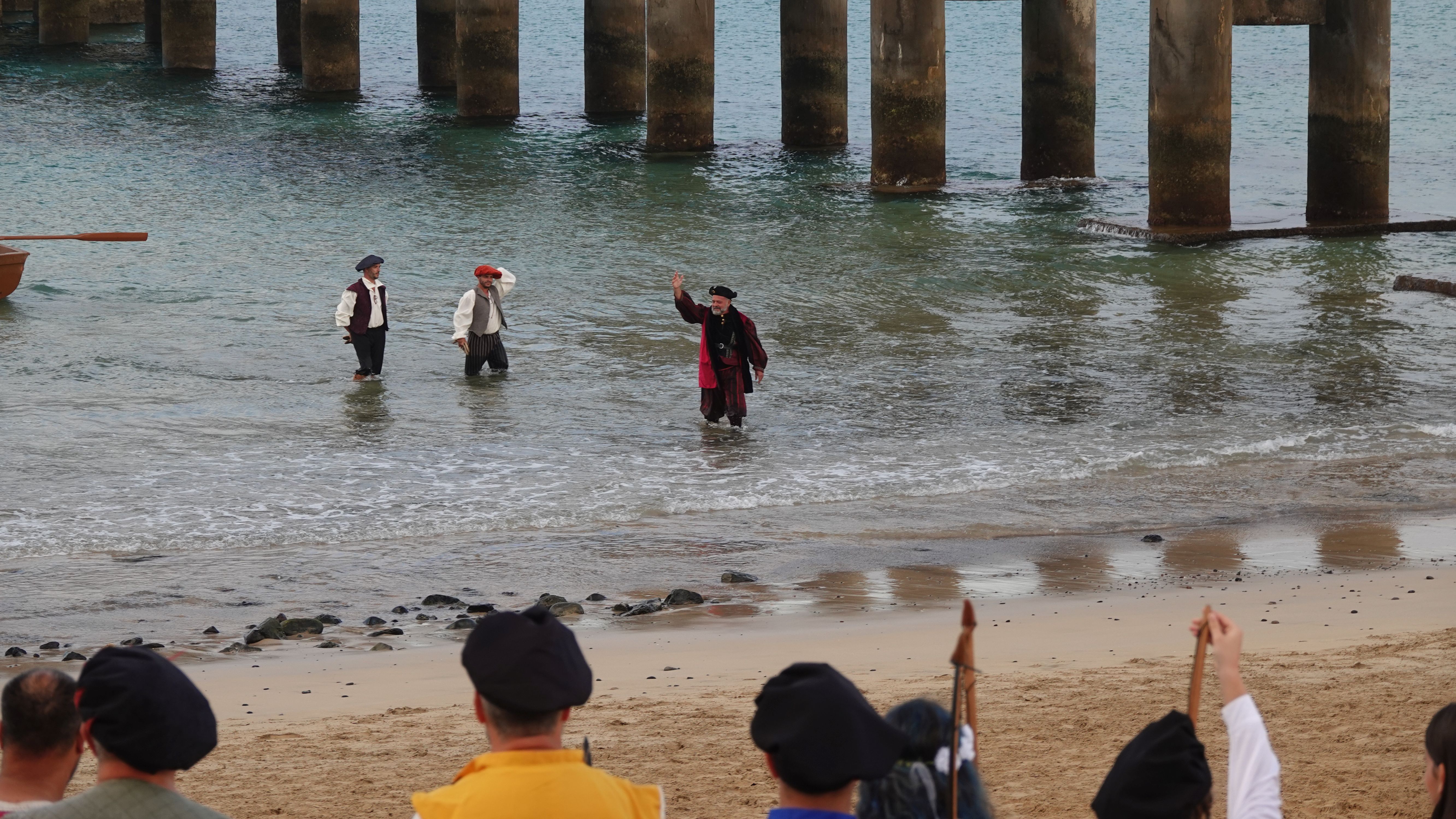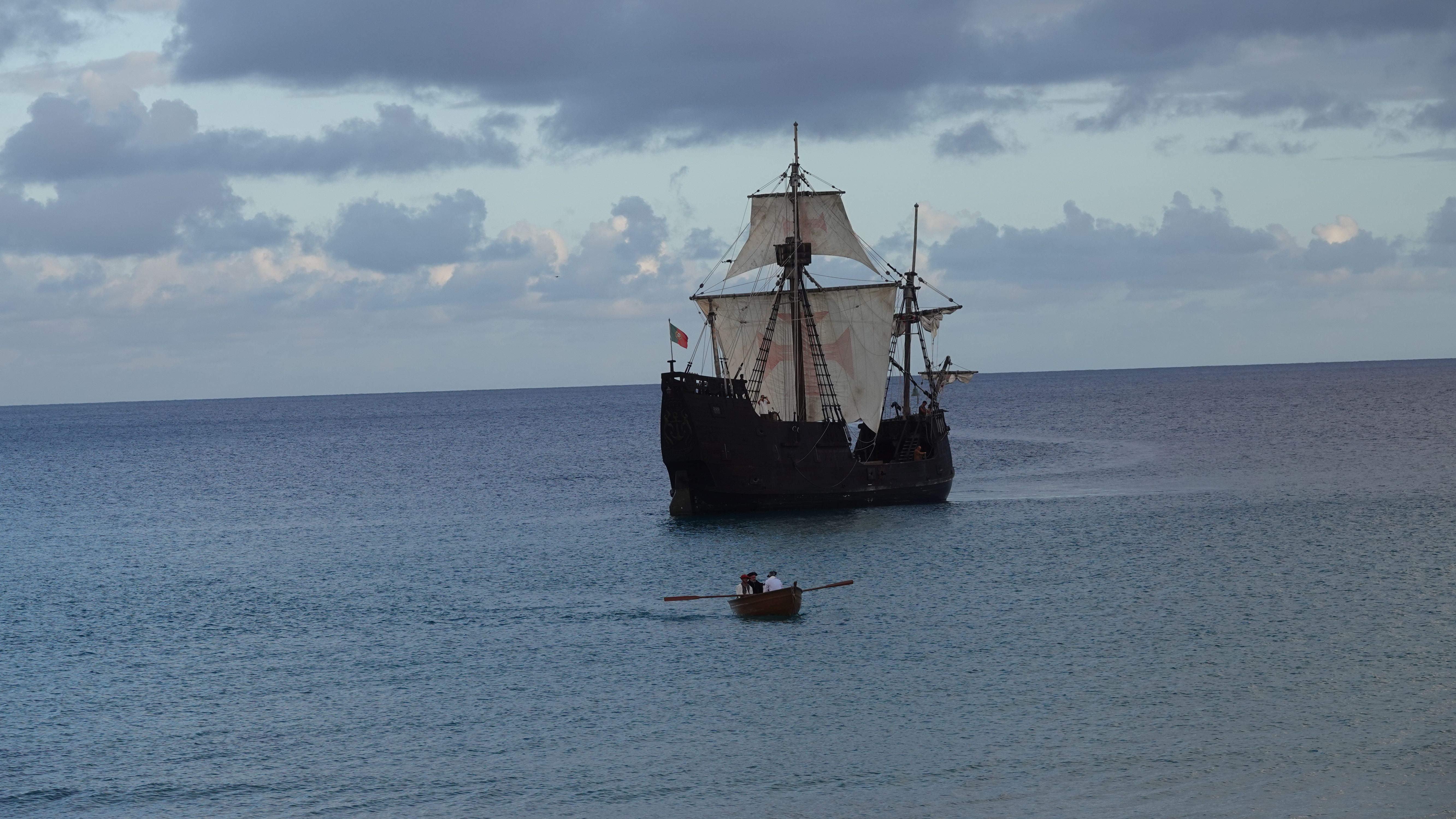 Am Abend findet sich eine recht große, internationale Gruppe am Café ein. Ein bunter Mix der Nationen, lediglich die Franzosen fehlen. Vielleicht wegen der Sprachbarriere. Englisch scheinen die wenigsten Franzosen zu sprechen und wenn, dann nur mit sehr geringen Kenntnissen. Nach einem Schauer machen wir uns im Nieselregen auf den Weg nach Vila Baleira um Kolumbus am Strand in Empfang zu nehmen. Bis wir ankommen ist es auch wieder trocken und freundlich. Die Seebrücke und die Promenade sind dicht gepackt mit Menschenmassen. Auf dem Strand wartet bereits eine große Gruppe traditionell gekleideter Dörfler, Soldaten und die Familie von Kolumbus.