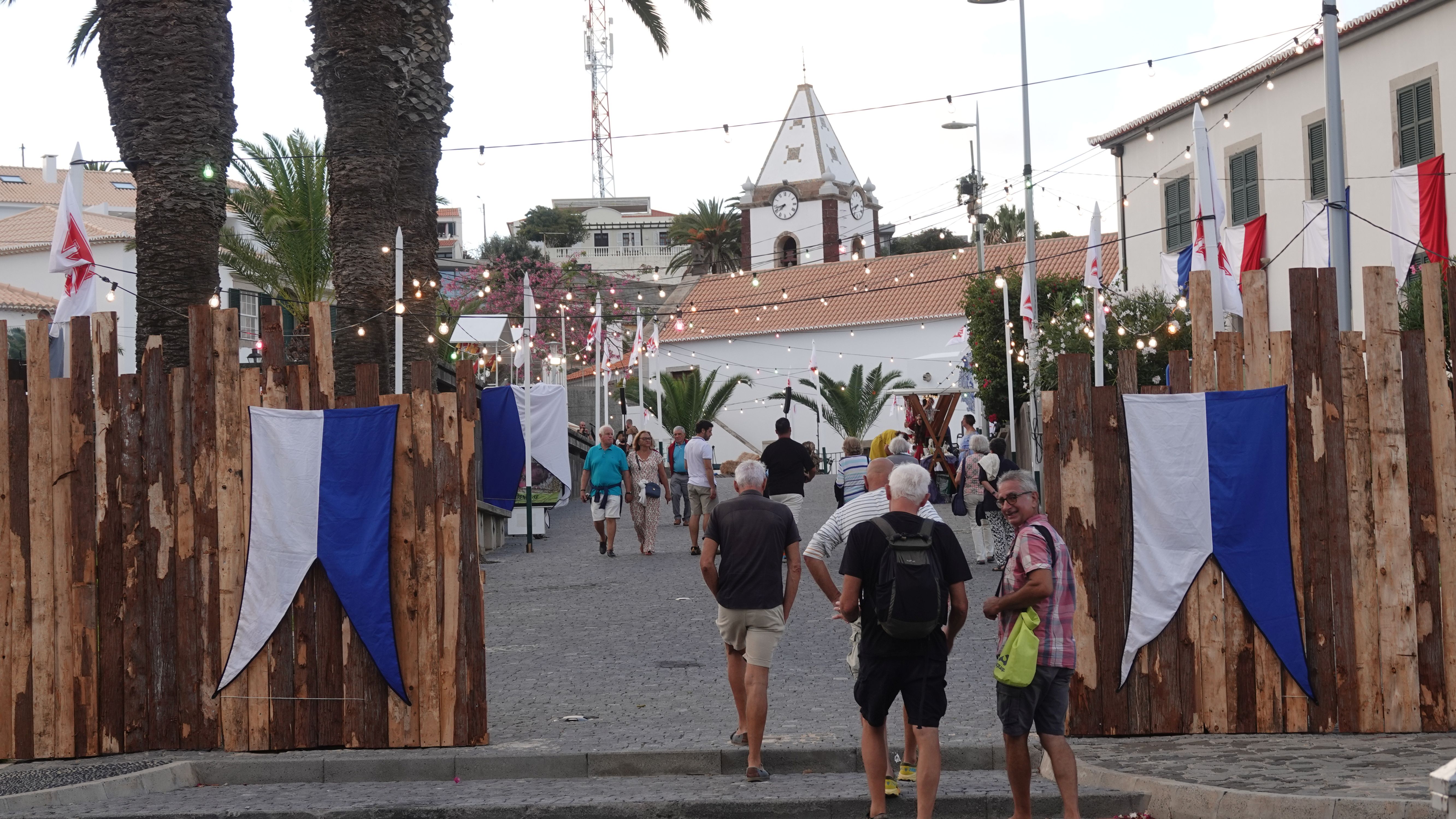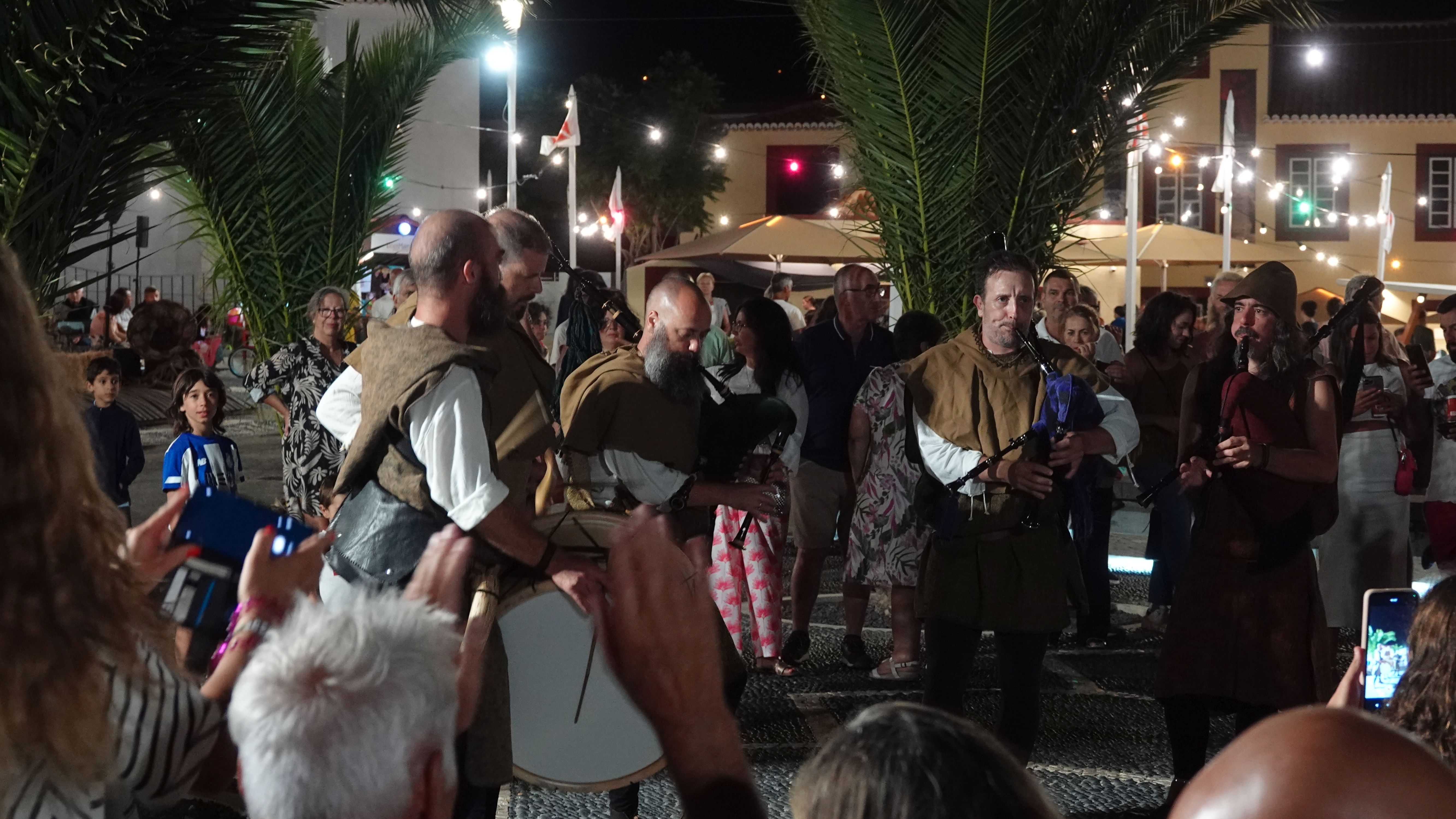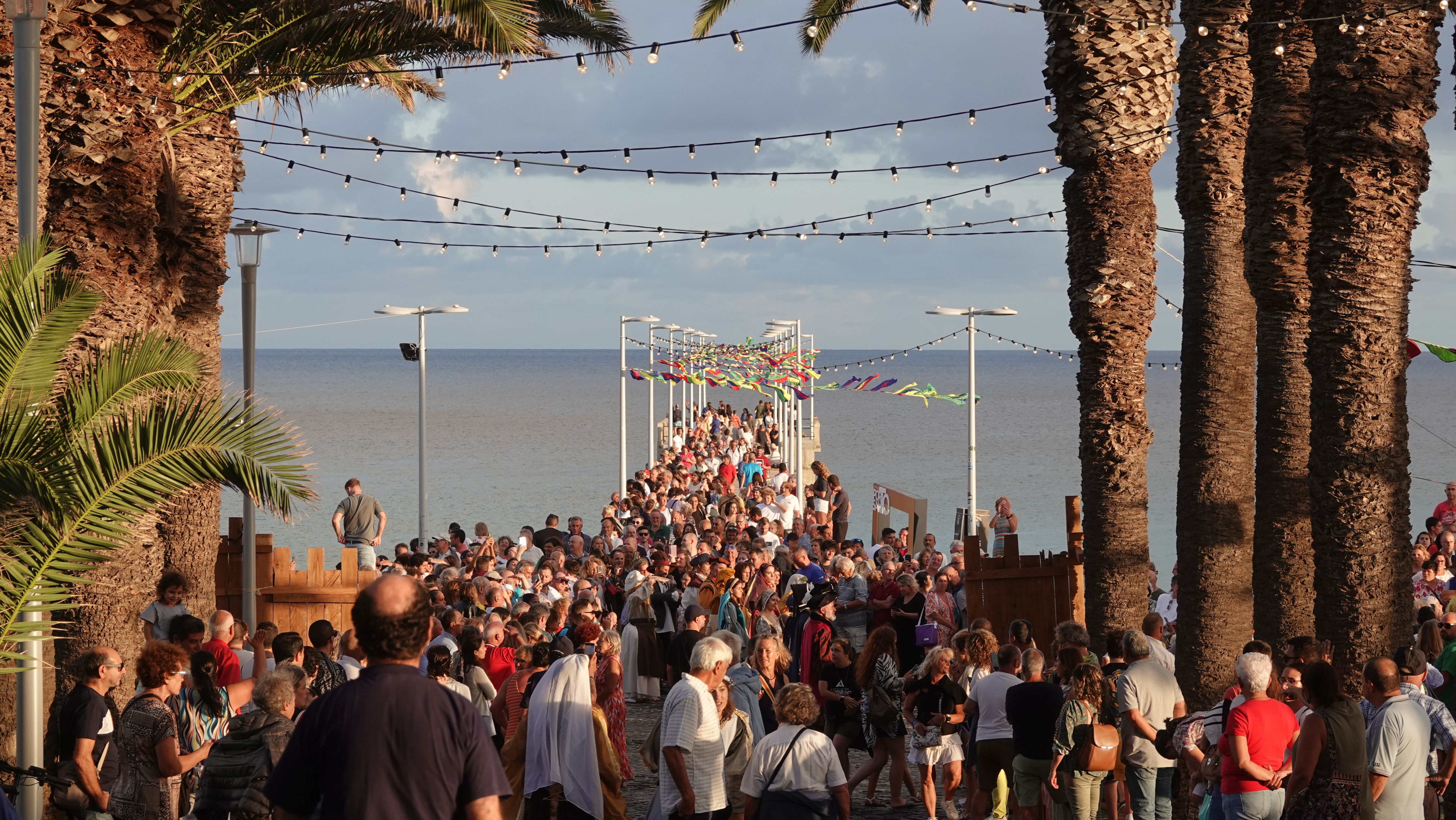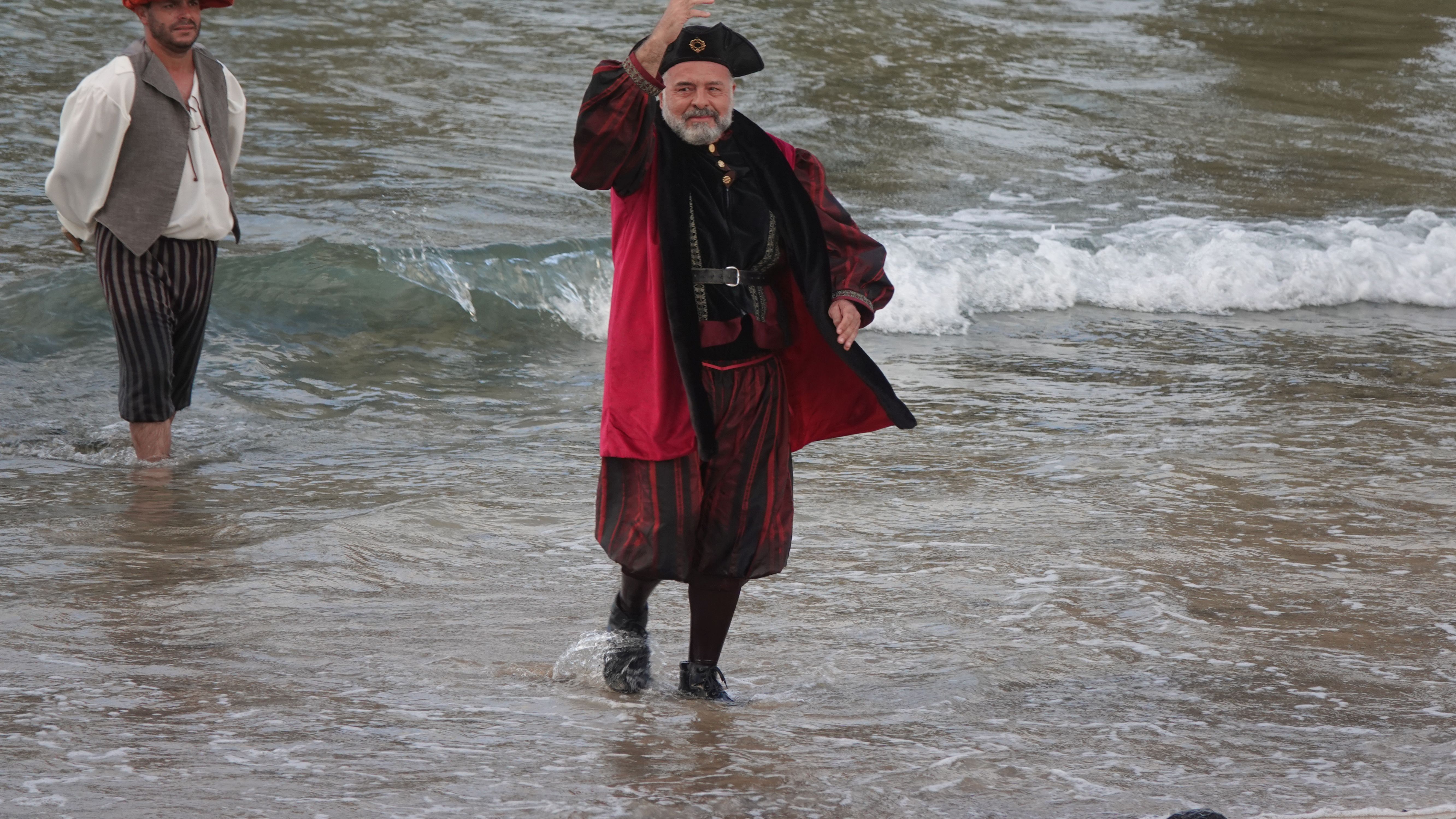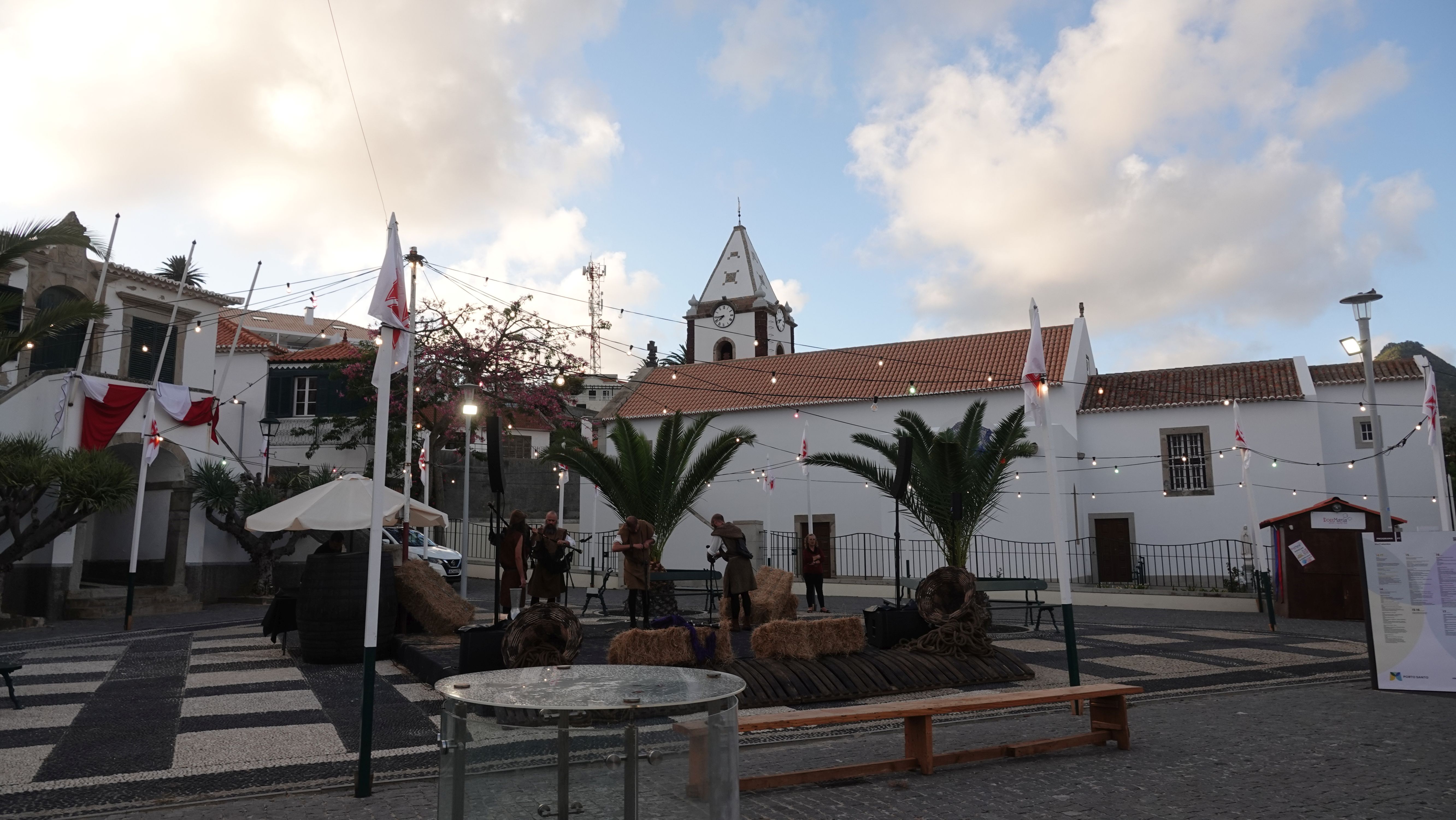 Am Abend findet sich eine recht große, internationale Gruppe am Café ein. Ein bunter Mix der Nationen, lediglich die Franzosen fehlen. Vielleicht wegen der Sprachbarriere. Englisch scheinen die wenigsten Franzosen zu sprechen und wenn, dann nur mit sehr geringen Kenntnissen. Nach einem Schauer machen wir uns im Nieselregen auf den Weg nach Vila Baleira um Kolumbus am Strand in Empfang zu nehmen. Bis wir ankommen ist es auch wieder trocken und freundlich. Die Seebrücke und die Promenade sind dicht gepackt mit Menschenmassen. Auf dem Strand wartet bereits eine große Gruppe traditionell gekleideter Dörfler, Soldaten und die Familie von Kolumbus.