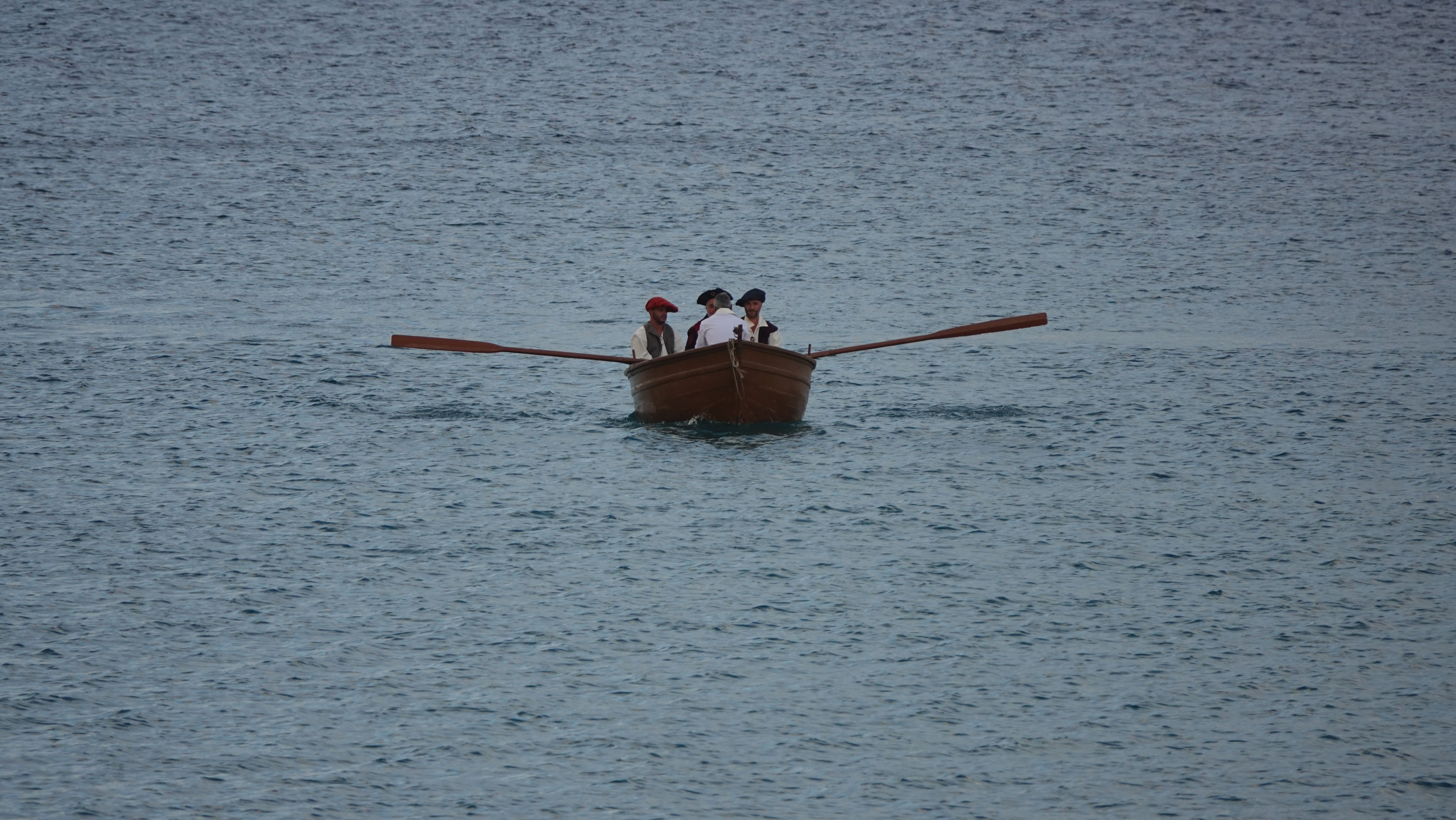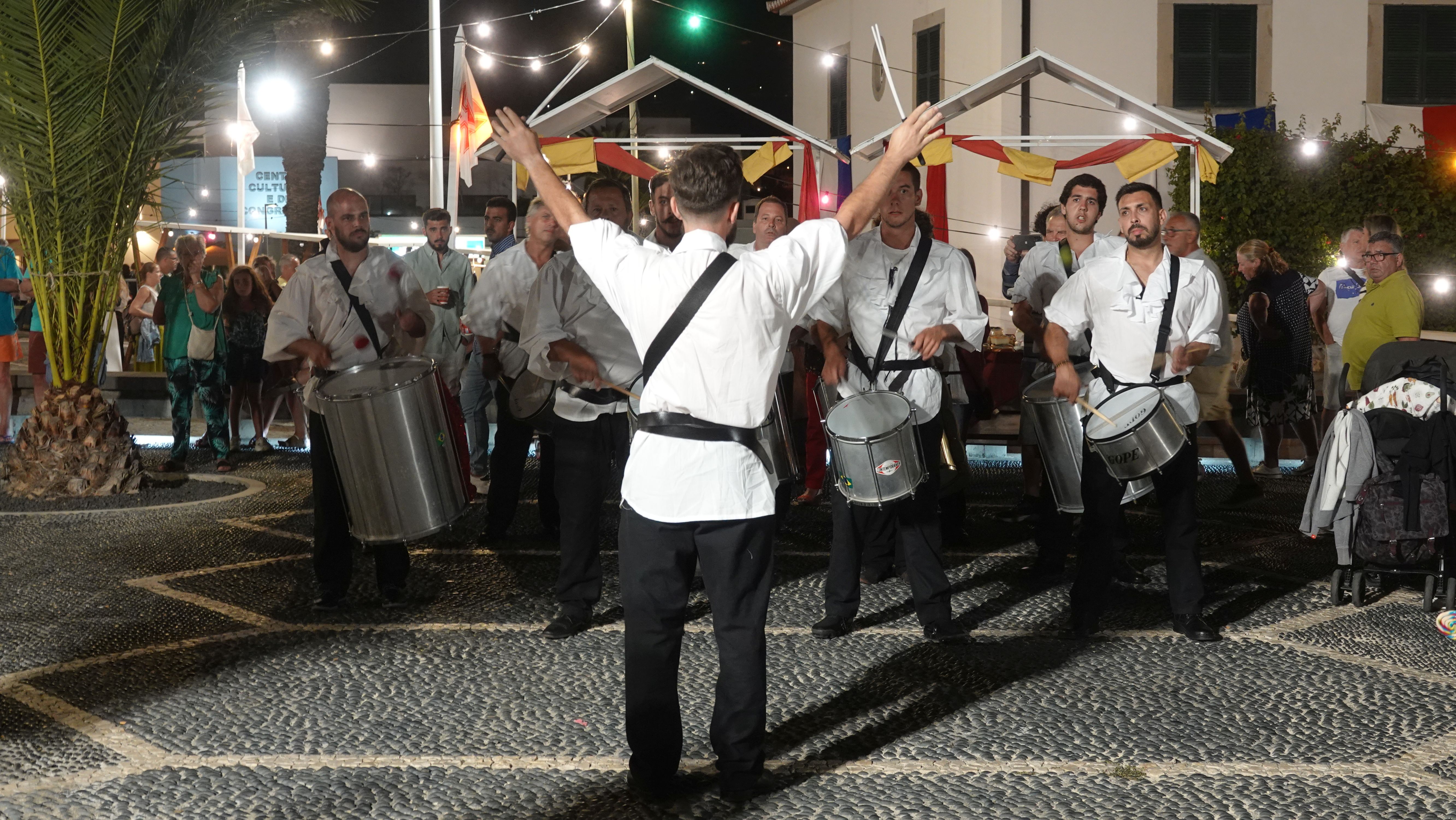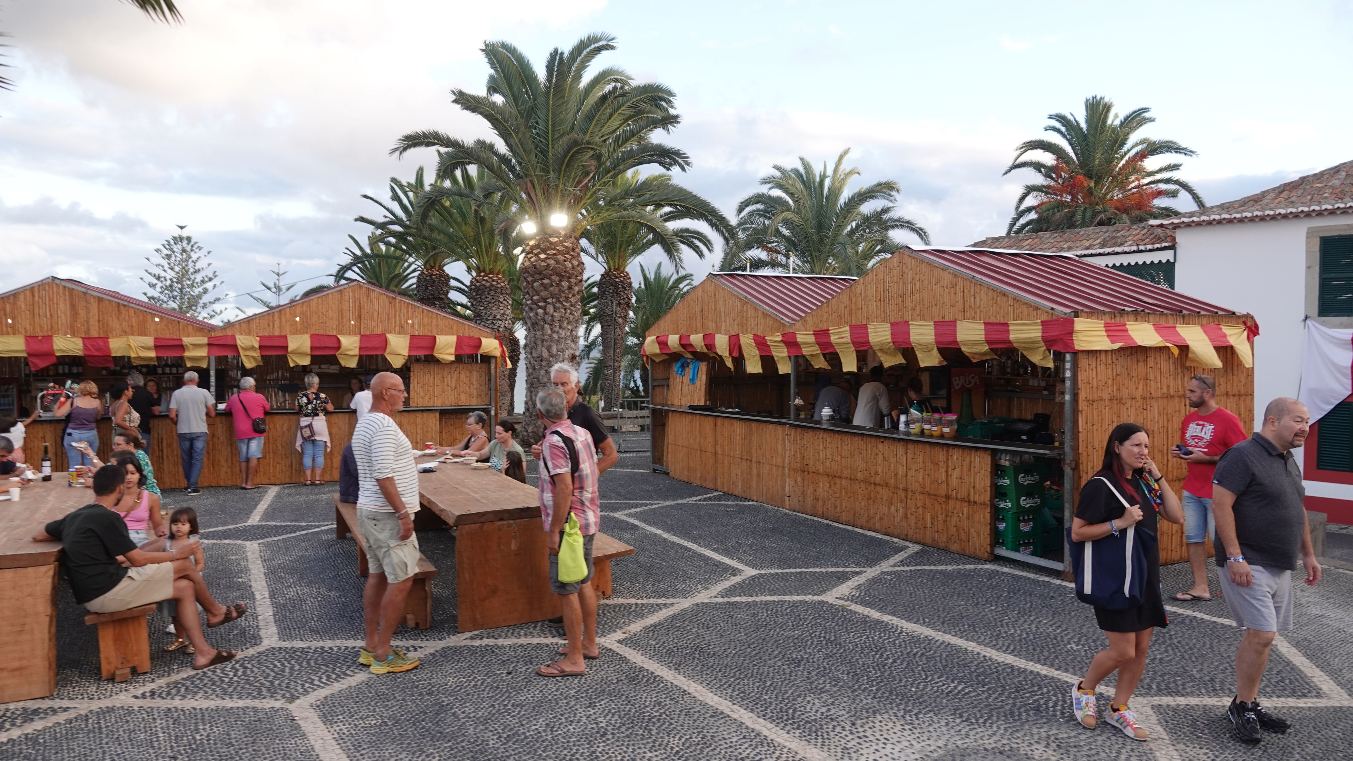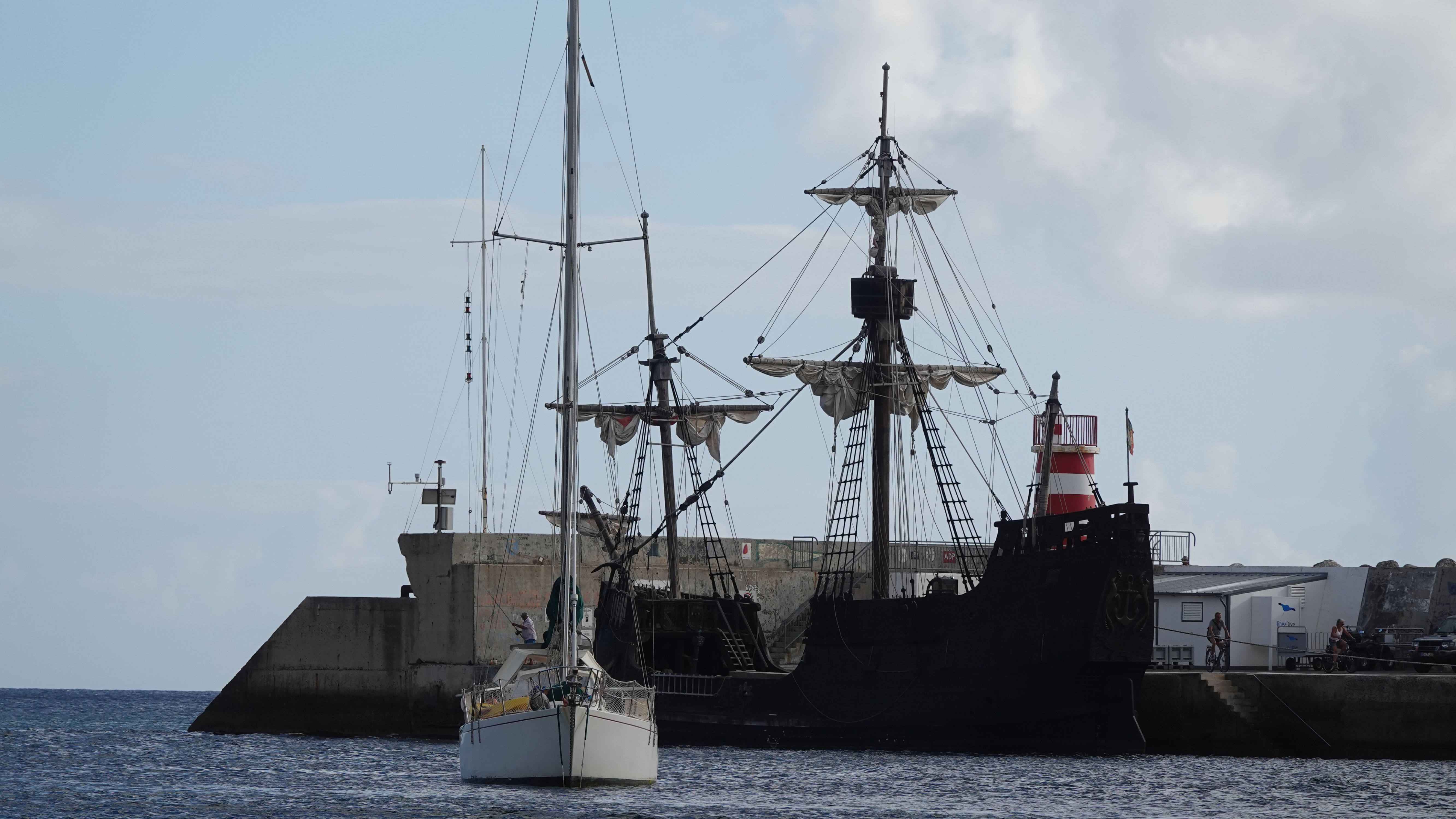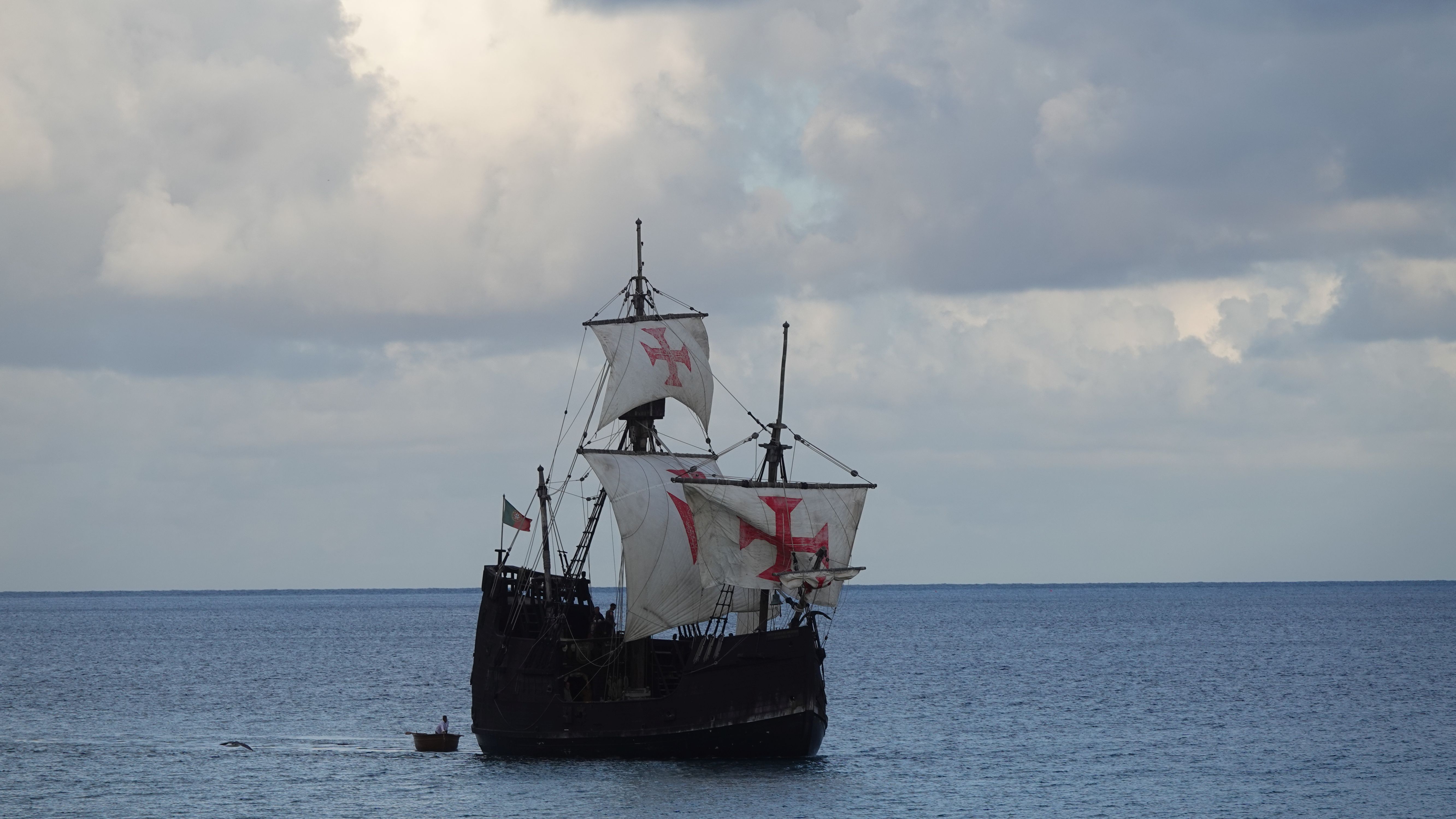 Am Abend findet sich eine recht große, internationale Gruppe am Café ein. Ein bunter Mix der Nationen, lediglich die Franzosen fehlen. Vielleicht wegen der Sprachbarriere. Englisch scheinen die wenigsten Franzosen zu sprechen und wenn, dann nur mit sehr geringen Kenntnissen. Nach einem Schauer machen wir uns im Nieselregen auf den Weg nach Vila Baleira um Kolumbus am Strand in Empfang zu nehmen. Bis wir ankommen ist es auch wieder trocken und freundlich. Die Seebrücke und die Promenade sind dicht gepackt mit Menschenmassen. Auf dem Strand wartet bereits eine große Gruppe traditionell gekleideter Dörfler, Soldaten und die Familie von Kolumbus.