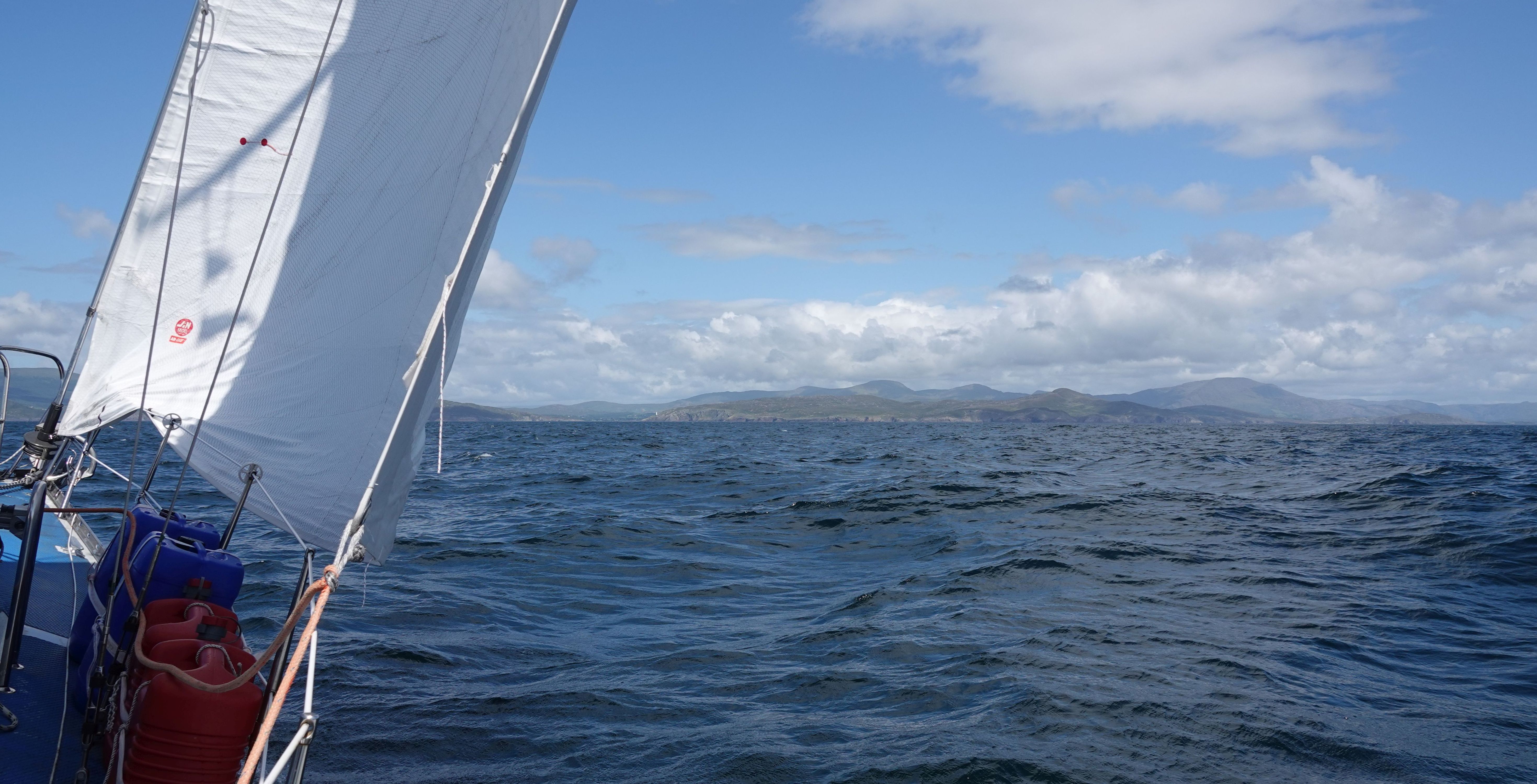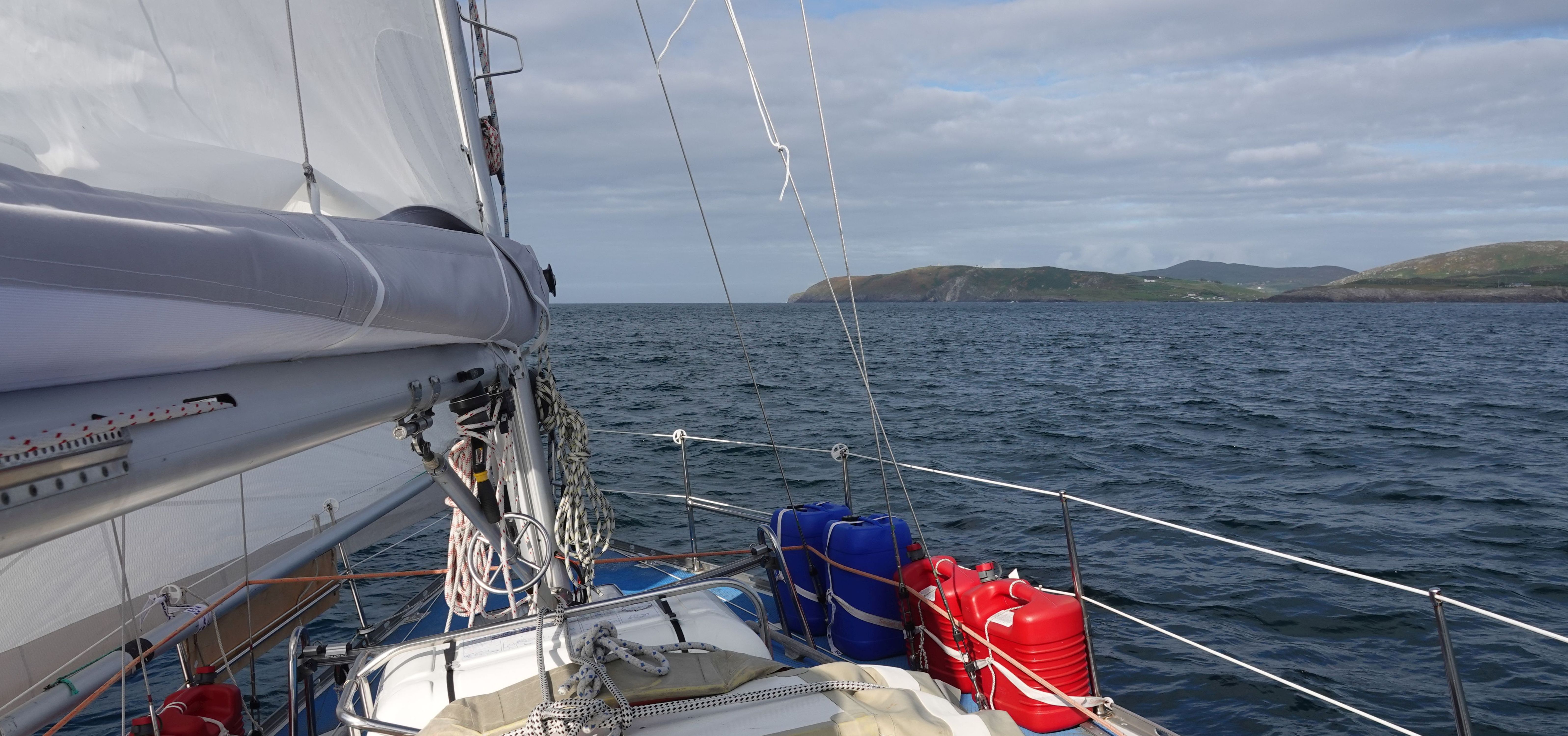 Am Ausgang der Bucht machen wir eine Halse und laufen hoch am Wind die Küste entlang nach Westen. Das wird ein weiter Schlag hinaus auf den Atlantik, zum einen um genügend Abstand von den verschiedenen Landspitzen (Brow Head, Mizen Head, Three Castle Head, Sheep's Head) mit ihren Untiefen, Strömungen und Overfalls zu halten, zum anderen weil wir so nach der Wende direkt Bere Island anliegen können.