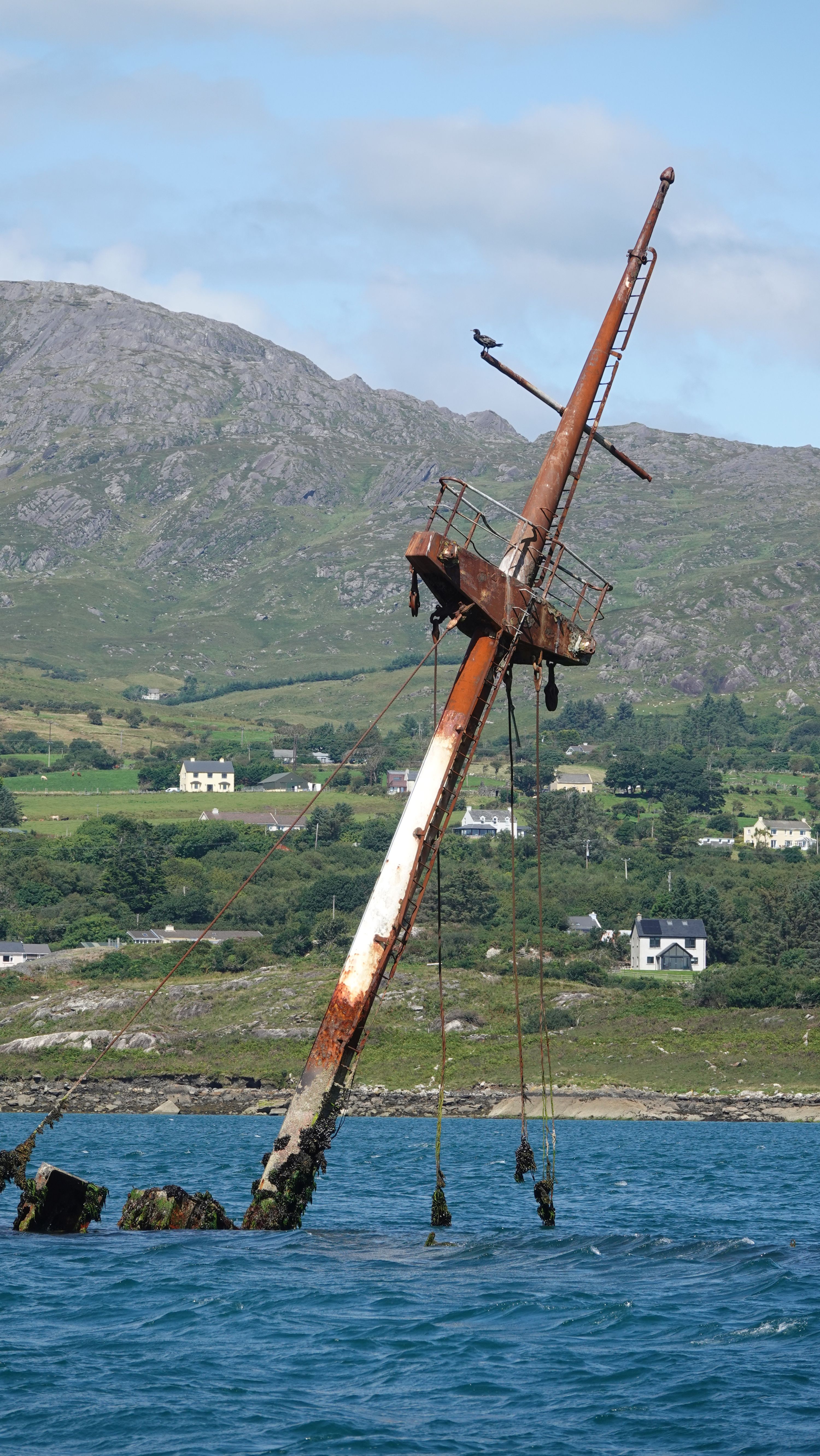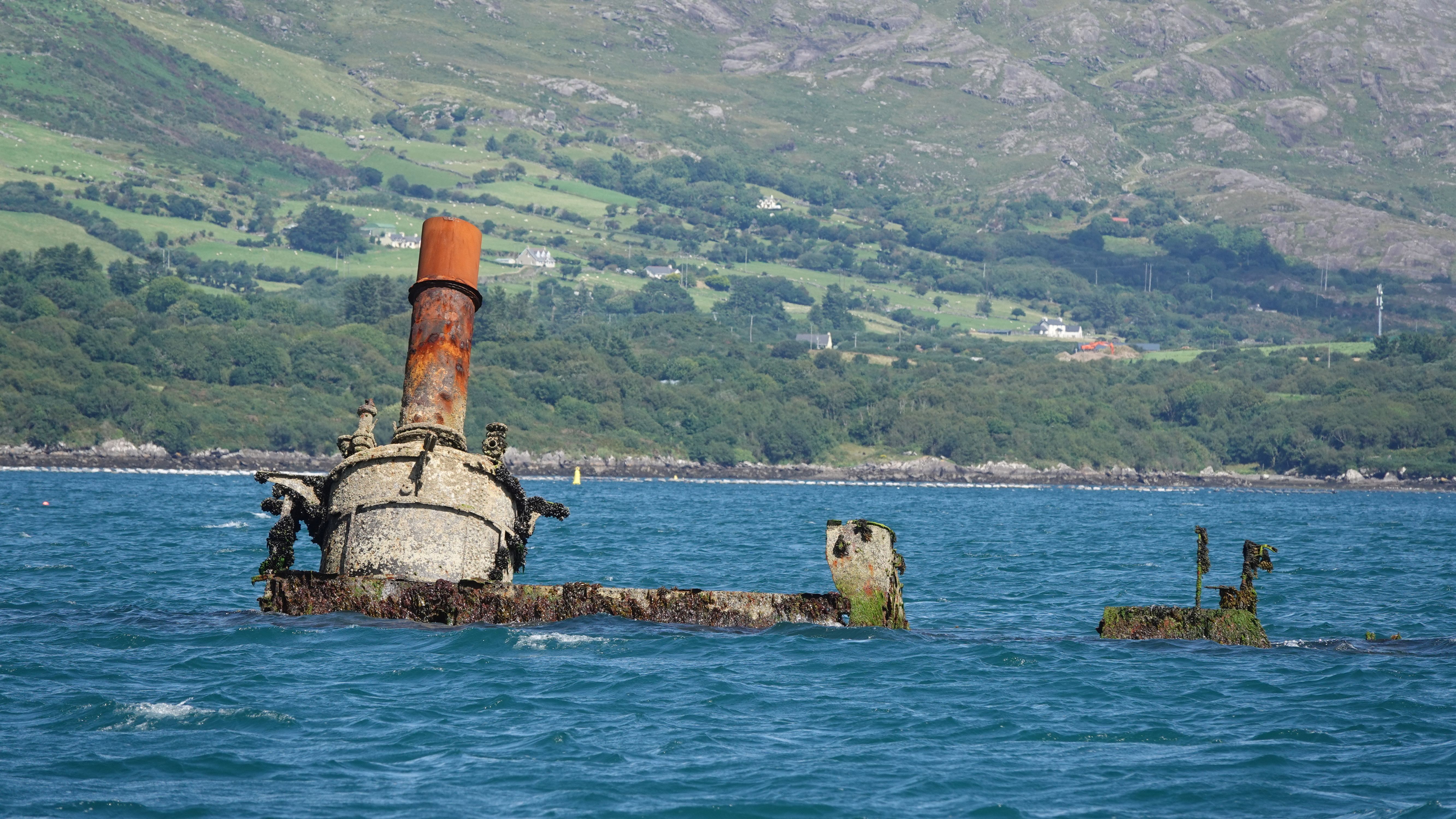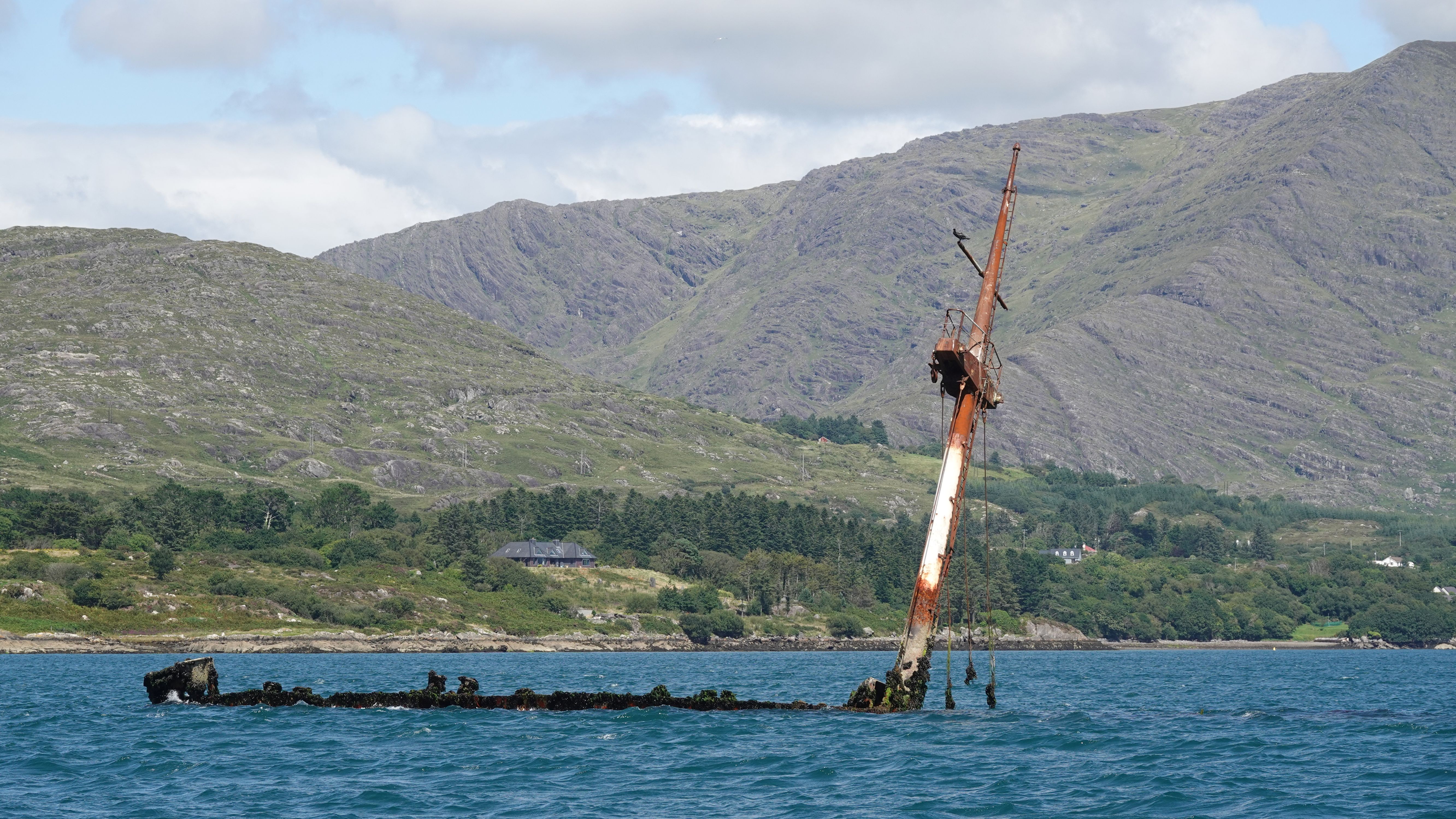 Mitten im Sund kommen wir dicht am Wrack der MV Bardini Reefer vorbei. Ein über hundert Meter langes Fabrikfischereischiff aus 1956, das nach einem drei Tage langem Brand in 1982 hier gesunken ist.