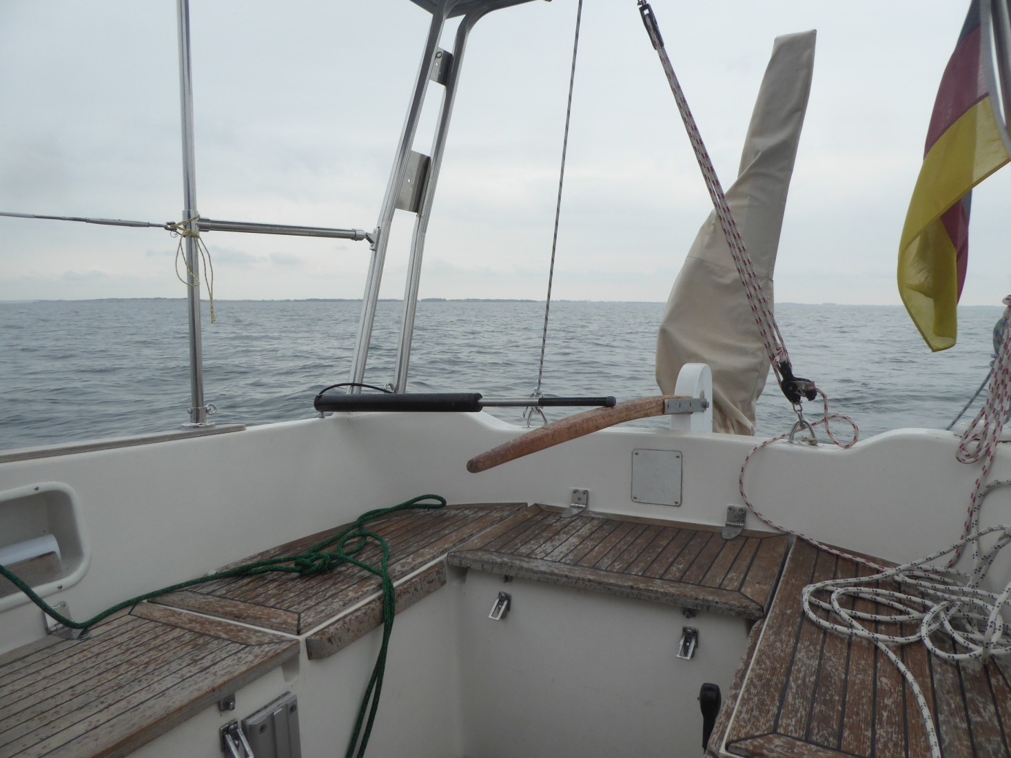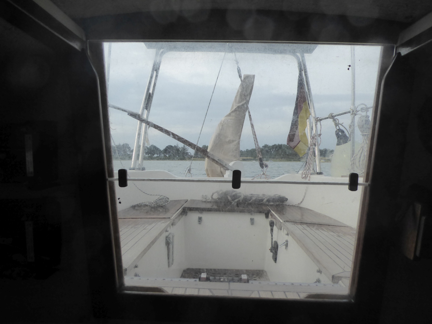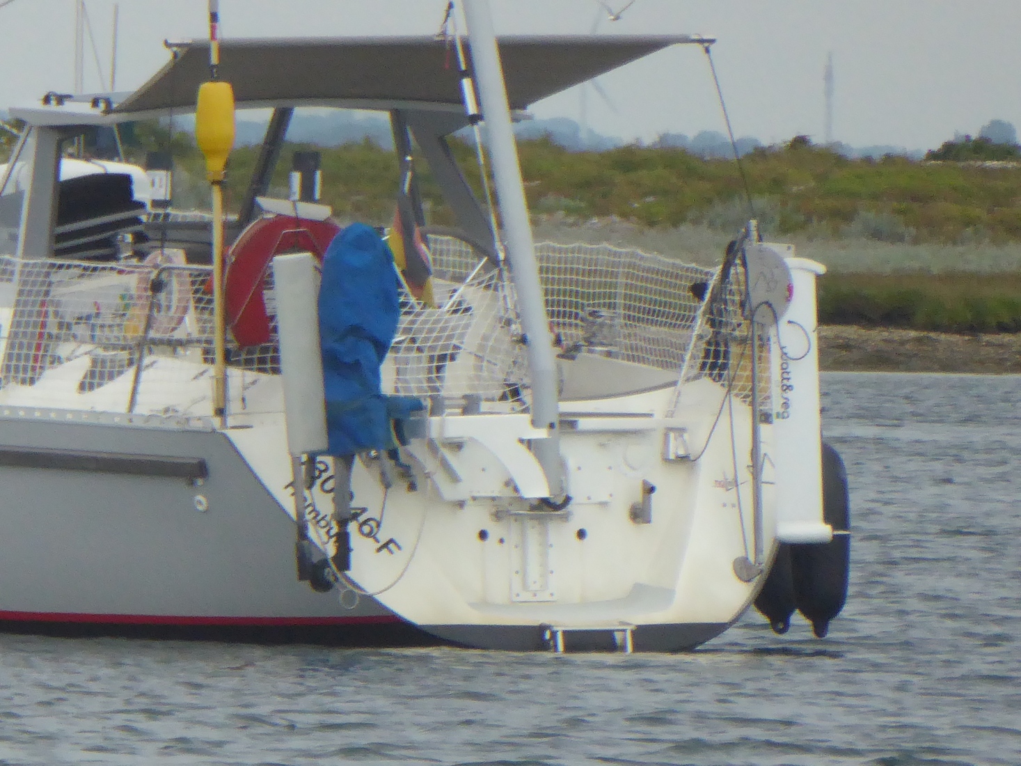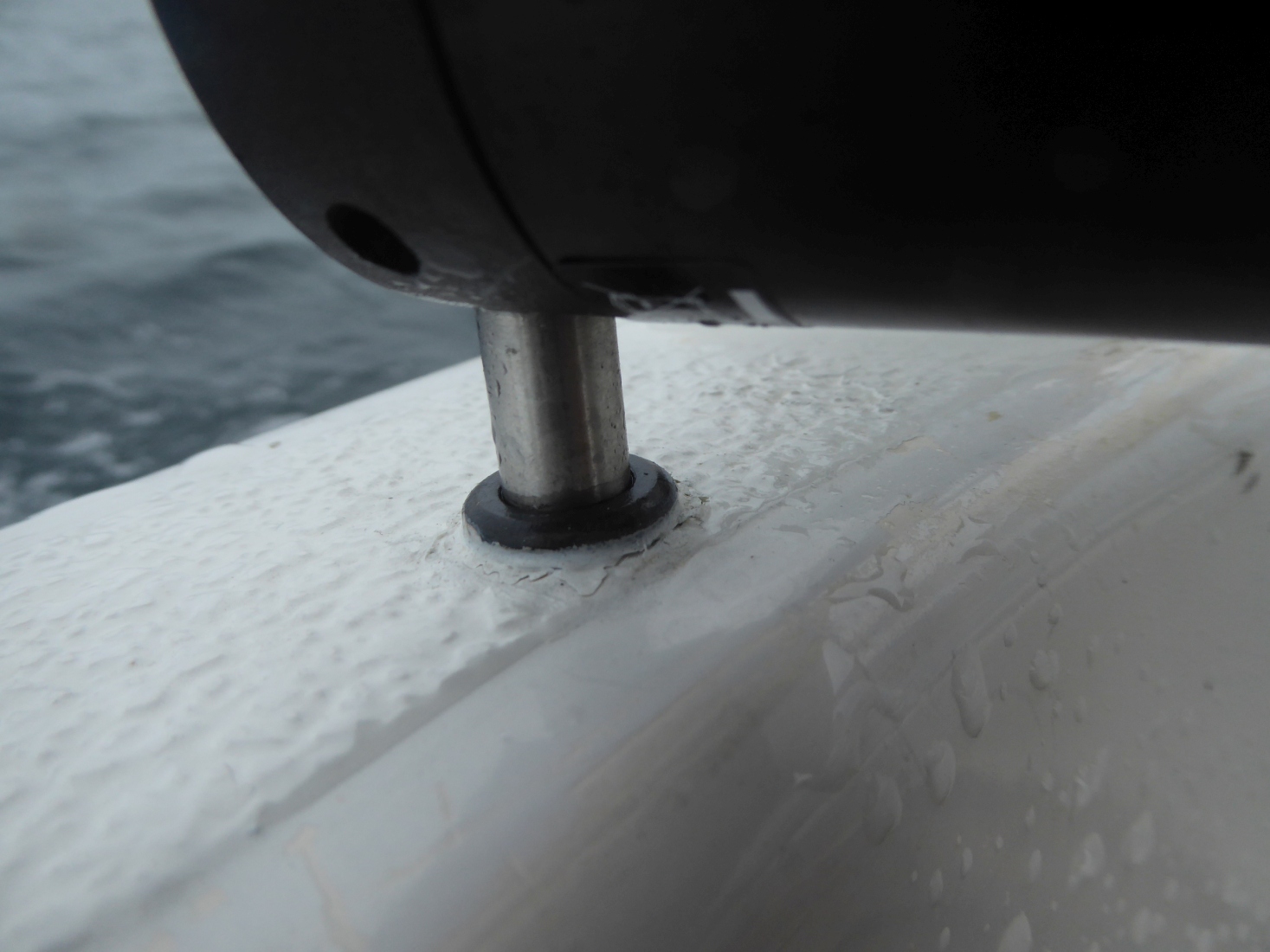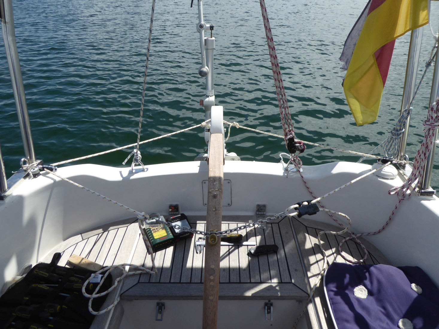 Nach dem Frühstück untersuche ich zunächst die Buchse des Autopiloten. Sie lässt sich wackeln, ist aber noch fest im Silikon eingeklebt. Gefahr, dass sie herausfällt oder Wasser durchsickert besteht also nicht. Leider habe ich kein passendes Holz dabei, um eine Verstärkung unter das Buchsenloch zu kleben.