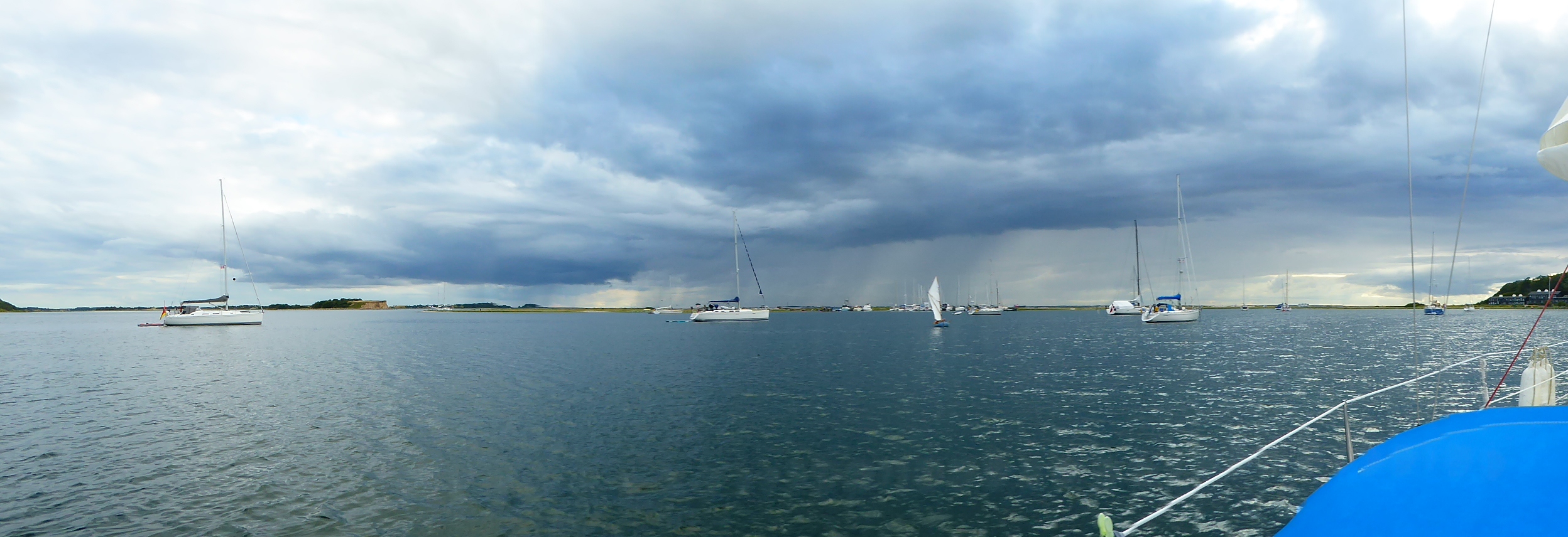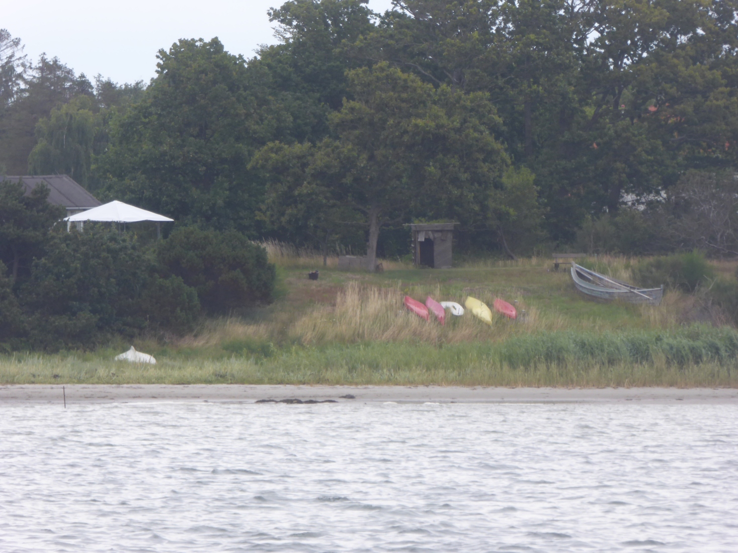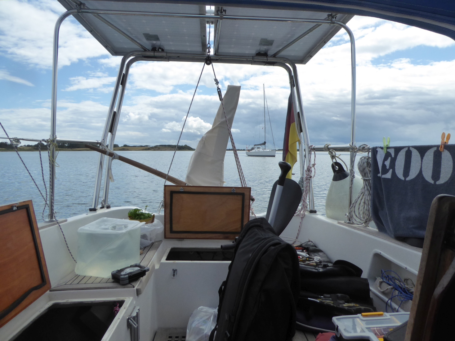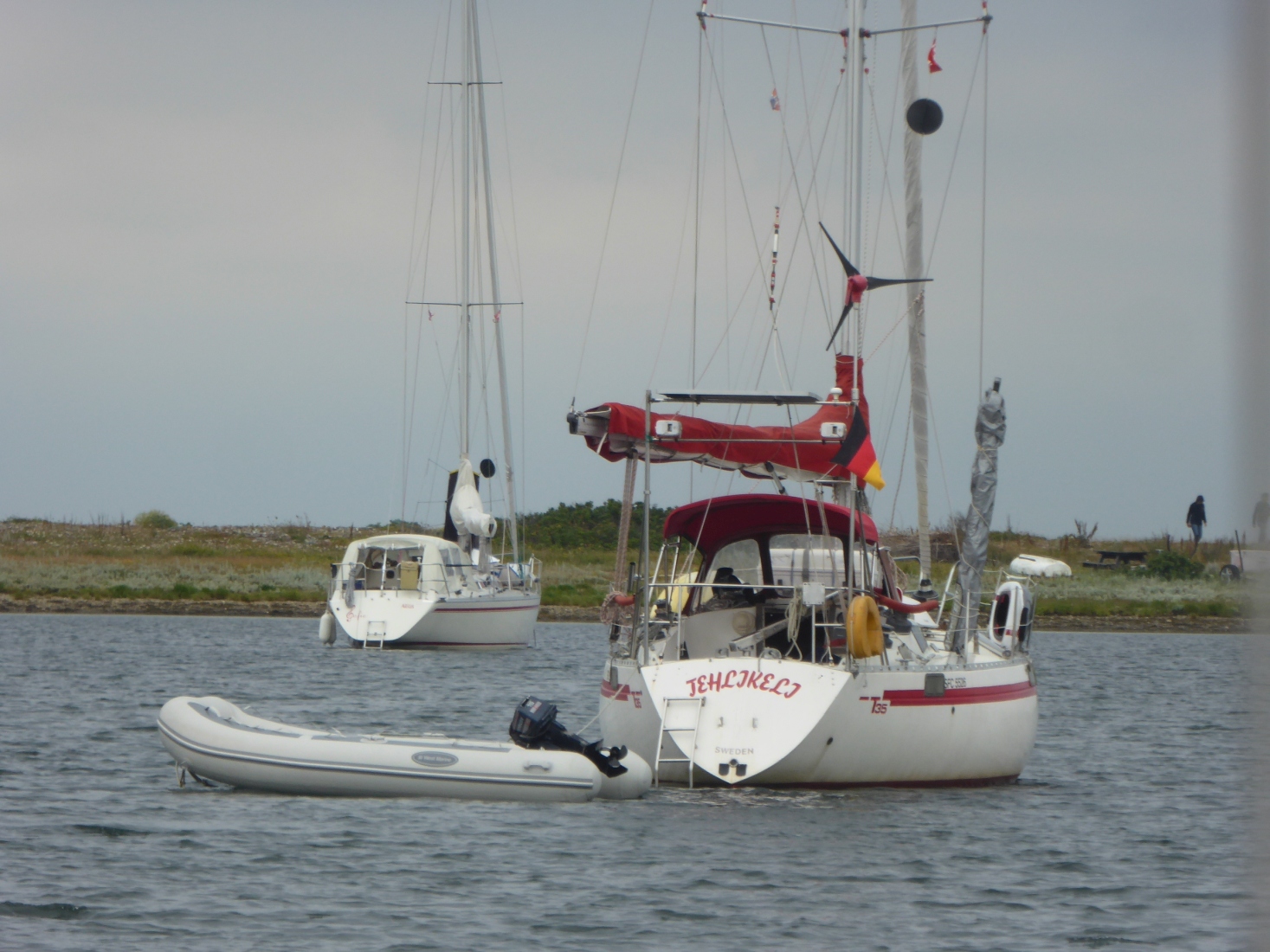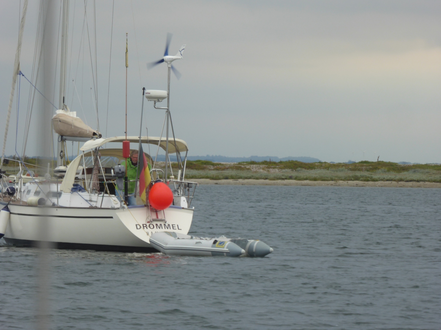 Drei Deutsche liegen in Korshavn bereits vor Anker, ein vierter kommt dazu, kaum, dass mein Anker sitzt. Alle viere mit Windrad, Radar, dickem Schlauchboot; zum Teil auch Solar und Schleppgenerator.