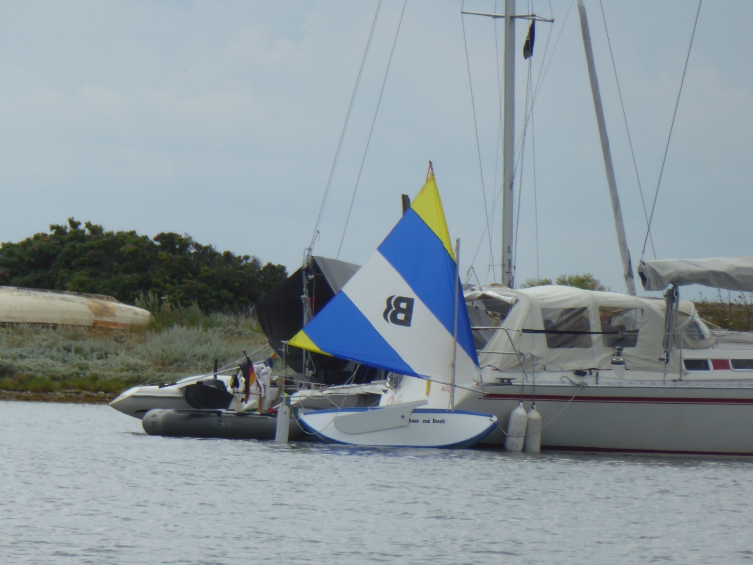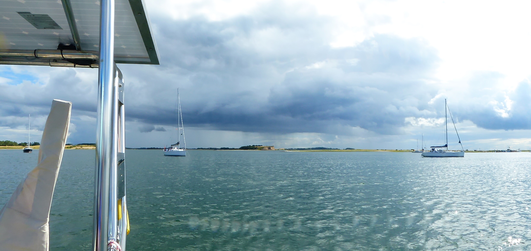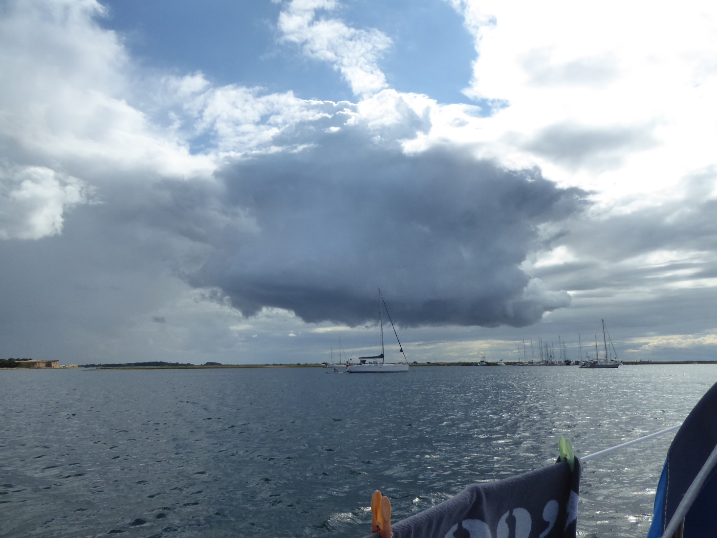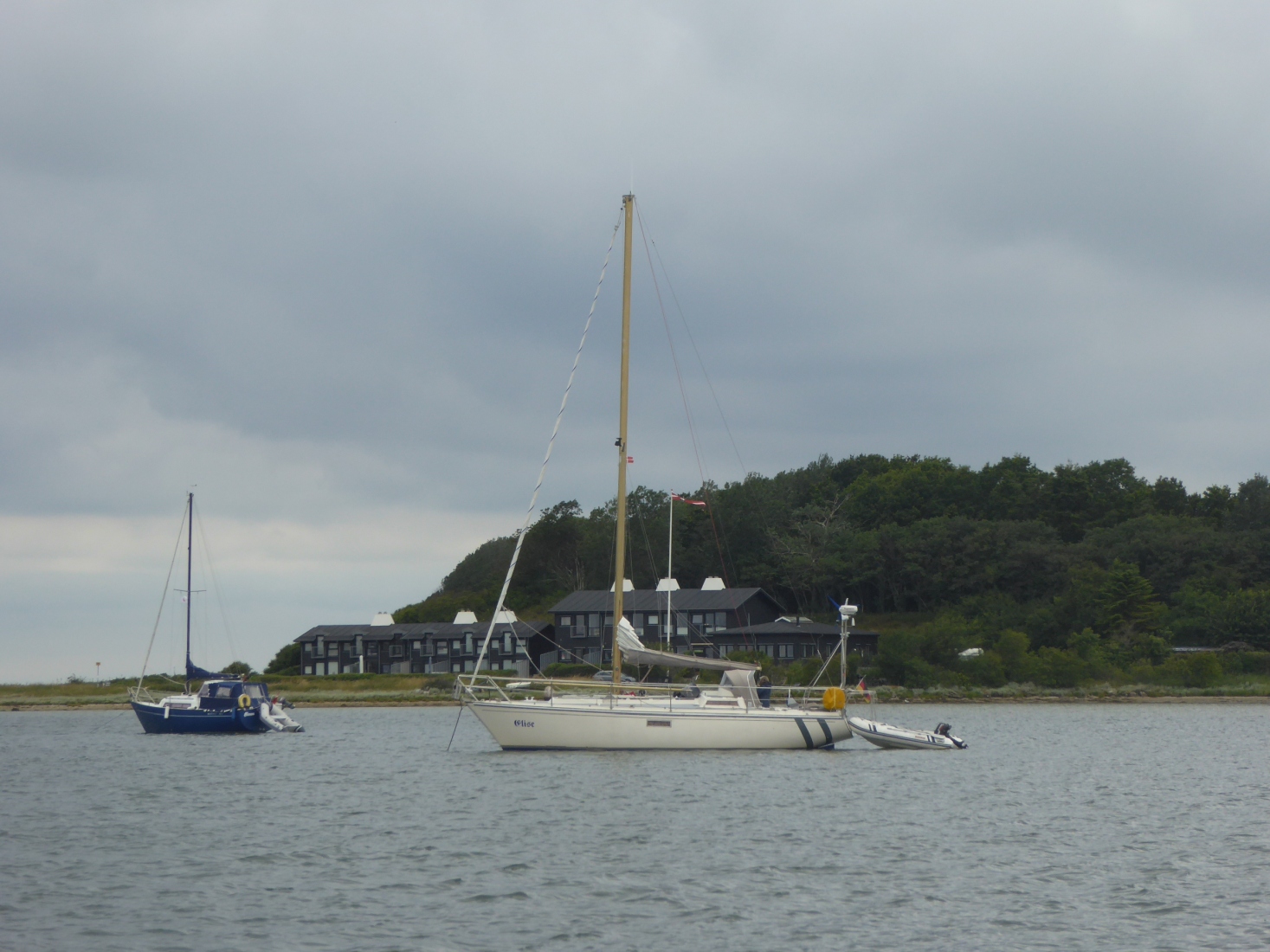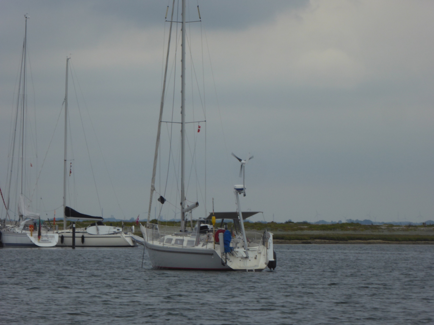 Drei Deutsche liegen in Korshavn bereits vor Anker, ein vierter kommt dazu, kaum, dass mein Anker sitzt. Alle viere mit Windrad, Radar, dickem Schlauchboot; zum Teil auch Solar und Schleppgenerator.