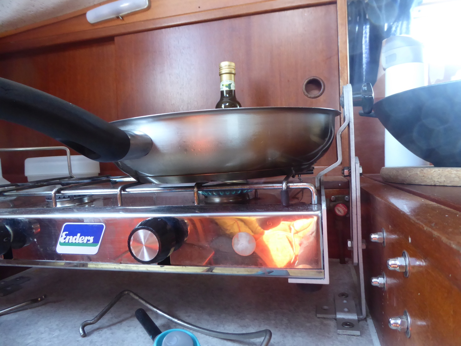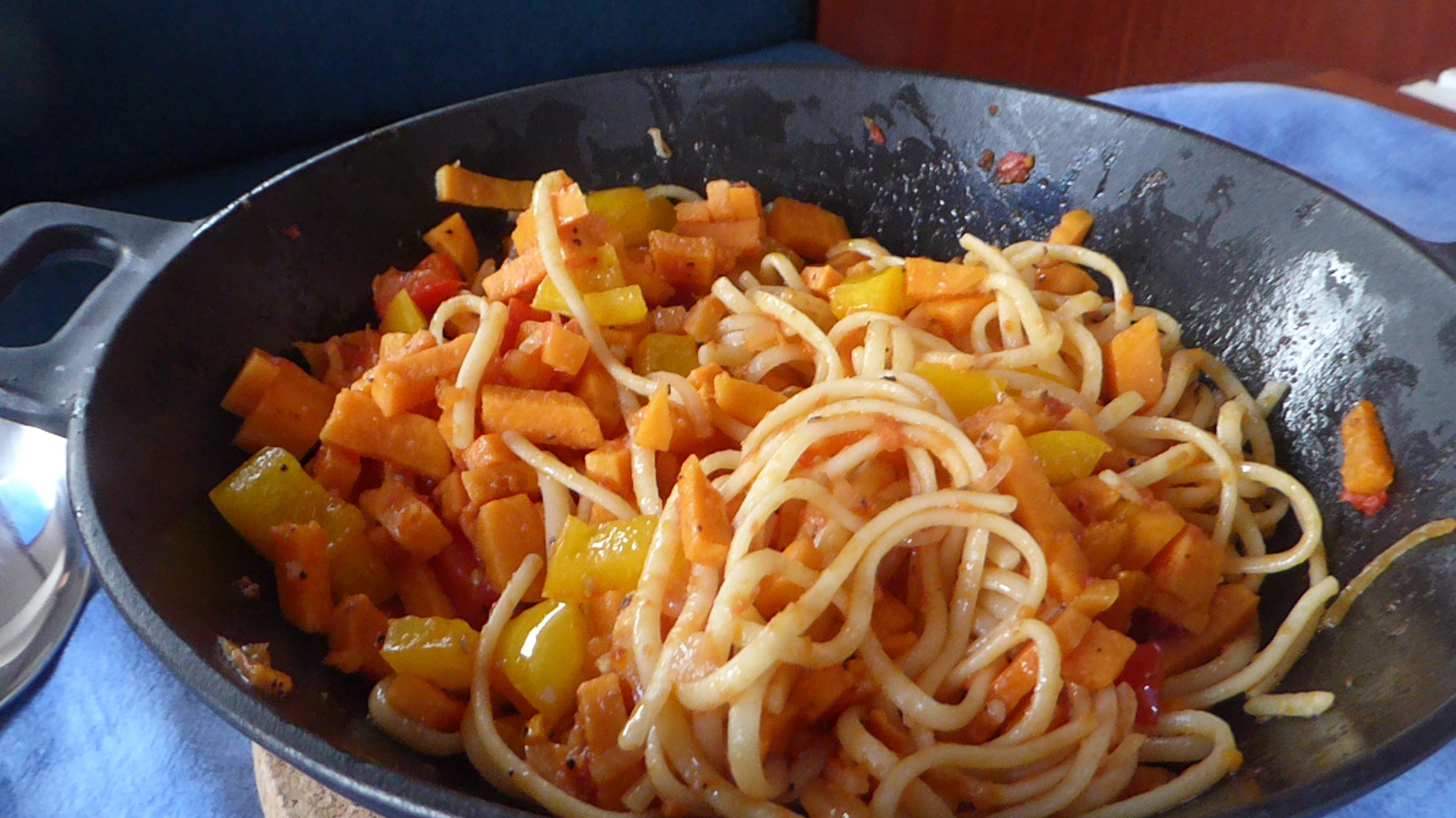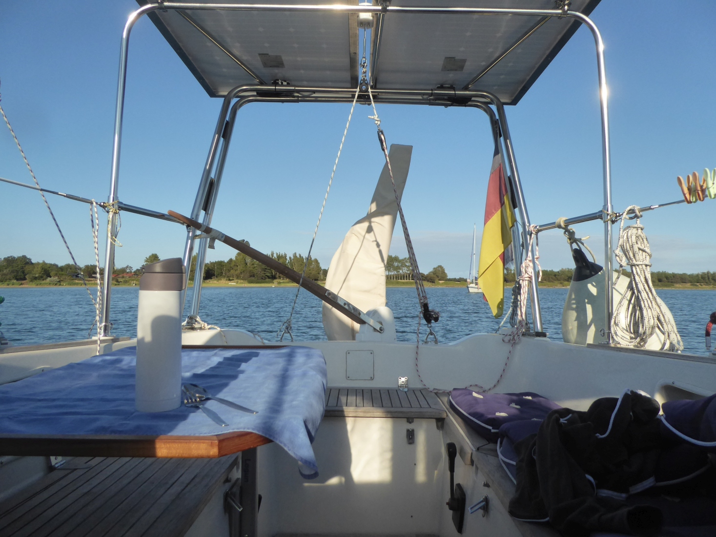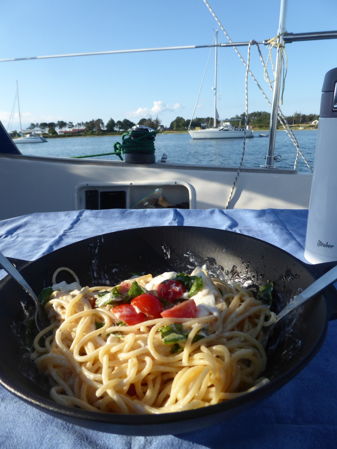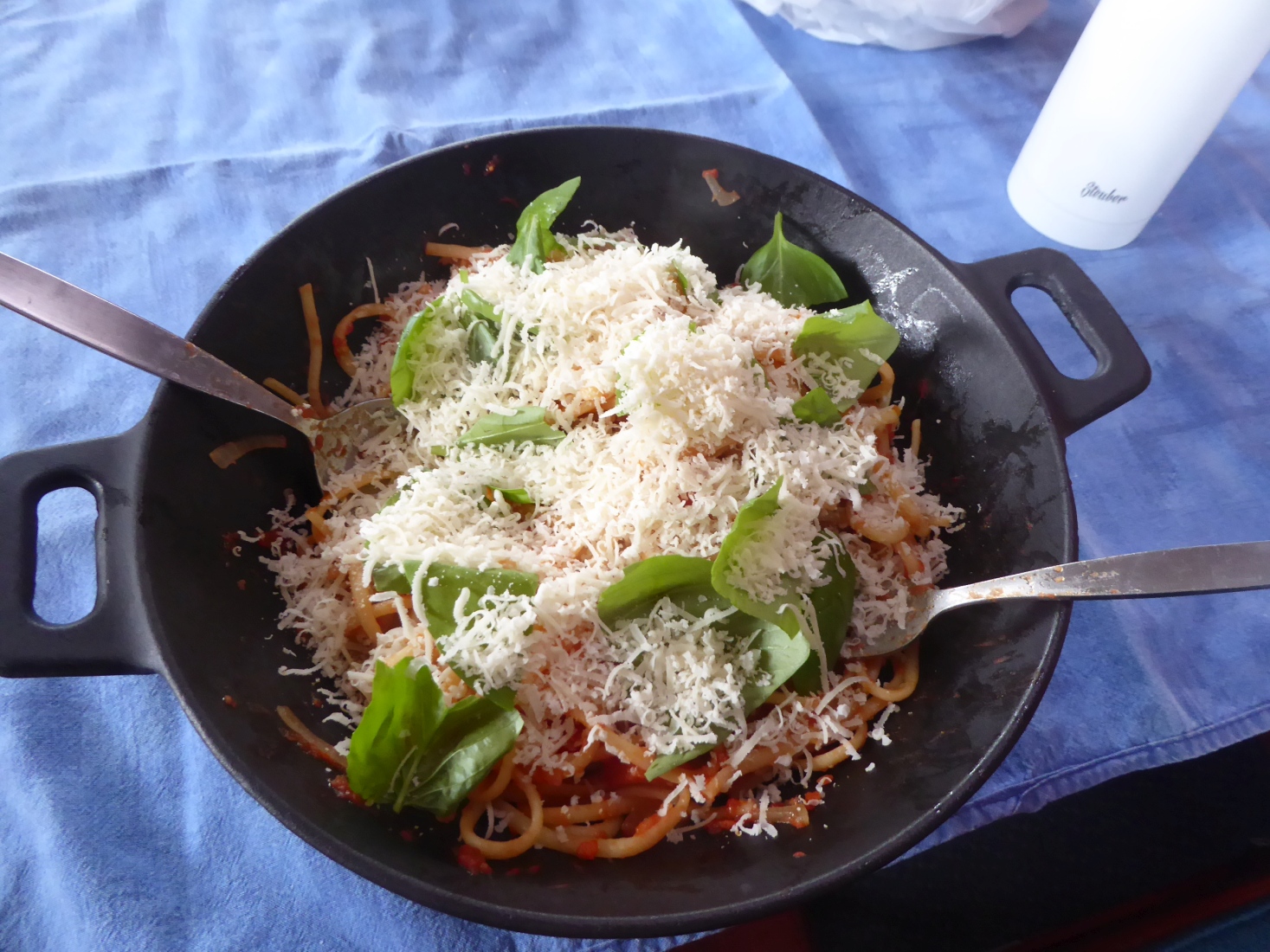 Und das erste Abendessen im Cockpit. Dort sitze ich dann auch noch