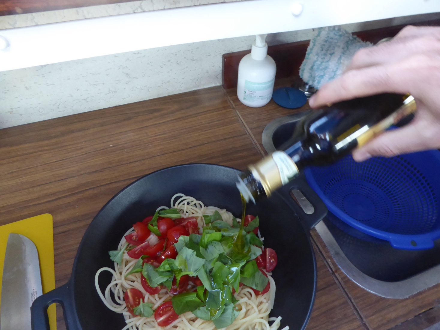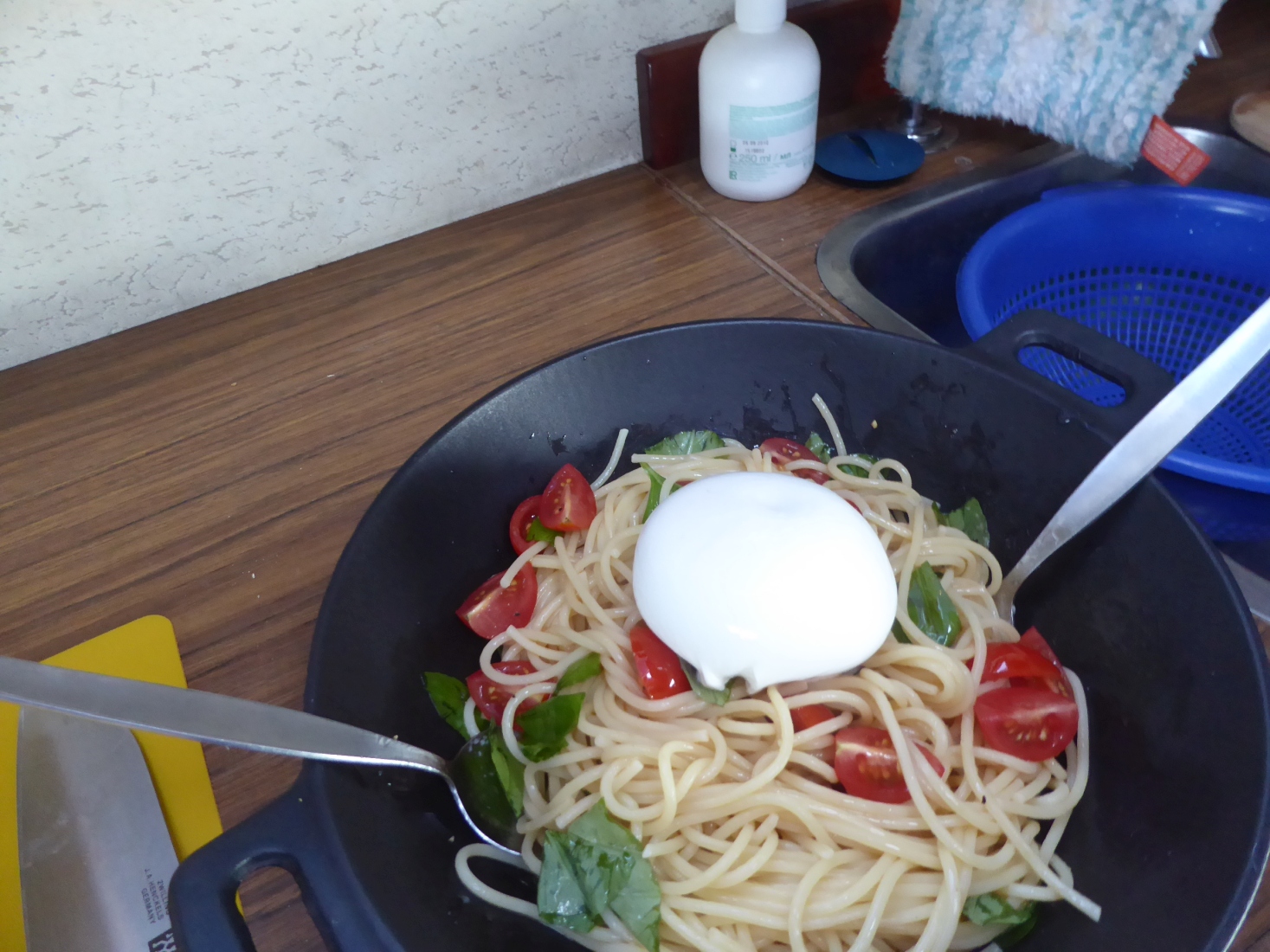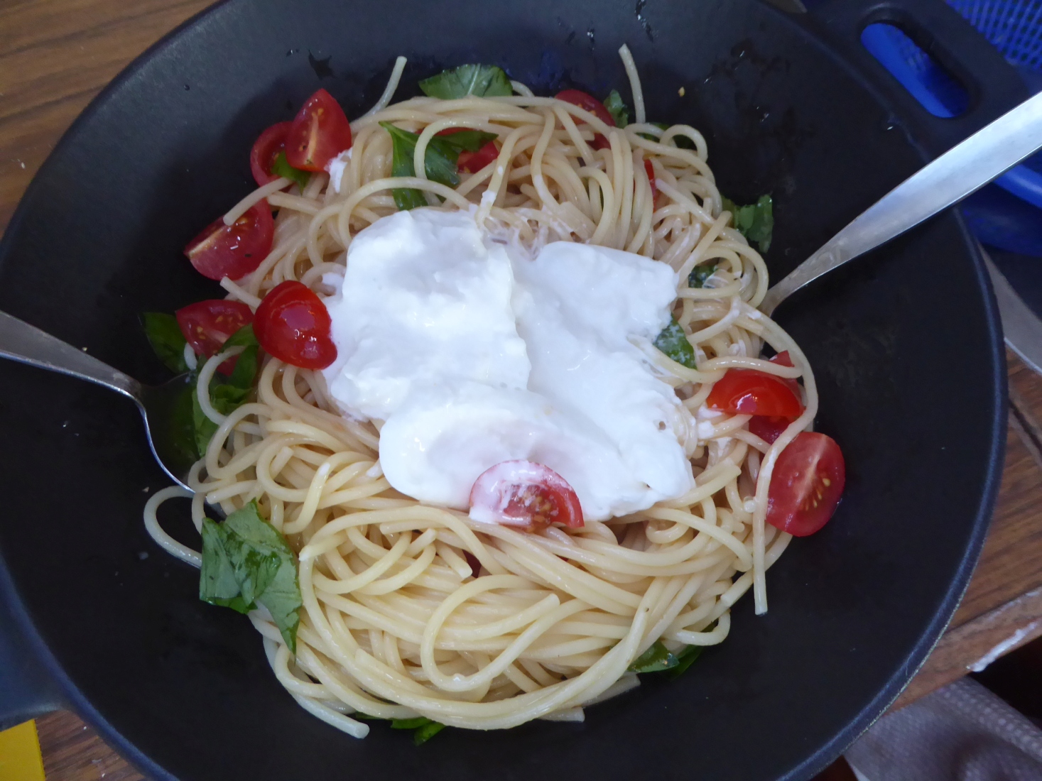 Abends: Spaghetti mit Öl, Tomaten, Basilikum und Burrata. Köstlich!