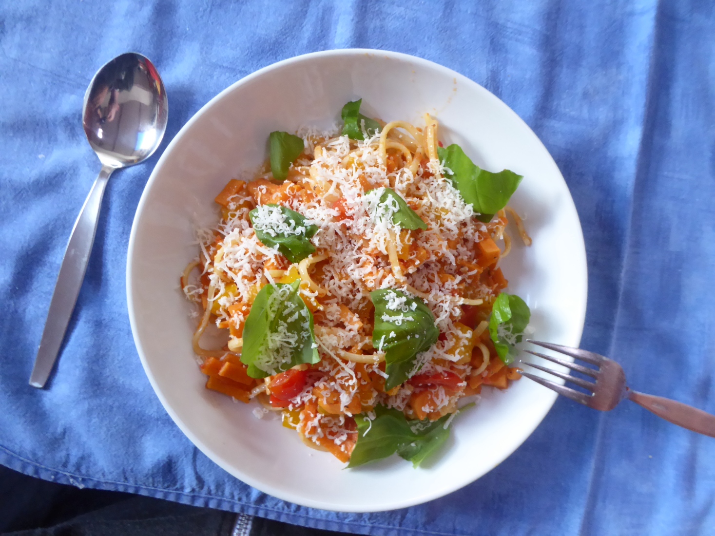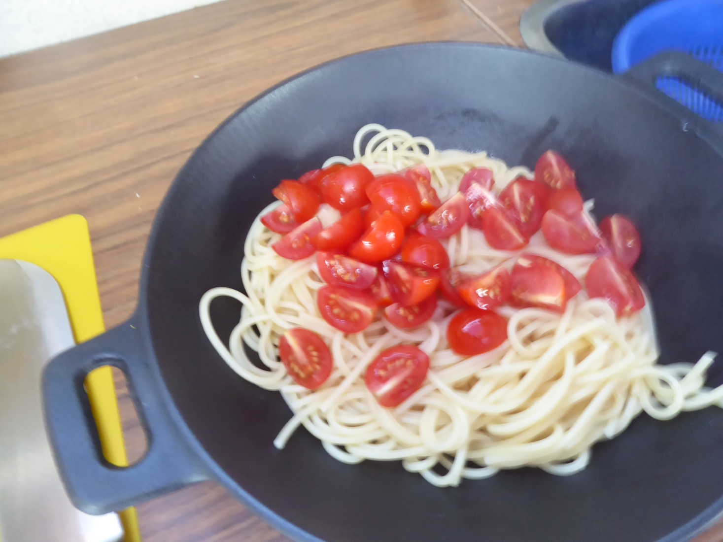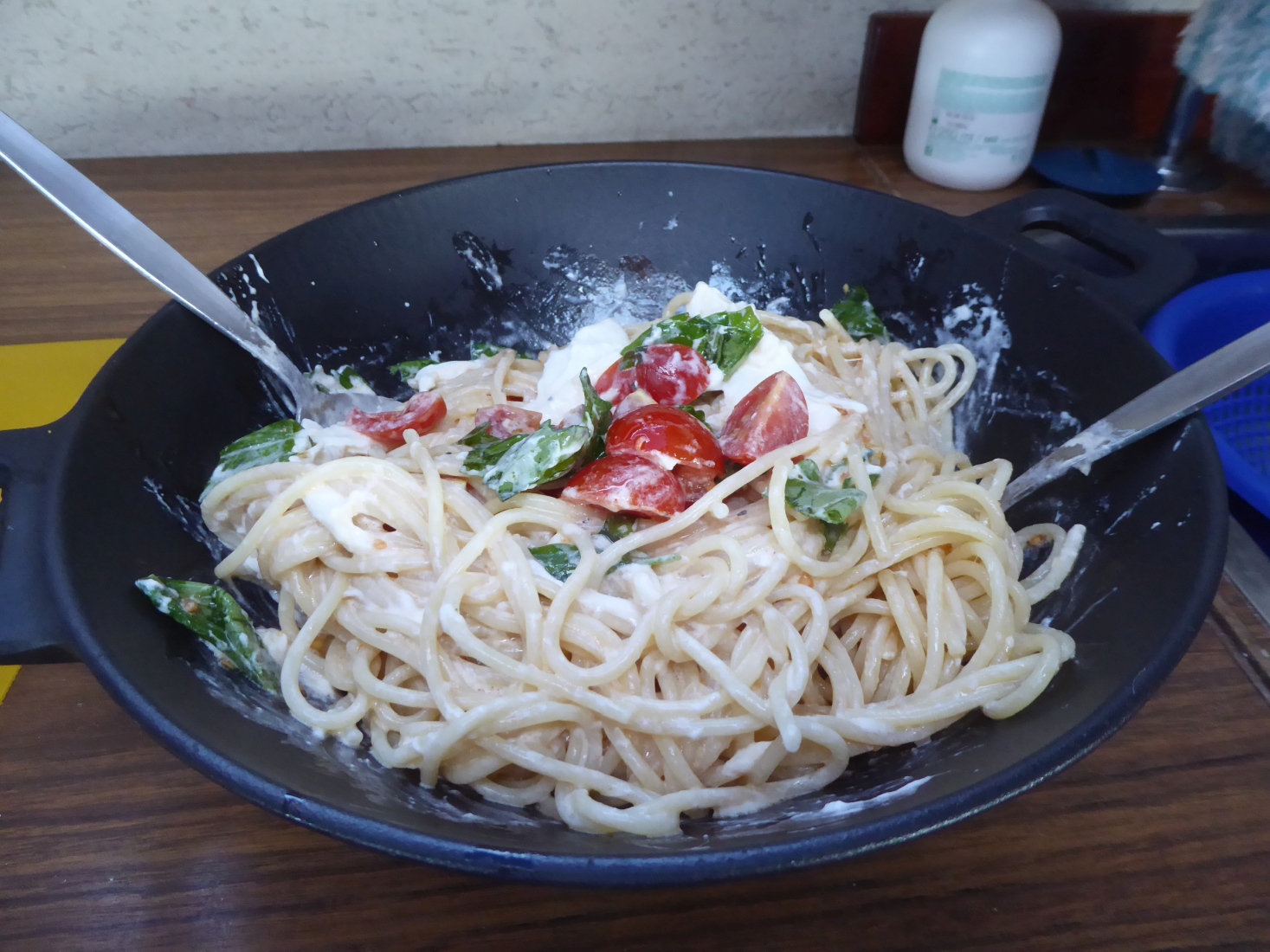 Abends: Spaghetti mit Öl, Tomaten, Basilikum und Burrata. Köstlich!