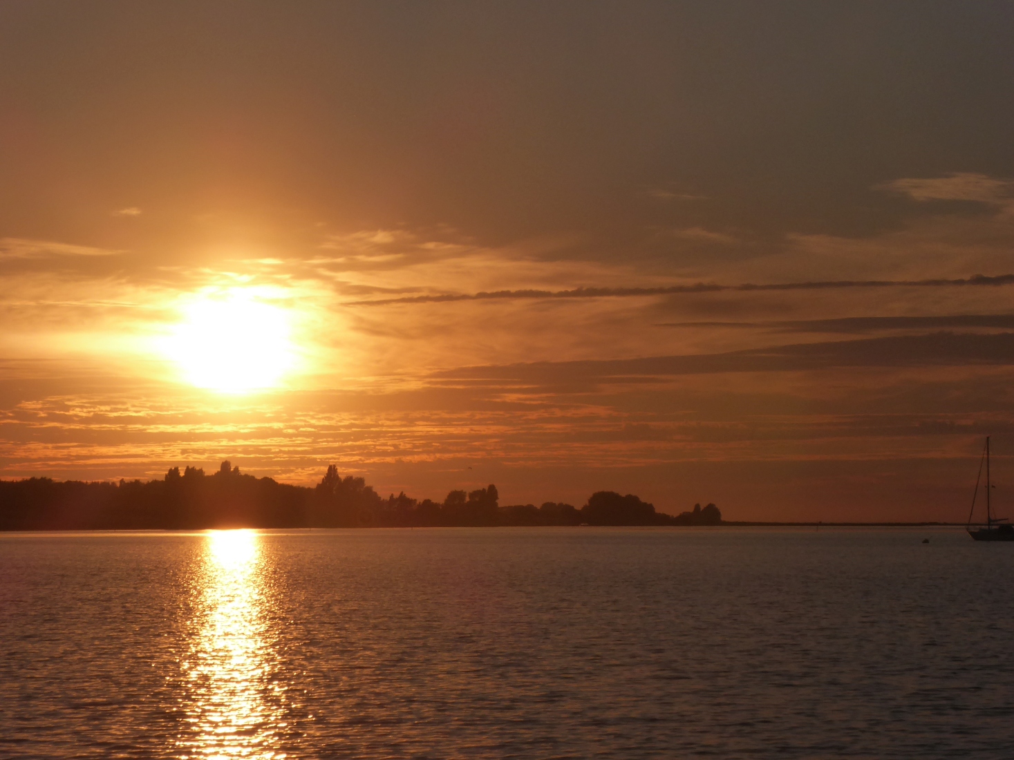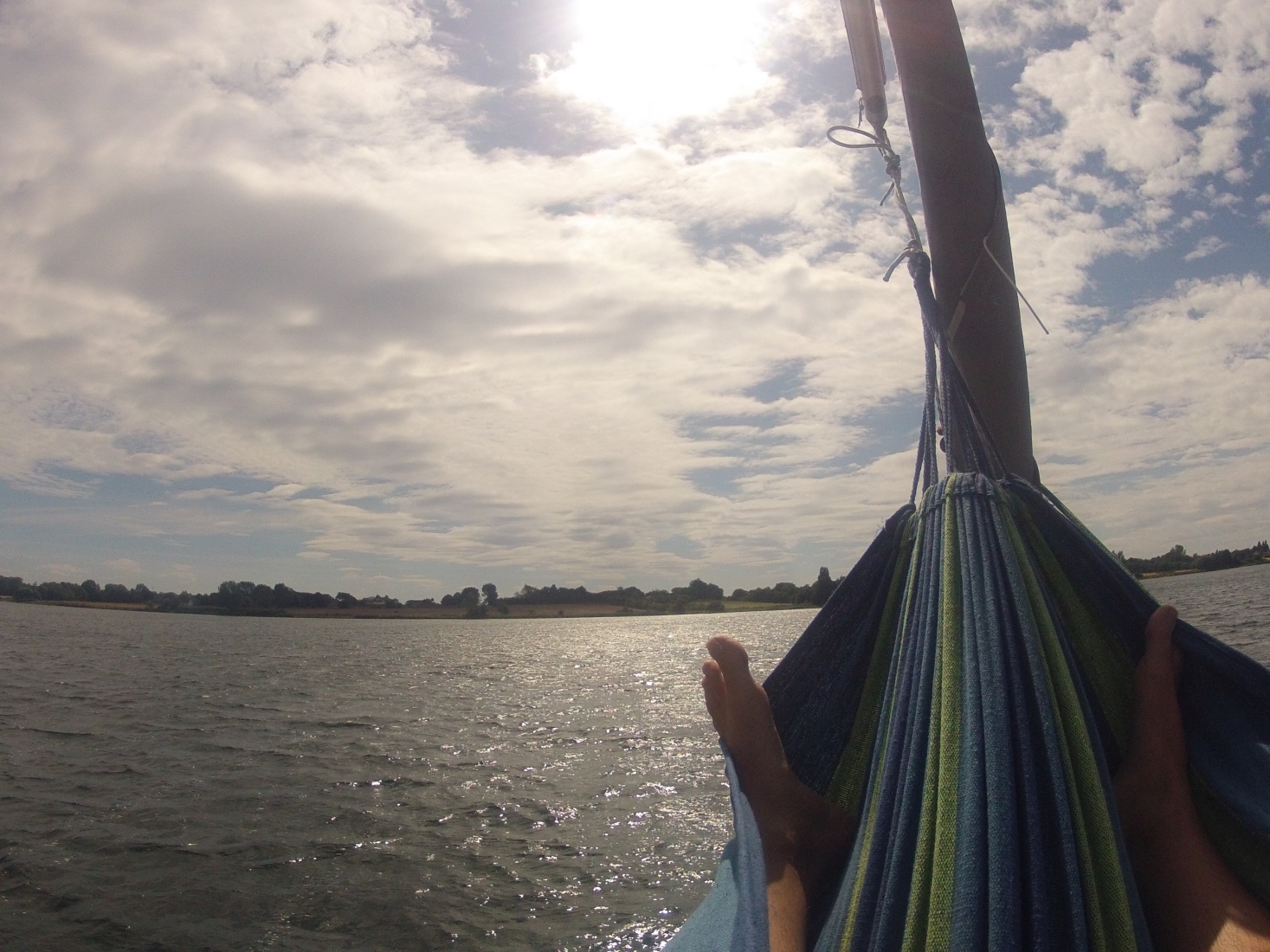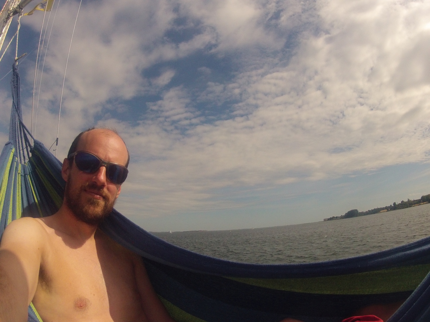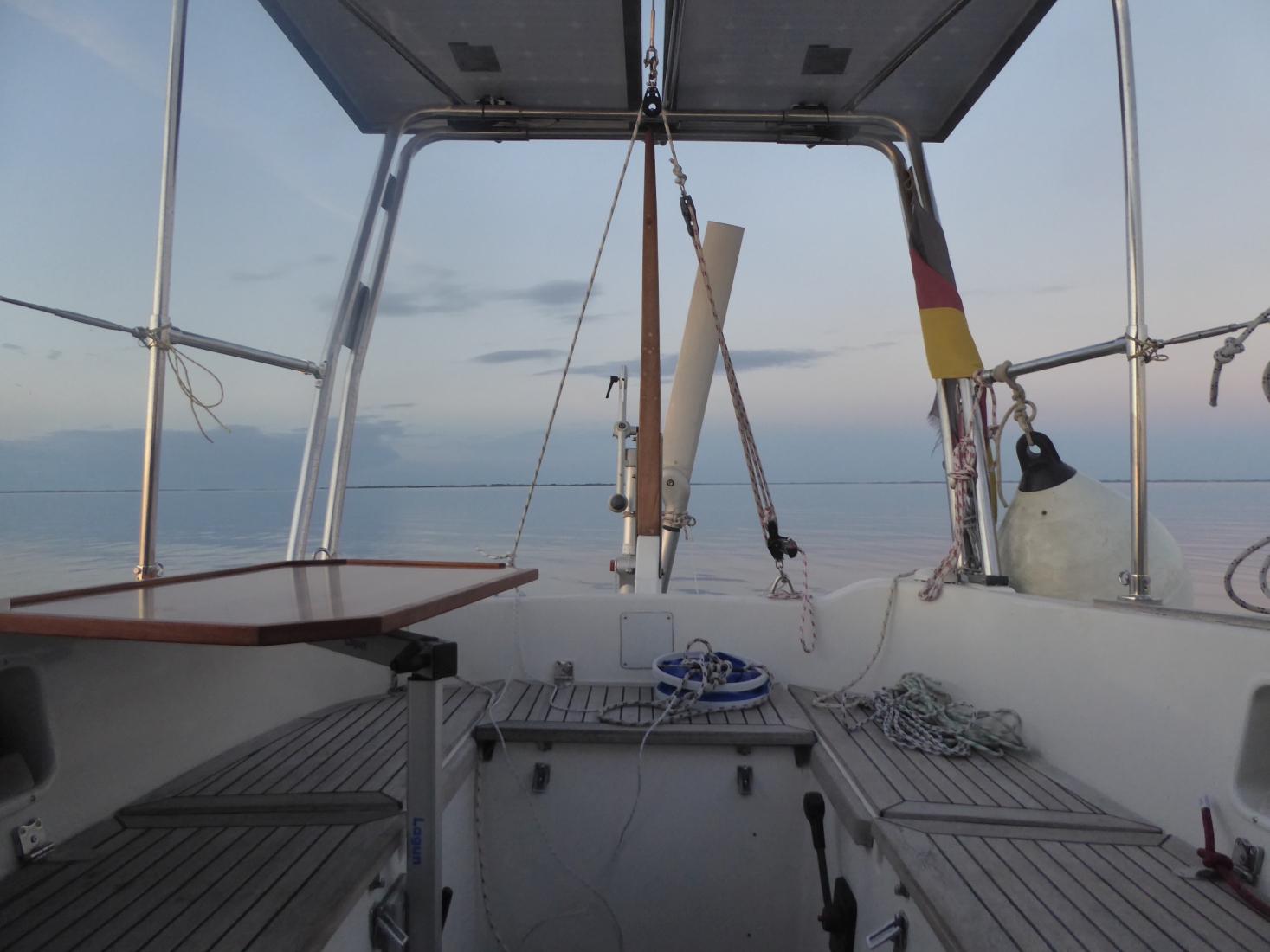 Beim Abendessen hängt ein Mückenschwarm über der Plicht. Mit WC-Duftspray lassen die sich etwas verscheuchen, aber nie für lang. Den Sonnenuntergang schaue ich mir überm Vorschiff in der Hängematte an. Dabei besucht mich noch kurz ein Schweinswal und taucht direkt unterm Bug hindurch. Anschließend flüchte ich vor den Mücken unter Deck.