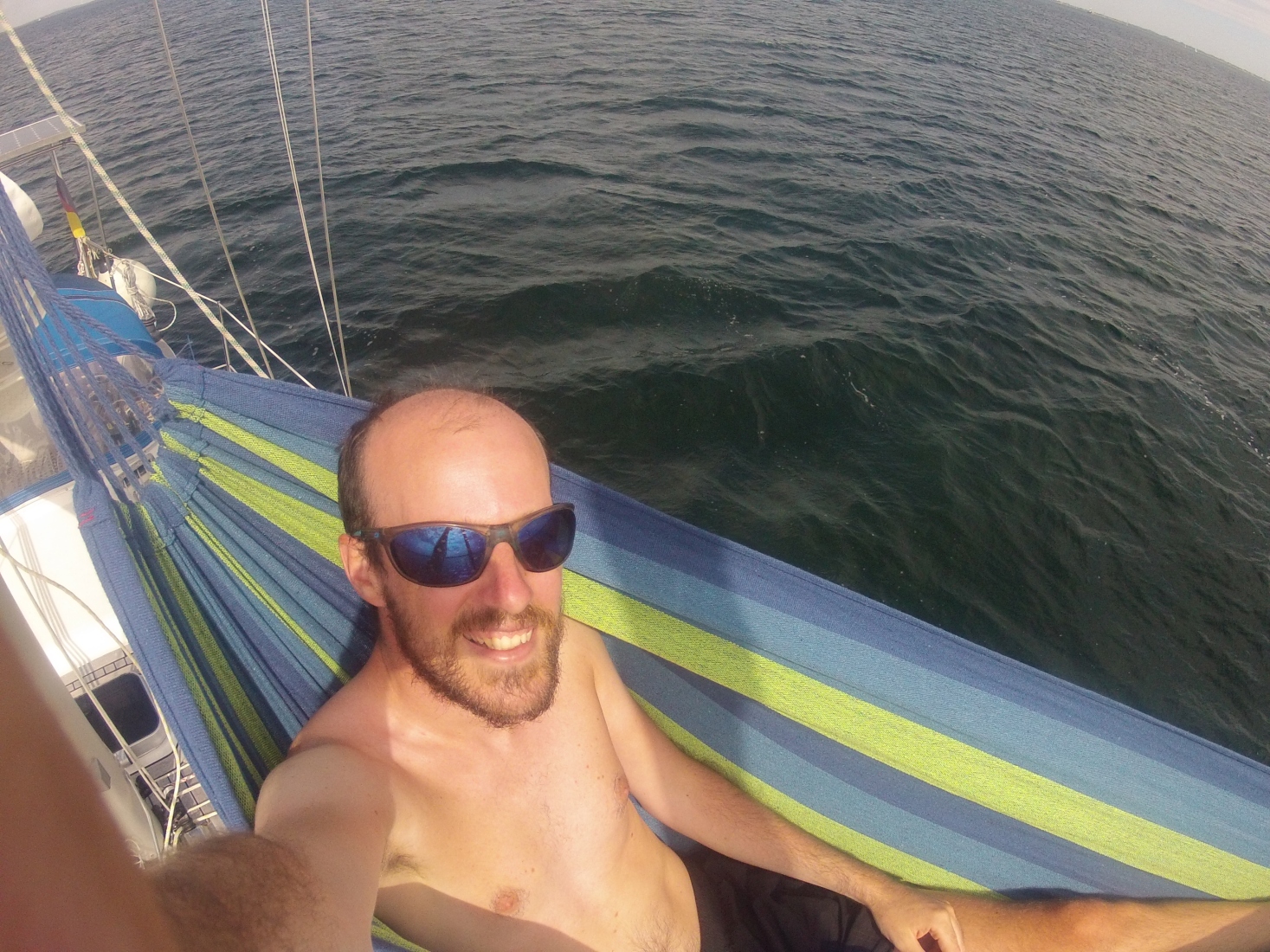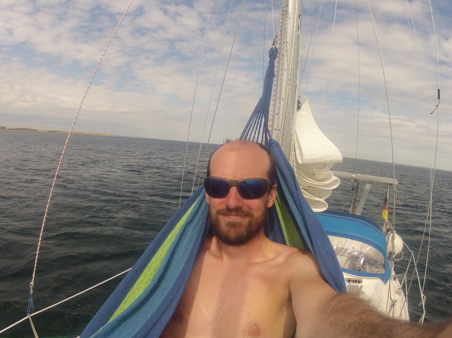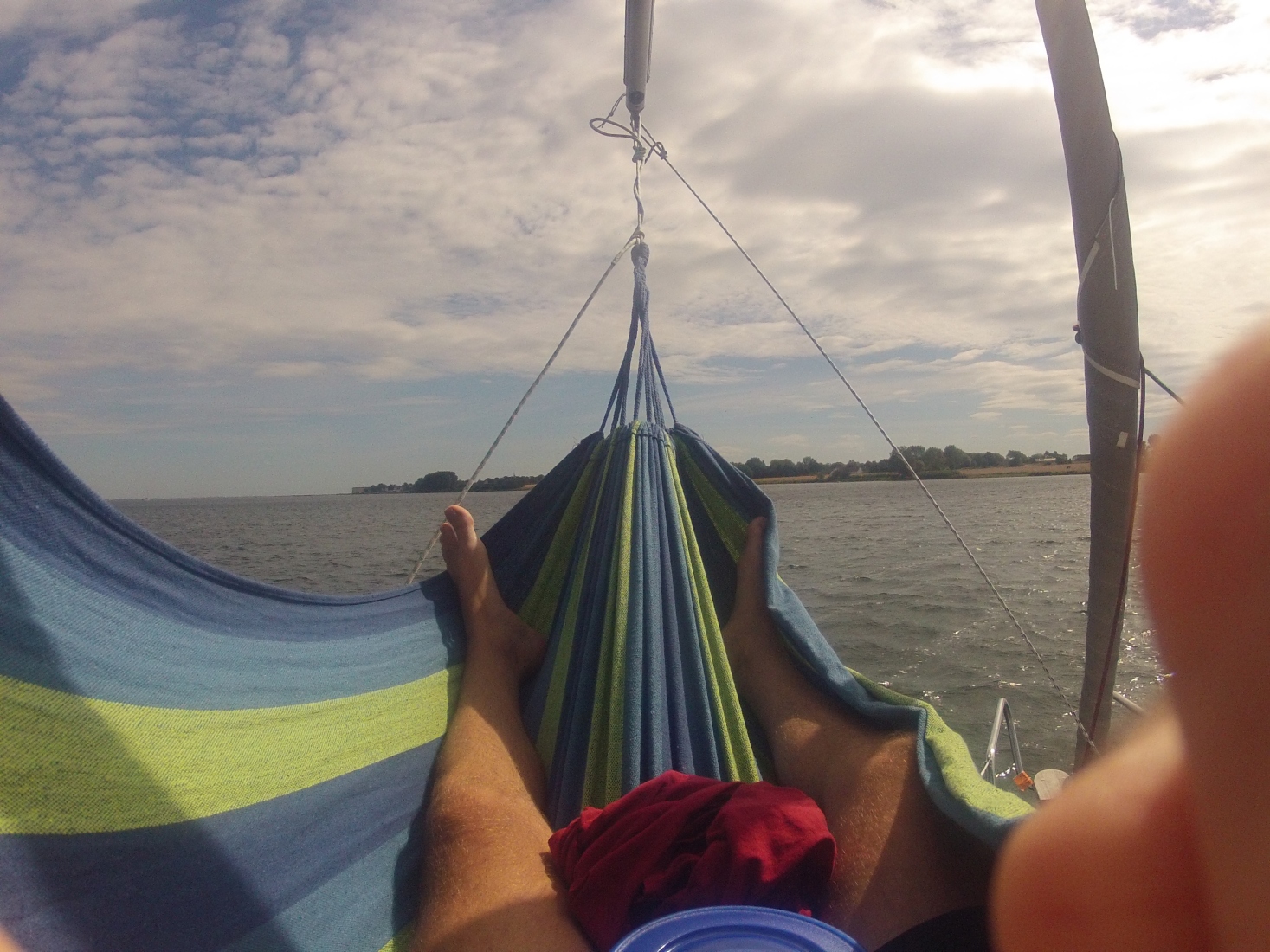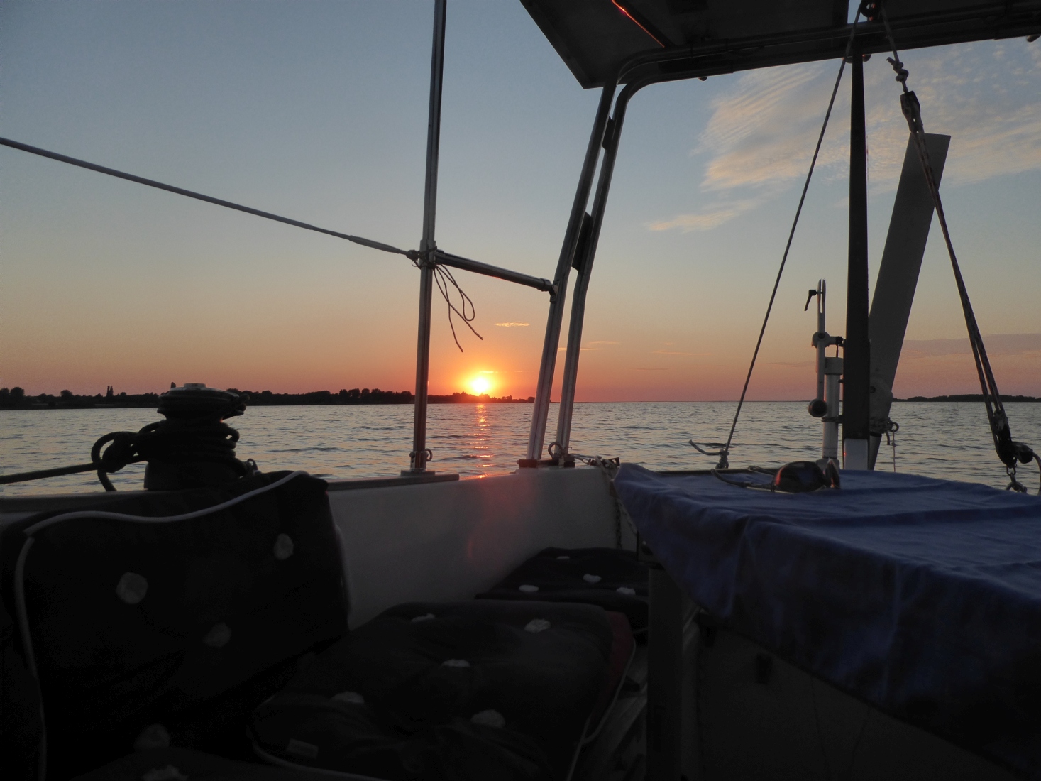 Beim Abendessen hängt ein Mückenschwarm über der Plicht. Mit WC-Duftspray lassen die sich etwas verscheuchen, aber nie für lang. Den Sonnenuntergang schaue ich mir überm Vorschiff in der Hängematte an. Dabei besucht mich noch kurz ein Schweinswal und taucht direkt unterm Bug hindurch. Anschließend flüchte ich vor den Mücken unter Deck.