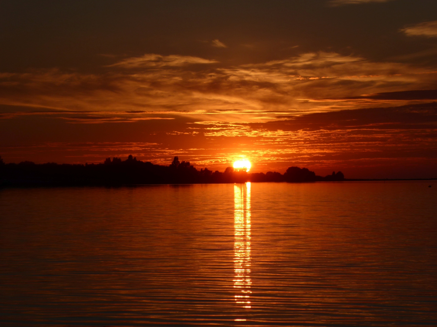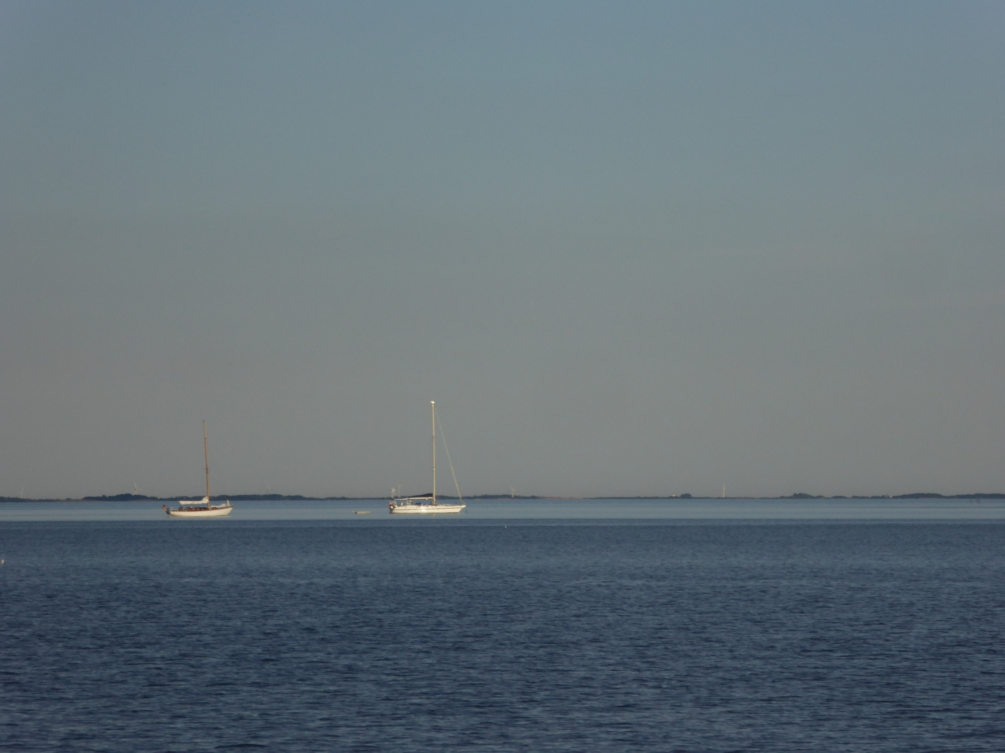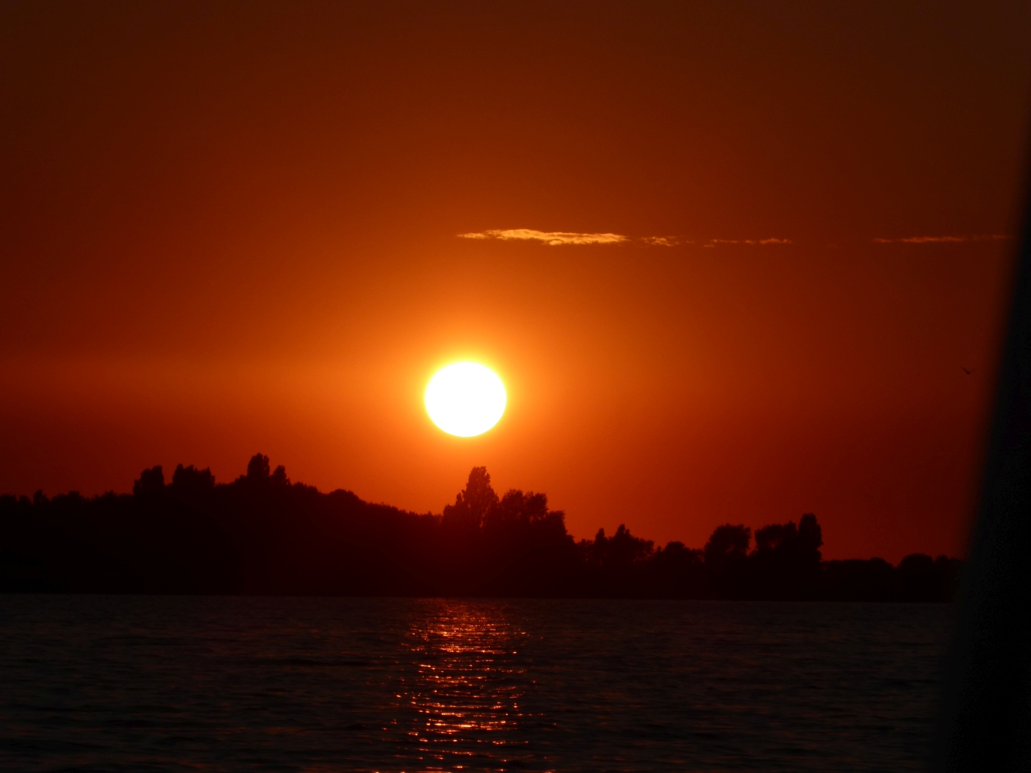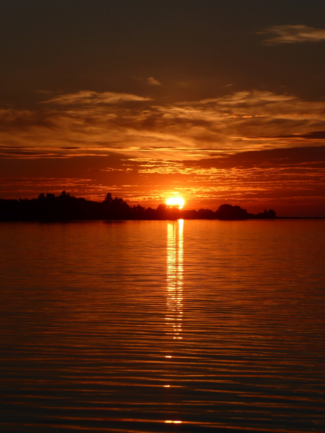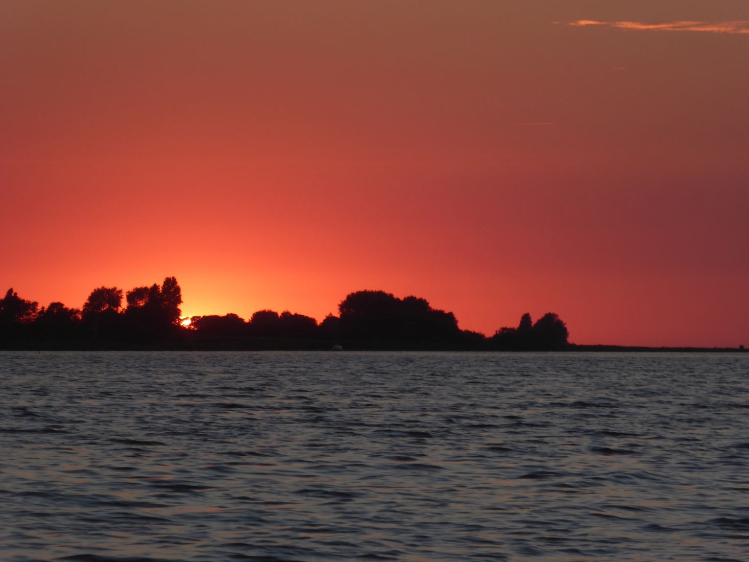 Beim Abendessen hängt ein Mückenschwarm über der Plicht. Mit WC-Duftspray lassen die sich etwas verscheuchen, aber nie für lang. Den Sonnenuntergang schaue ich mir überm Vorschiff in der Hängematte an. Dabei besucht mich noch kurz ein Schweinswal und taucht direkt unterm Bug hindurch. Anschließend flüchte ich vor den Mücken unter Deck.