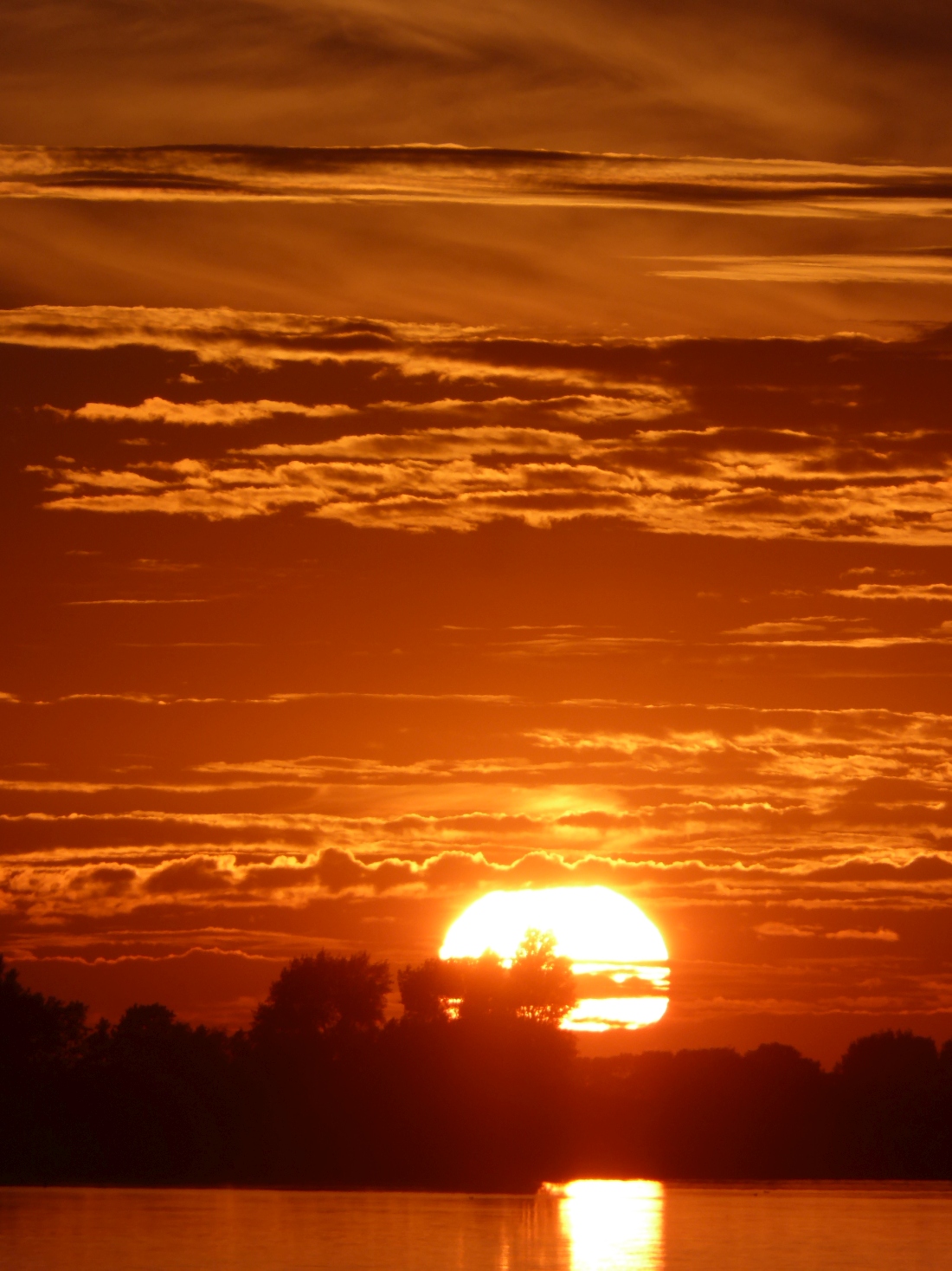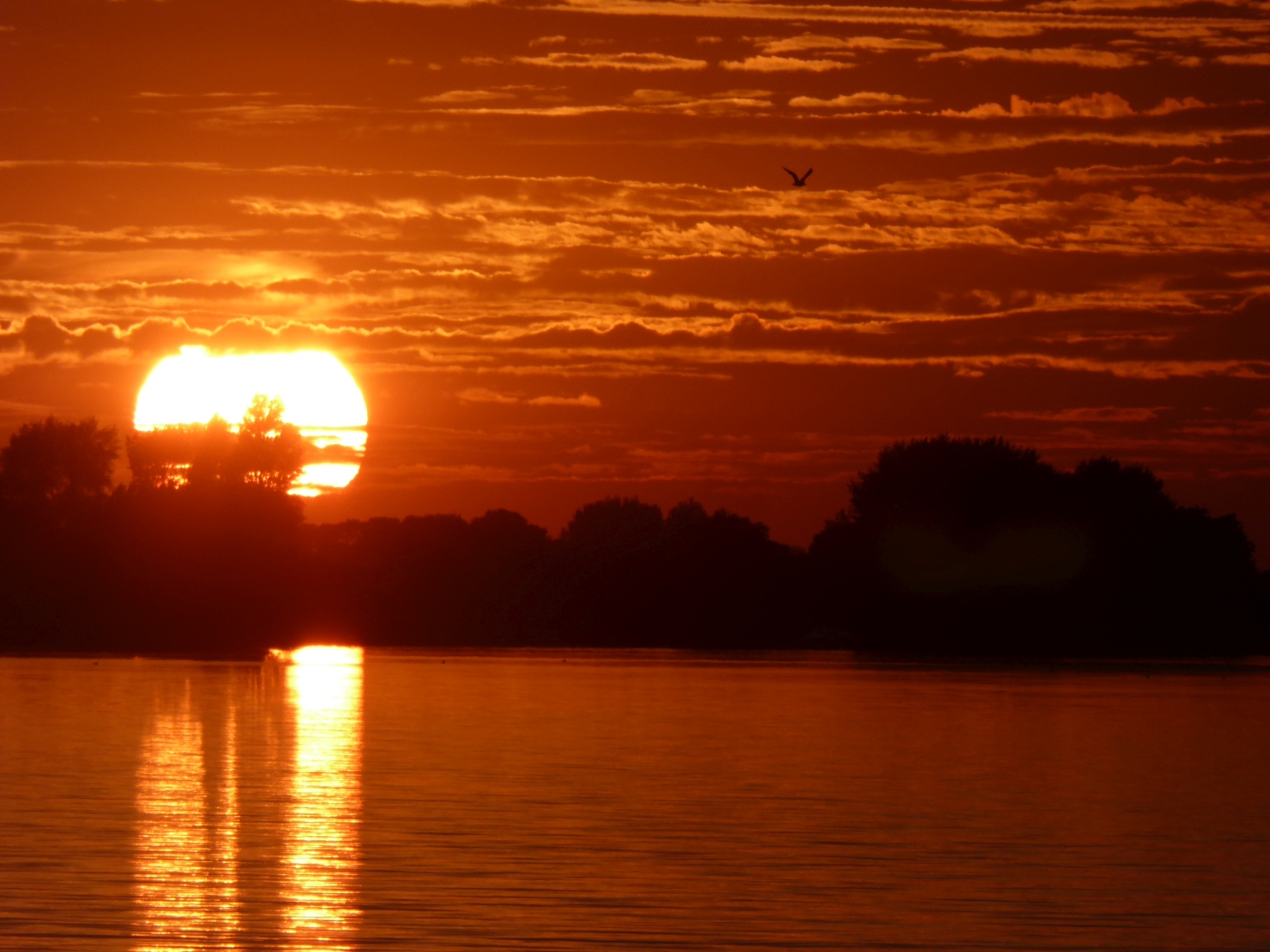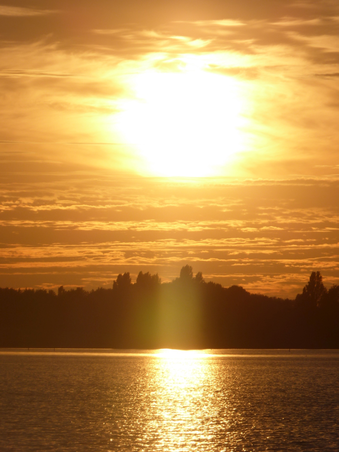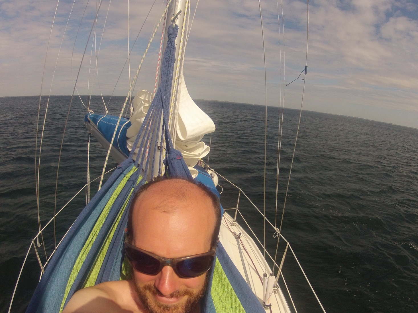 Beim Abendessen hängt ein Mückenschwarm über der Plicht. Mit WC-Duftspray lassen die sich etwas verscheuchen, aber nie für lang. Den Sonnenuntergang schaue ich mir überm Vorschiff in der Hängematte an. Dabei besucht mich noch kurz ein Schweinswal und taucht direkt unterm Bug hindurch. Anschließend flüchte ich vor den Mücken unter Deck.