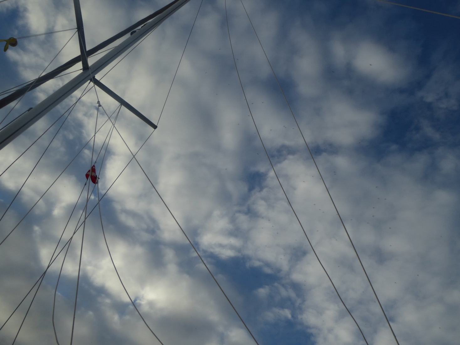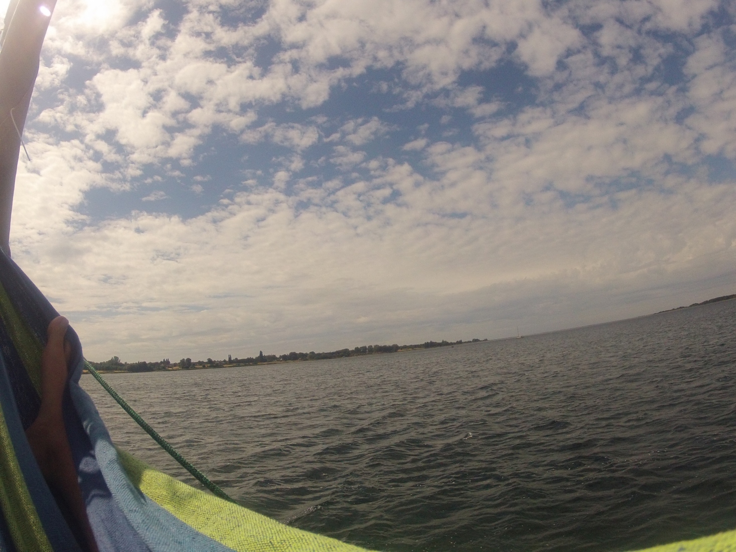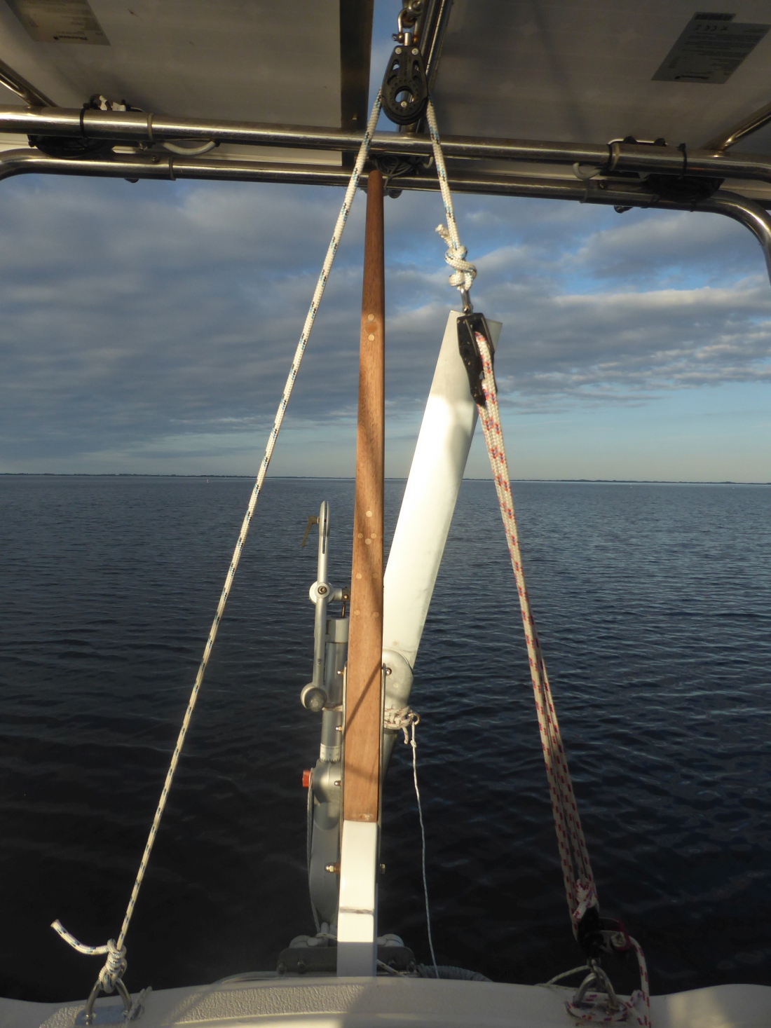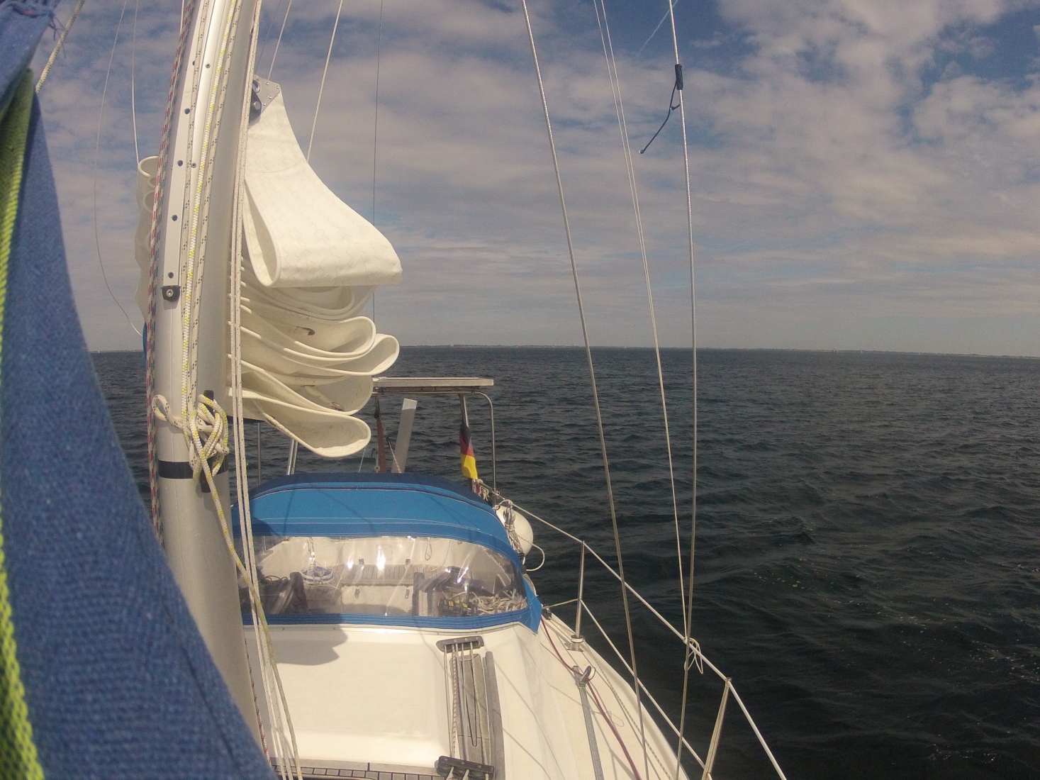 Es wehr etwas mehr als erwartet. Ungerefft und mit der Genua ist es eigentlich etwas viel für die Windpilot. Zumindest hoch am Wind. Als ich auf Halbwind abfalle muss ich nicht mehr so oft nachstellen um den Kurs zu halten. Nichtsdestotrotz muss ich die Flaggenleinen, mit denen die Umlenkblöcke befestigt sind, und die Steuerleine zur Pinne noch durch etwas reckarmeres ersetzen.
