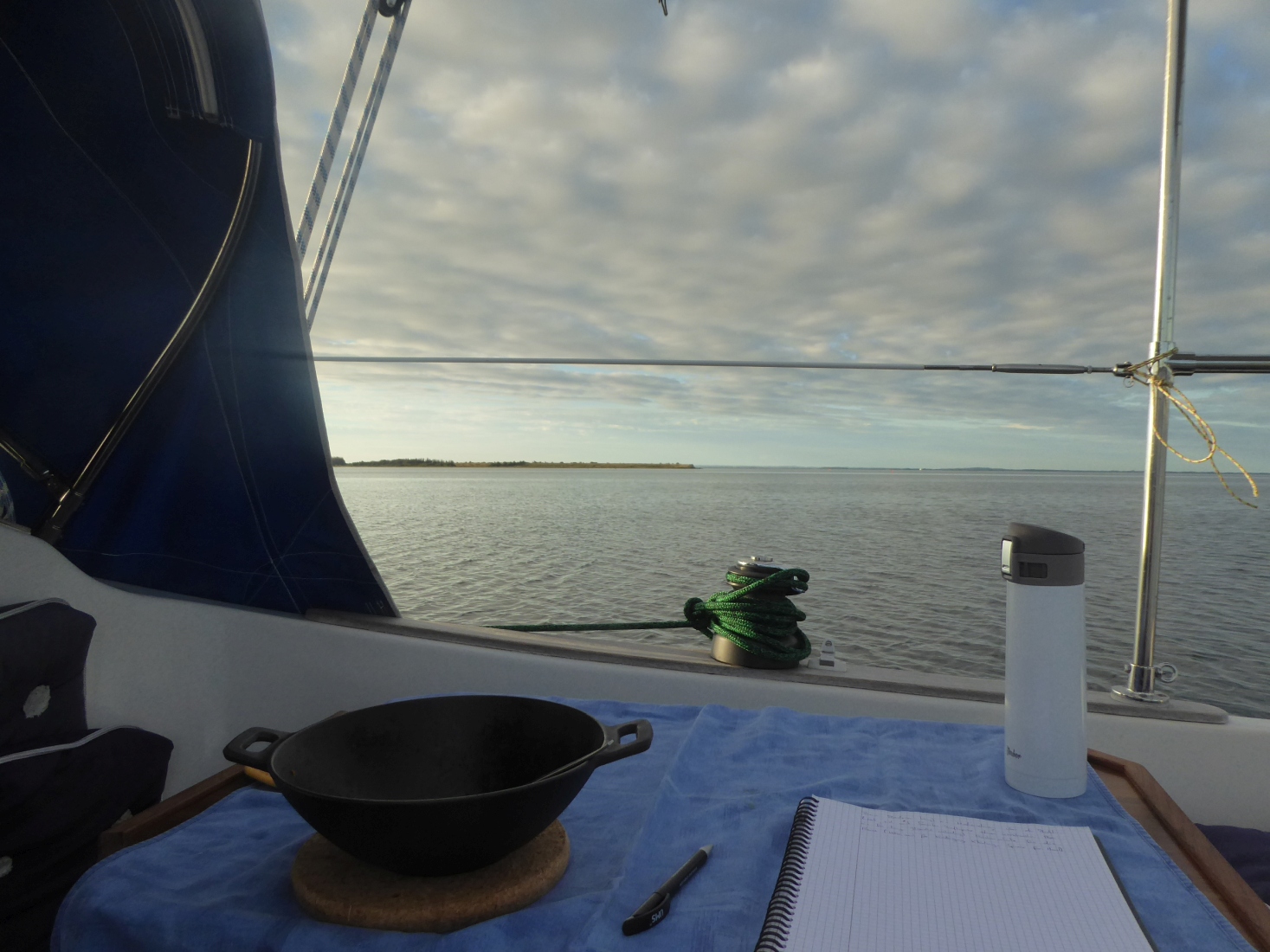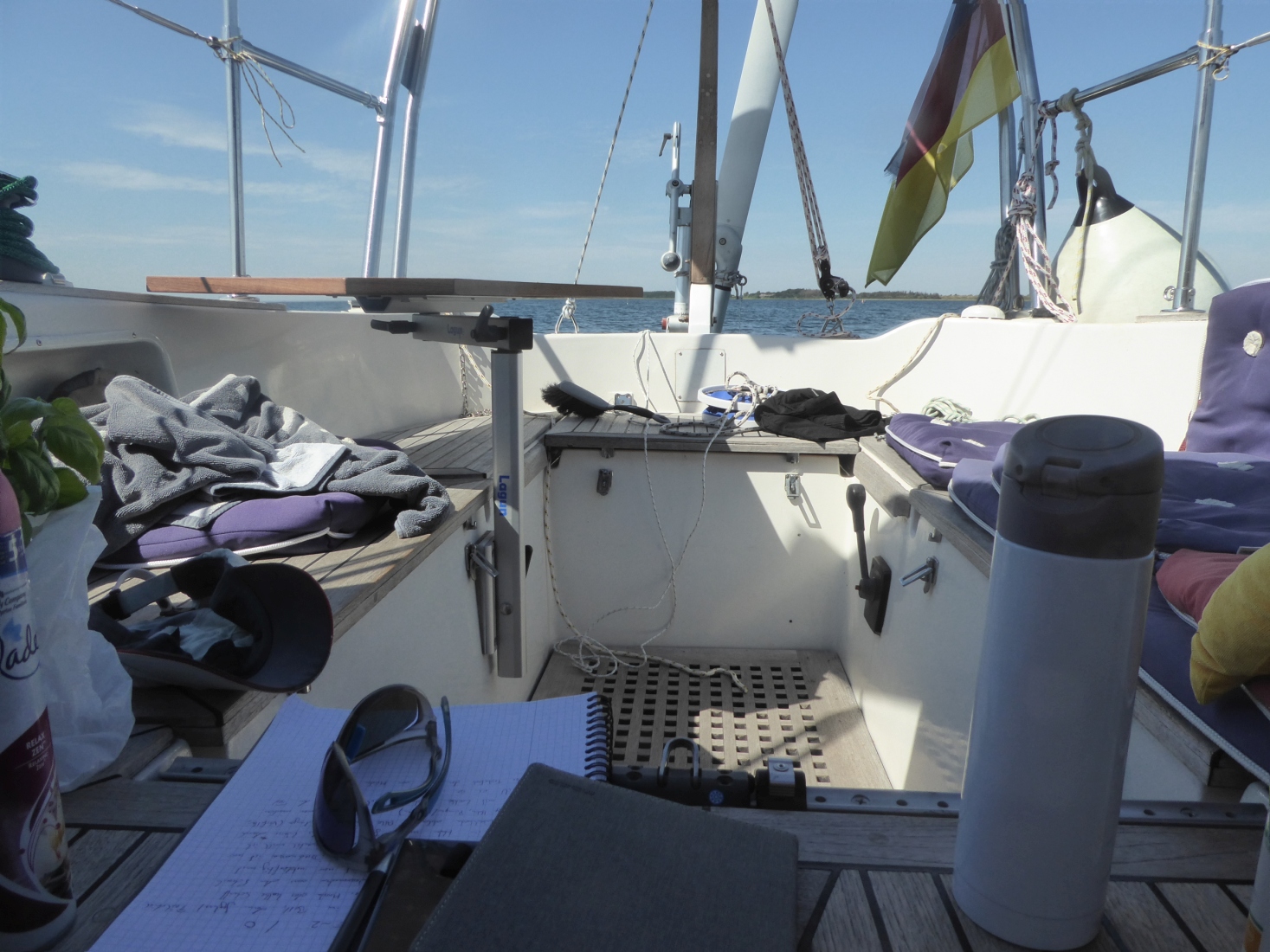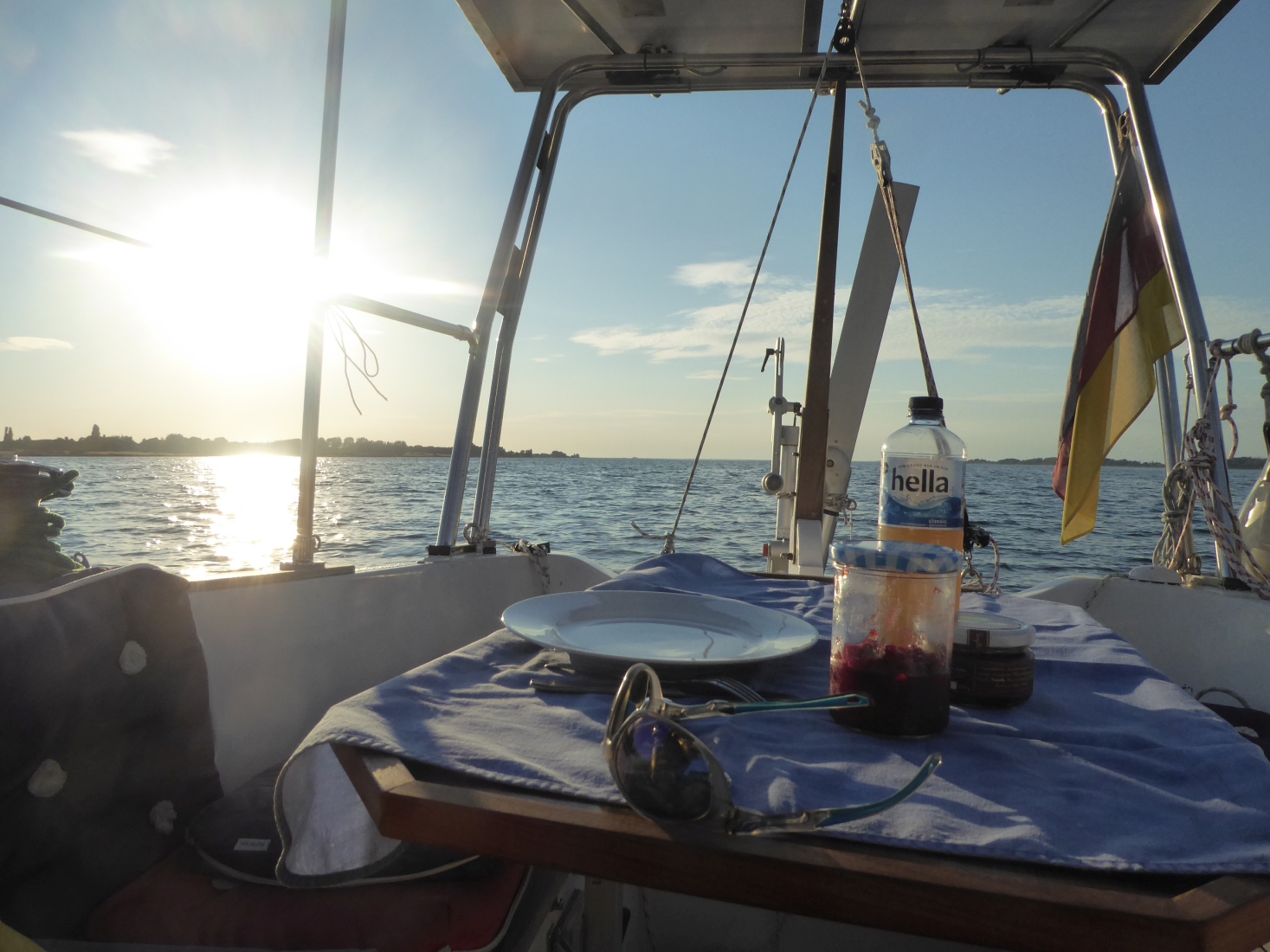 Kurz vor sieben bin ich wach. Lese noch kurz im Bett, dann befreie ich das Cockpit von lebenden und toten Mücken sowie zum Bersten vollen Spinnennetzen und frühstücke schließlich dänischen Joghurt im Cockpit.