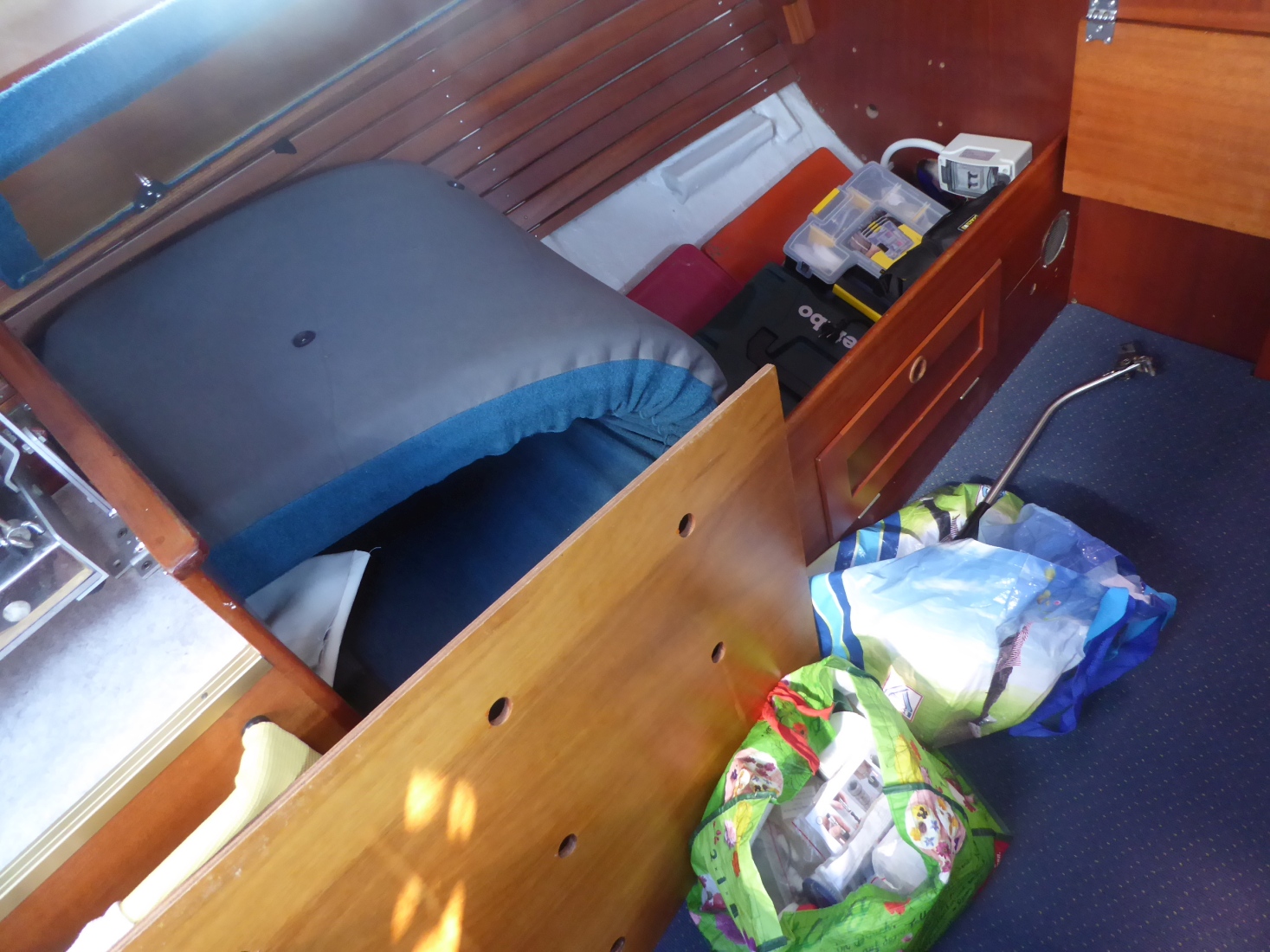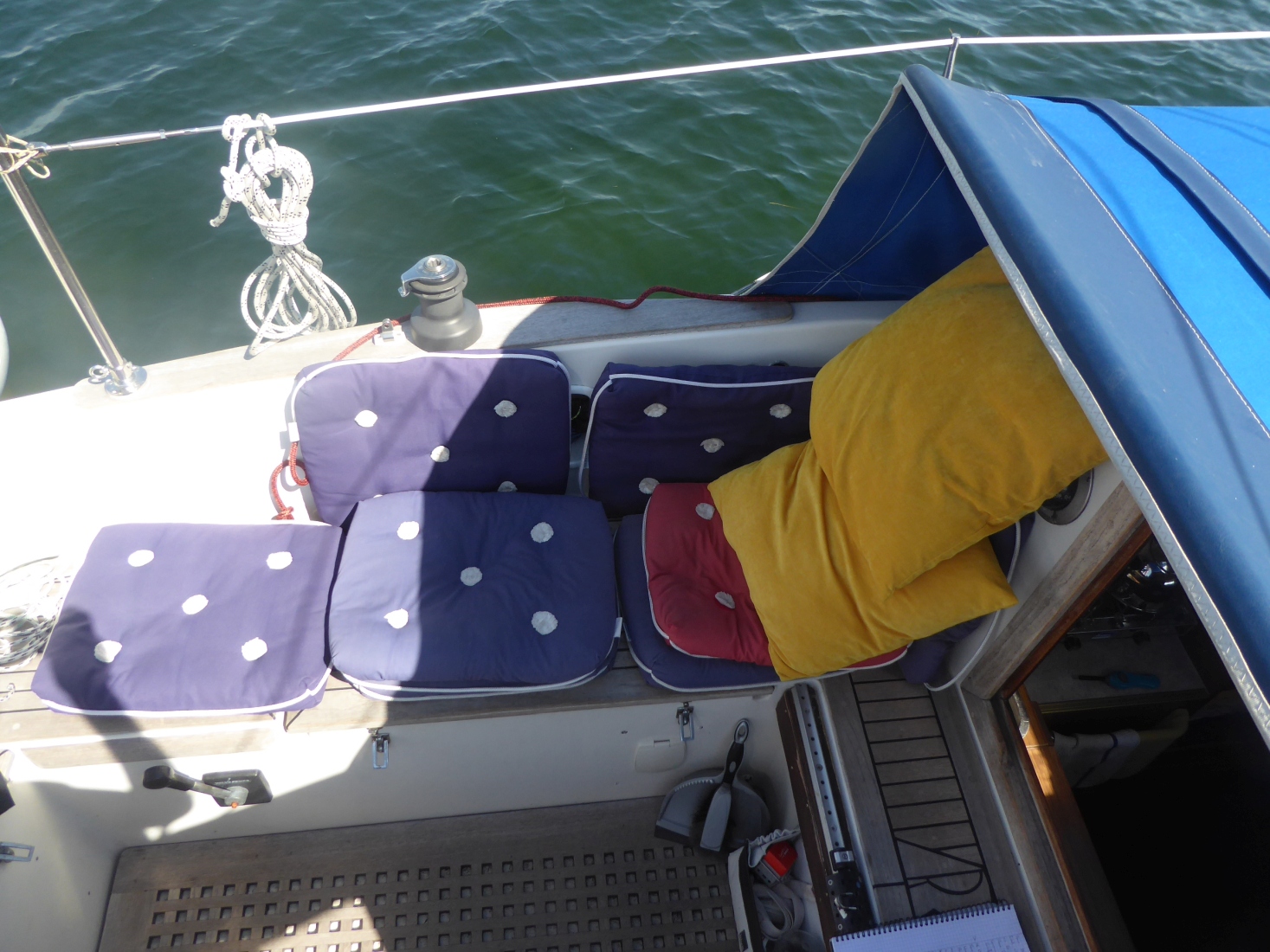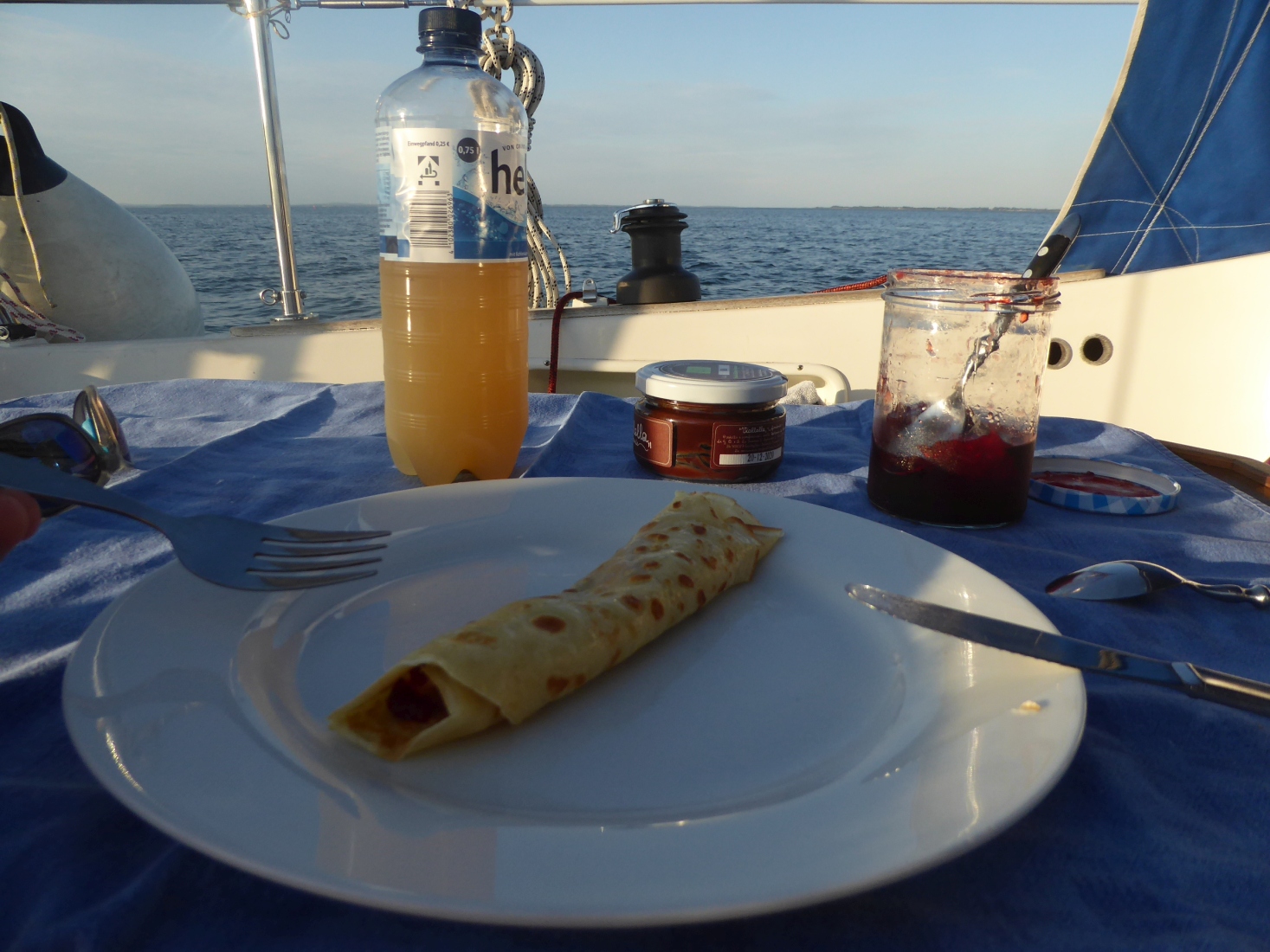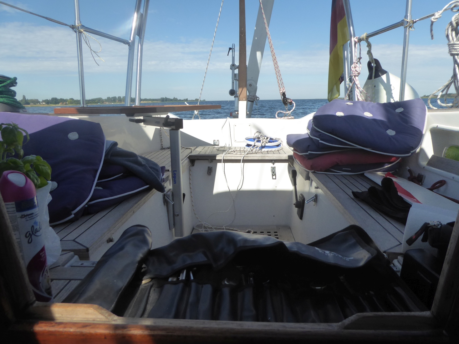 Kurz vor sieben bin ich wach. Lese noch kurz im Bett, dann befreie ich das Cockpit von lebenden und toten Mücken sowie zum Bersten vollen Spinnennetzen und frühstücke schließlich dänischen Joghurt im Cockpit.
