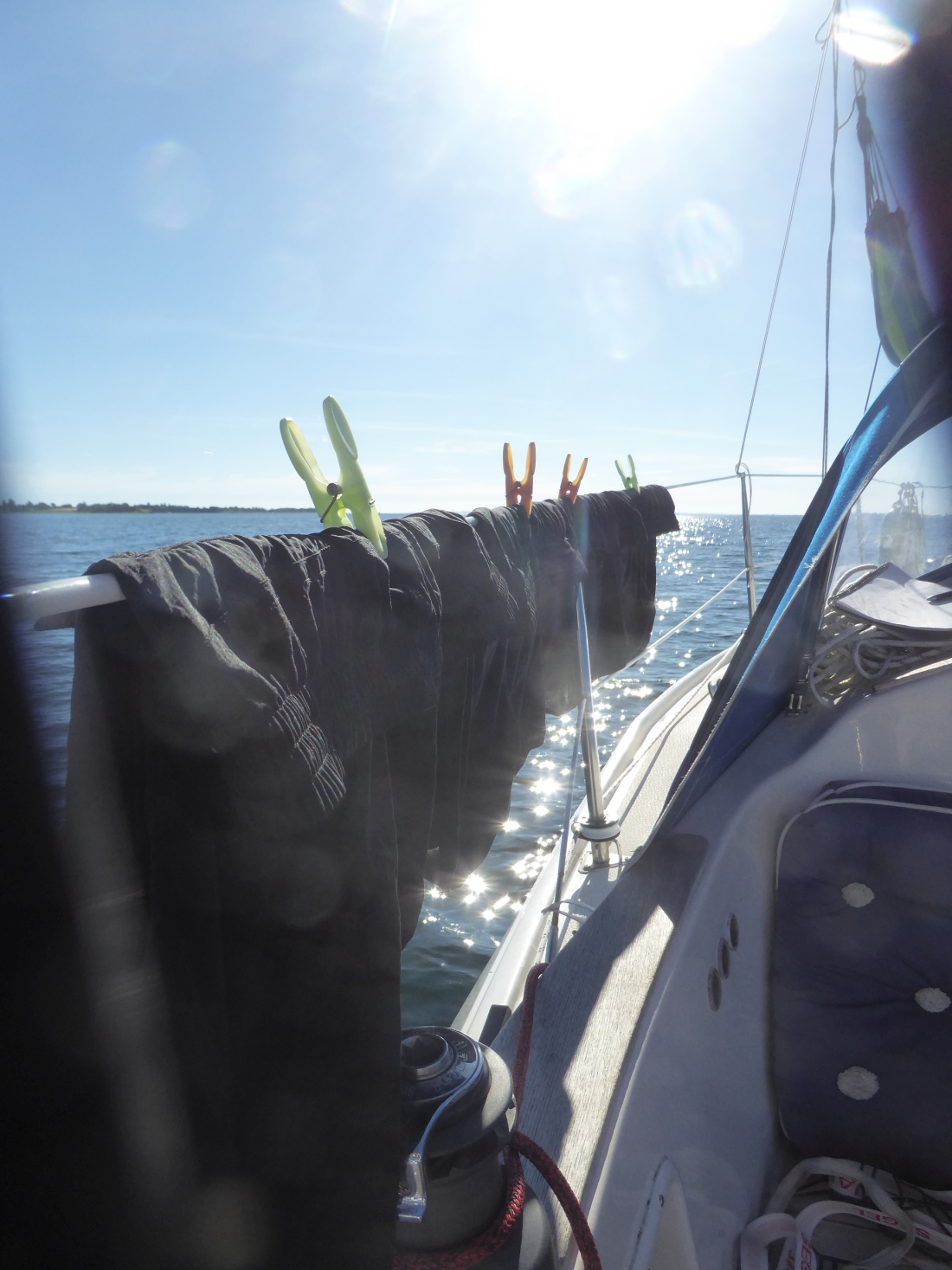 Während der Fahrt durchs Lindelse Nor nehme ich die Fock runter. Für die nächsten Tage ist weiterhin weniger Wind angekündigt und wenn der morgen tatsächlich aus Ost weht kann ich die große Genua gut gebrauchen um Strecke nach Westen zu machen. Die Wettervorhersage macht außerdem Hoffnung auf angenehmere Bedingungen. Das erste Mal im ganzen Urlaub sollen die Temperaturen auf 20 Grad steigen!