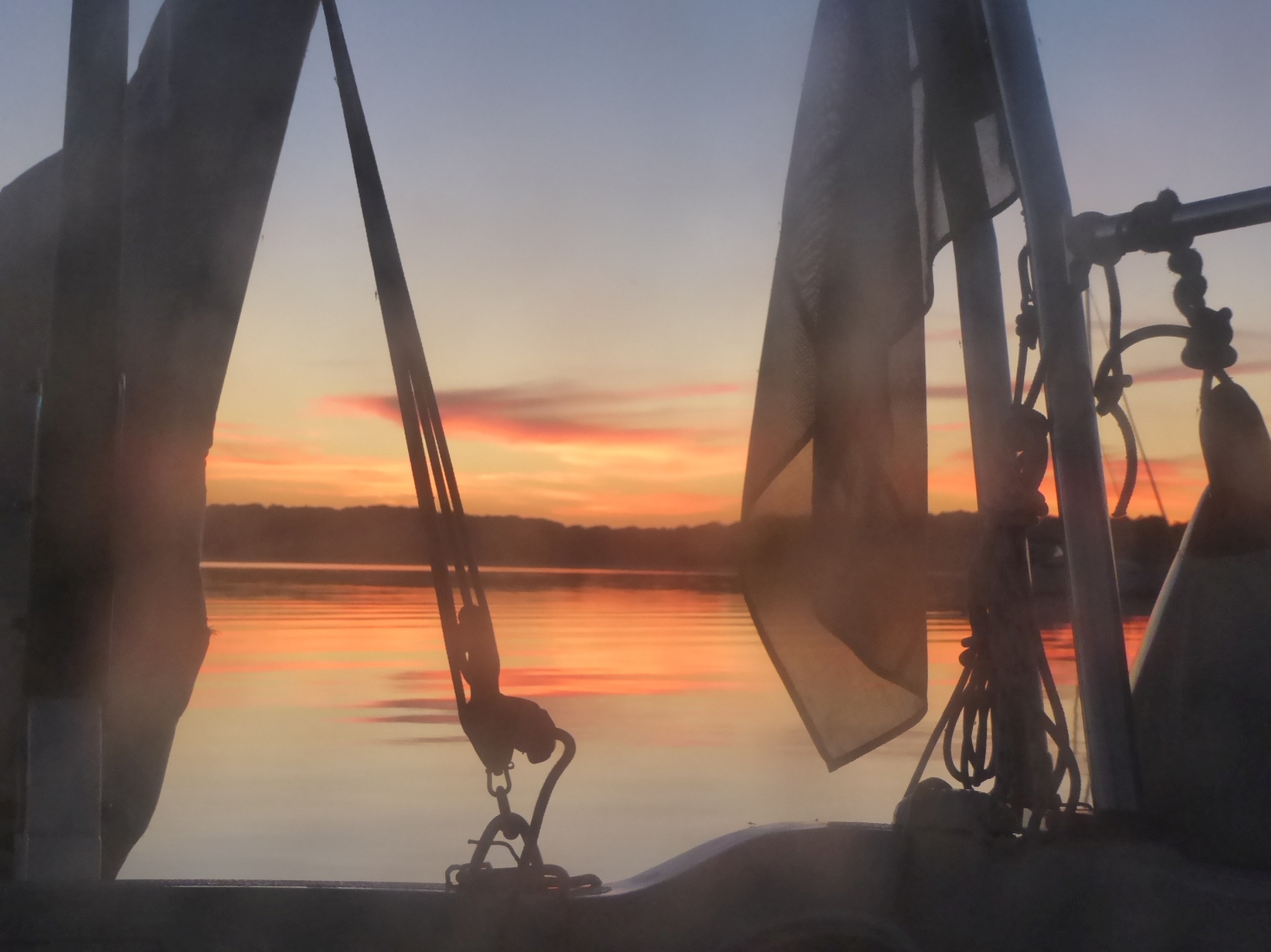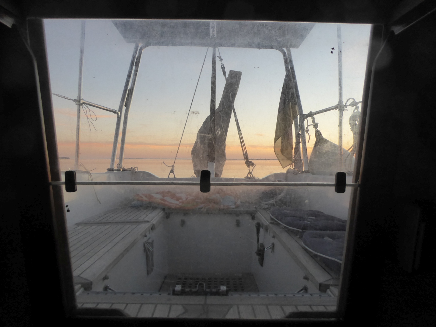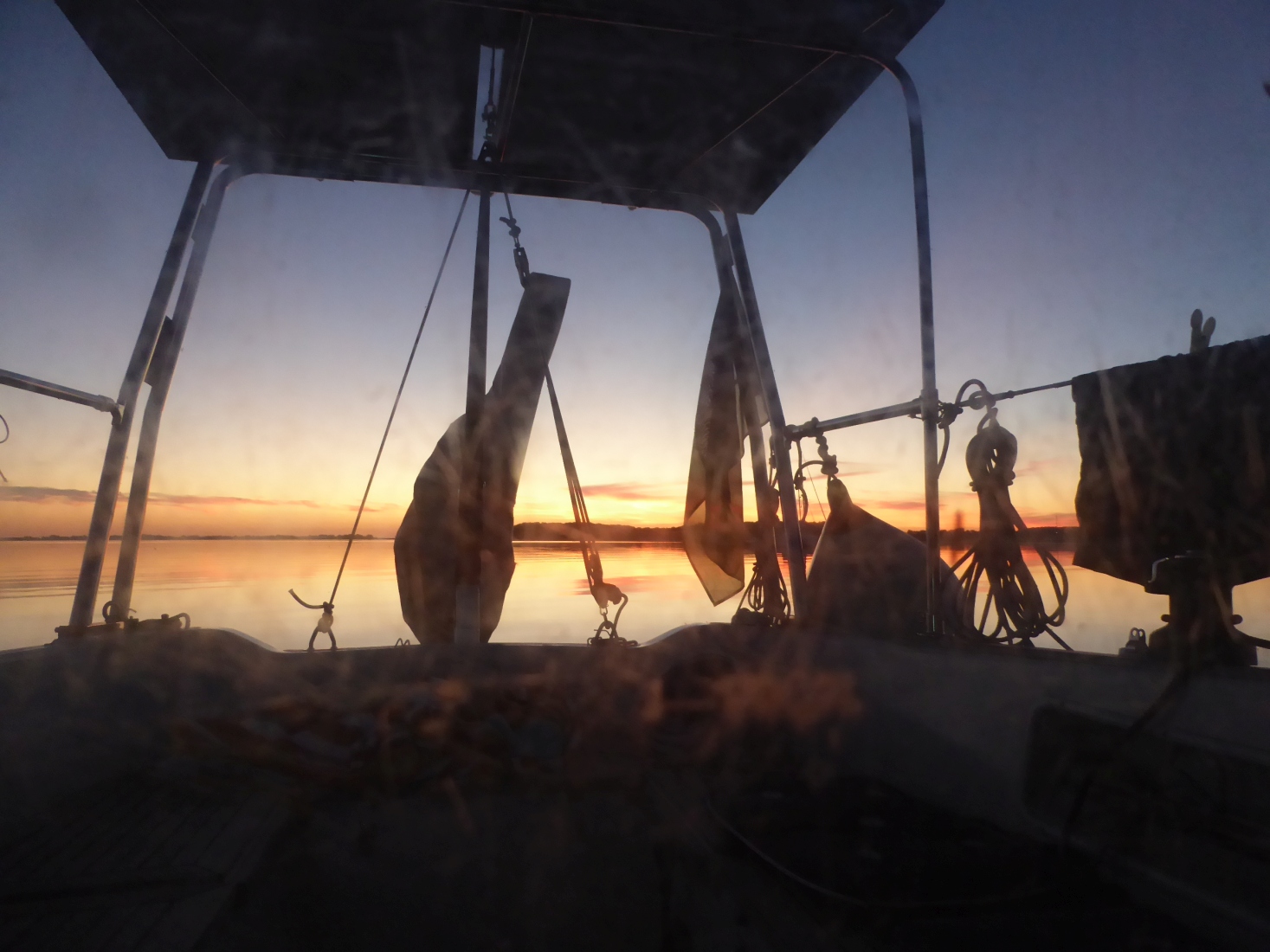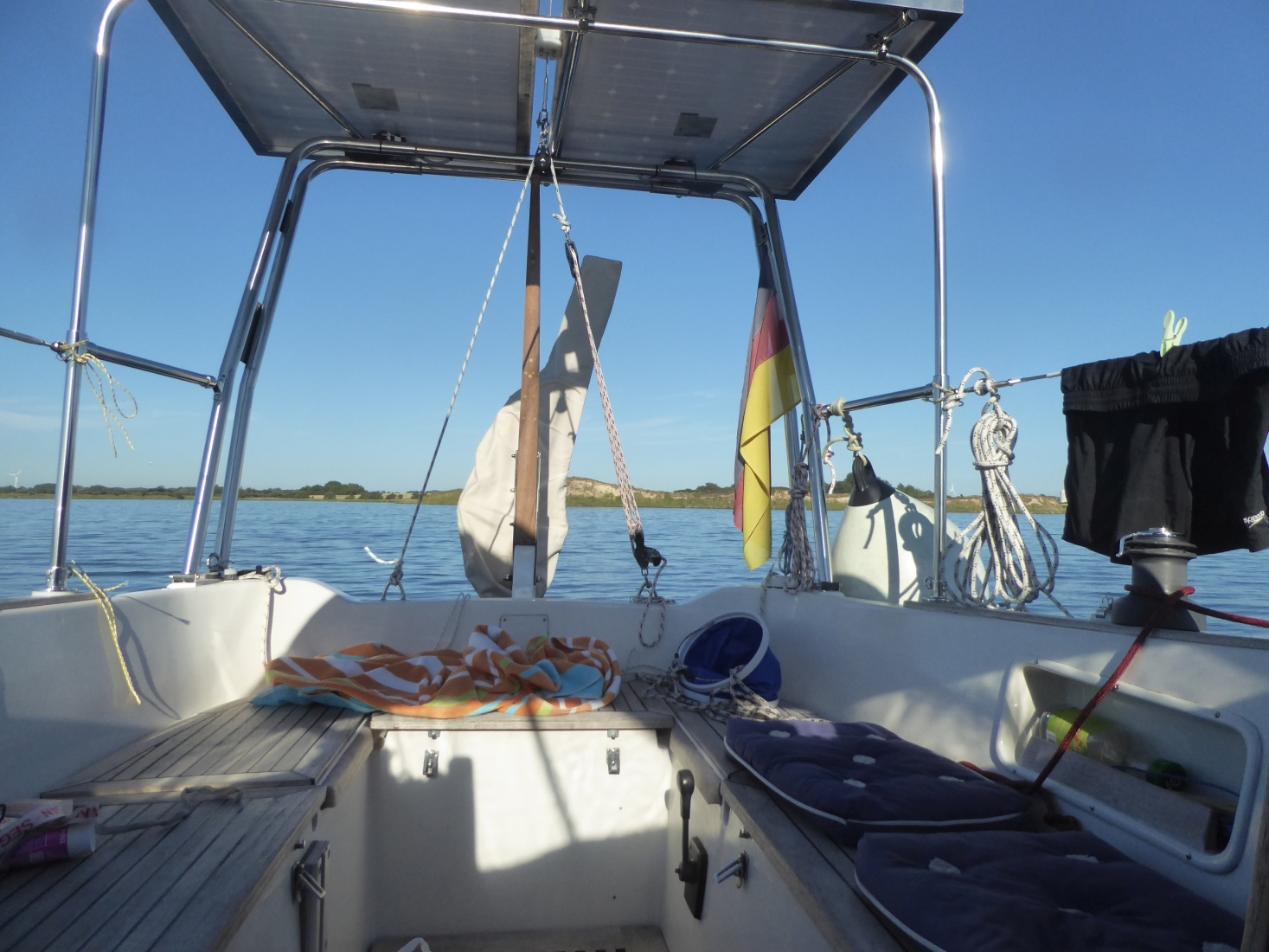 Beim Abendessenkochen fällt ein Mückenschwarm über der Plicht ein. Obwohl es endlich warm ist und die Abendsonne ins Cockpit scheint, verschließe ich den Niedergang und esse mal wieder im Salon.
