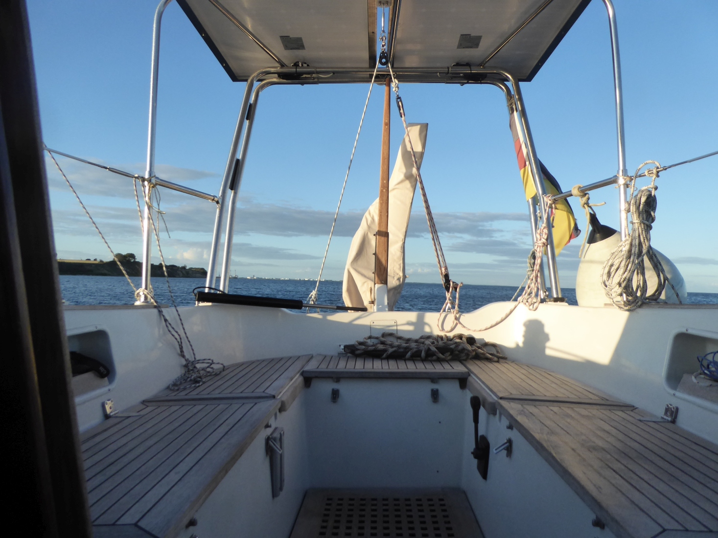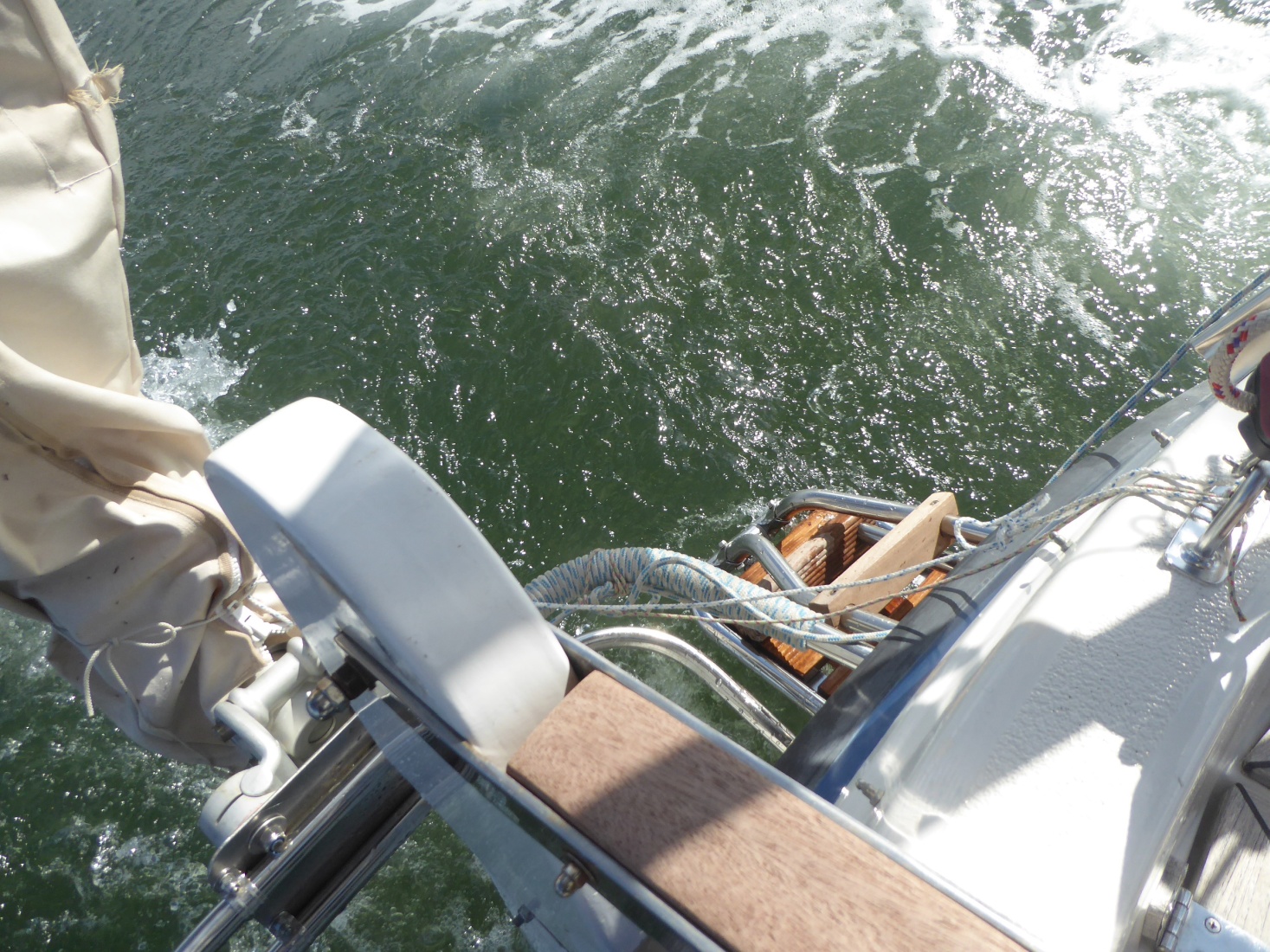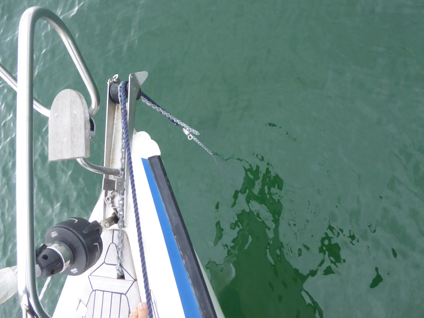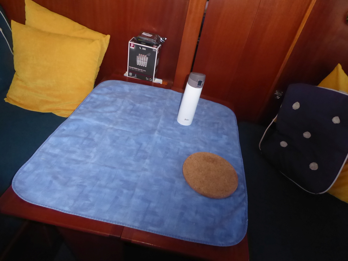 Nach dem Aufklaren an Deck stelle ich fest, dass der Teppich im Vorschiff in Lee nass ist. Süßwasser. Dass der Frischwassertank noch immer nicht richtig dicht ist wusse ich schon, weil beim Füllen wieder etwas übergelaufen und in der Bilge gelandet ist. Aber beim Segeln ist sonst nichts ausgelaufen... Aus dem Wasserhahn im Vorschiff muss auch einiges herausgedrückt worden sein. Das Badelaken, das im Waschbecken lag ist pitschenass.