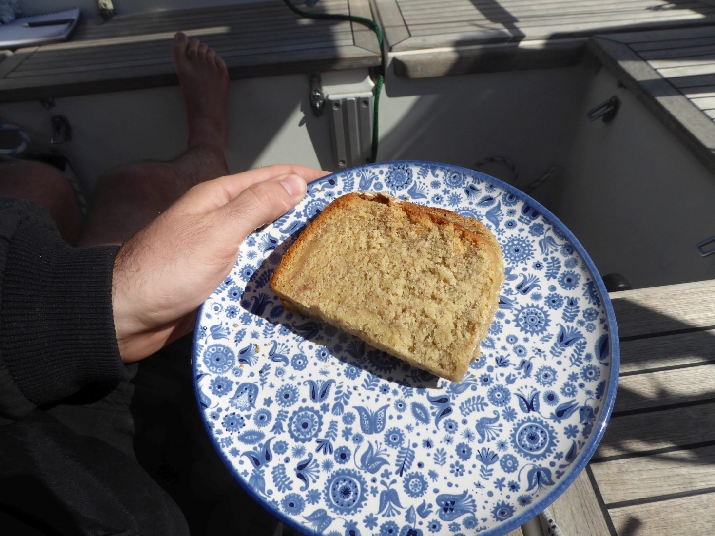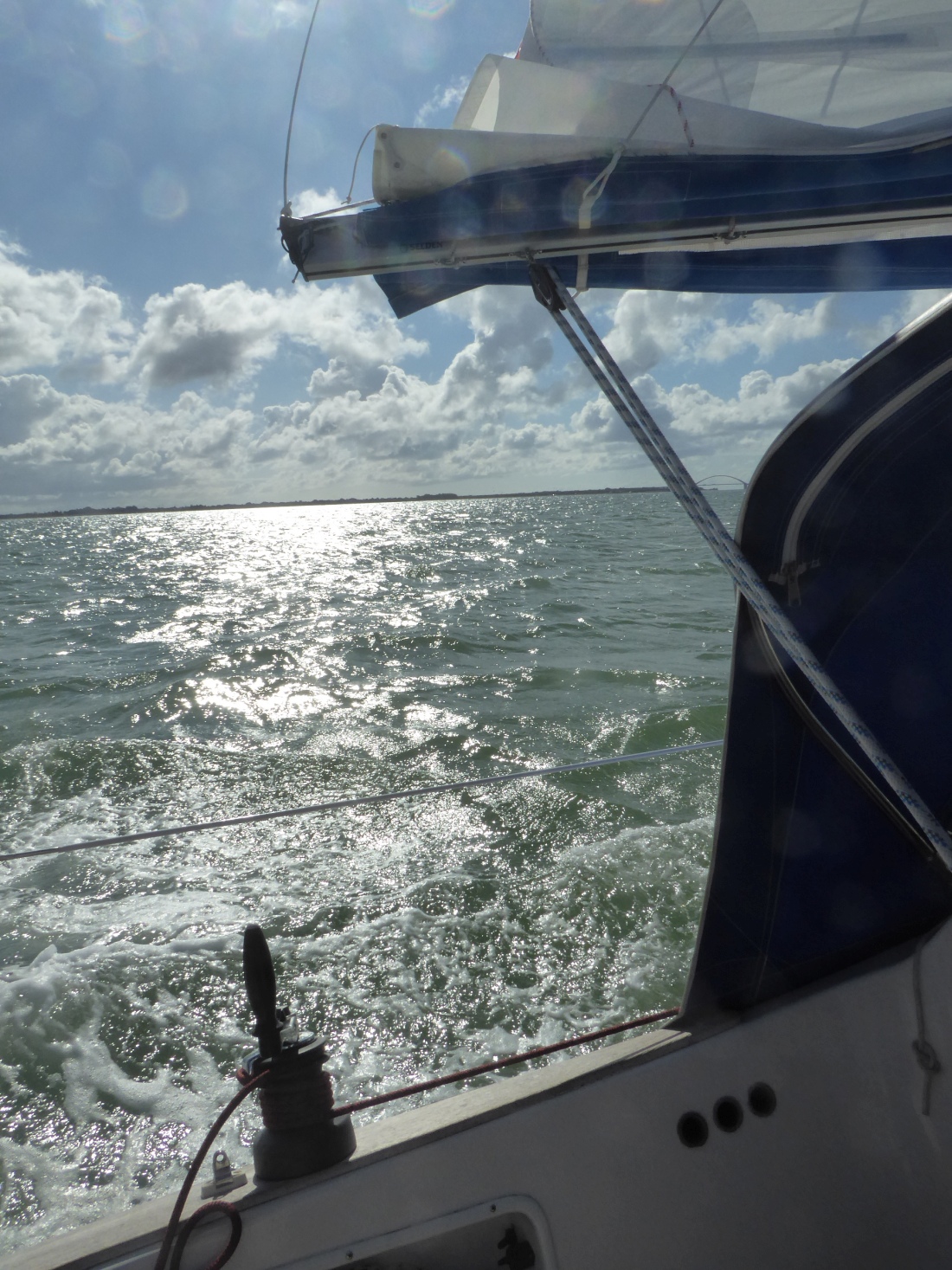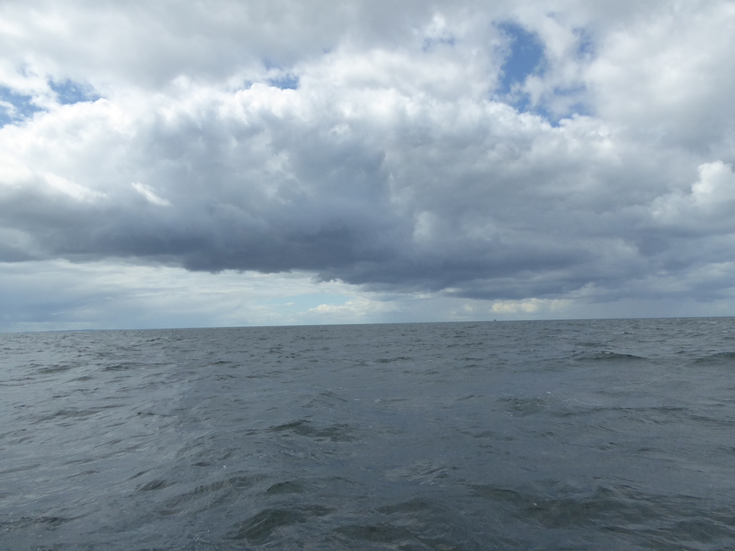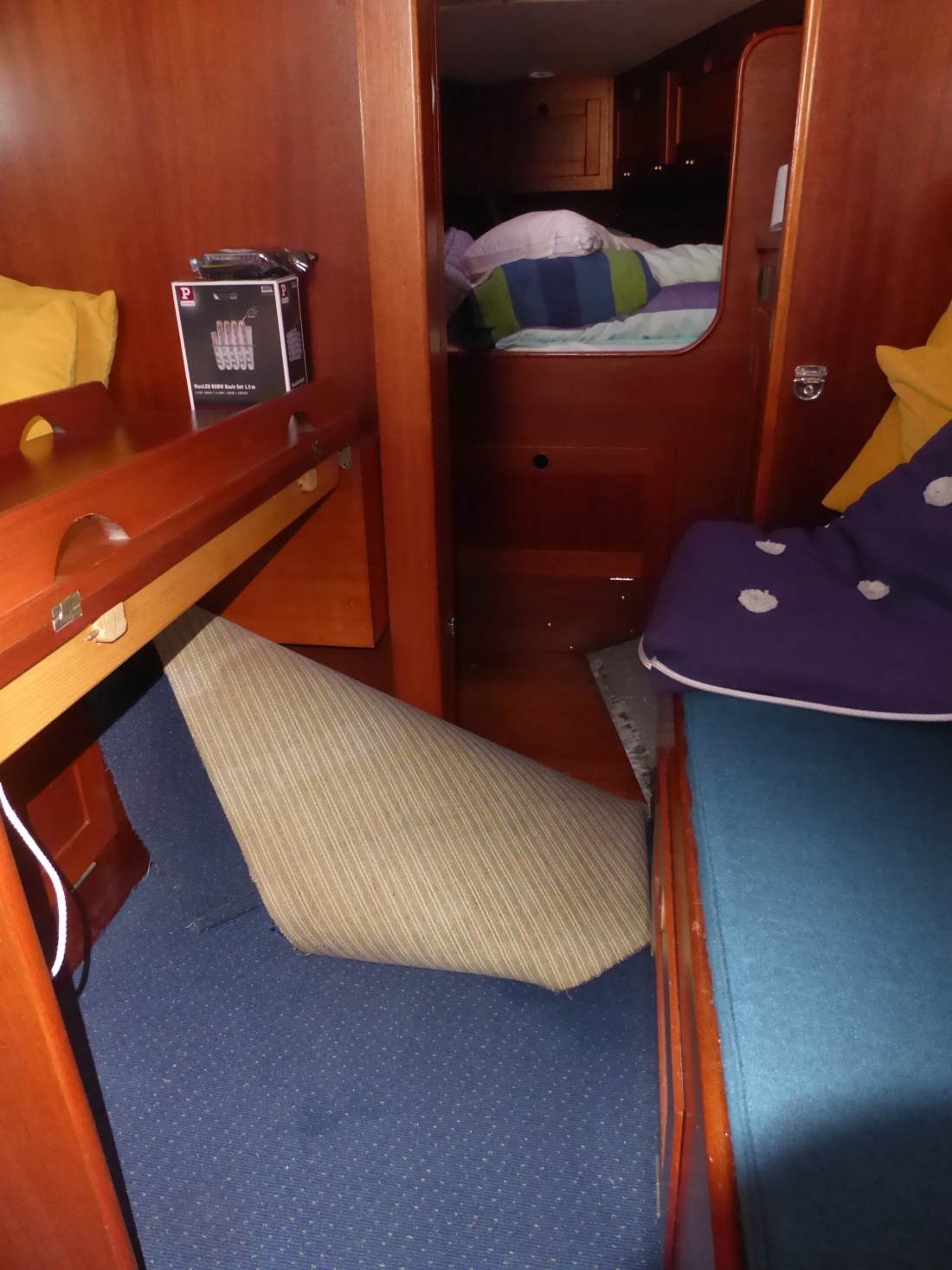 Nach dem Aufklaren an Deck stelle ich fest, dass der Teppich im Vorschiff in Lee nass ist. Süßwasser. Dass der Frischwassertank noch immer nicht richtig dicht ist wusse ich schon, weil beim Füllen wieder etwas übergelaufen und in der Bilge gelandet ist. Aber beim Segeln ist sonst nichts ausgelaufen... Aus dem Wasserhahn im Vorschiff muss auch einiges herausgedrückt worden sein. Das Badelaken, das im Waschbecken lag ist pitschenass.