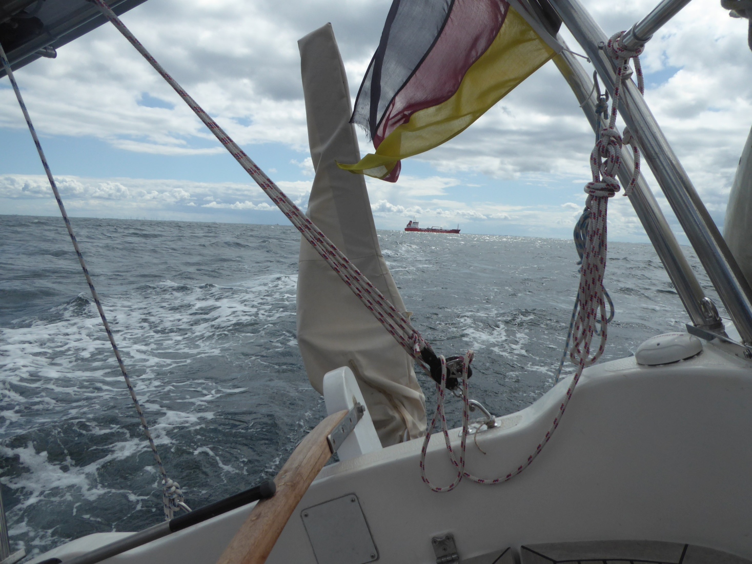 Am Kiel-Ostsee-Weg wird es aufregend. Es ist wohl gerade Rush Hour. Aus beiden Richtungen kommen ohne Ende Frachter mit nur kleinen Lücken, durch die ich es alleine mit dem Segel nicht schnell genug hindurch schaffe. Zwanzig Minuten lang lasse ich den Motor mitlaufen um etwas Höhe und Geschwindigkeit zu gewinnen und unbeschadet zwischen den Riesen über die Schifffahrtsstraße zu huschen.