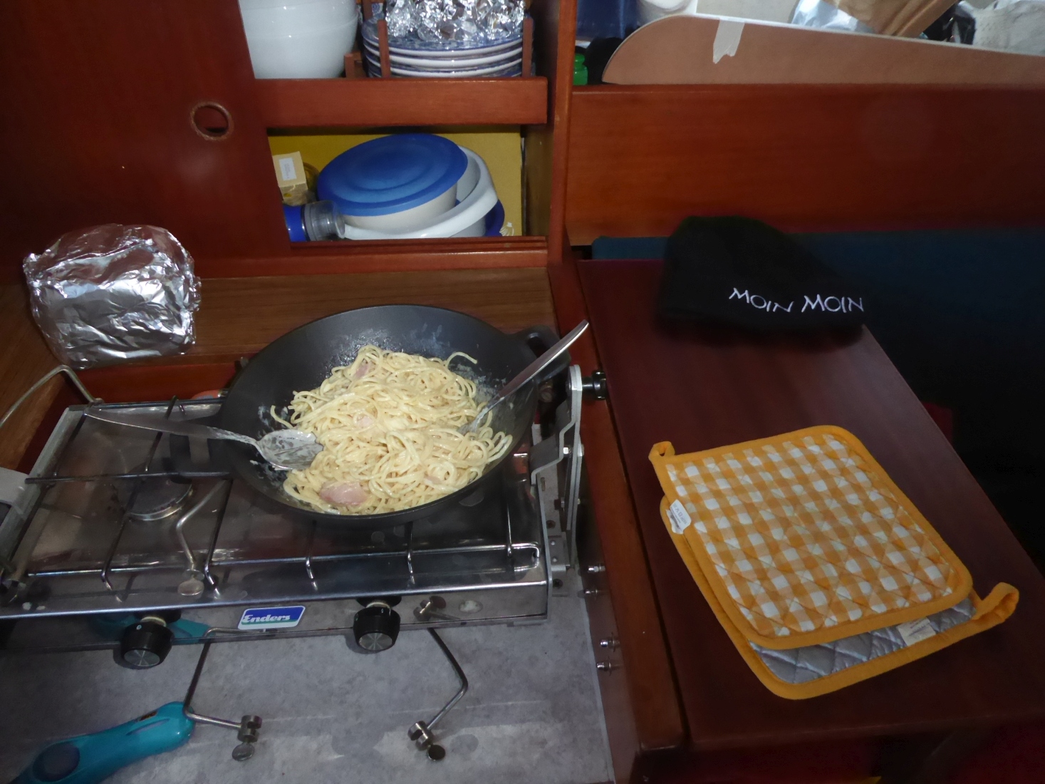 Ich mache mir nur noch Spaghetti mit Käsesoße im Wok warm (Reste von Freitagabend), dann geht es um halb zehn direkt in die Koje.
