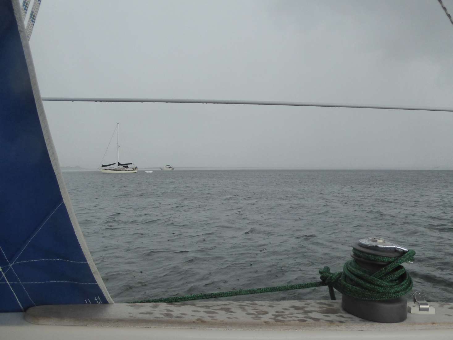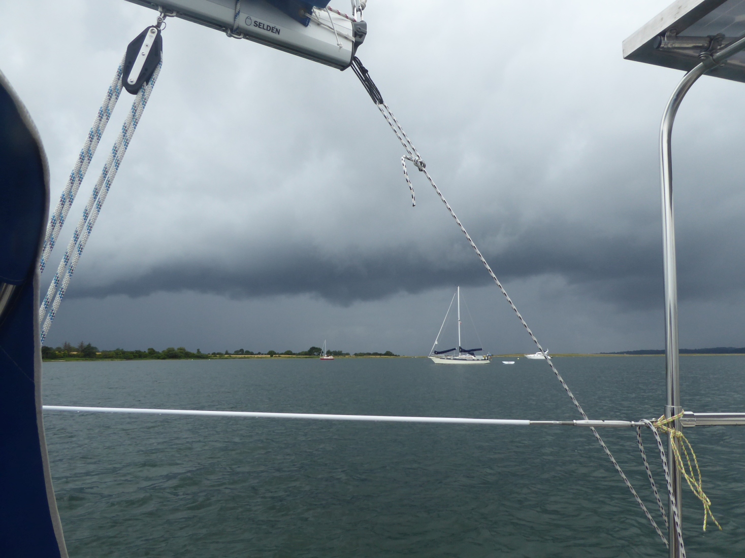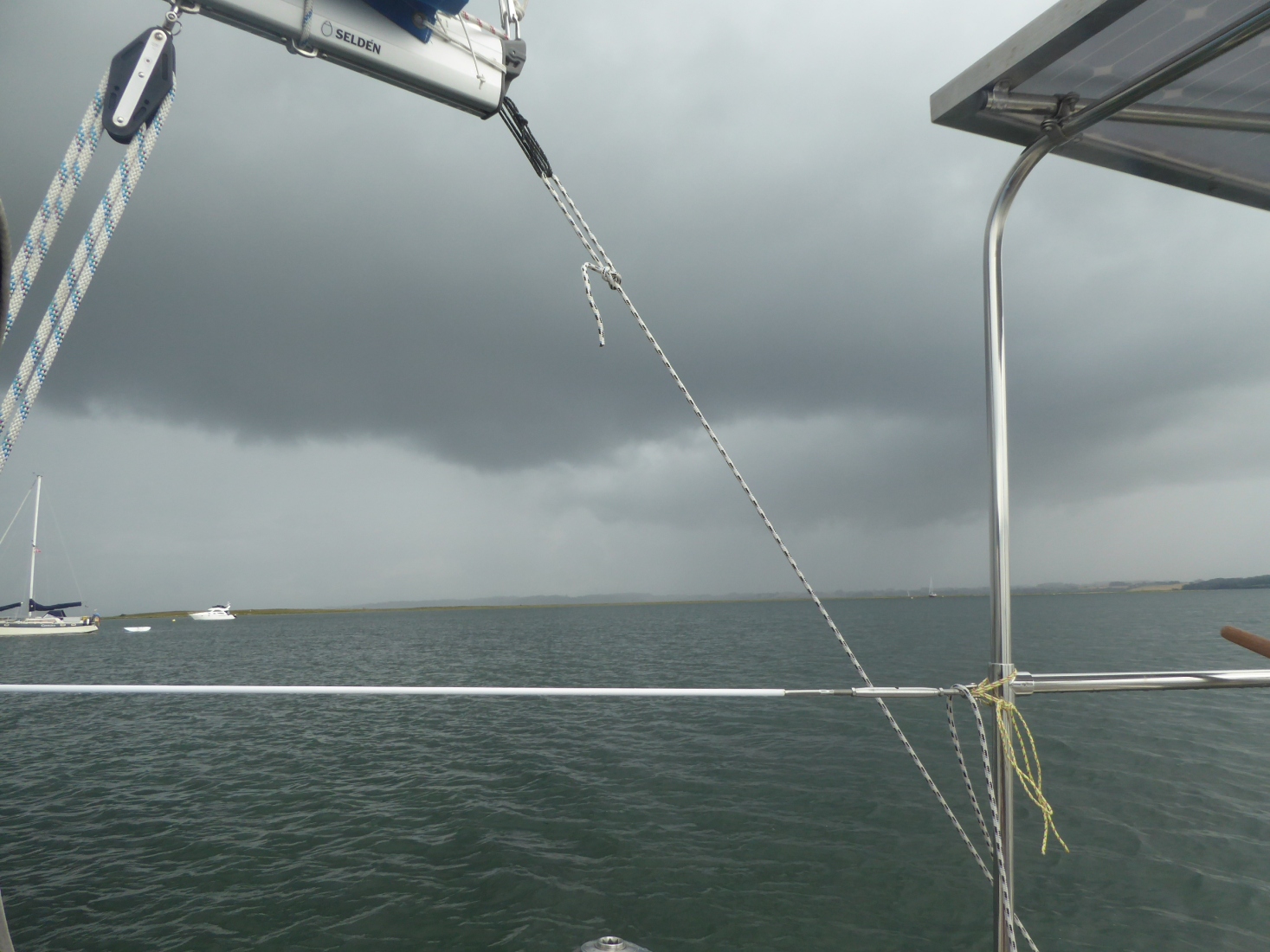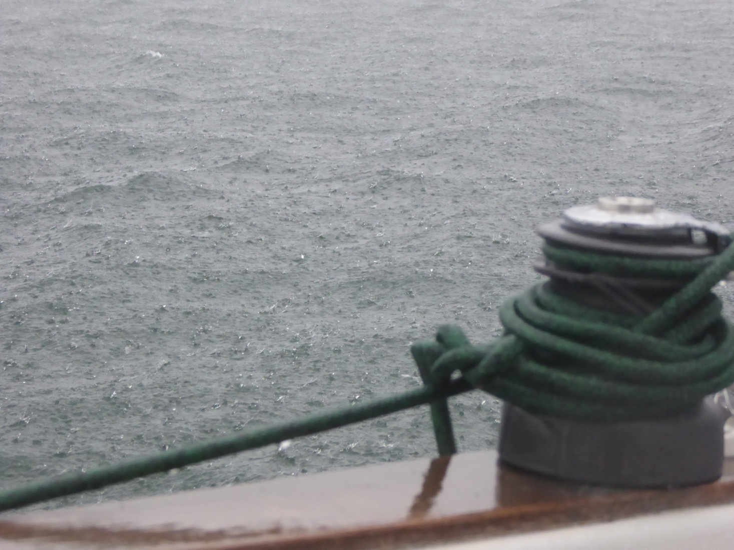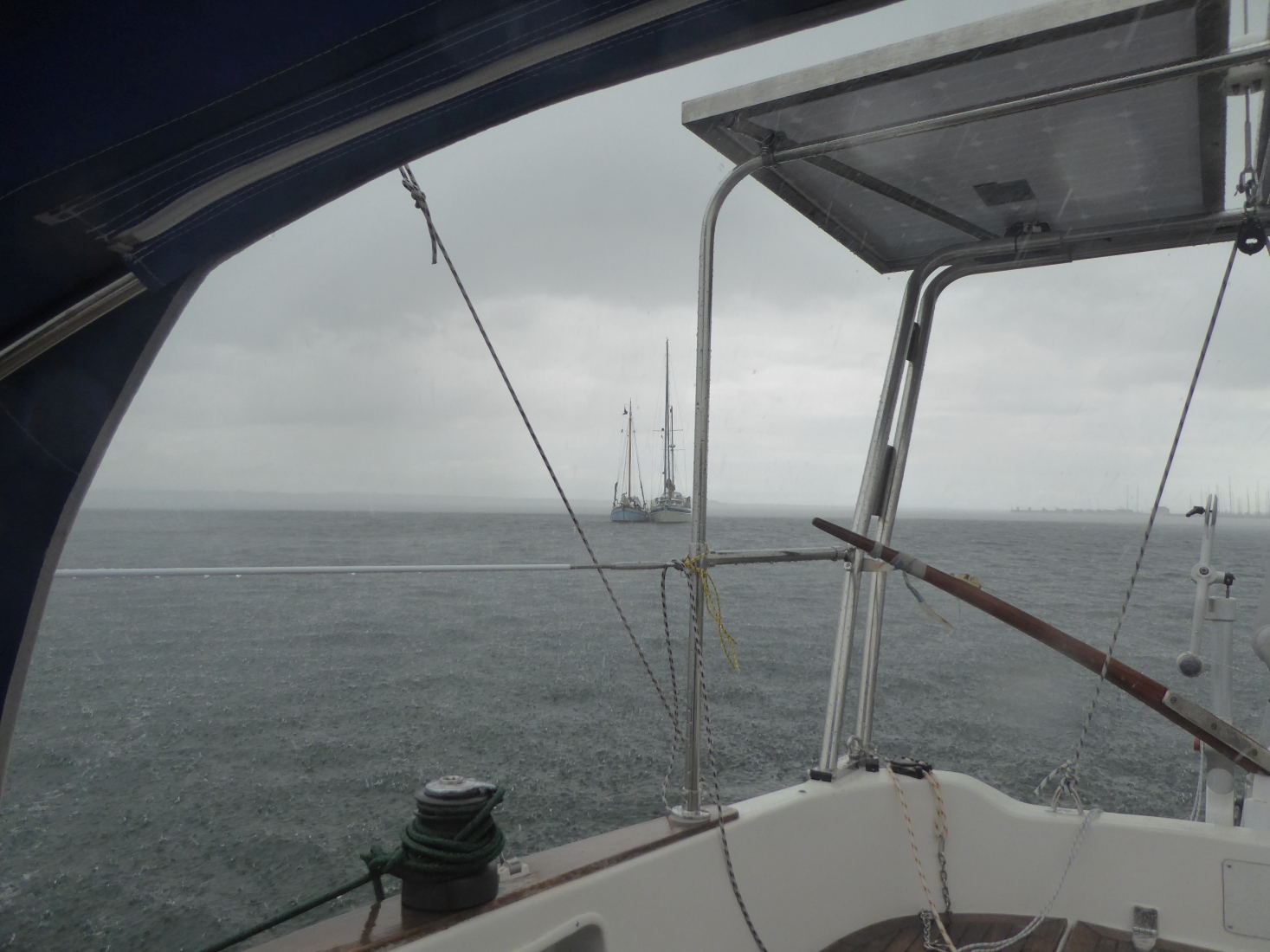 Bis Mittag nur Regen. Bleibe mit meinem Buch in der Koje. Um vierzehn Uhr für eine halbe Stunde Gewitter mit Platzregen und viel Wind aus West statt Süd. Später immer wieder kurze Schauer. Am Abend etwas Sonne.