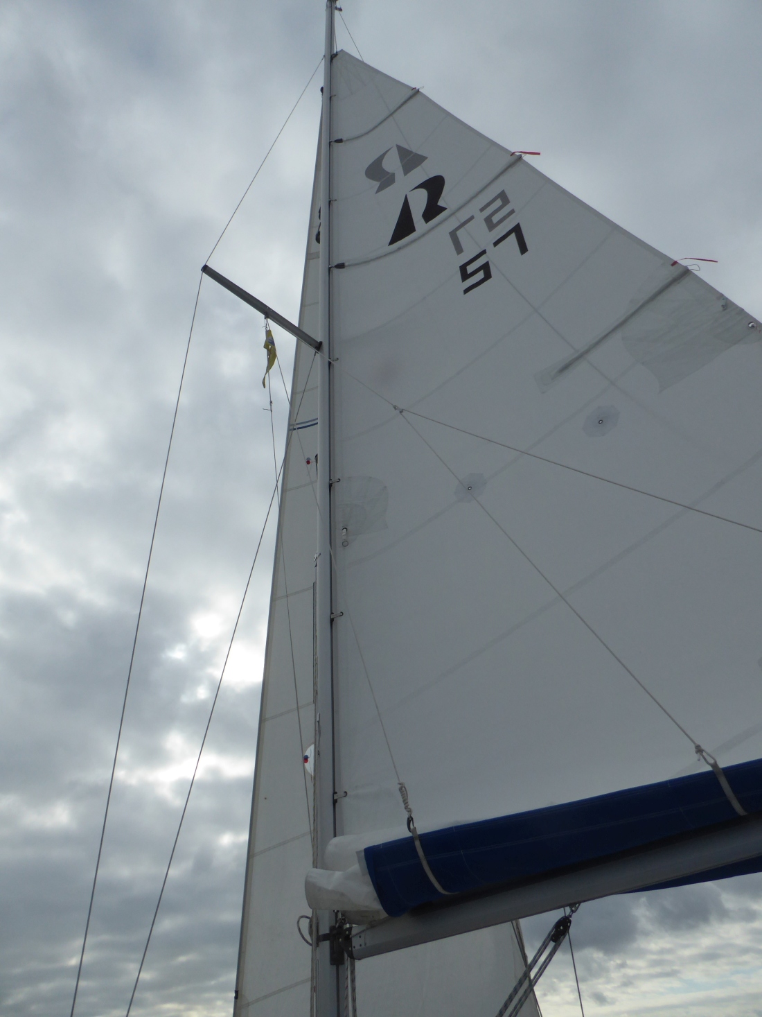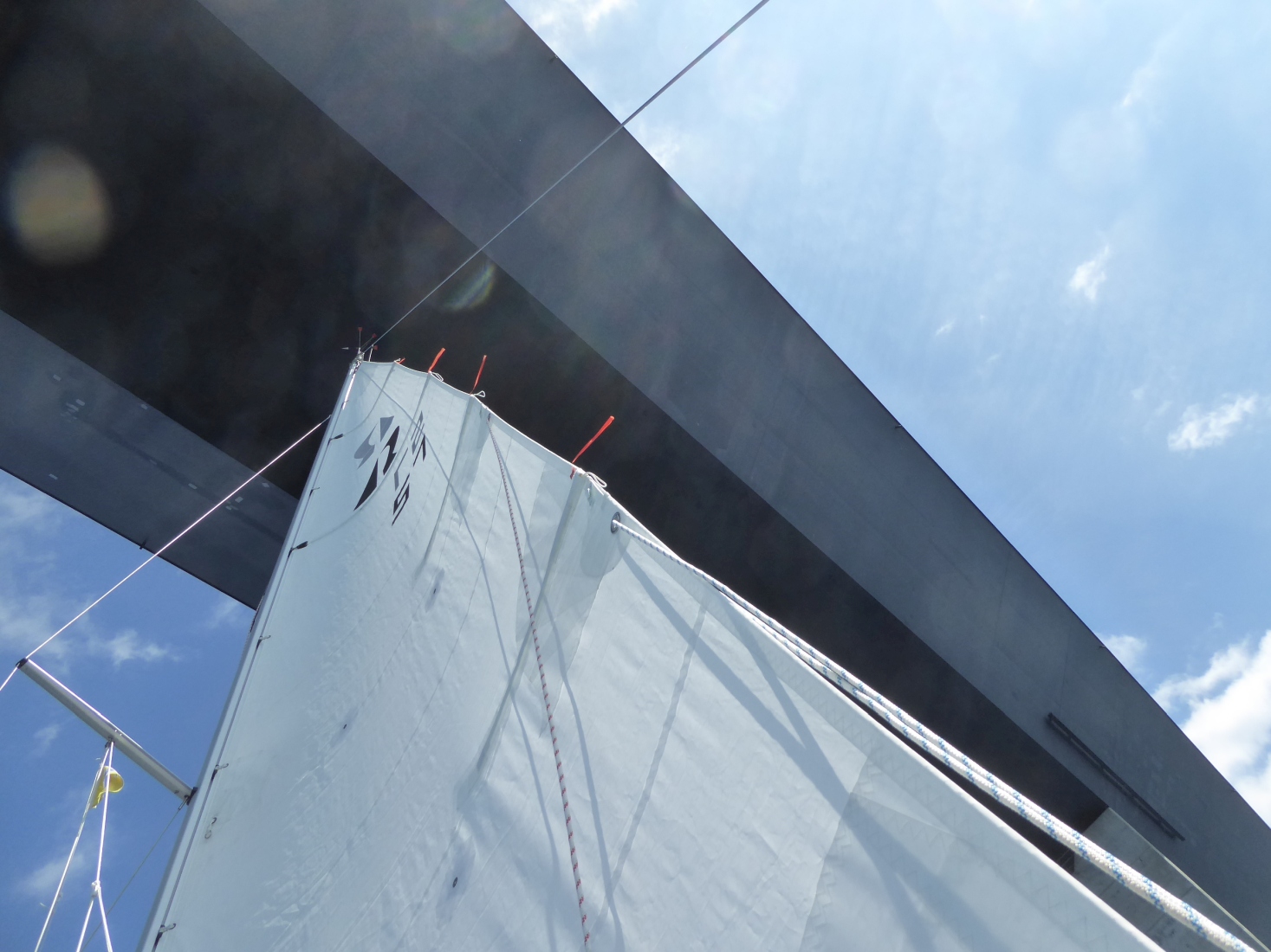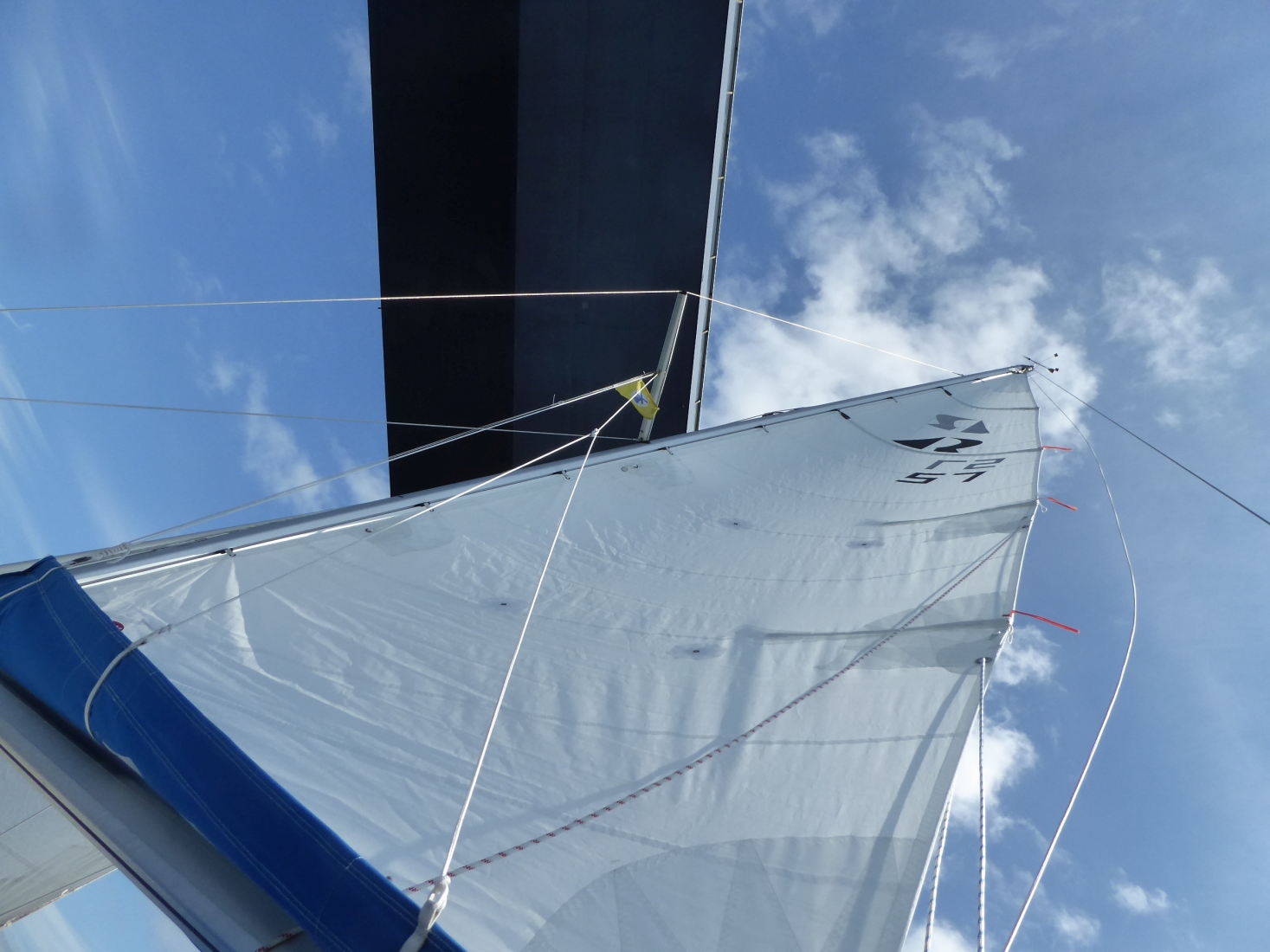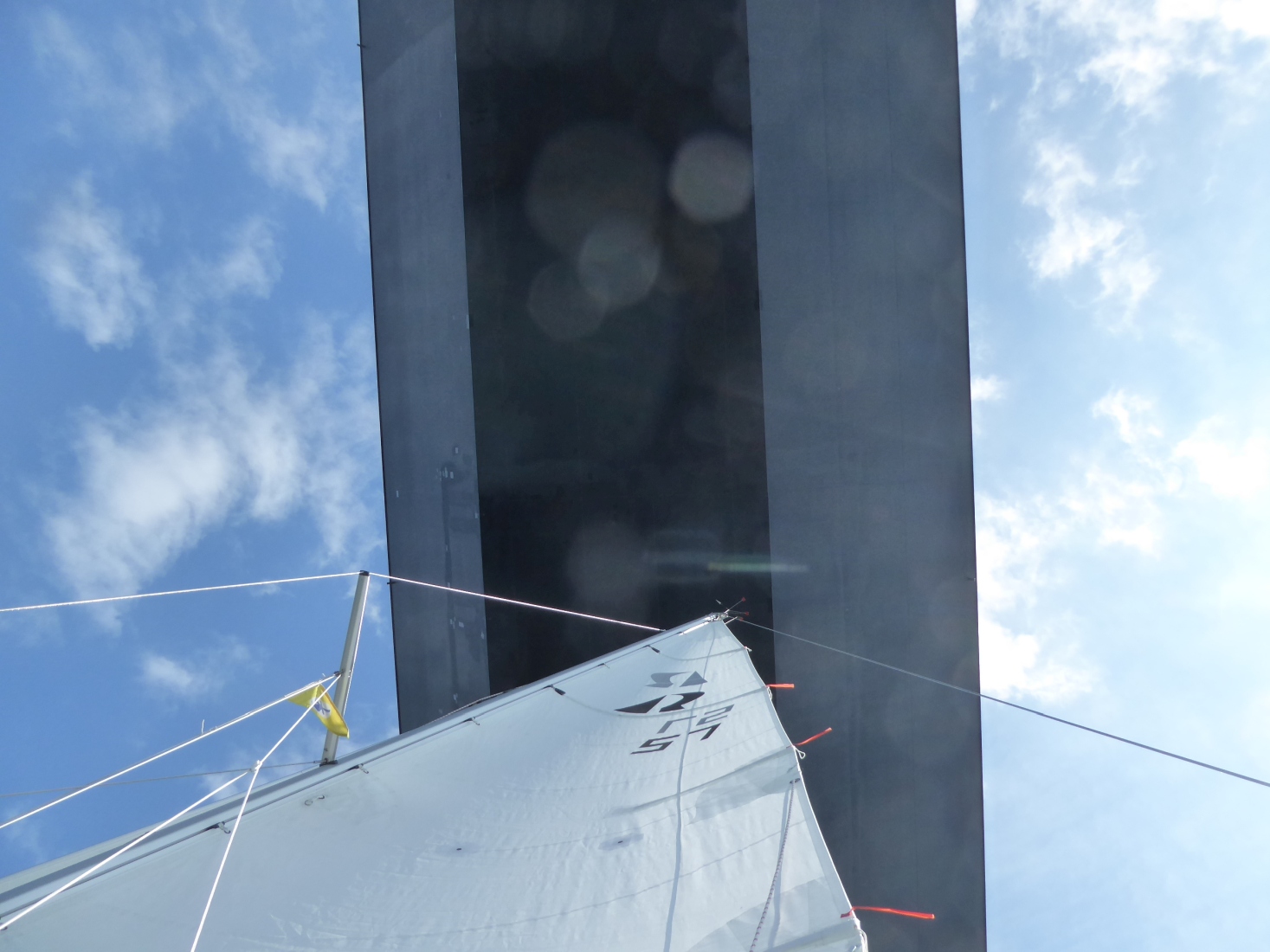 Wollte eigentlich ankern, aber die guten Plätze sind alle von Bojen belegt. Schnell den Anker wieder gesichert und eine Leine klar gemacht. Nur mit dem Großsegel treibe ich auf eine Fischfarm zu, die mitten in der Bucht verankert ist. Also fahre ich mit Motor zur Boje. Das Manöver ist mir leicht misglückt. Ich fange die Boje erst am Heck. Da das Groß noch oben ist treibe ich herum, es kommt Zug auf den Festmacher, Druck ins Segel und ich fahre einmal im Kreis um die Boje herum bis der Bug endlich wieder in den Wind zeigt.