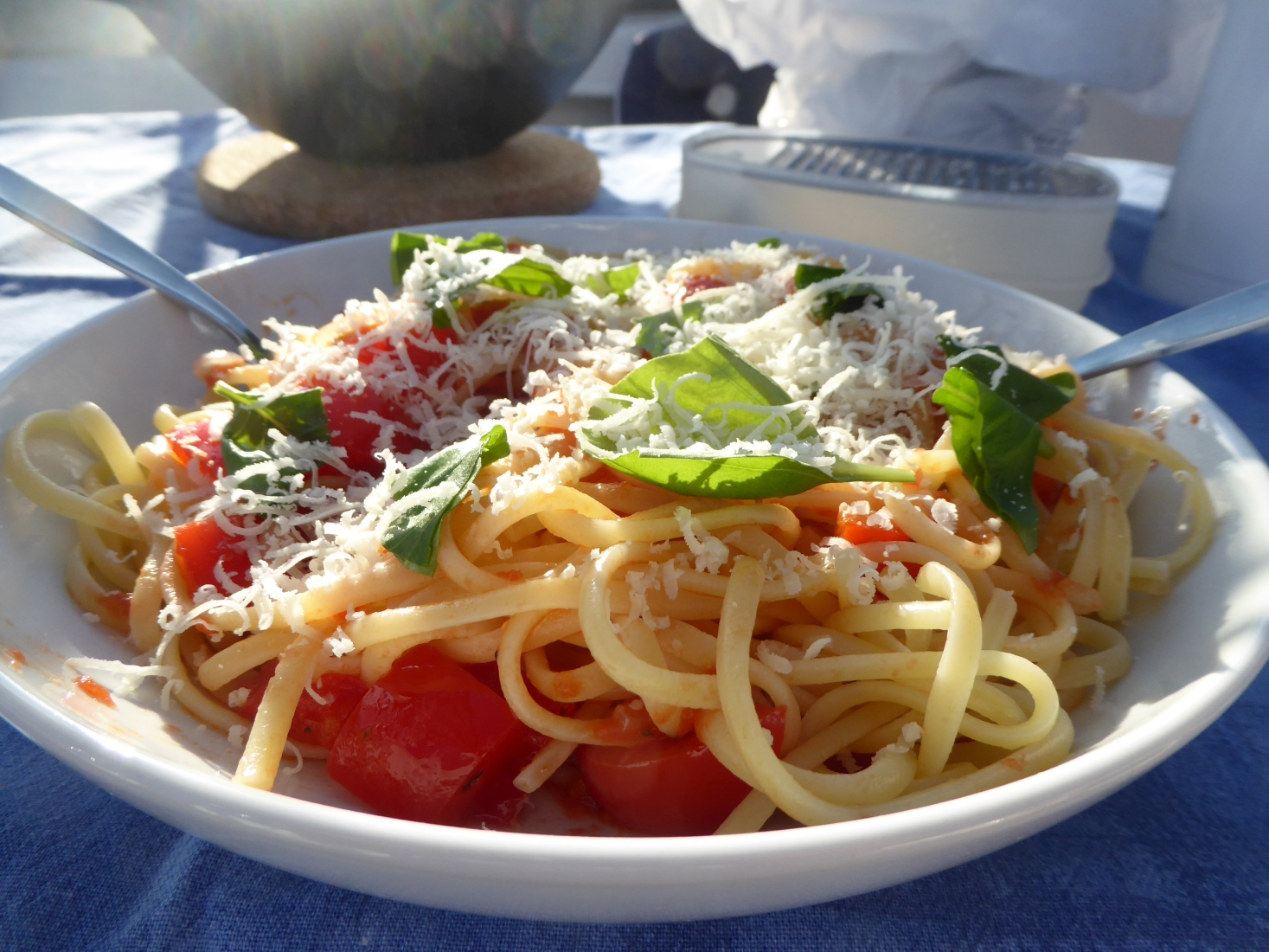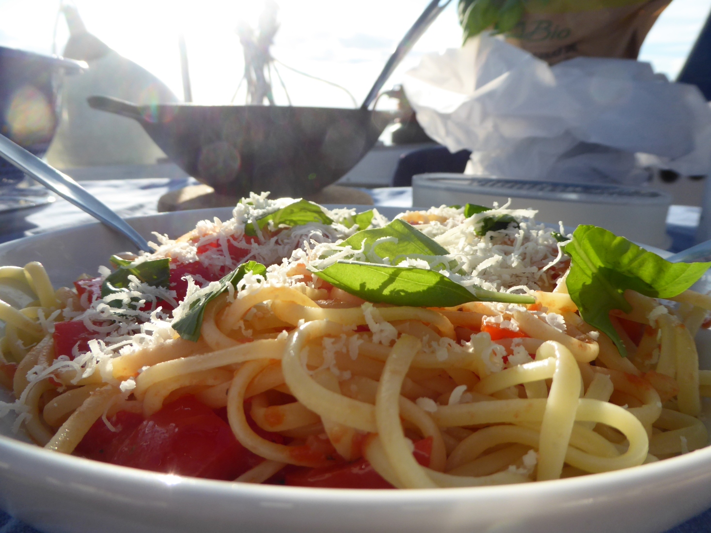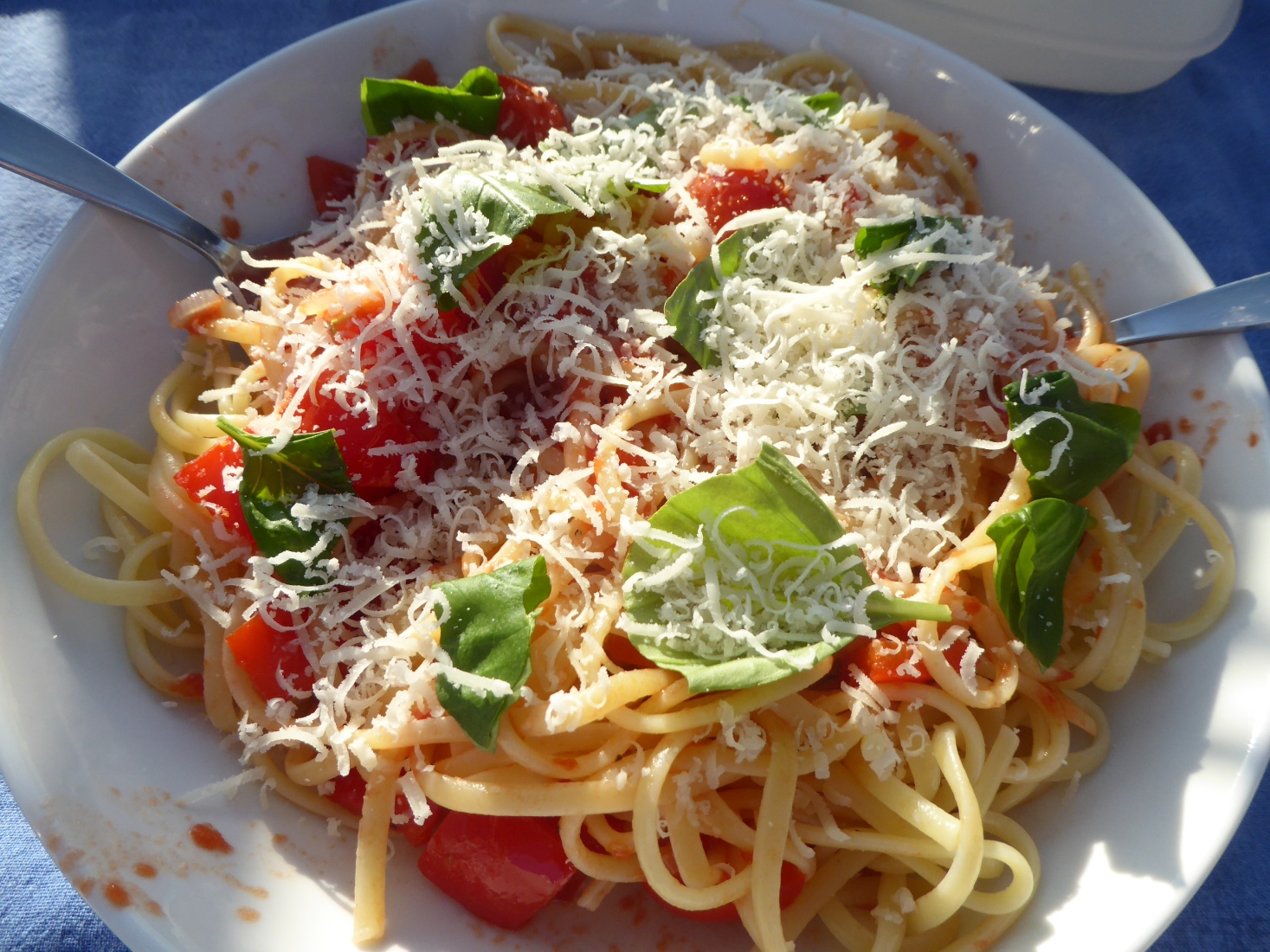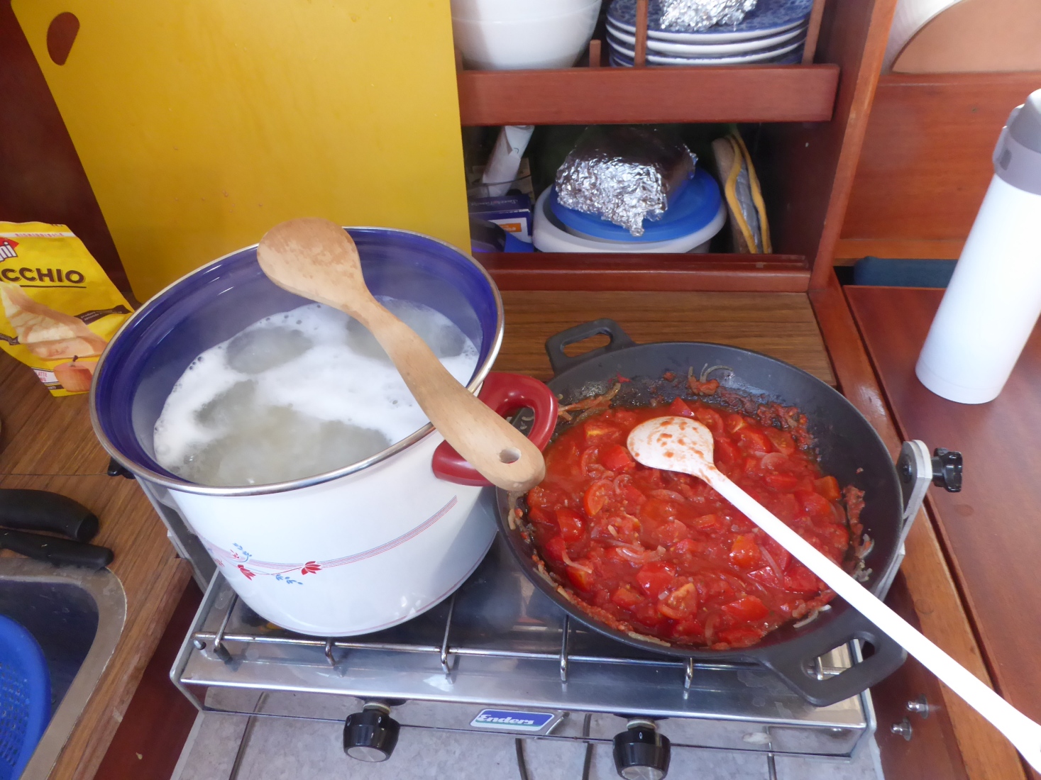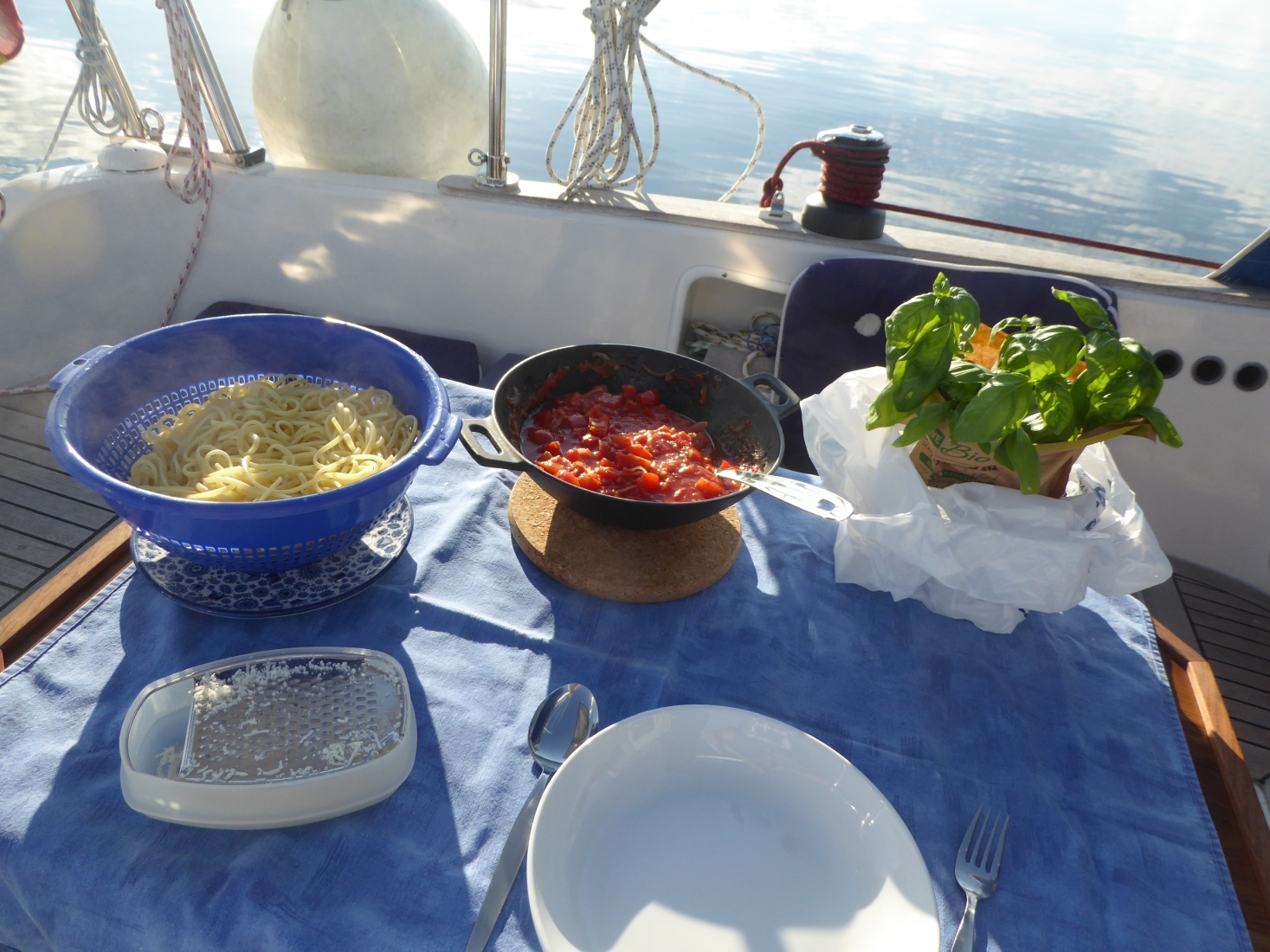 Hier scheint endlich wohlig warm die Sonne. Ich genieße das schöne Wetter lesend in der Plicht. Abends gibt es Linguine mit Paprika-Tomatensoße.