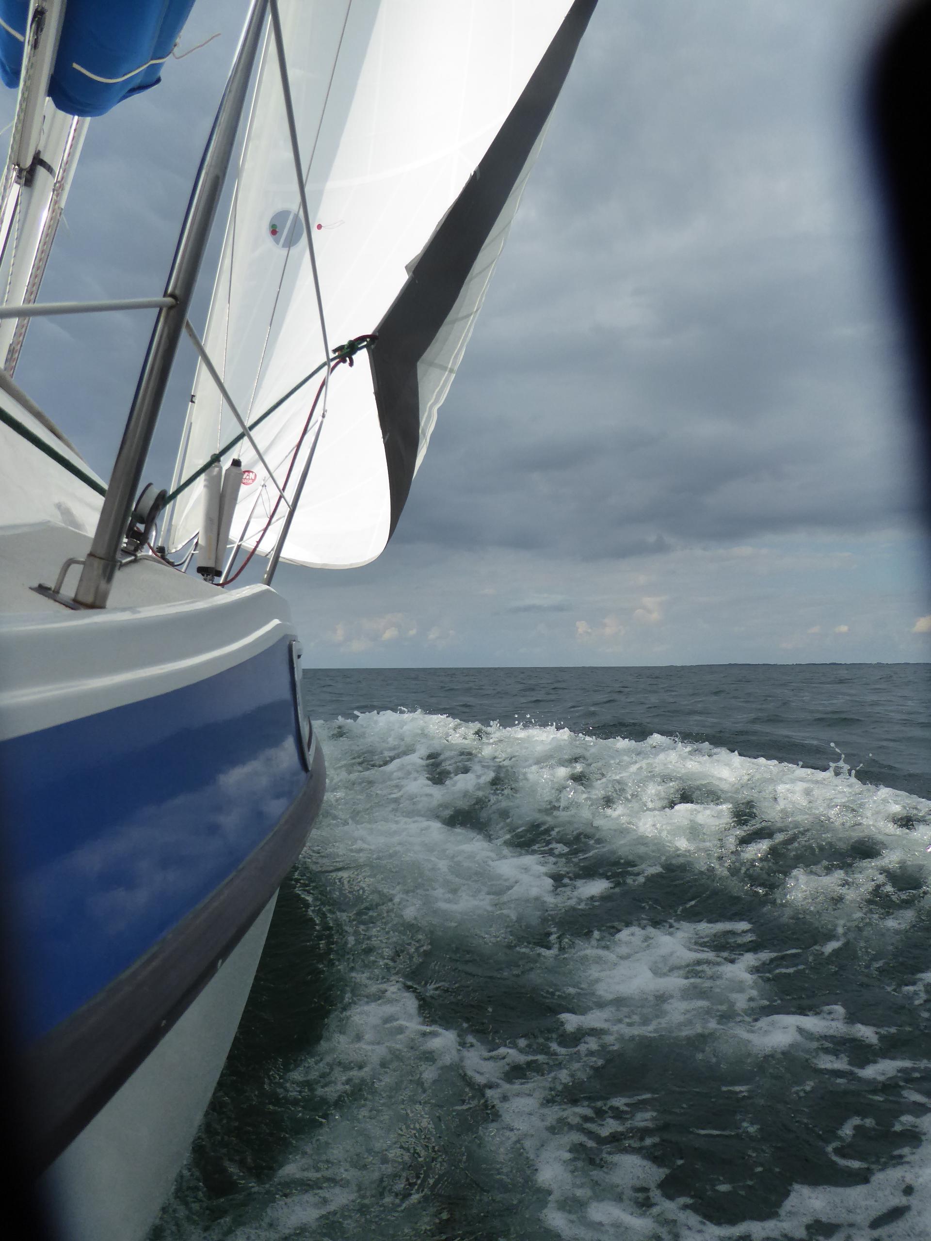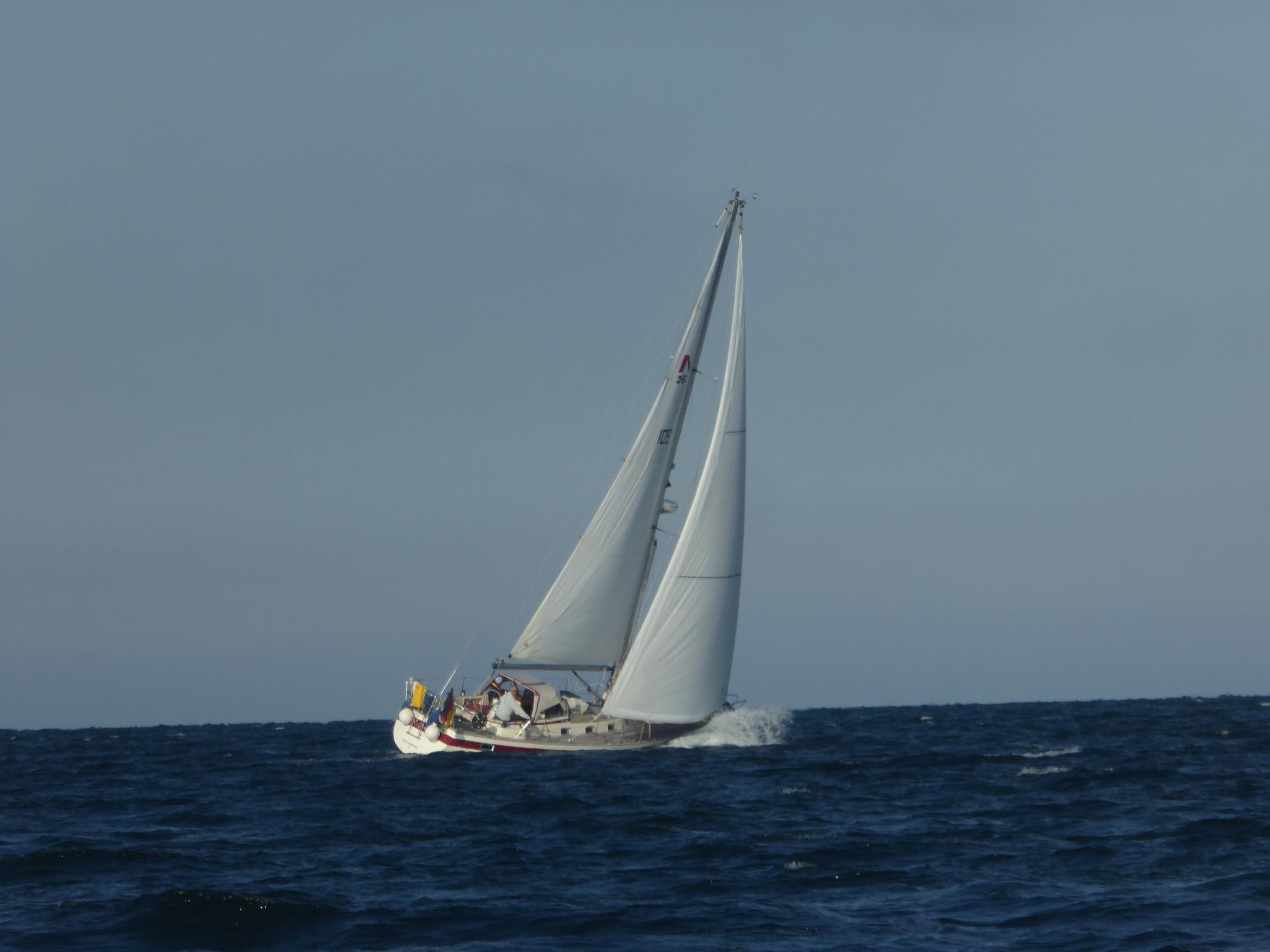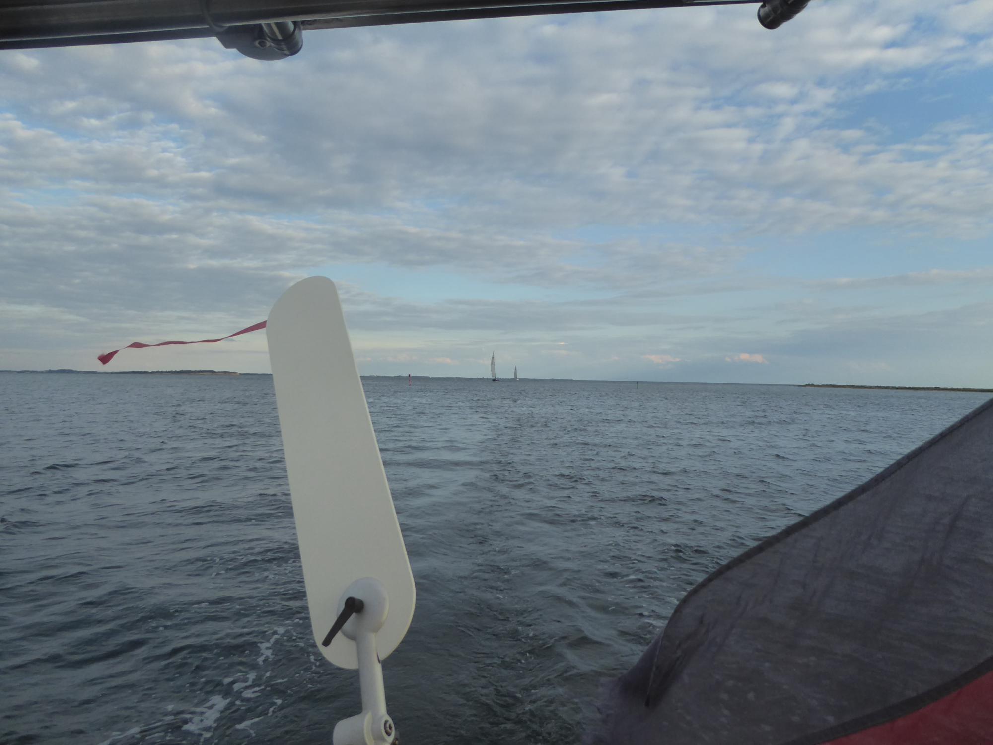 Nach der Wende vor Heiligenhafens Flach ist bald vorbei mit dem Spaß. Der Wind lässt etwas nach, doch das eigentliche Problem ist eine eigentümlich steile Welle und kräftiger Gegenstrom am Ausgang des Fehmarnsunds. Es ist einfach kein Vorankommen mehr möglich. Drei Stunden treibe und schaukele ich mit Geschwindigkeiten zwischen selten drei und öfter einem halben Knoten. Überall um mich rum werden Vorsegel ganz oder teilweise eingerollt und die Motoren gestartet. Selbst große Vierzigfußschlitten mit schwarzen Segeln geben hier auf und laufen unter Maschine aus dem Sog heraus.