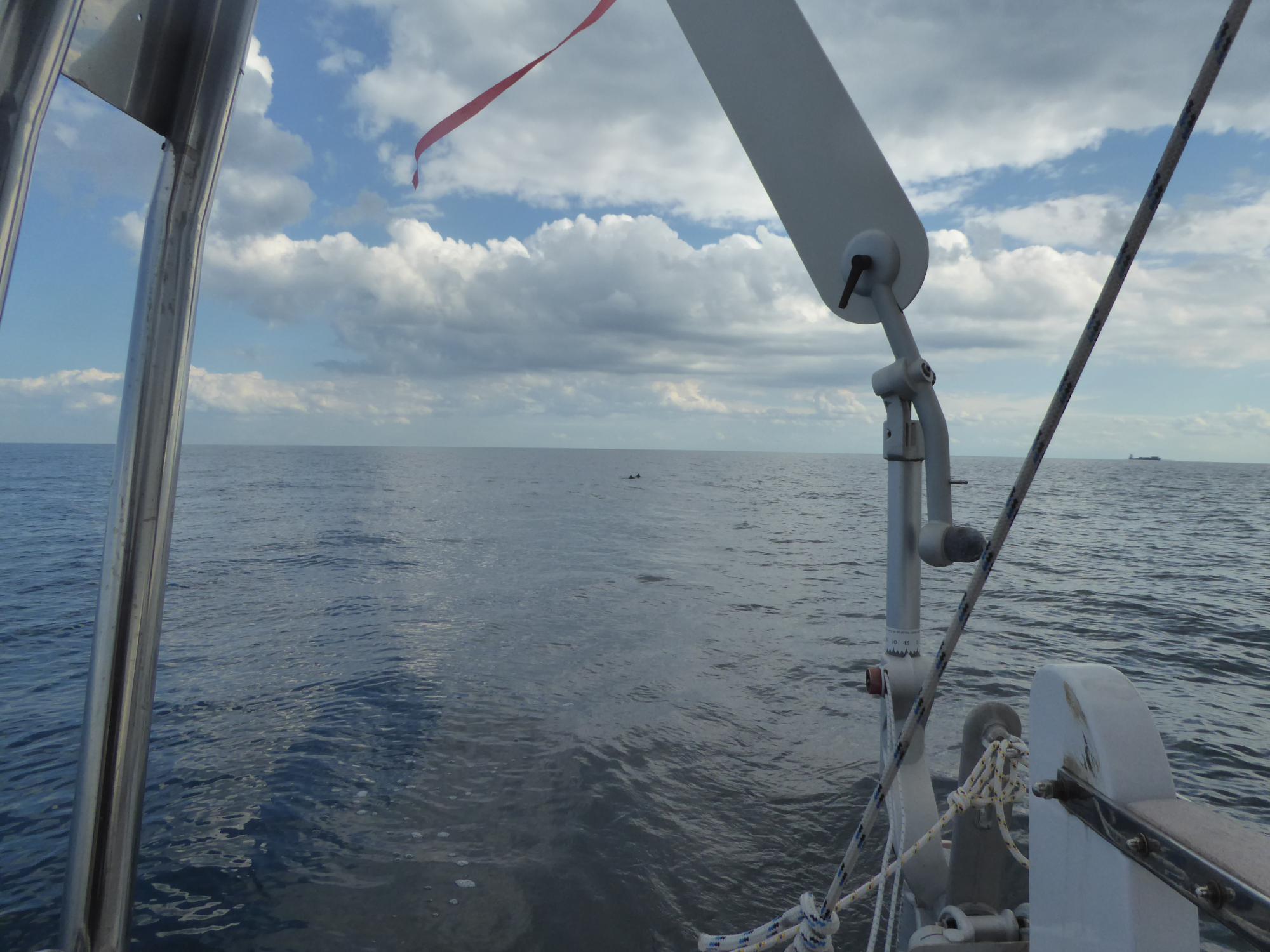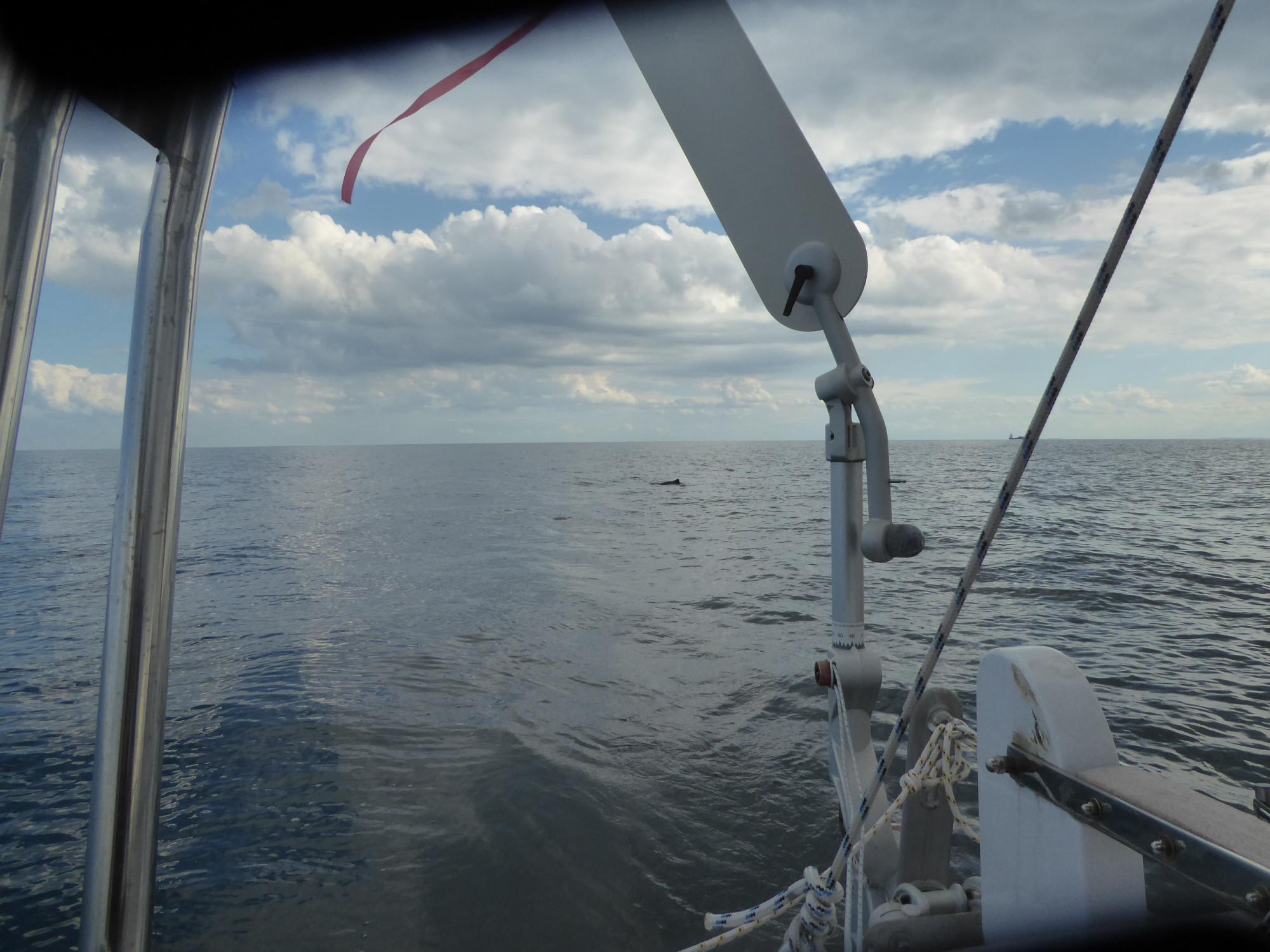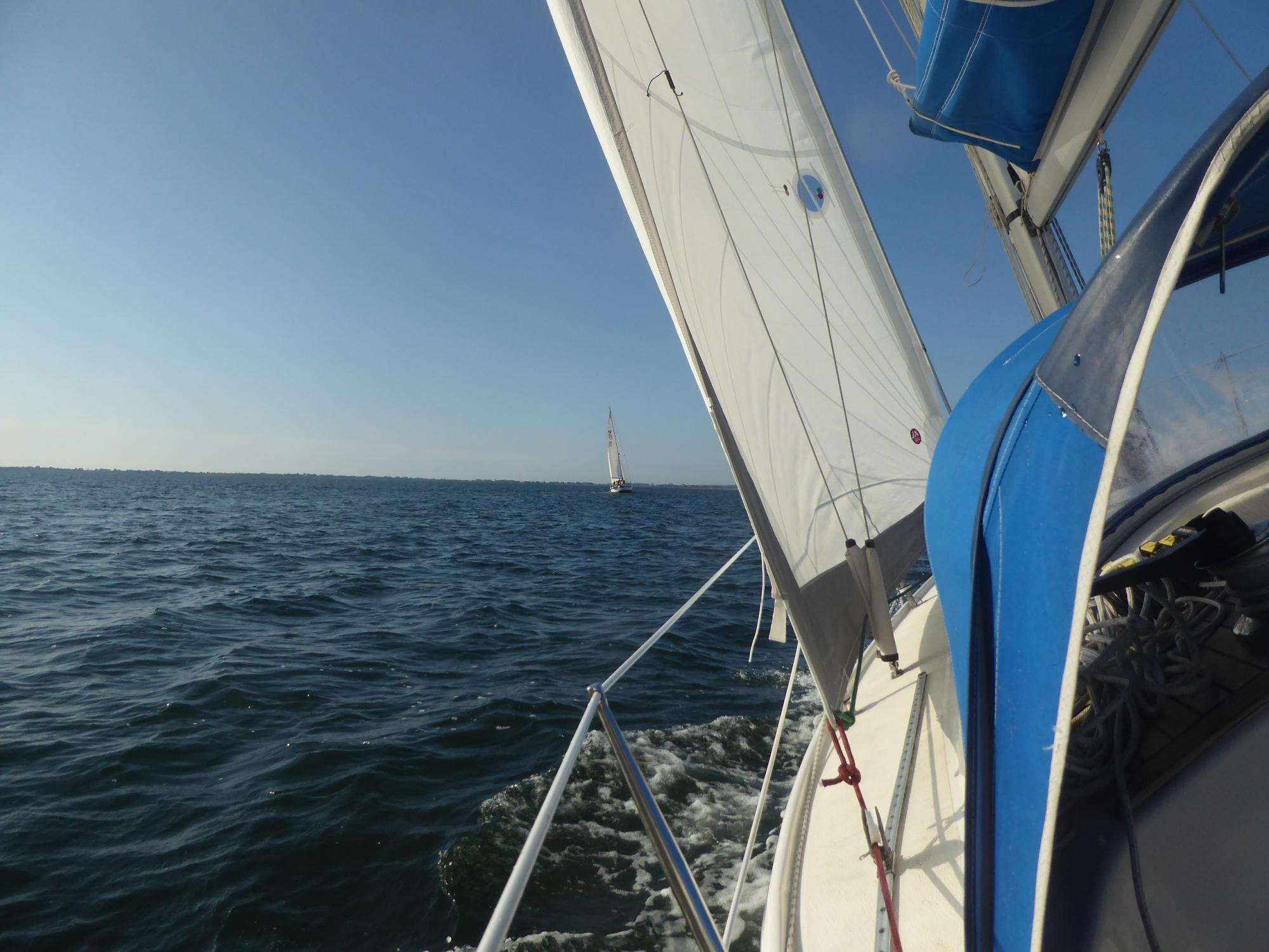 Nach der Wende vor Heiligenhafens Flach ist bald vorbei mit dem Spaß. Der Wind lässt etwas nach, doch das eigentliche Problem ist eine eigentümlich steile Welle und kräftiger Gegenstrom am Ausgang des Fehmarnsunds. Es ist einfach kein Vorankommen mehr möglich. Drei Stunden treibe und schaukele ich mit Geschwindigkeiten zwischen selten drei und öfter einem halben Knoten. Überall um mich rum werden Vorsegel ganz oder teilweise eingerollt und die Motoren gestartet. Selbst große Vierzigfußschlitten mit schwarzen Segeln geben hier auf und laufen unter Maschine aus dem Sog heraus.
