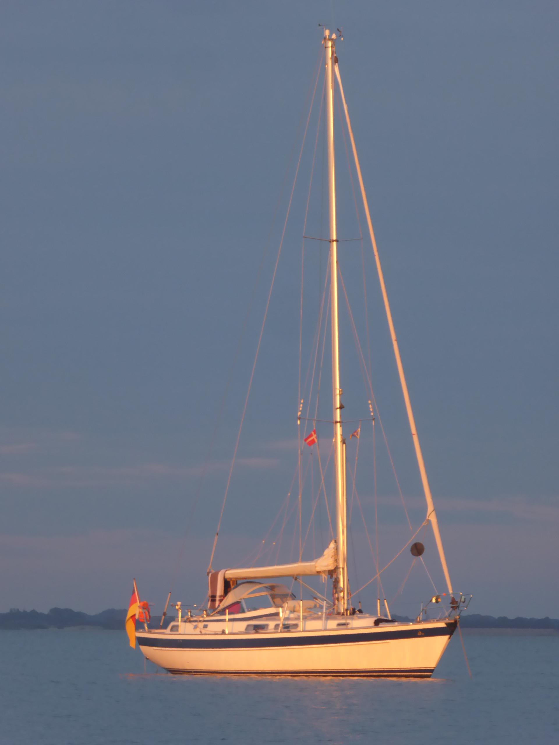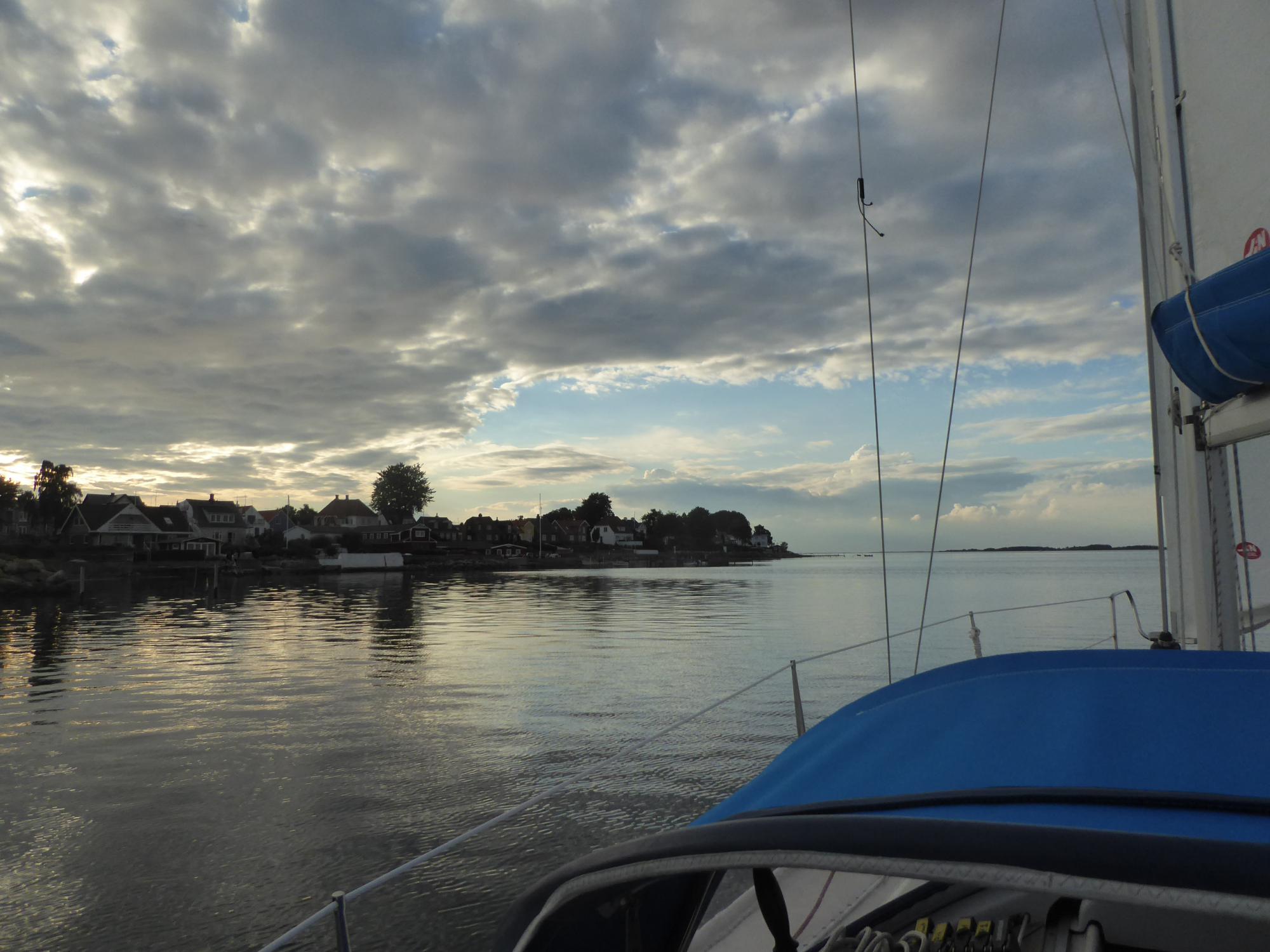 Gegen neunzehn Uhr bin ich vor Marstal und lasse kurz nach halb acht bei Halmø den Anker fallen. Hier weht kaum noch ein Hauch und ich nehme letzendlich den Motor zu Hilfe um den Anker einzufahren. Im Großsegel ist dafür nicht mehr genügend Druck.