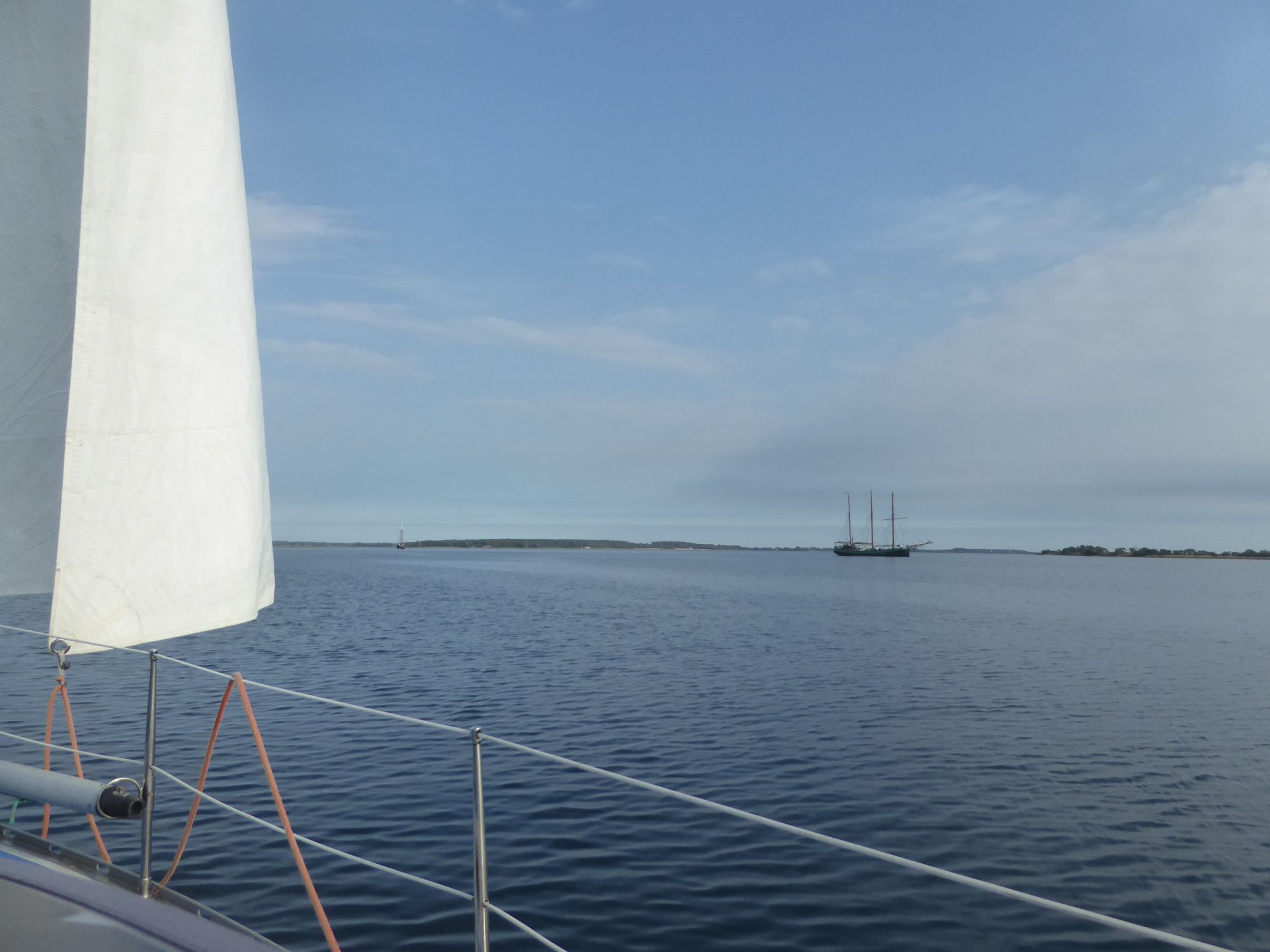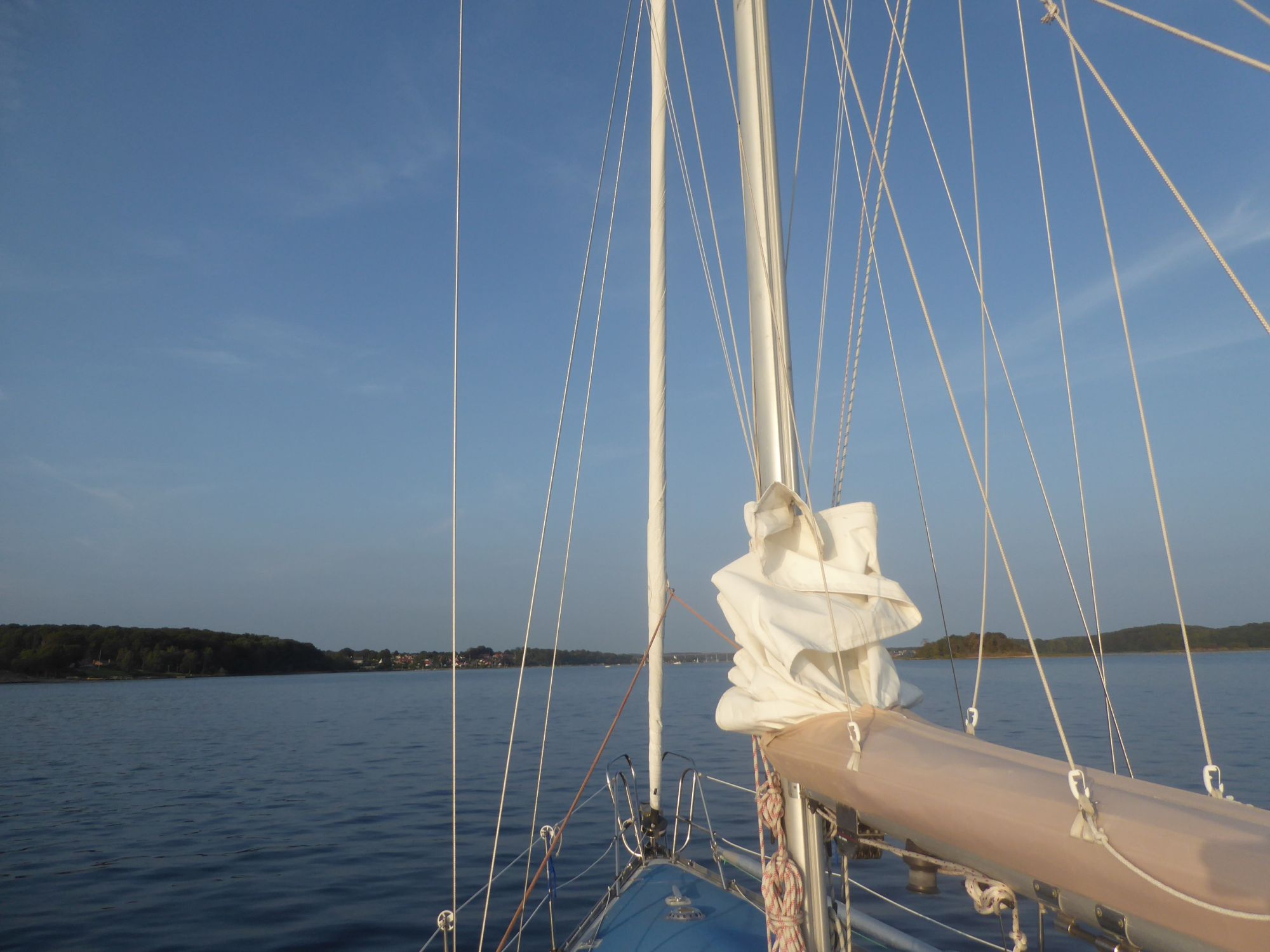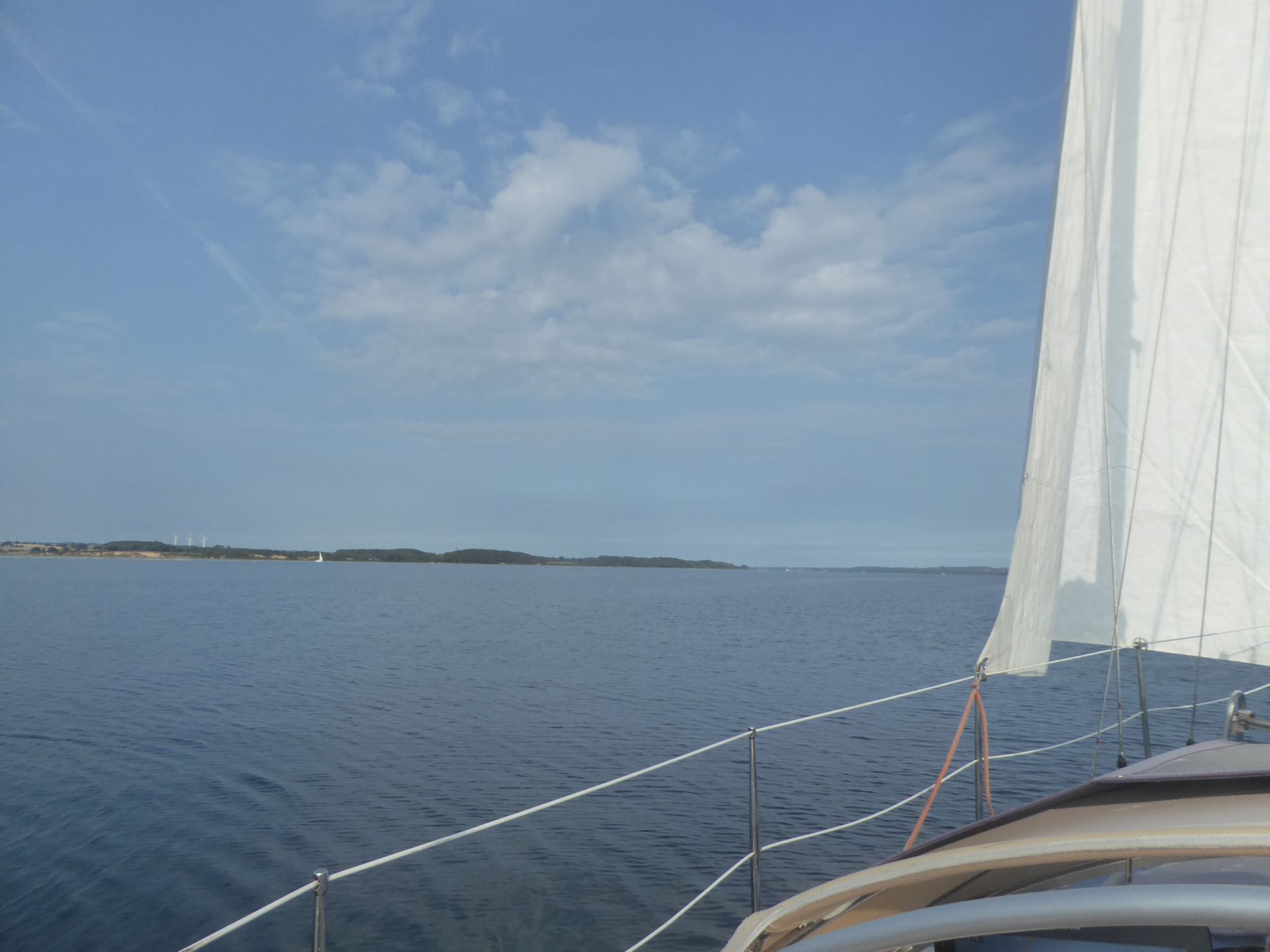 Mit schwächelndem Hauch schleiche ich mich nach Troense. Der Pinnenpilot hat echte Probleme, mit der geringen Geschwindigkeit umzugehen. Immer wieder schaukelt er sich auf und überkorrigiert weil die Kursveränderungen dem Gerät wohl zu langsam geschehen. Schließlich steuere ich überwiegend von Hand.