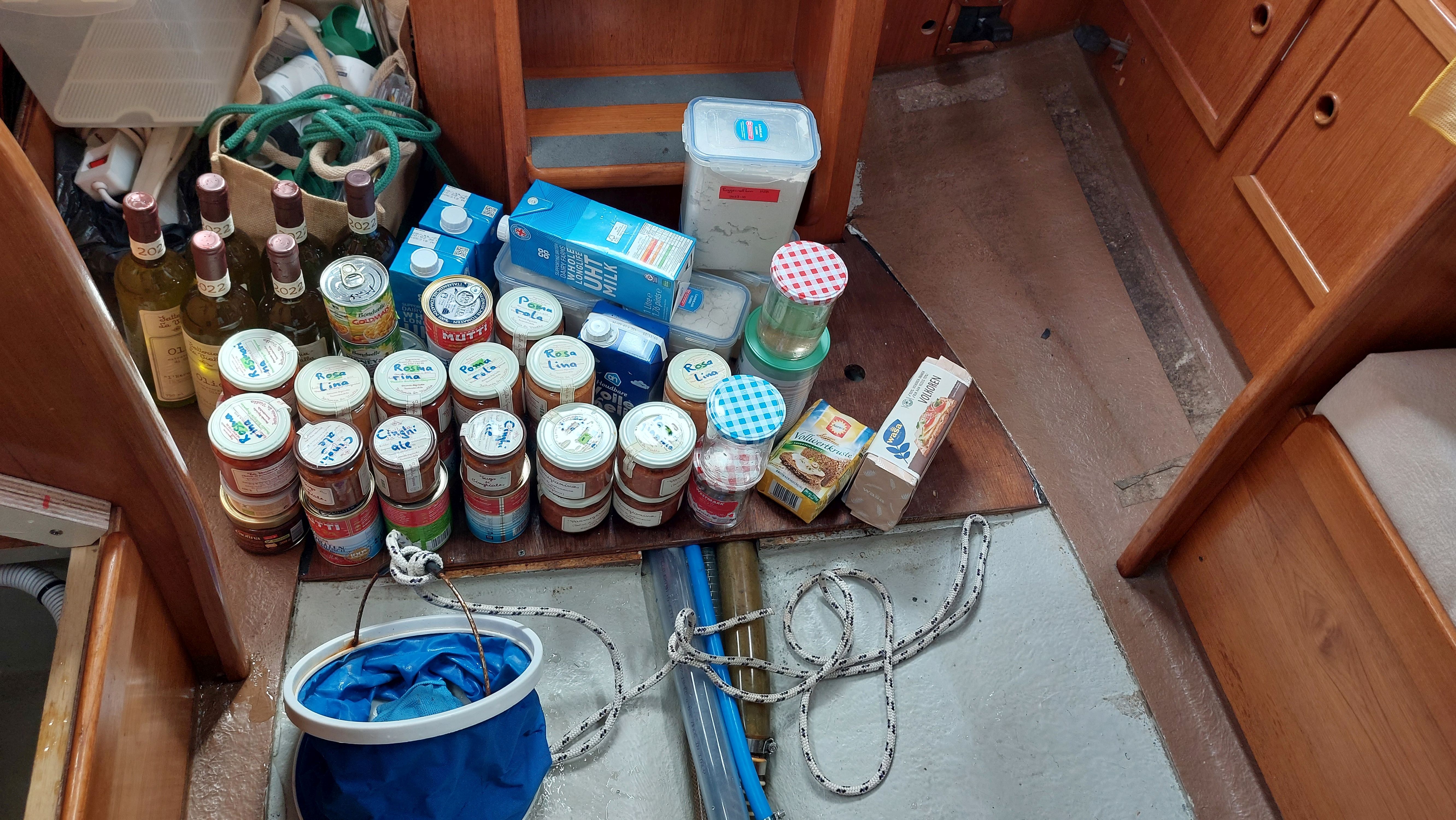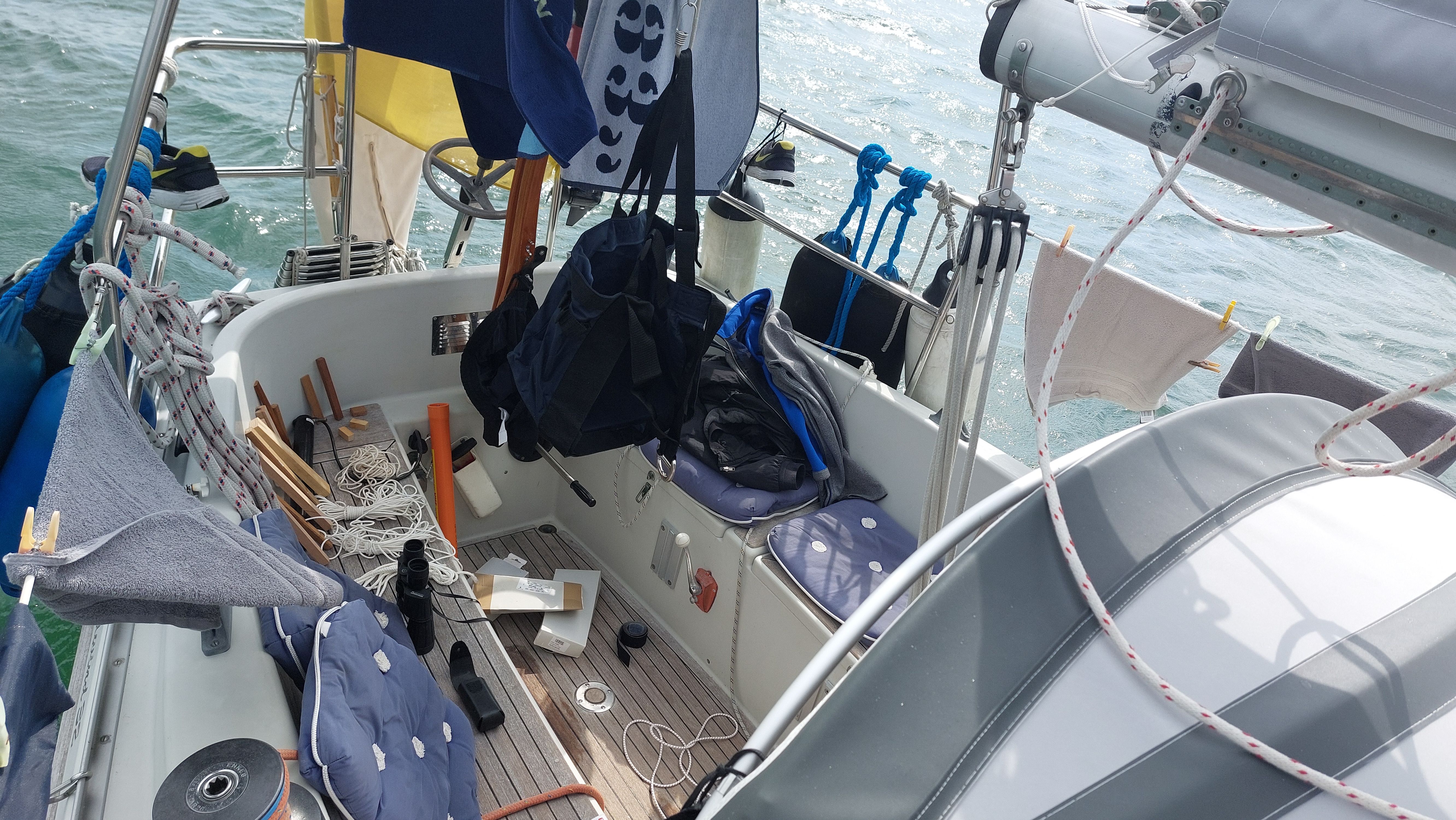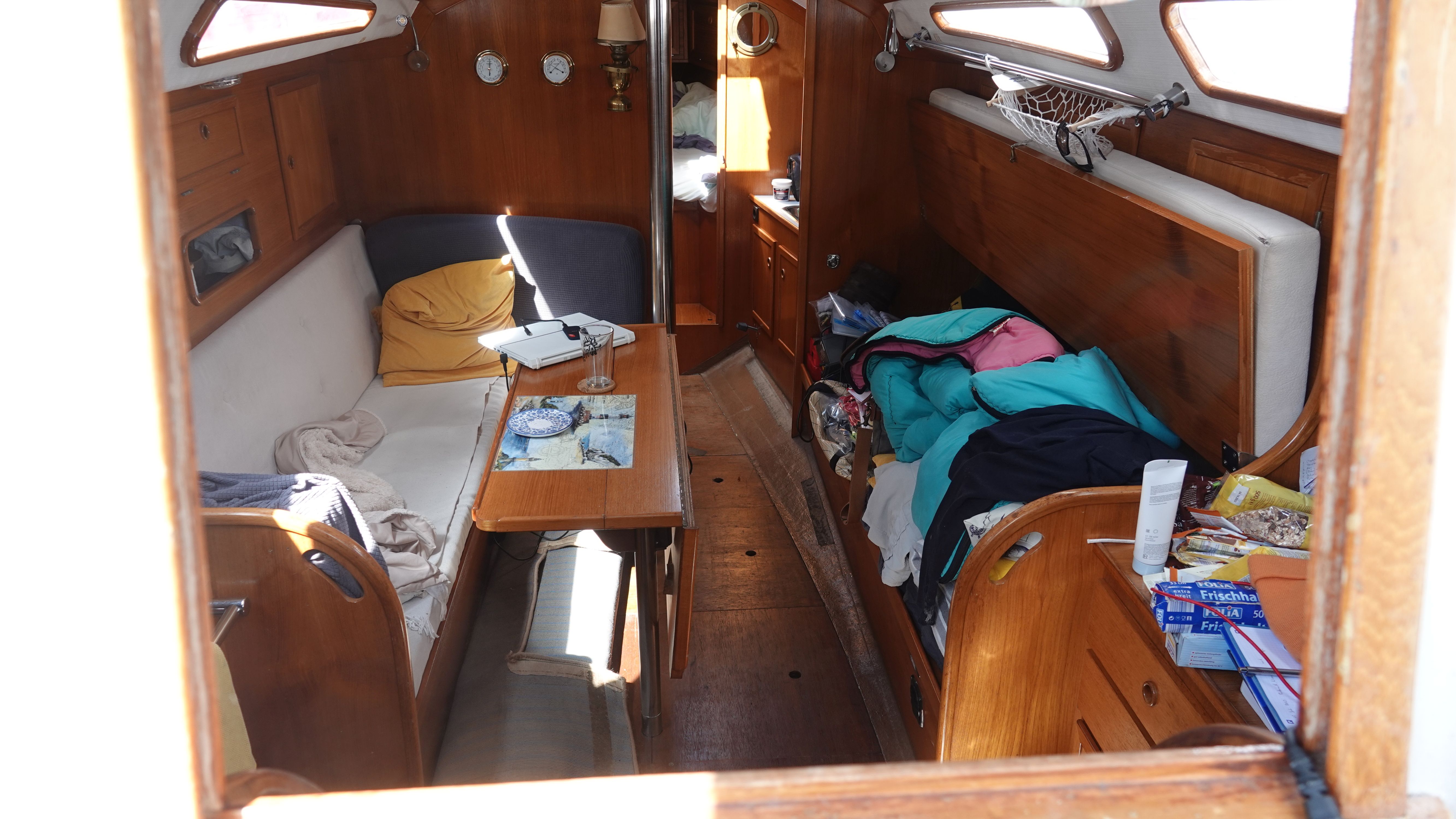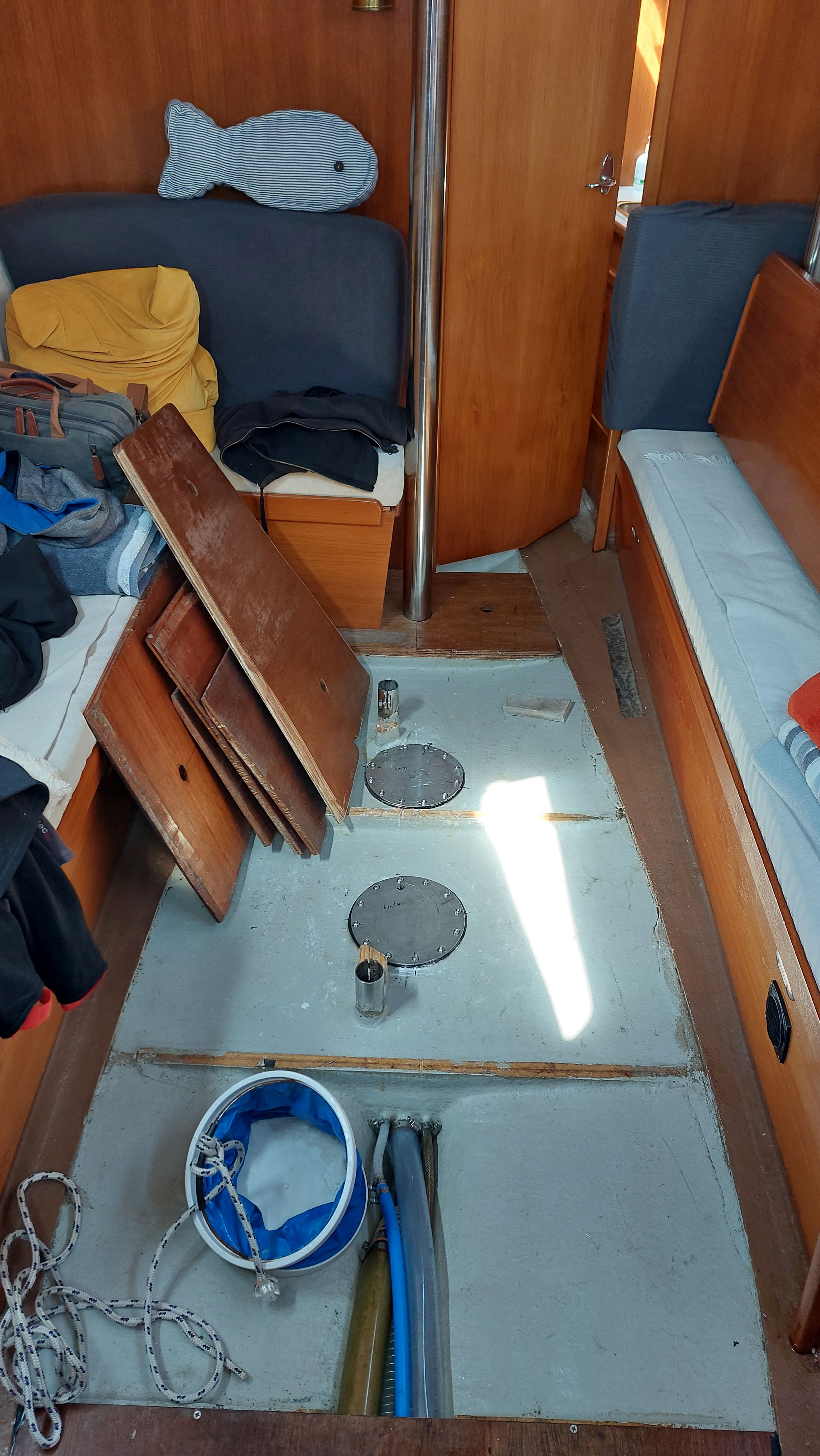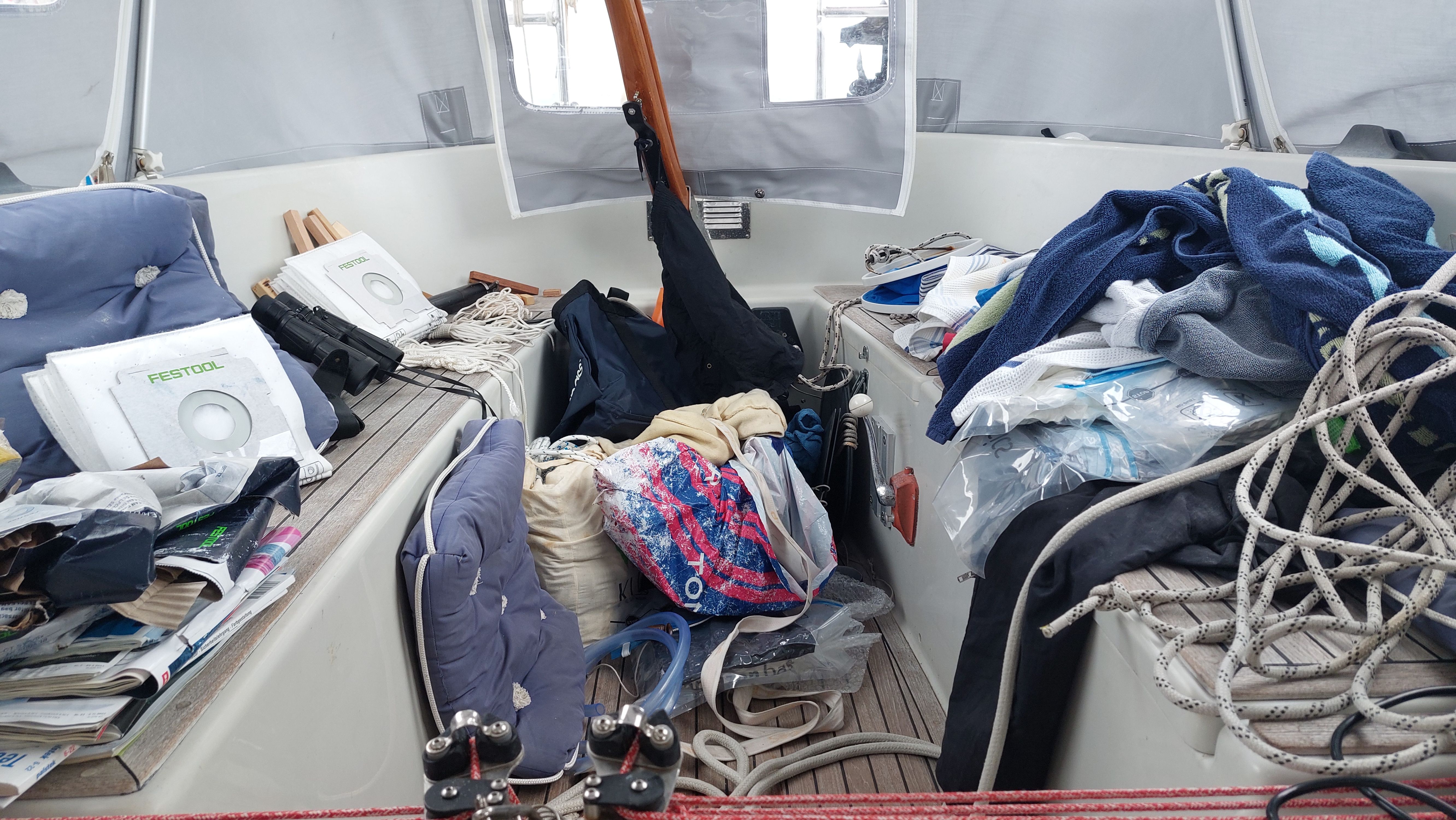 Montag und Dienstag bin ich von morgens bis abends damit beschäftigt Lua wieder einigermaßen trocken zu bekommen. Zunächst baue ich den Salontisch ab, damit der Teppich raus und an Deck in der Sonne trocknen kann. Die vielen Handtücher, Lappen, Schuhe, ... die vorne vom Salzwasser durchnässt wurden kommen auf die Reling bis jeder Zentimeter belegt ist und alle Wäscheklammern in Gebrauch sind. Ich räume die nassen Schapps aus und entdecke immer wieder neue geflutete Stellen. Unter den Bodenbrettern über dem Bilgetank, im Schapp unter dem Navitisch, sämtlicher Stauraum unter der Steuerbordkoje im Salon. In der mittleren Backskiste unter der Koje steht das Wasser bestimmt fünfundzwanzig Zentimeter hoch. Diese Stauräume sind auch überwiegend wasserdicht. Bei der Schräglage gestern ist das Wasser aber an der Außenwand hoch und dann von oben hineingelaufen. Jetzt kommt es dort von alleine nicht wieder heraus.