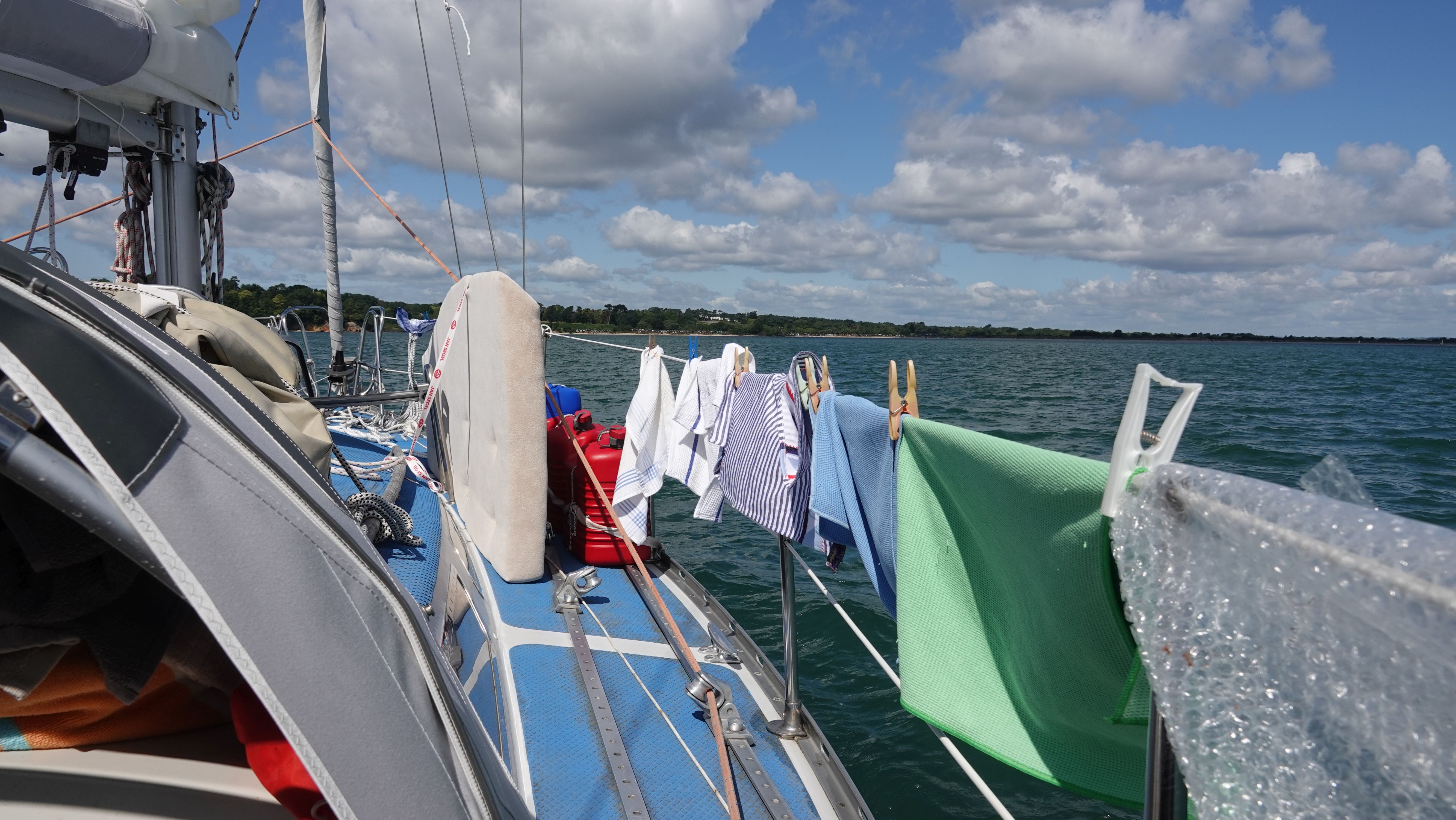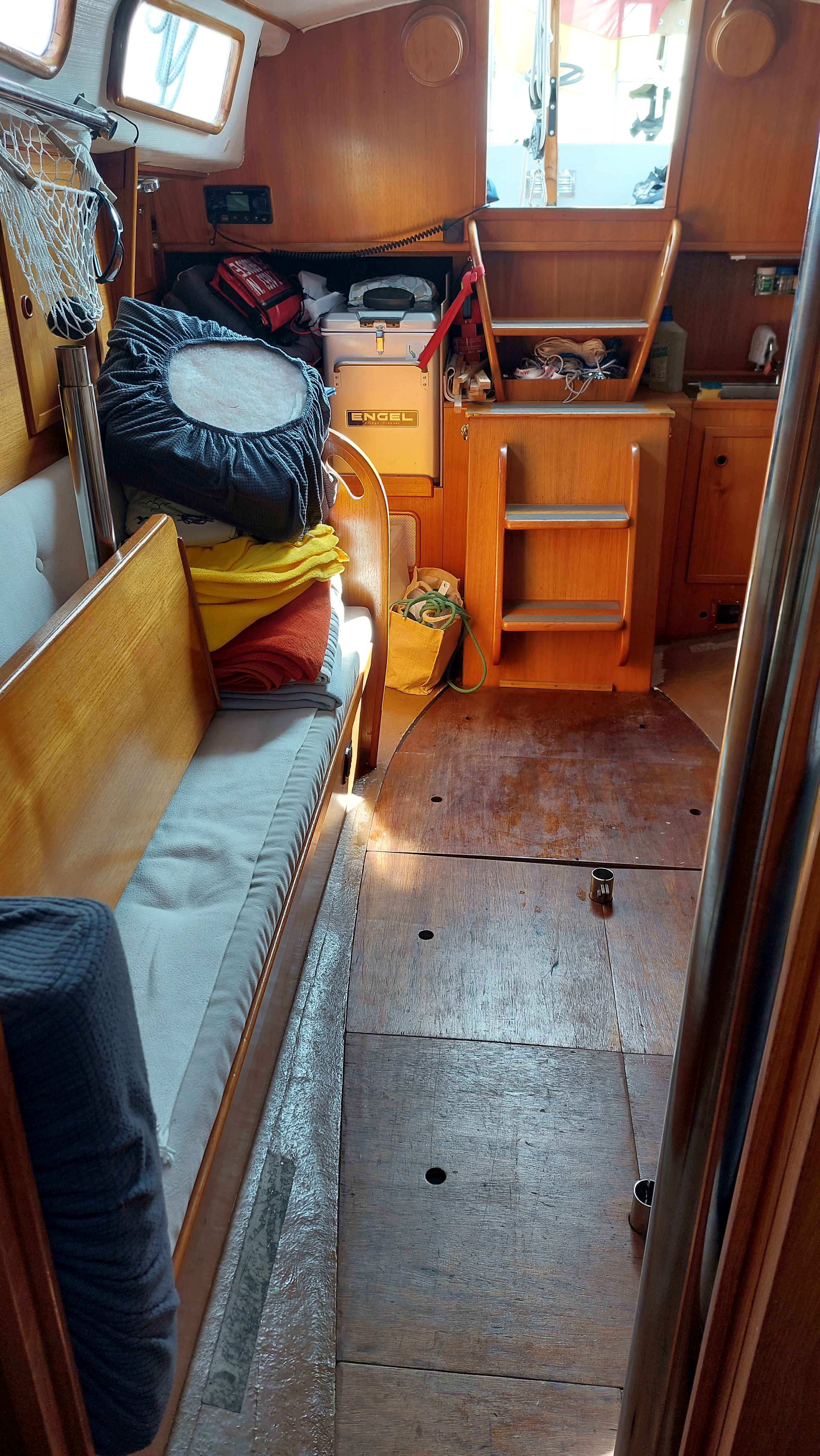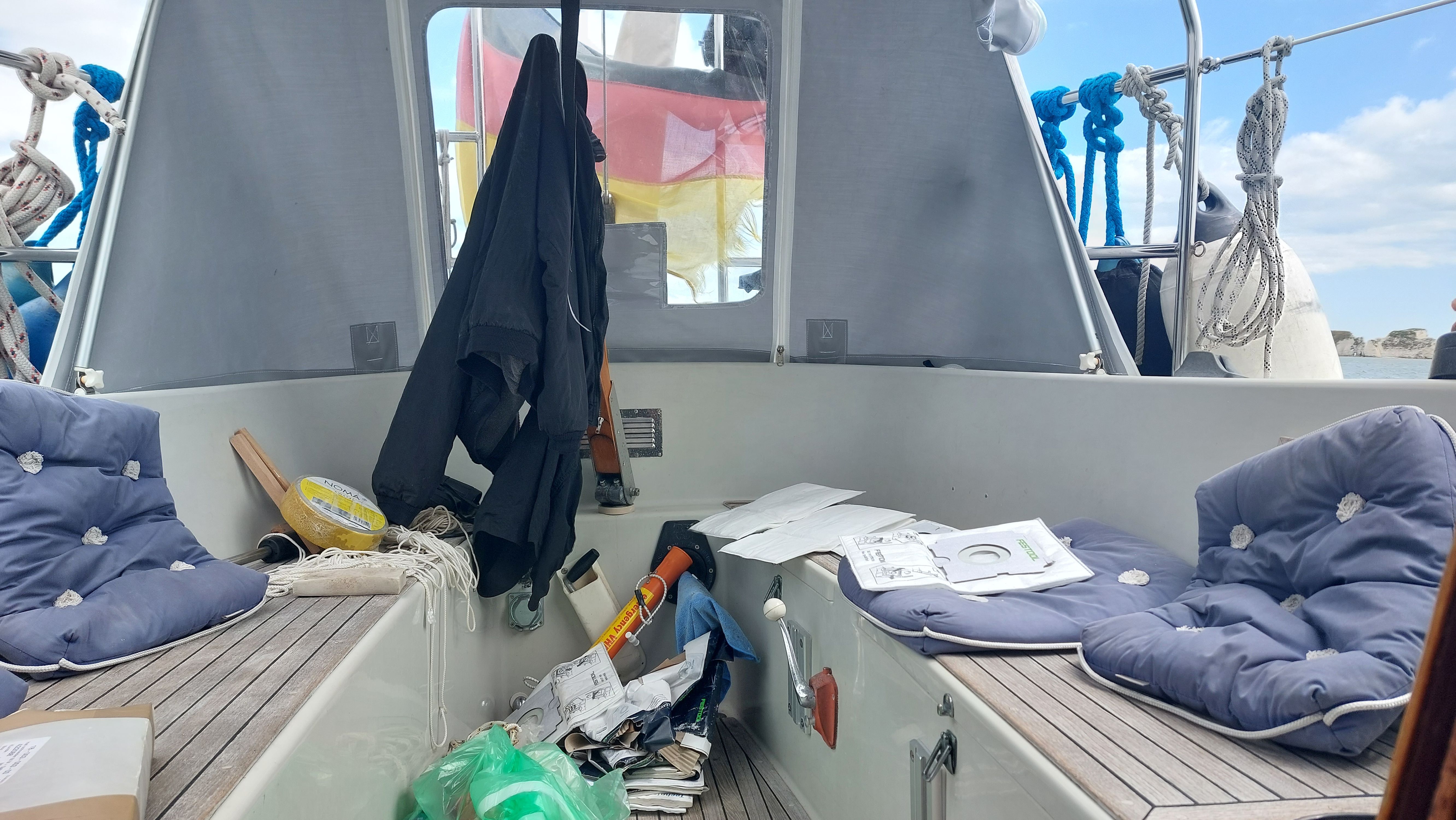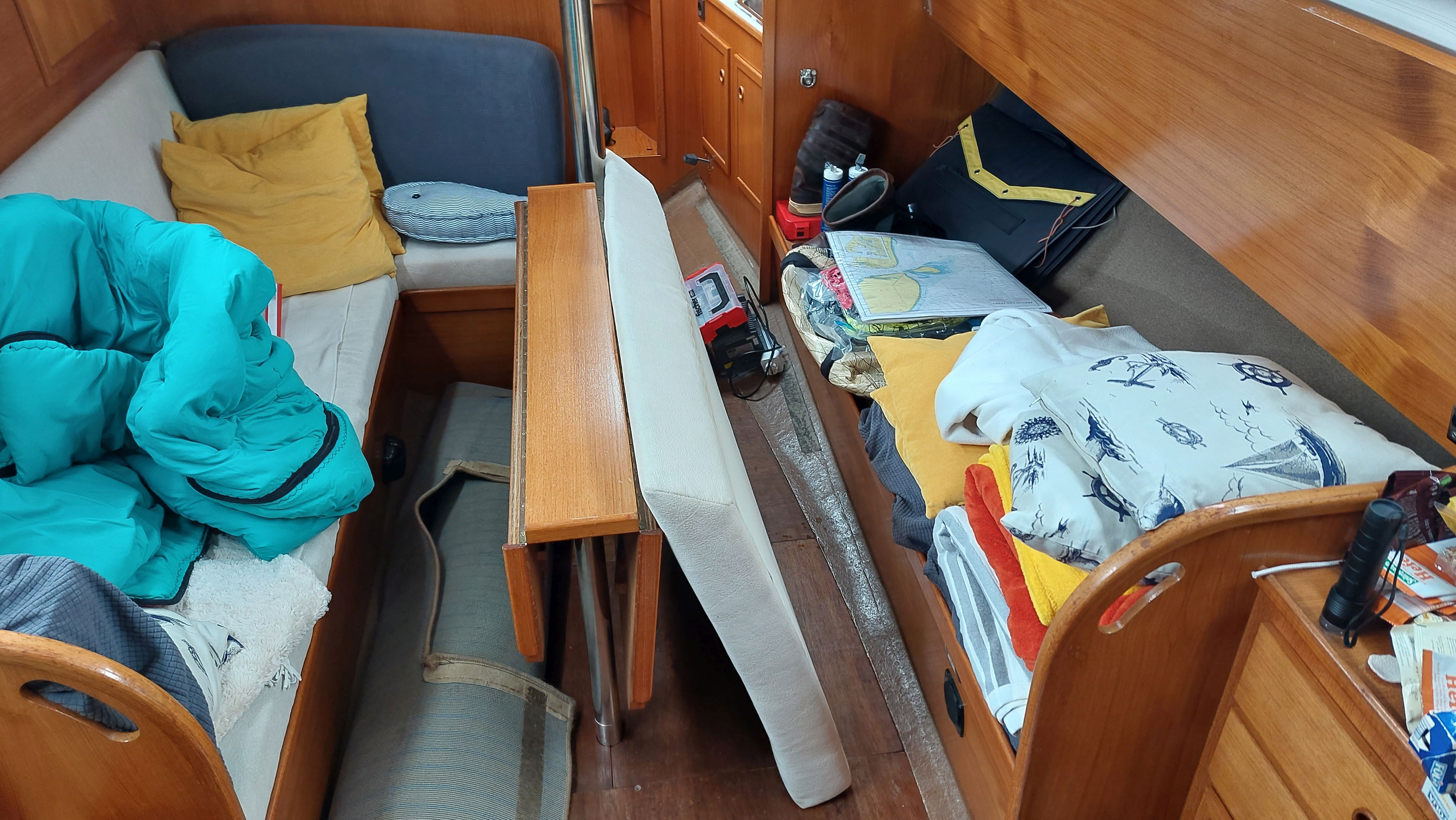 Montag und Dienstag bin ich von morgens bis abends damit beschäftigt Lua wieder einigermaßen trocken zu bekommen. Zunächst baue ich den Salontisch ab, damit der Teppich raus und an Deck in der Sonne trocknen kann. Die vielen Handtücher, Lappen, Schuhe, ... die vorne vom Salzwasser durchnässt wurden kommen auf die Reling bis jeder Zentimeter belegt ist und alle Wäscheklammern in Gebrauch sind. Ich räume die nassen Schapps aus und entdecke immer wieder neue geflutete Stellen. Unter den Bodenbrettern über dem Bilgetank, im Schapp unter dem Navitisch, sämtlicher Stauraum unter der Steuerbordkoje im Salon. In der mittleren Backskiste unter der Koje steht das Wasser bestimmt fünfundzwanzig Zentimeter hoch. Diese Stauräume sind auch überwiegend wasserdicht. Bei der Schräglage gestern ist das Wasser aber an der Außenwand hoch und dann von oben hineingelaufen. Jetzt kommt es dort von alleine nicht wieder heraus.